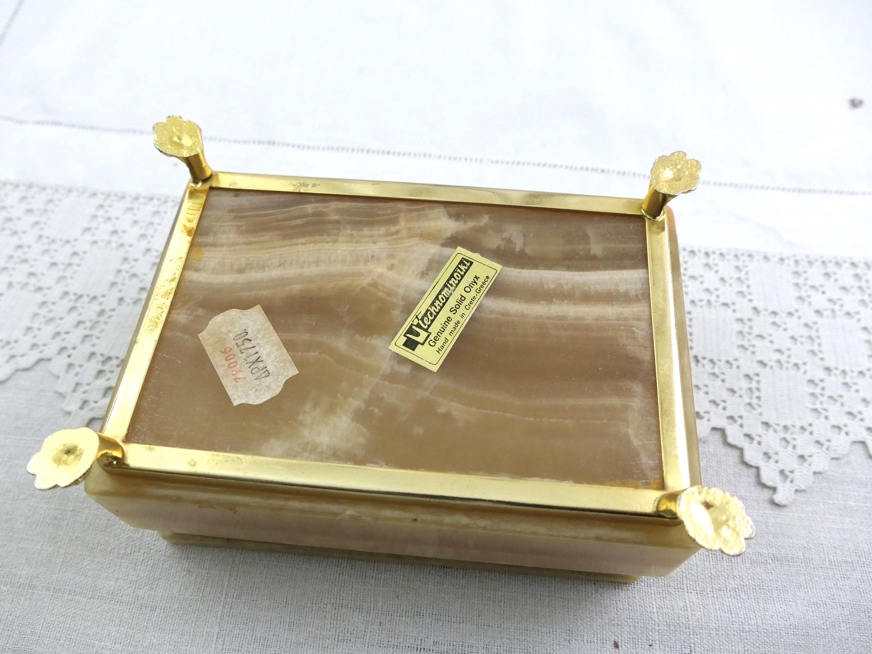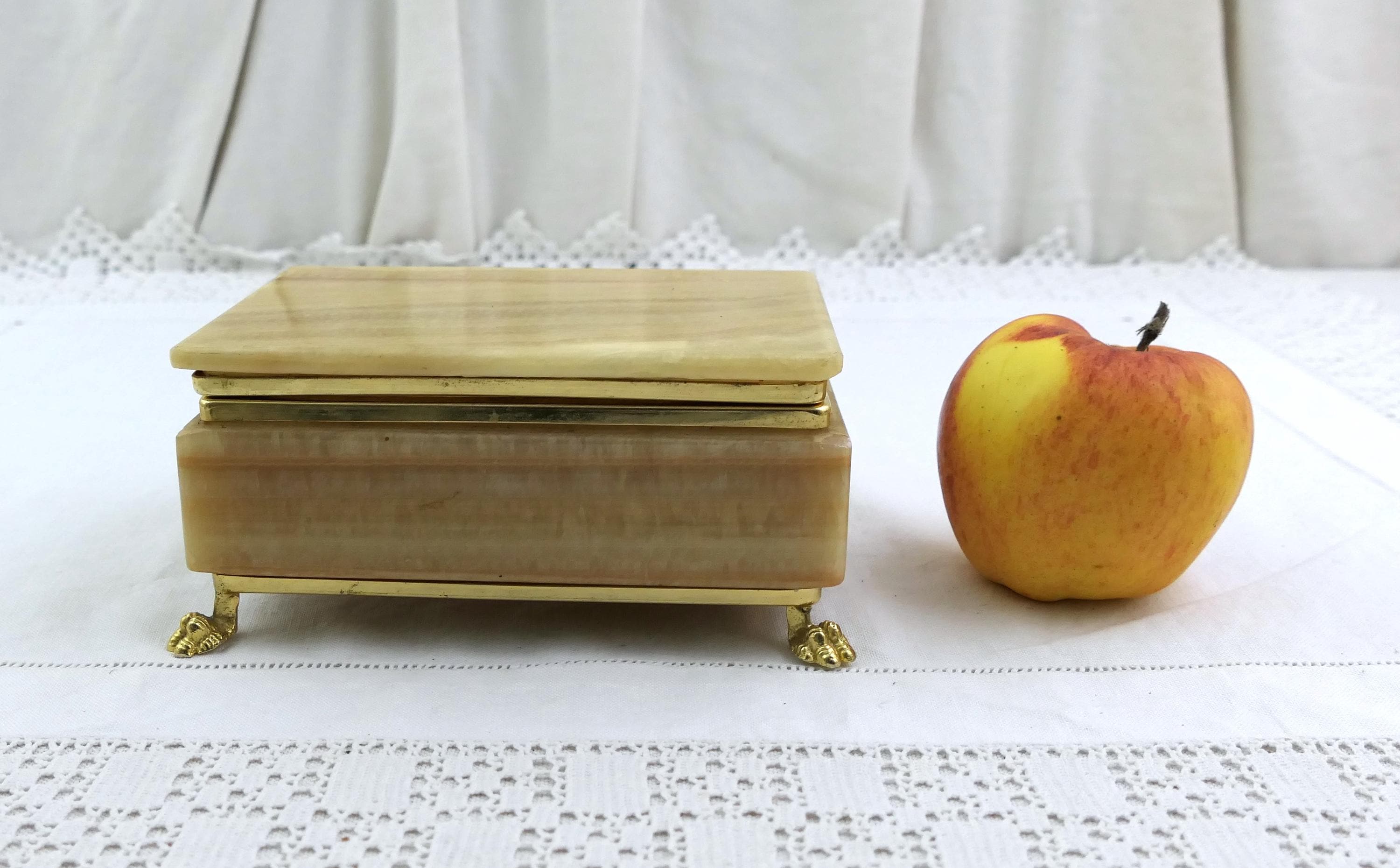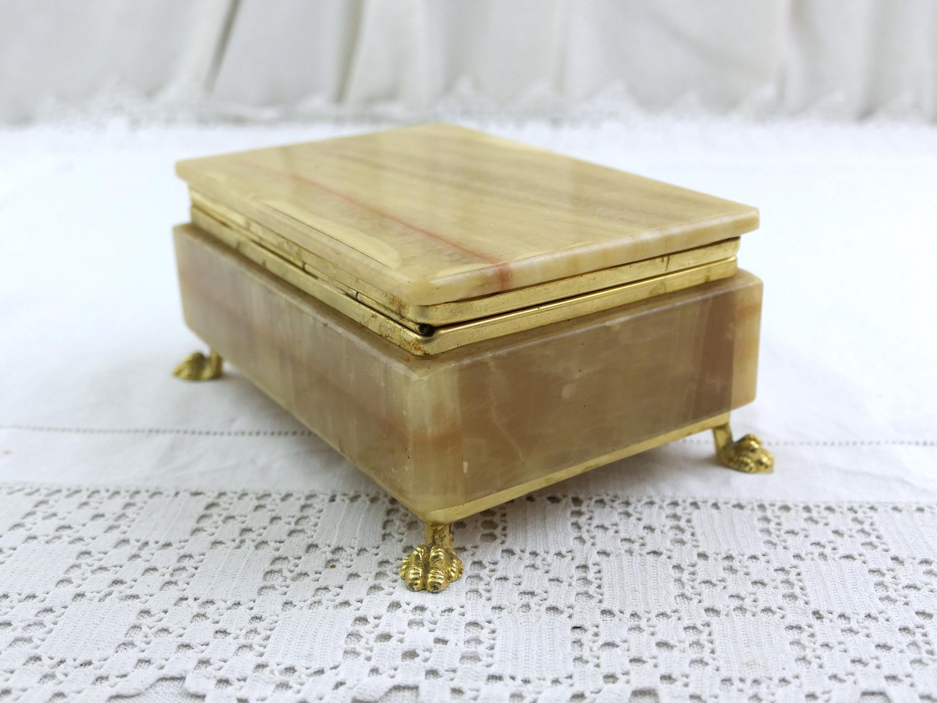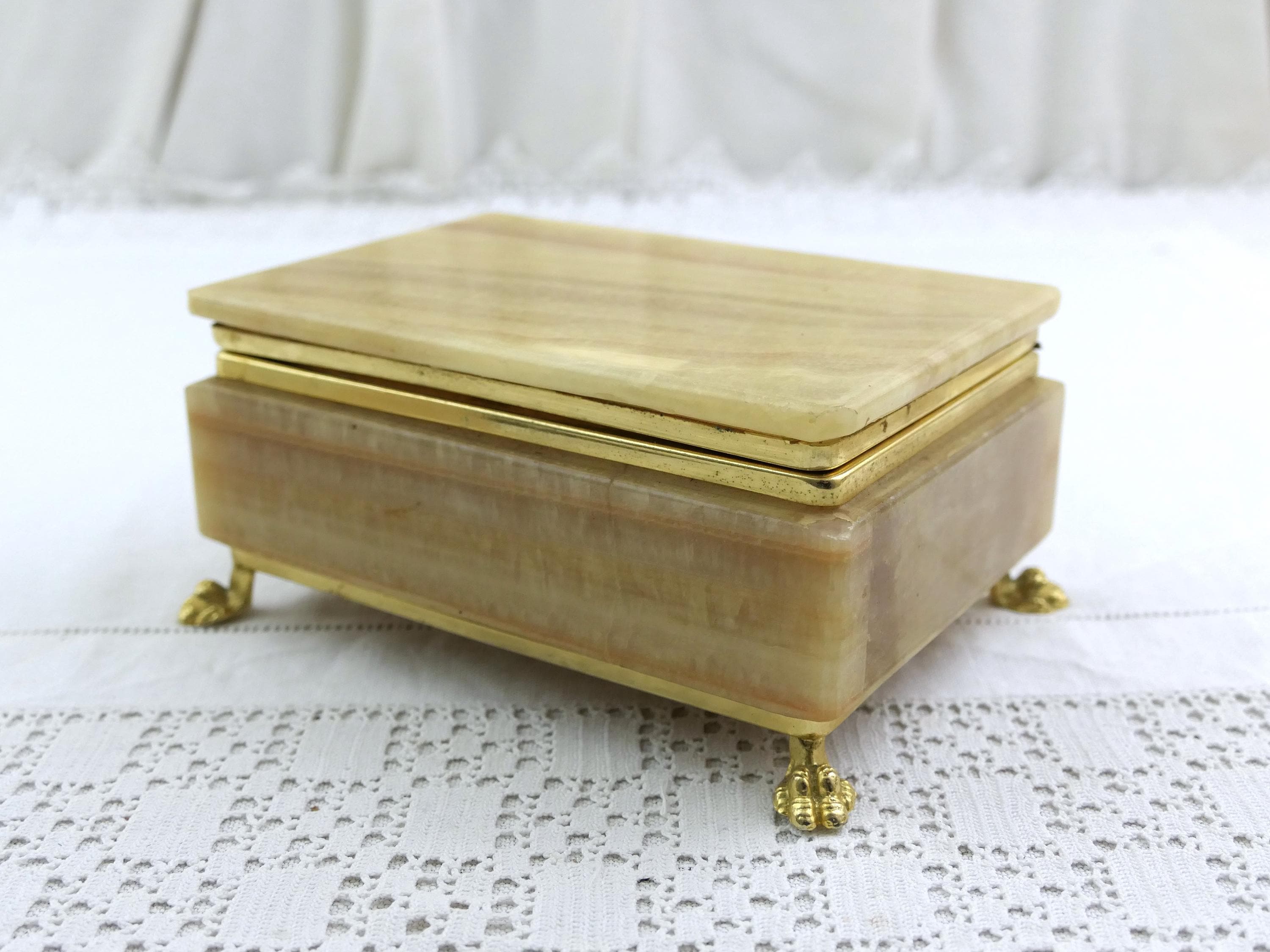 Vintage Italian veined green and brown agate stone trinket box with 4 feet and rounded lid. Made in Italy. Ca 1970s.