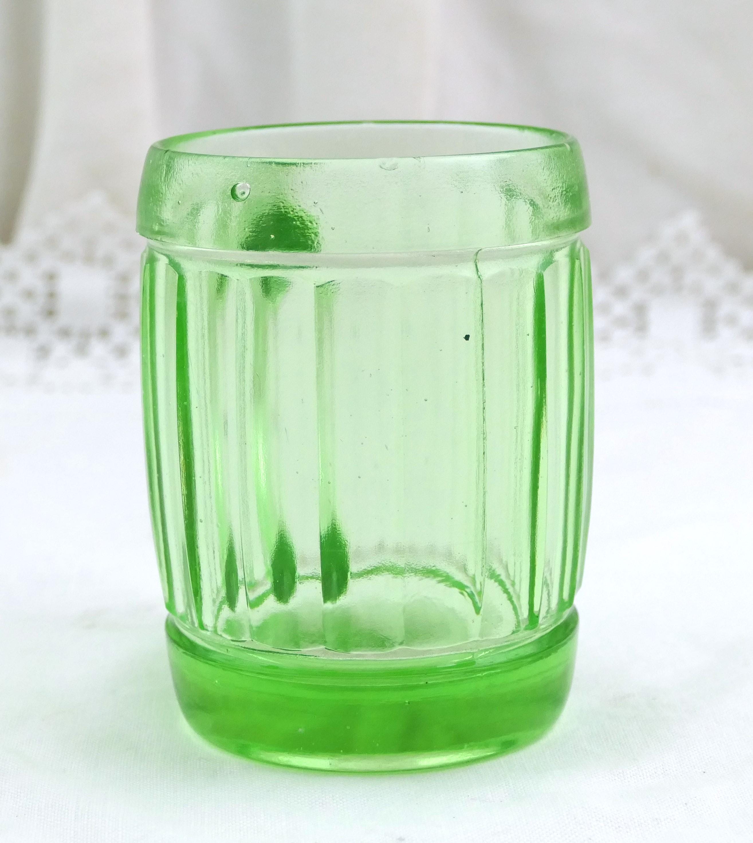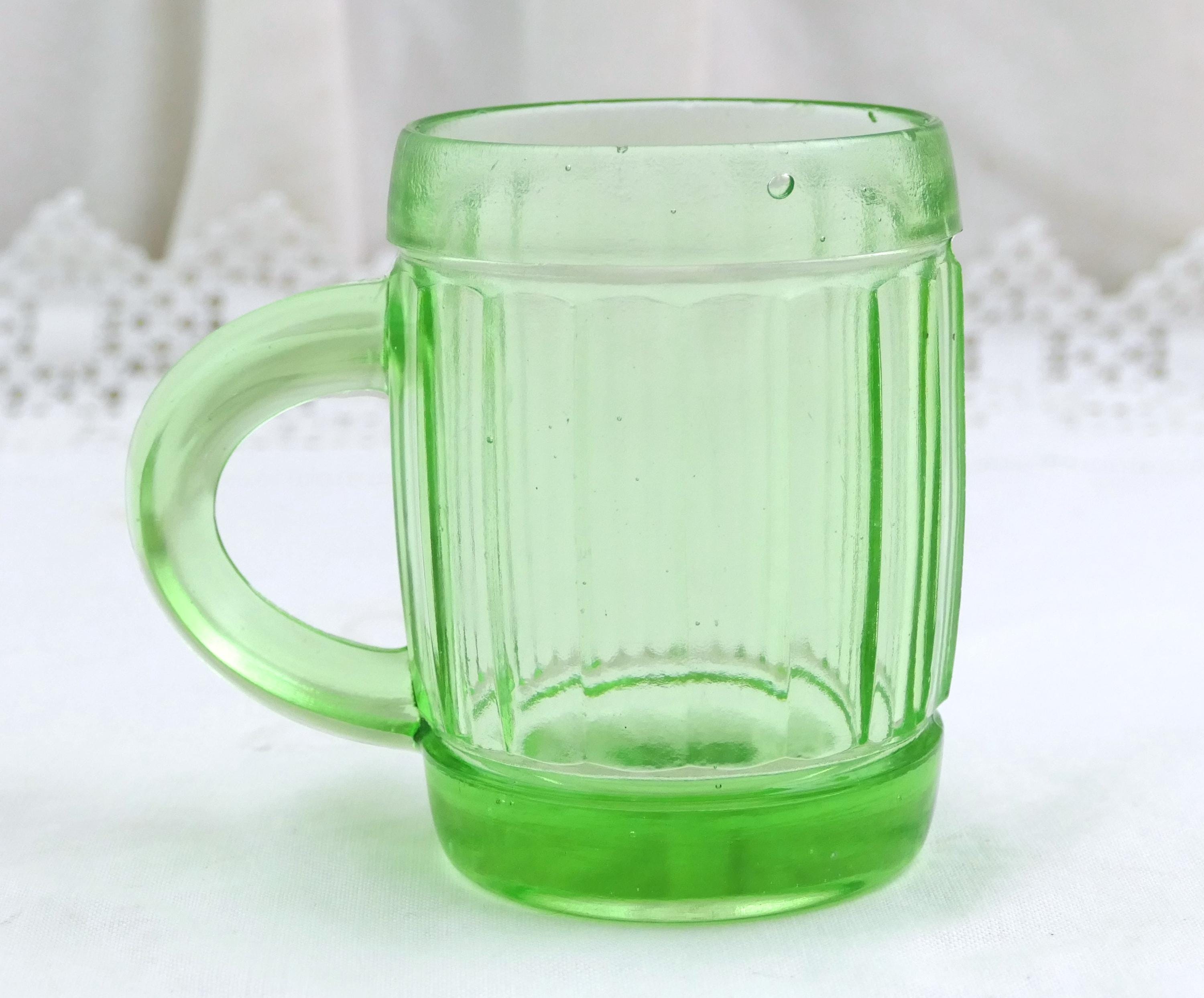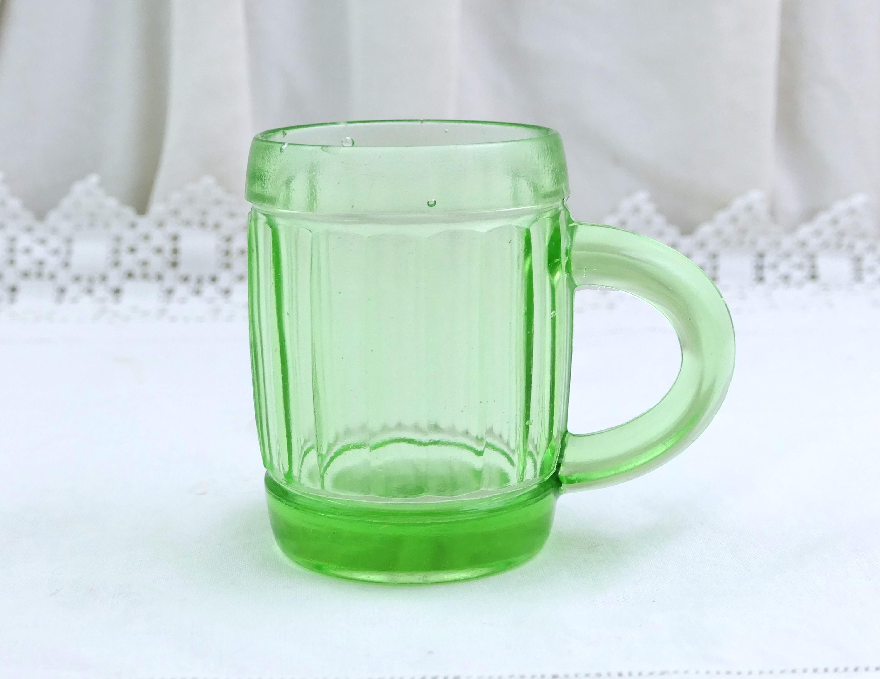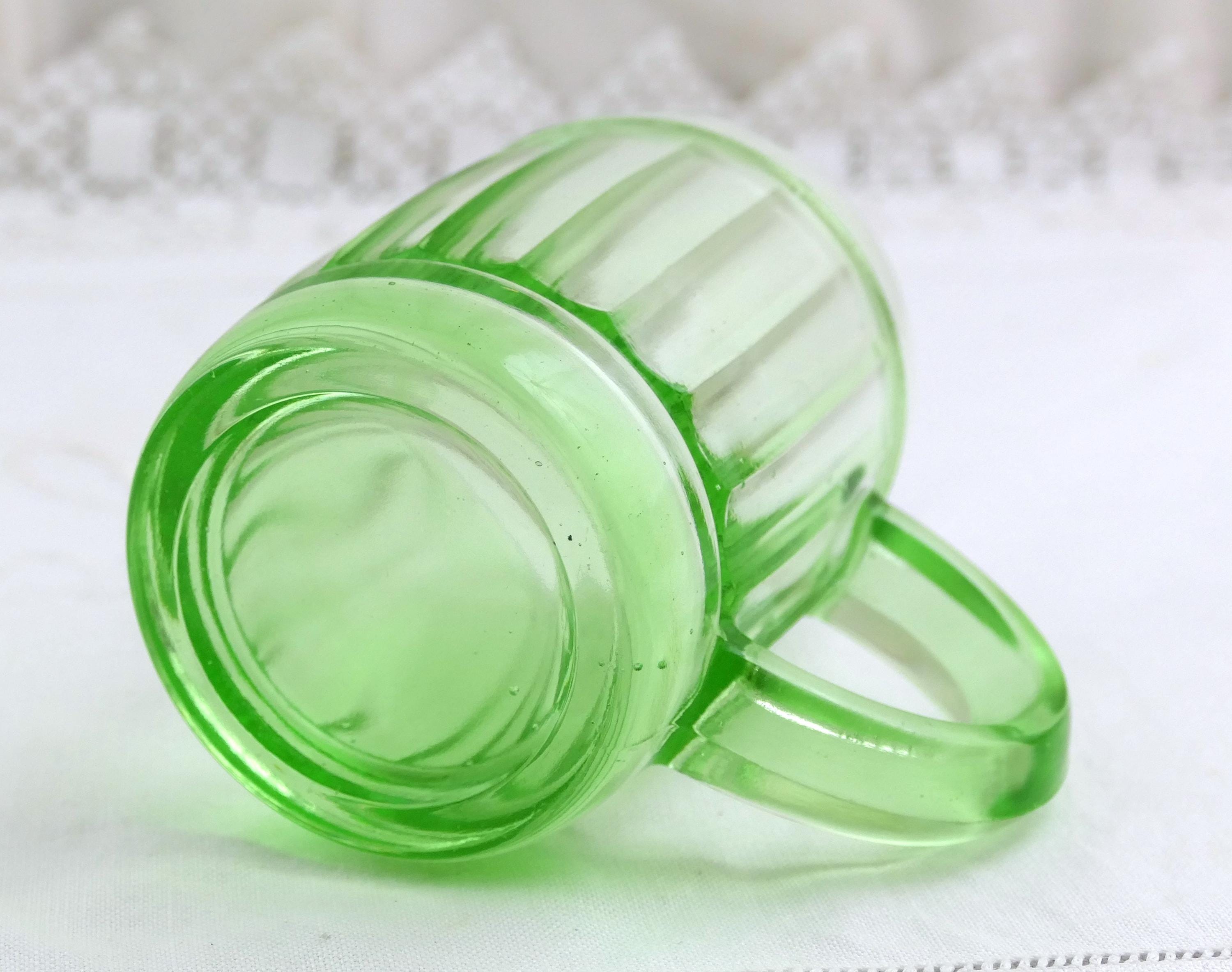 Small vintage Vaseline glass mug. Made of pressed green glass with small air bubbles. Ca early 1900s.