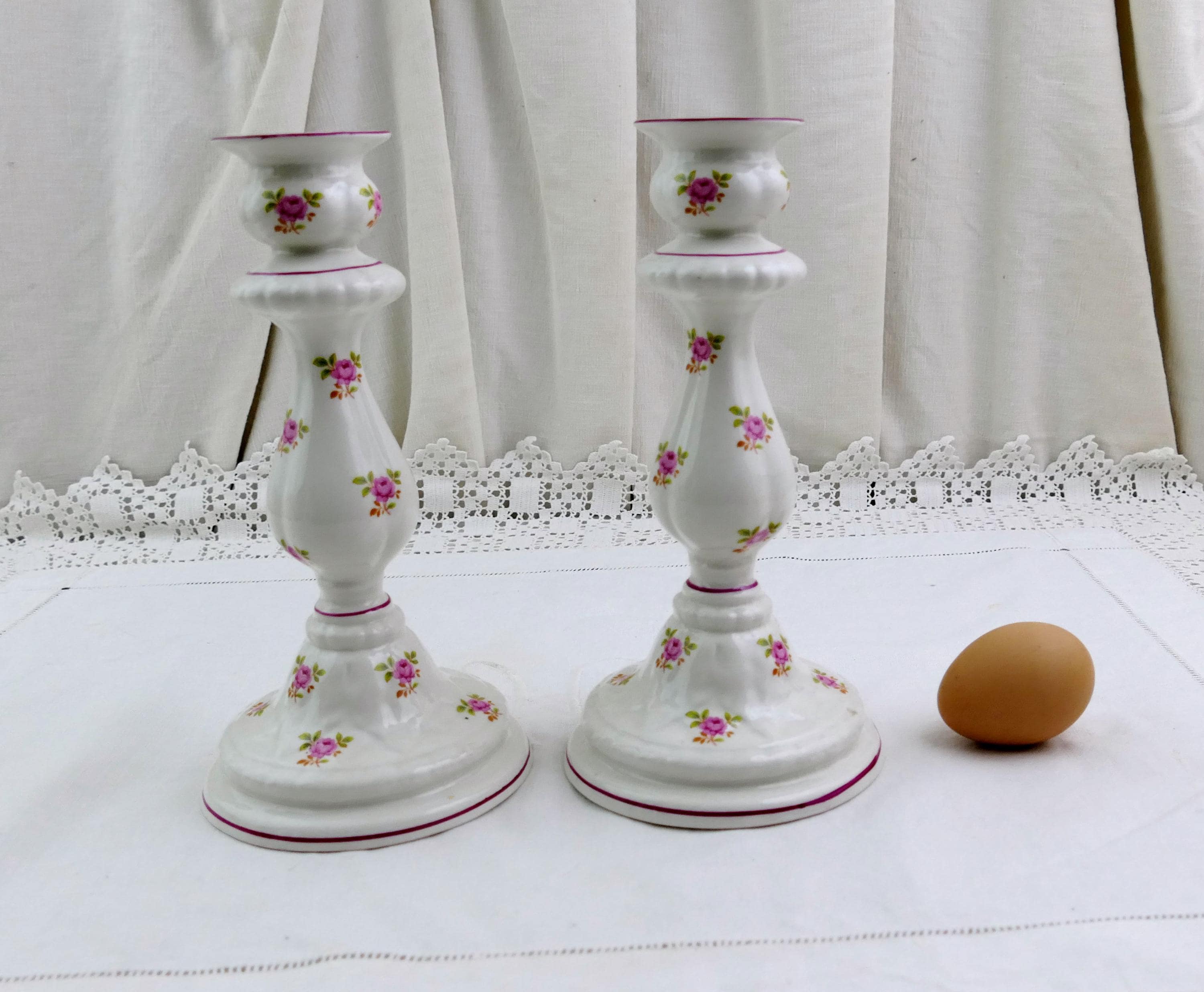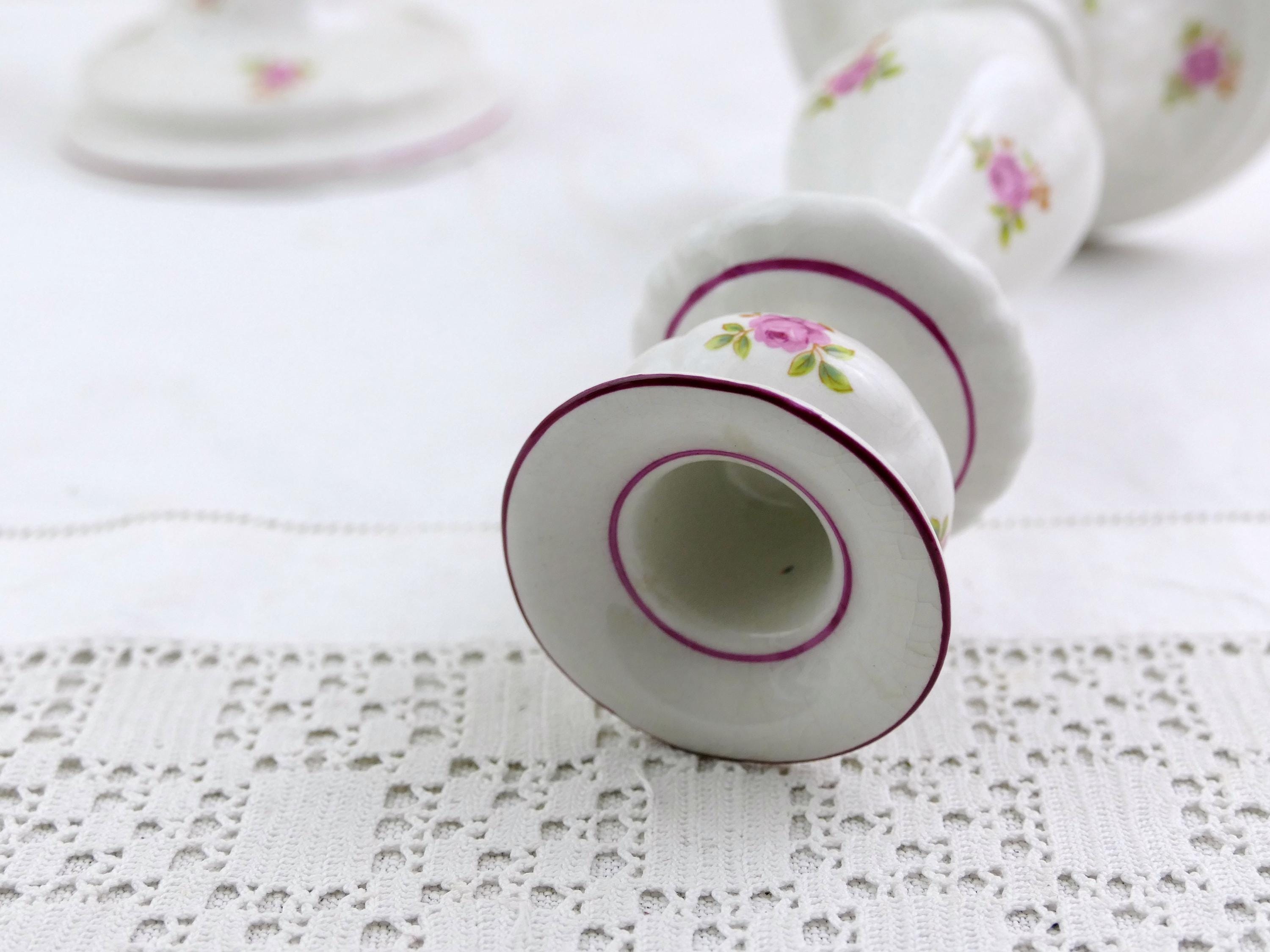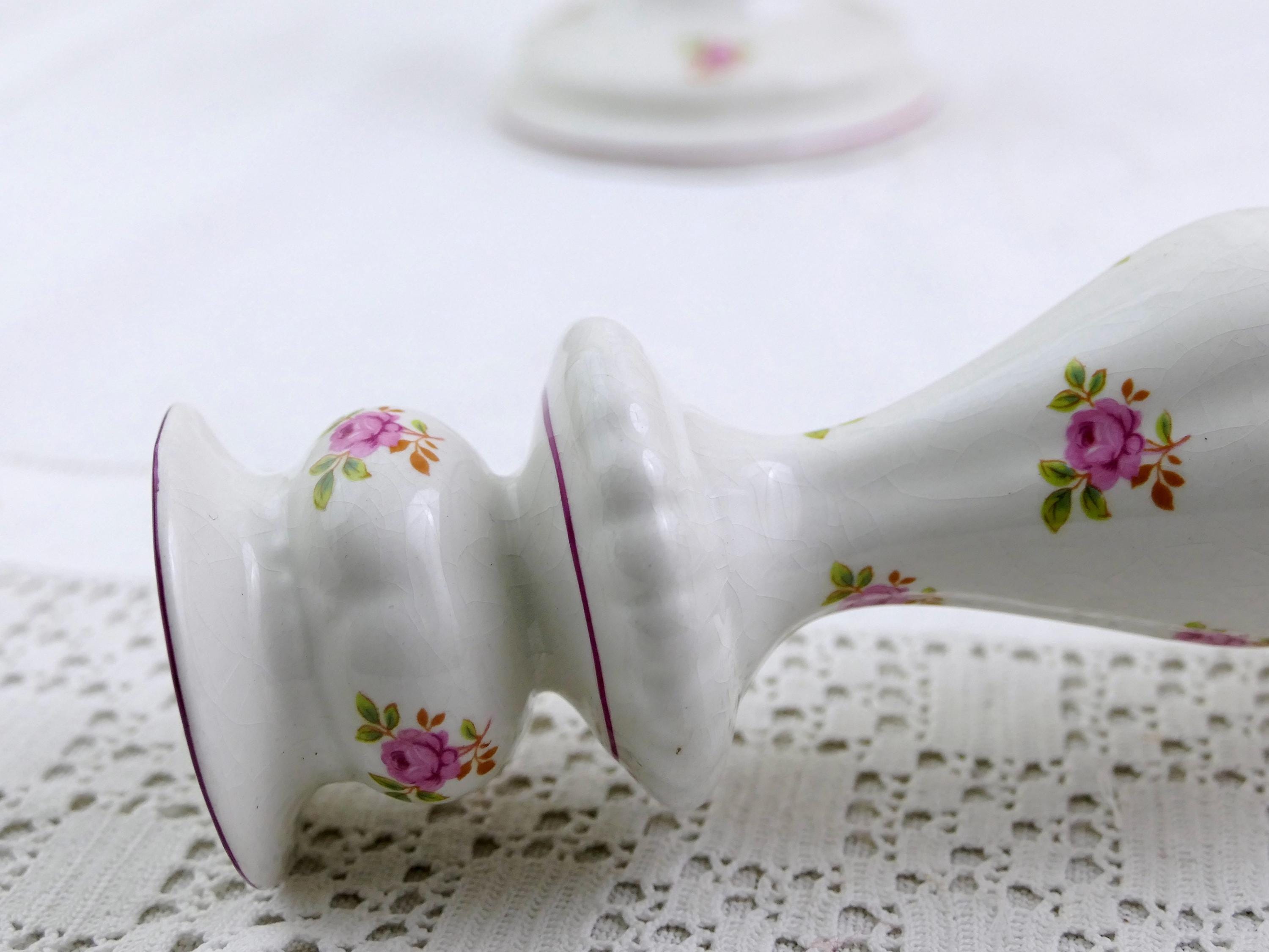 Pair of vintage English candle holders with small pink rose pattern. Made by James Kent in Staffordshire. Ca 1950s.
