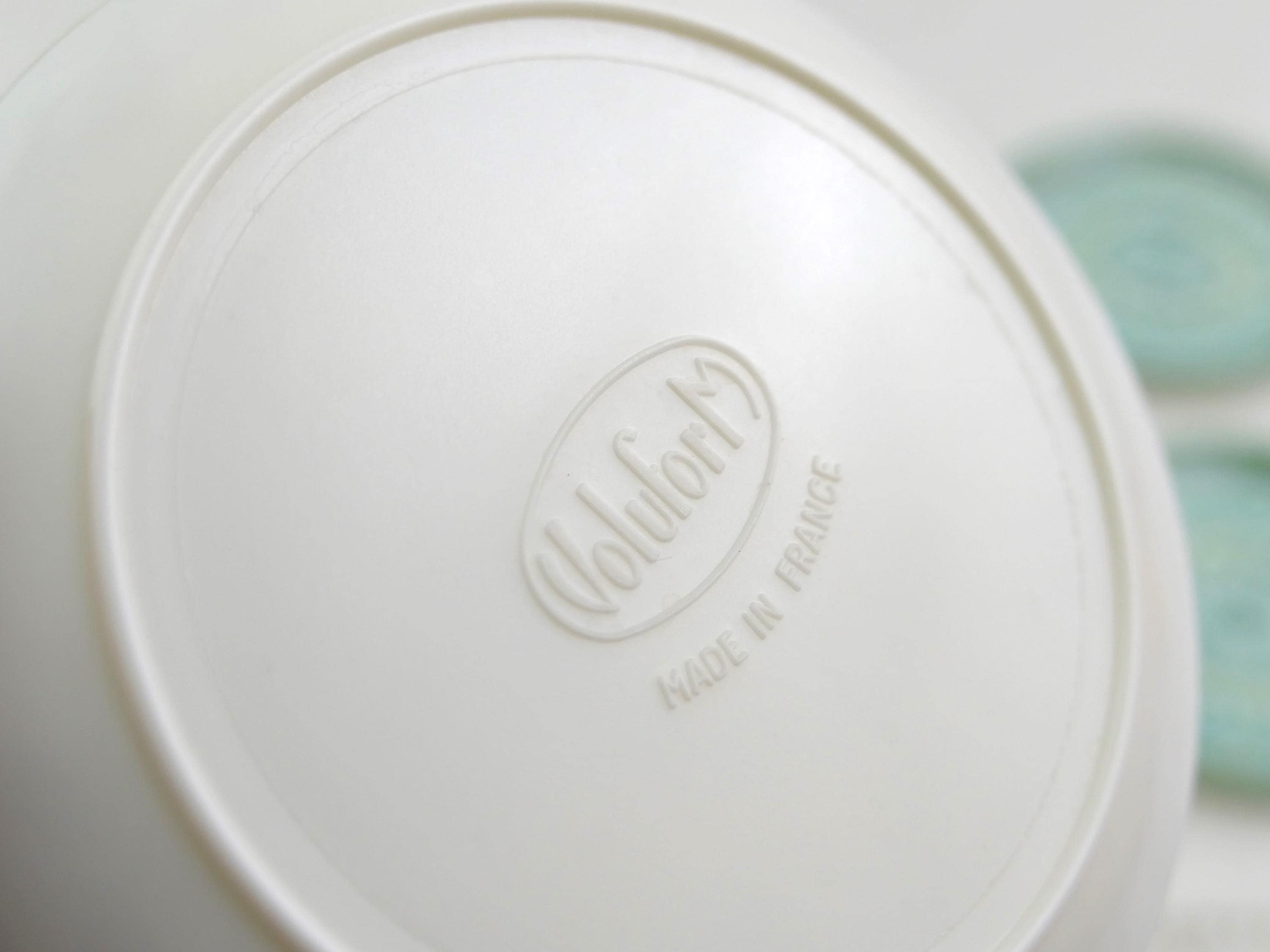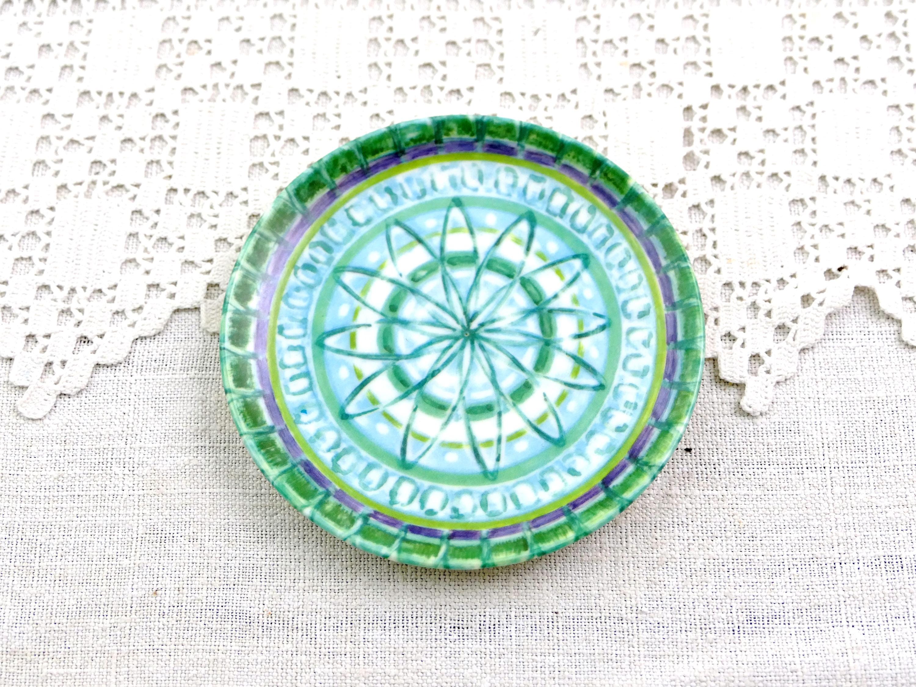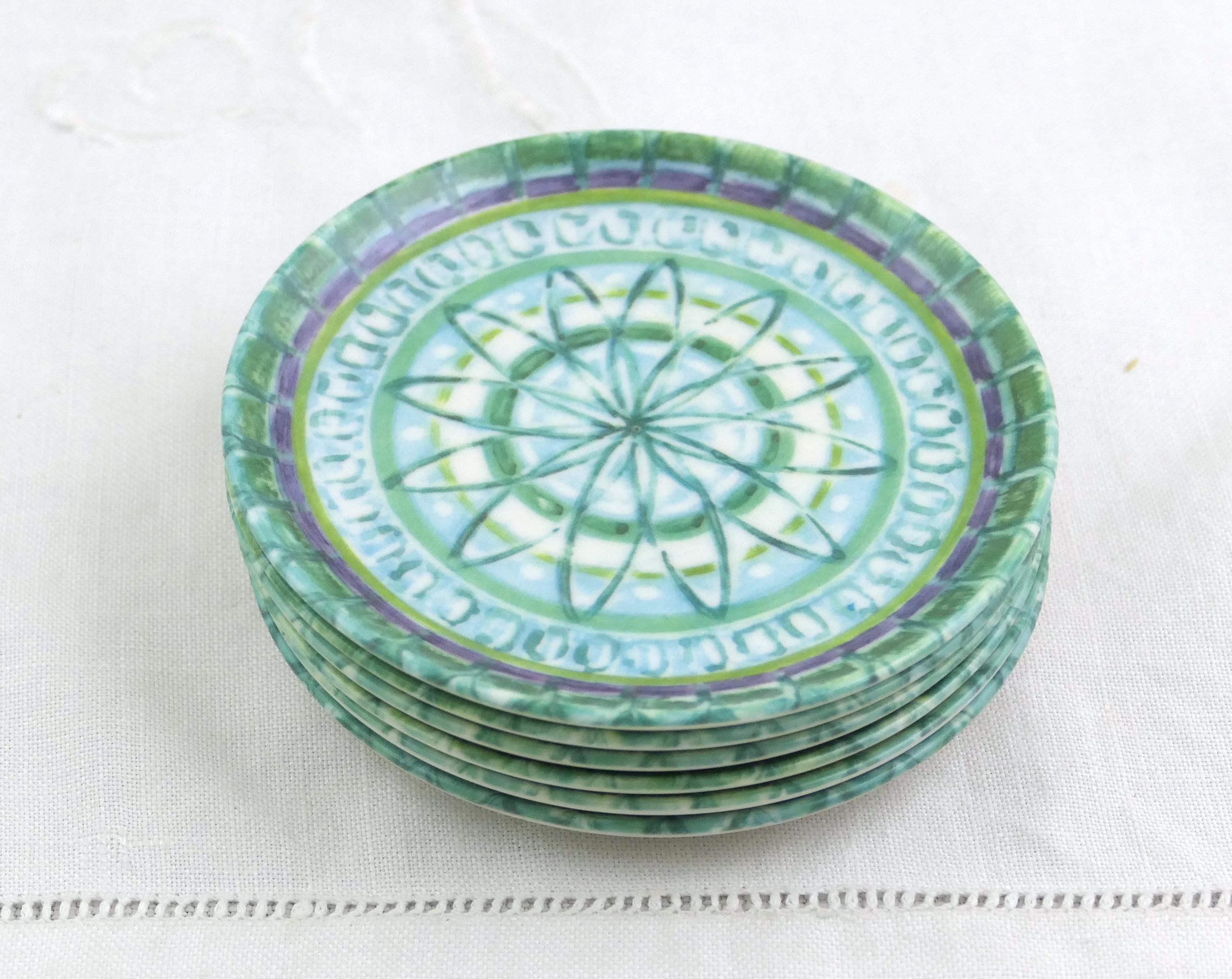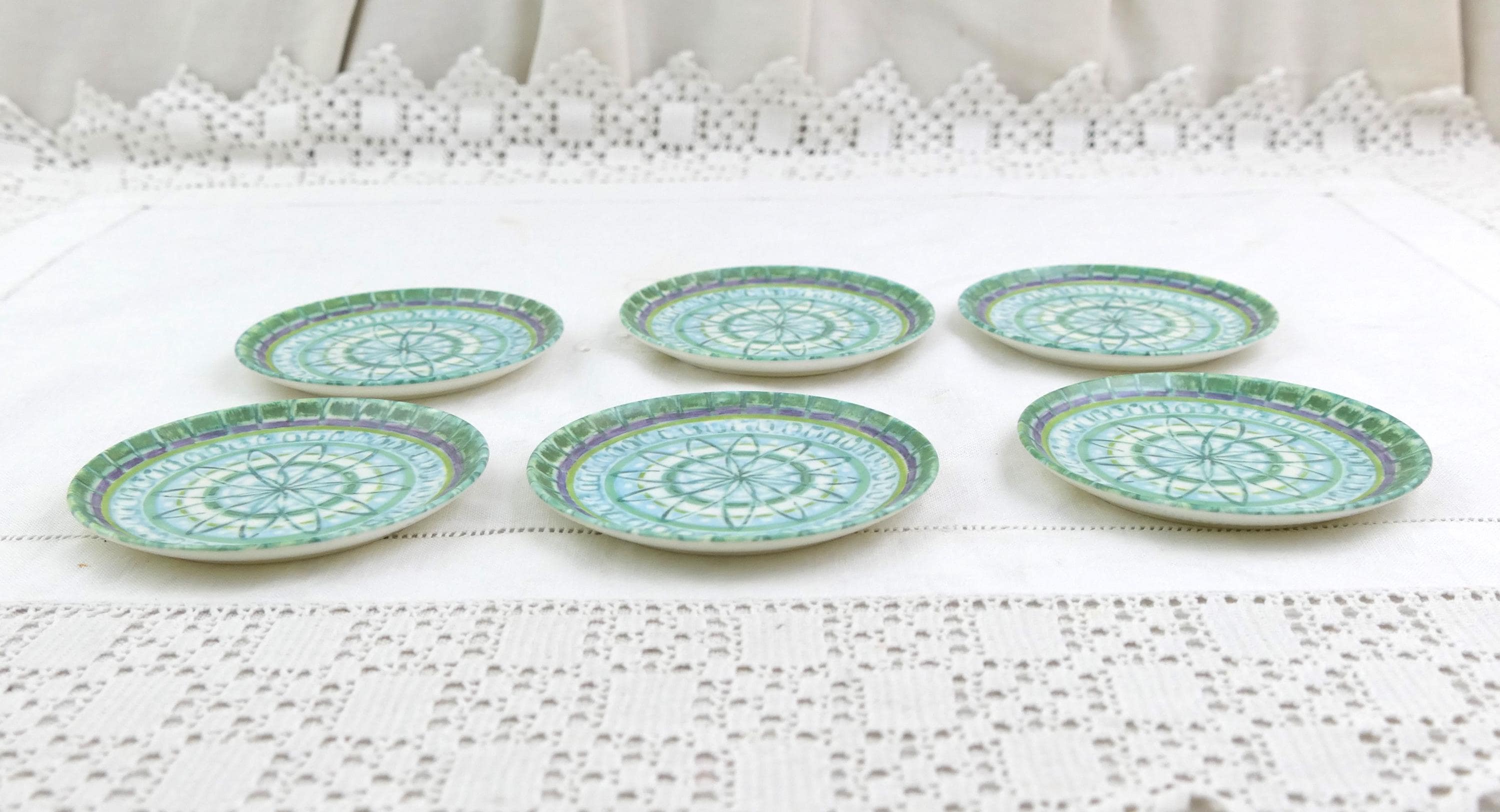 Vintage set of 6 drinks coasters with turquoise pattern. Made in France by Voluform of melamine. Ca 1960s.