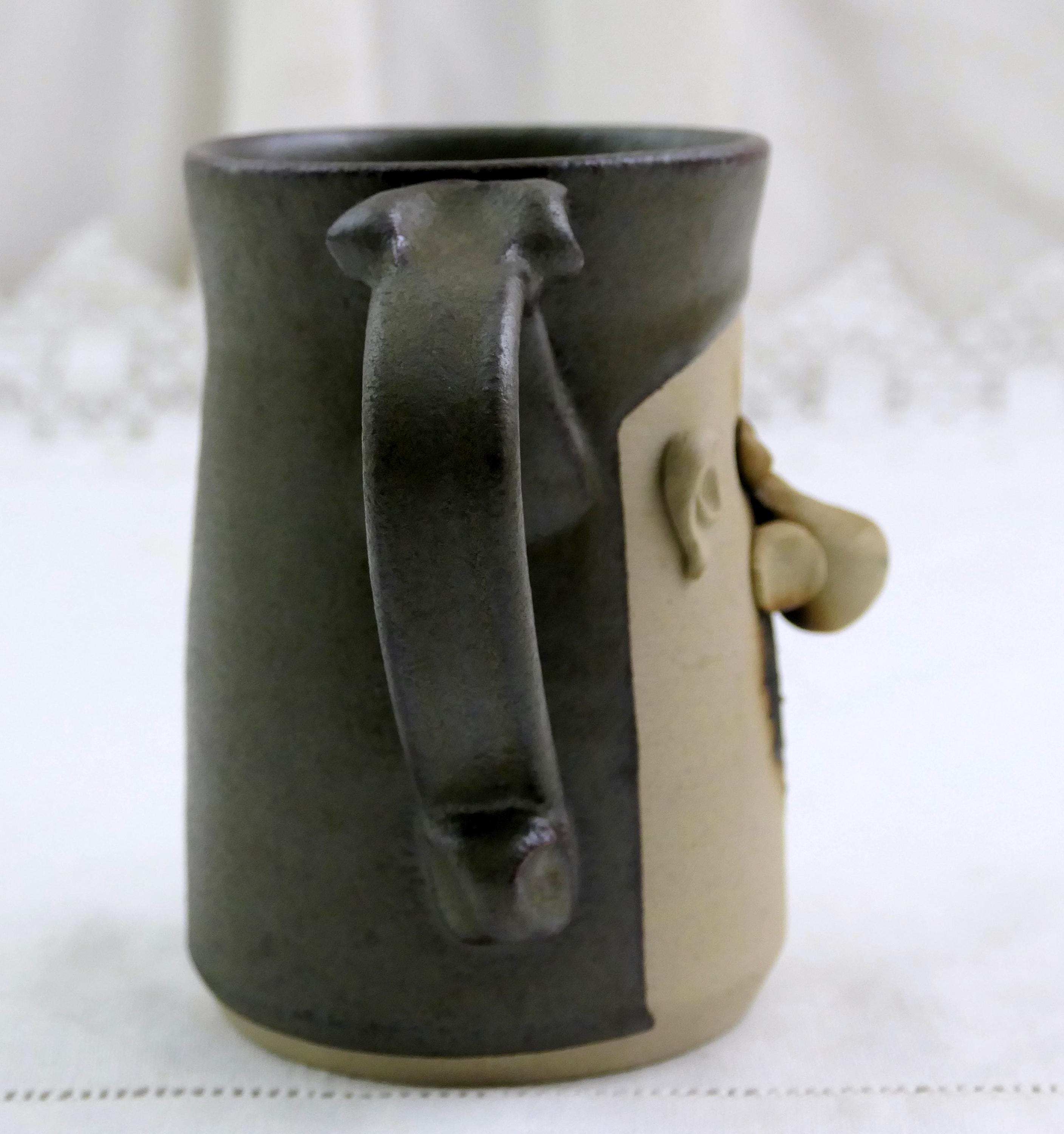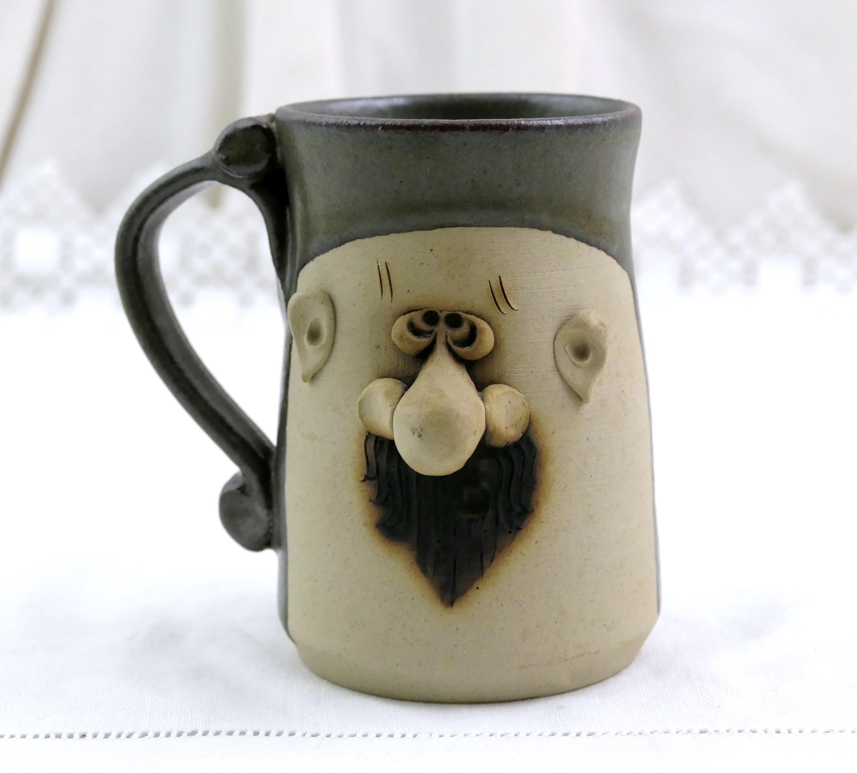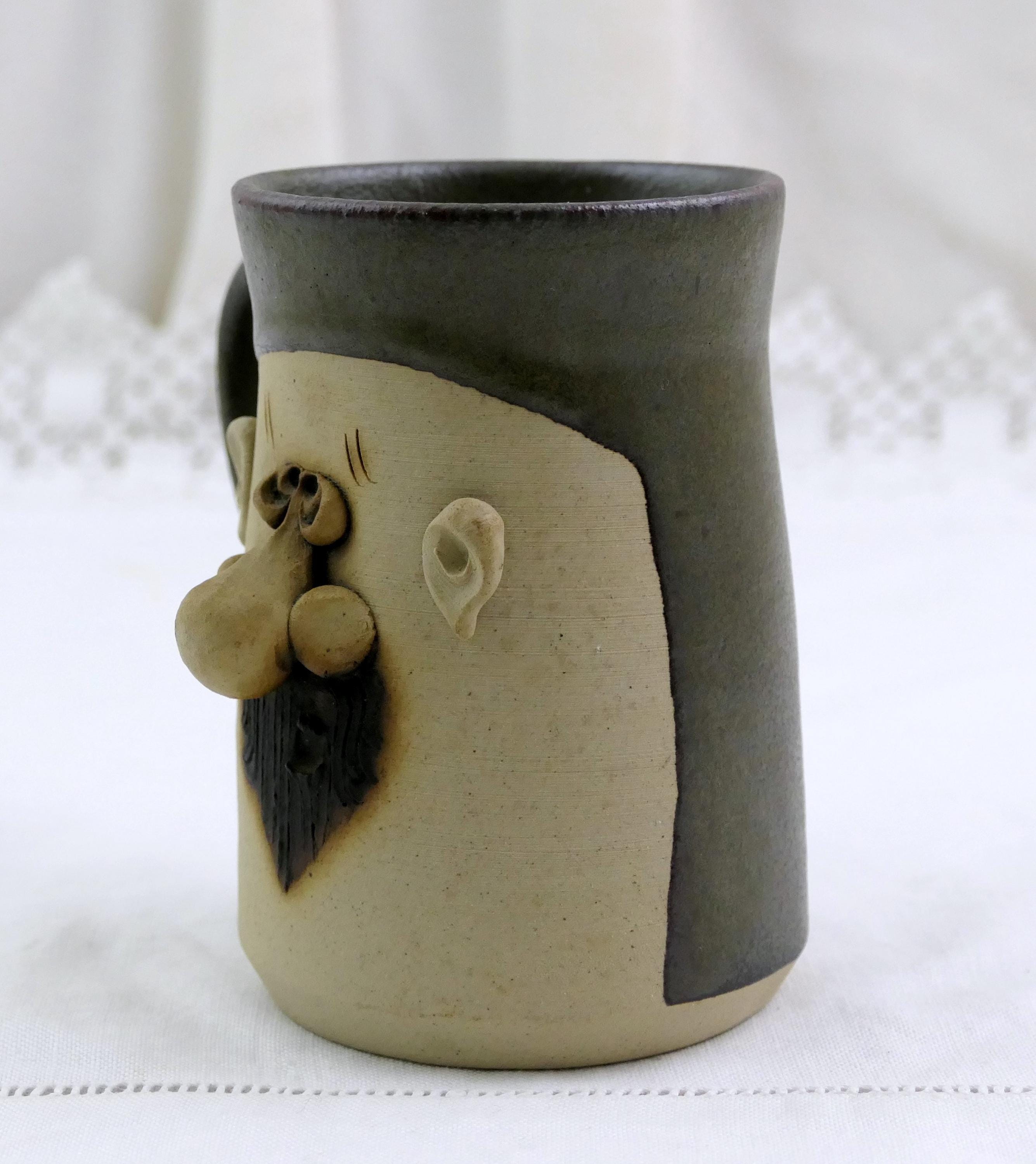 Vintage handmade coffee mug with a 3 dimensional face. Handmade of stoneware pottery. Ca late 1900s.