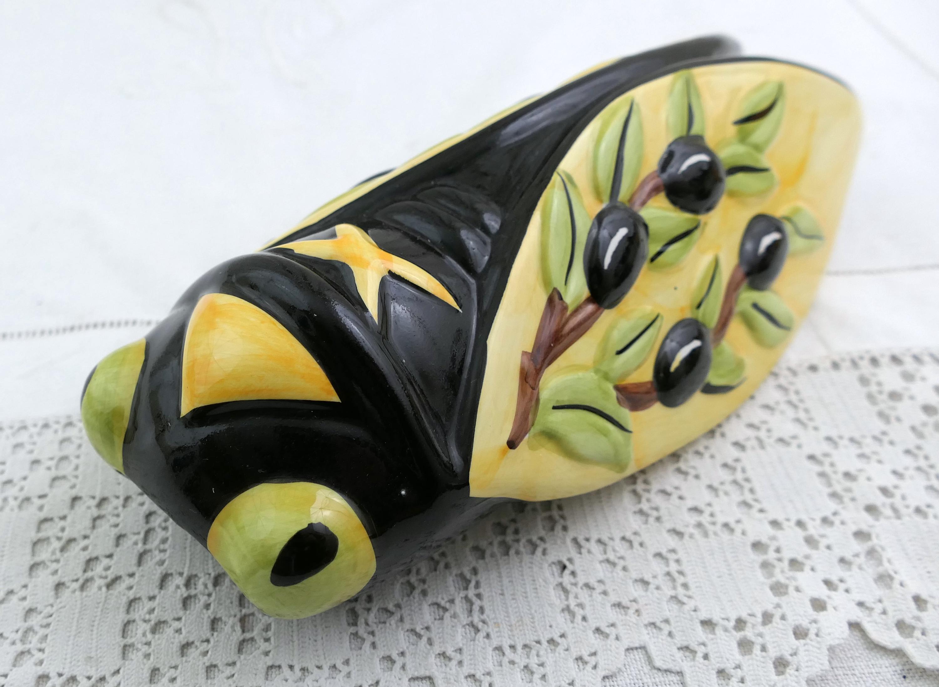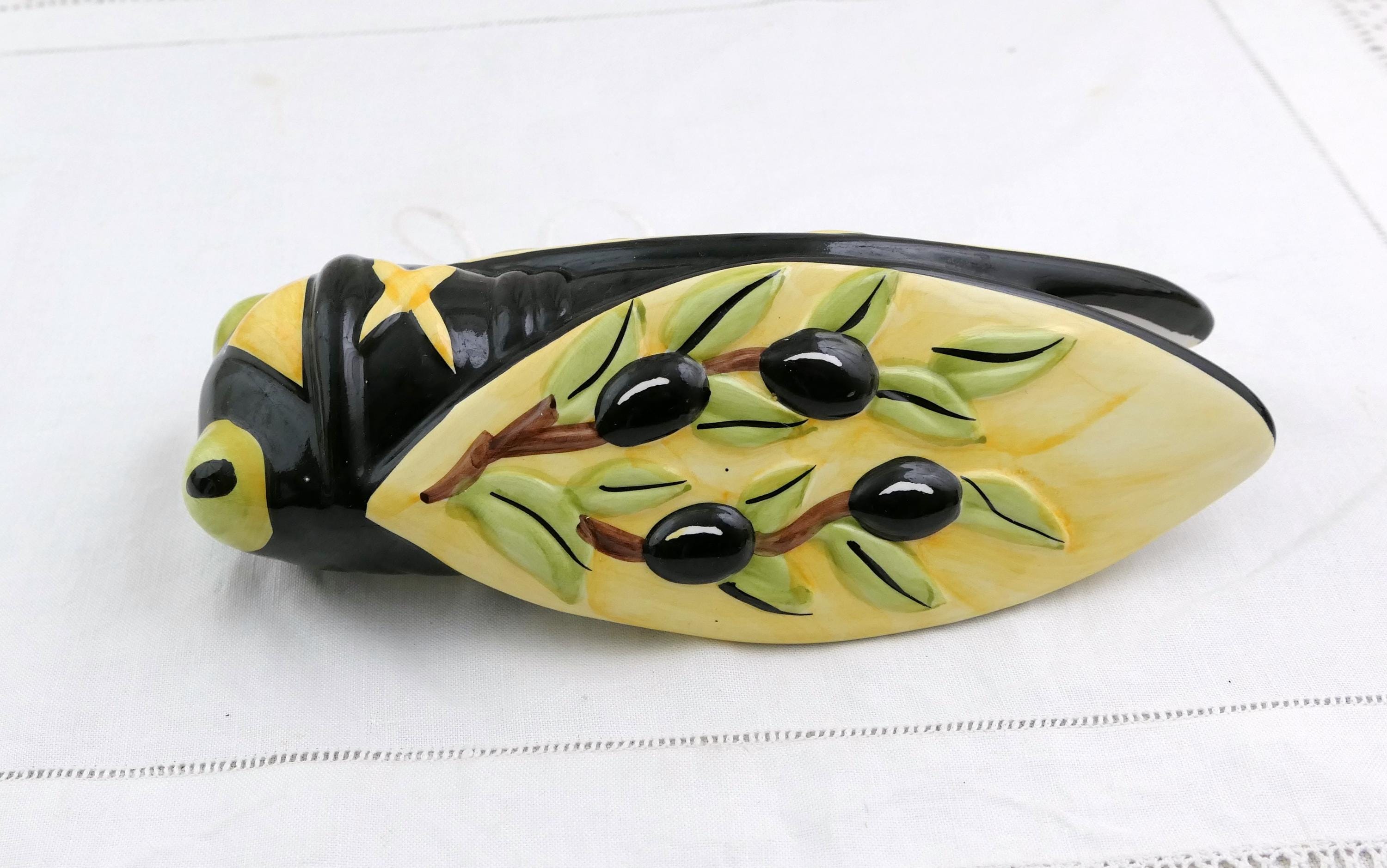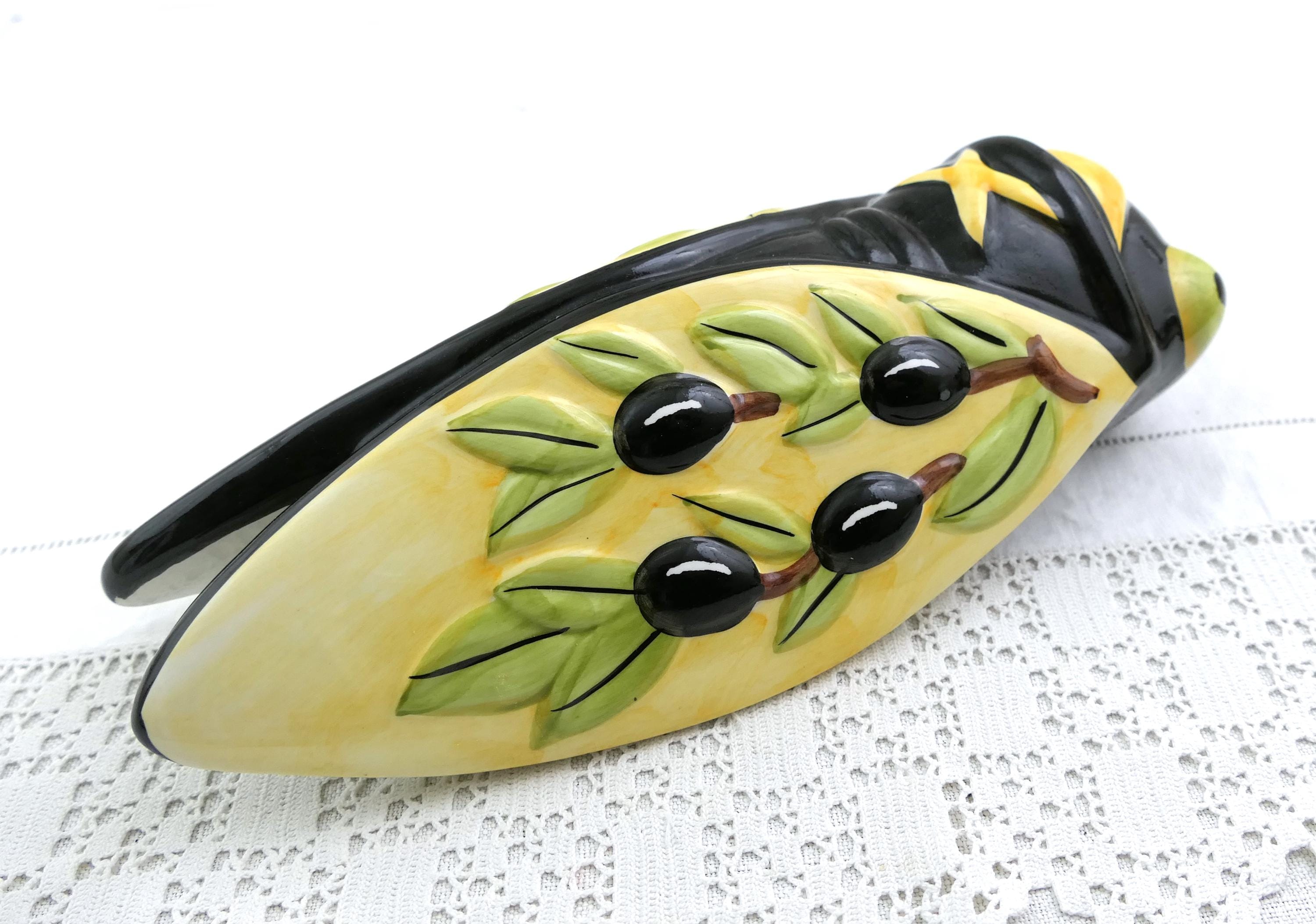 Vintage French cicada wall pocket vase. Made by Nem of glazed pottery. Ca late 1900s.