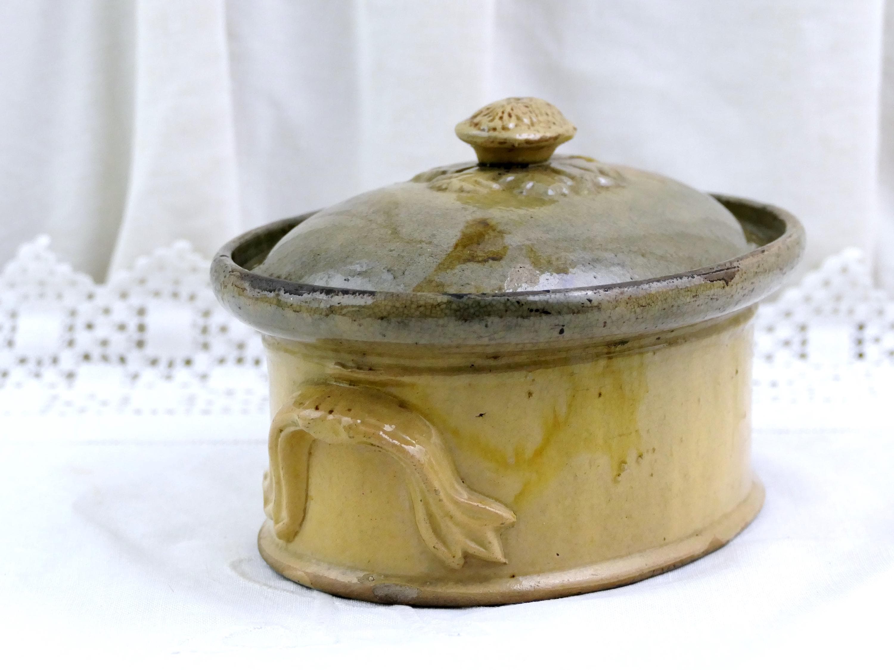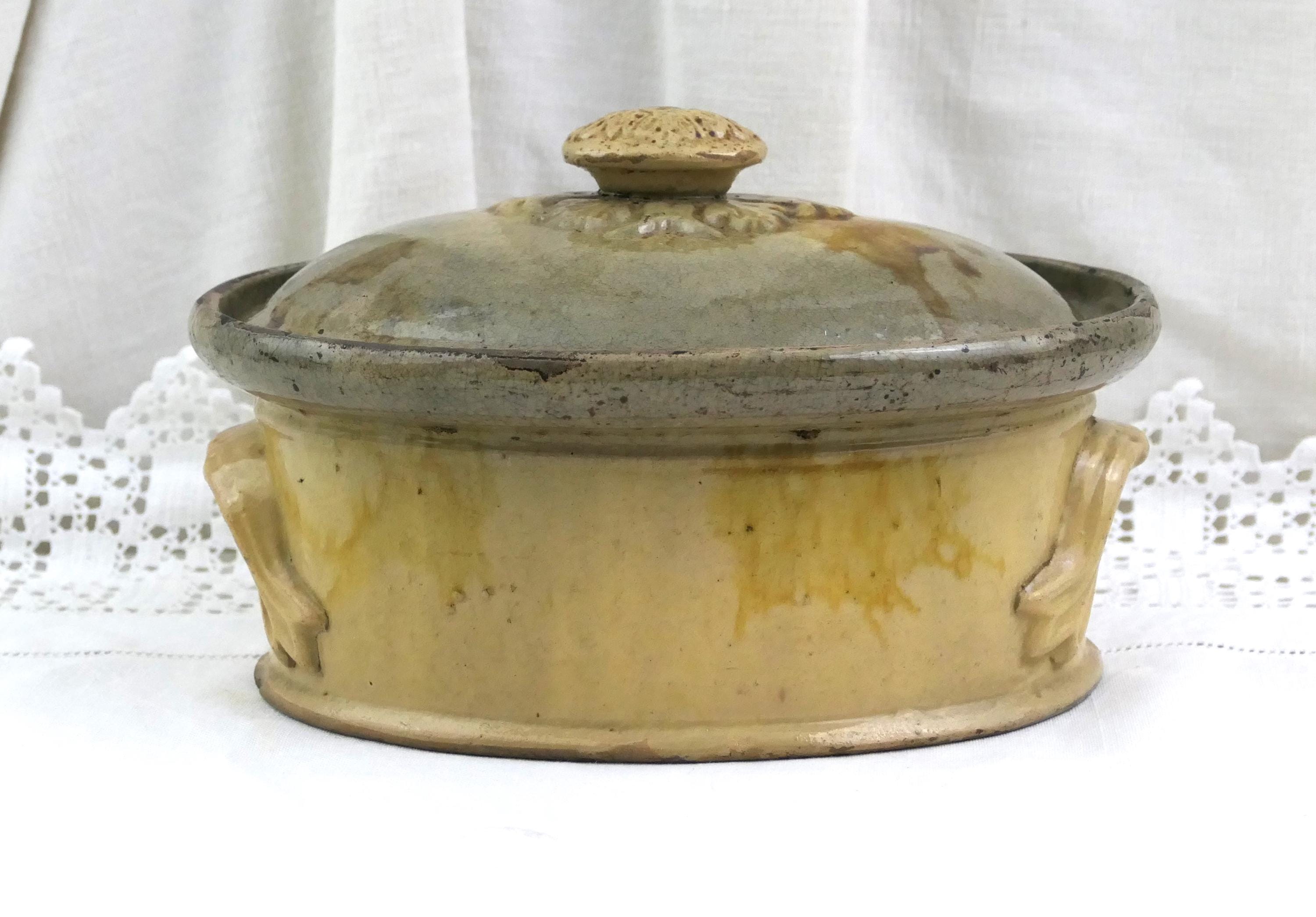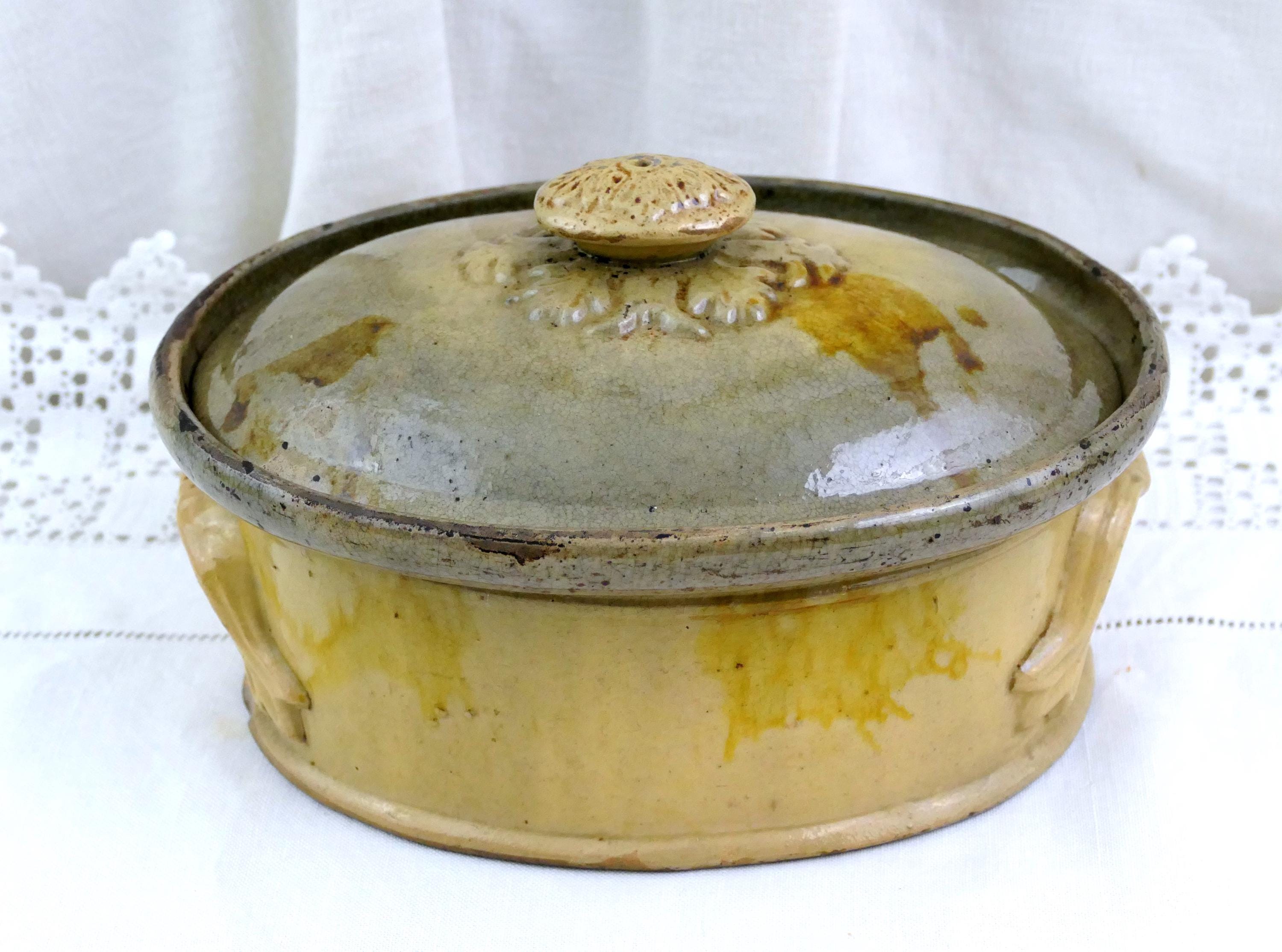 Antique French terrine / casserole dish. Made of stoneware with a drip pattern glaze. Stamped with the maker's mark on the base. Primitive traditional ceramic dish that would have been used in a farmhouse kitchen for paté baking. Beige colored glaze. Found near Le Mans renown for it's Rillettes. Ca 1800s.