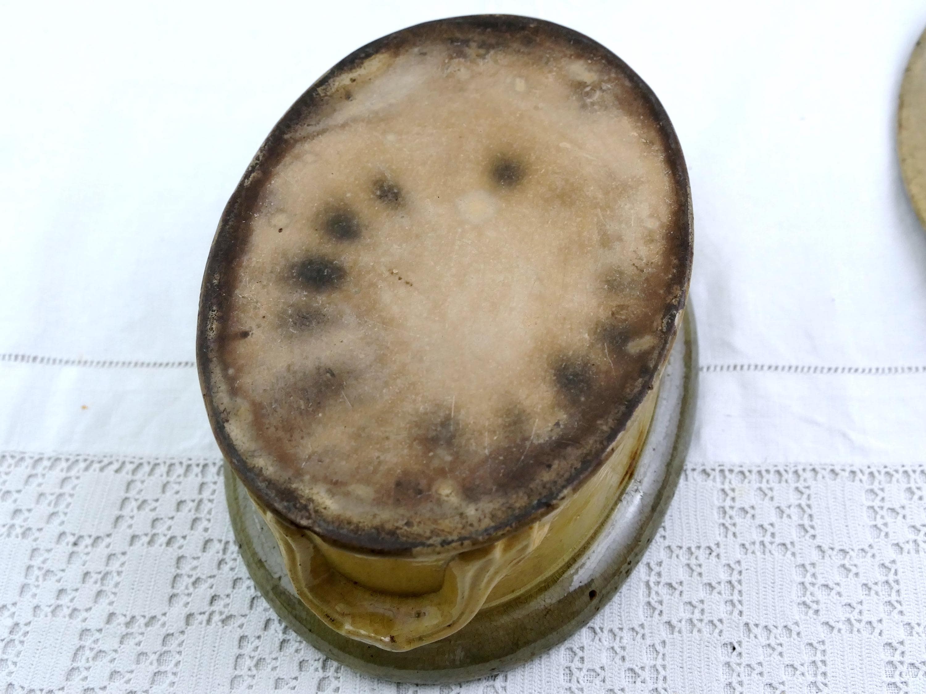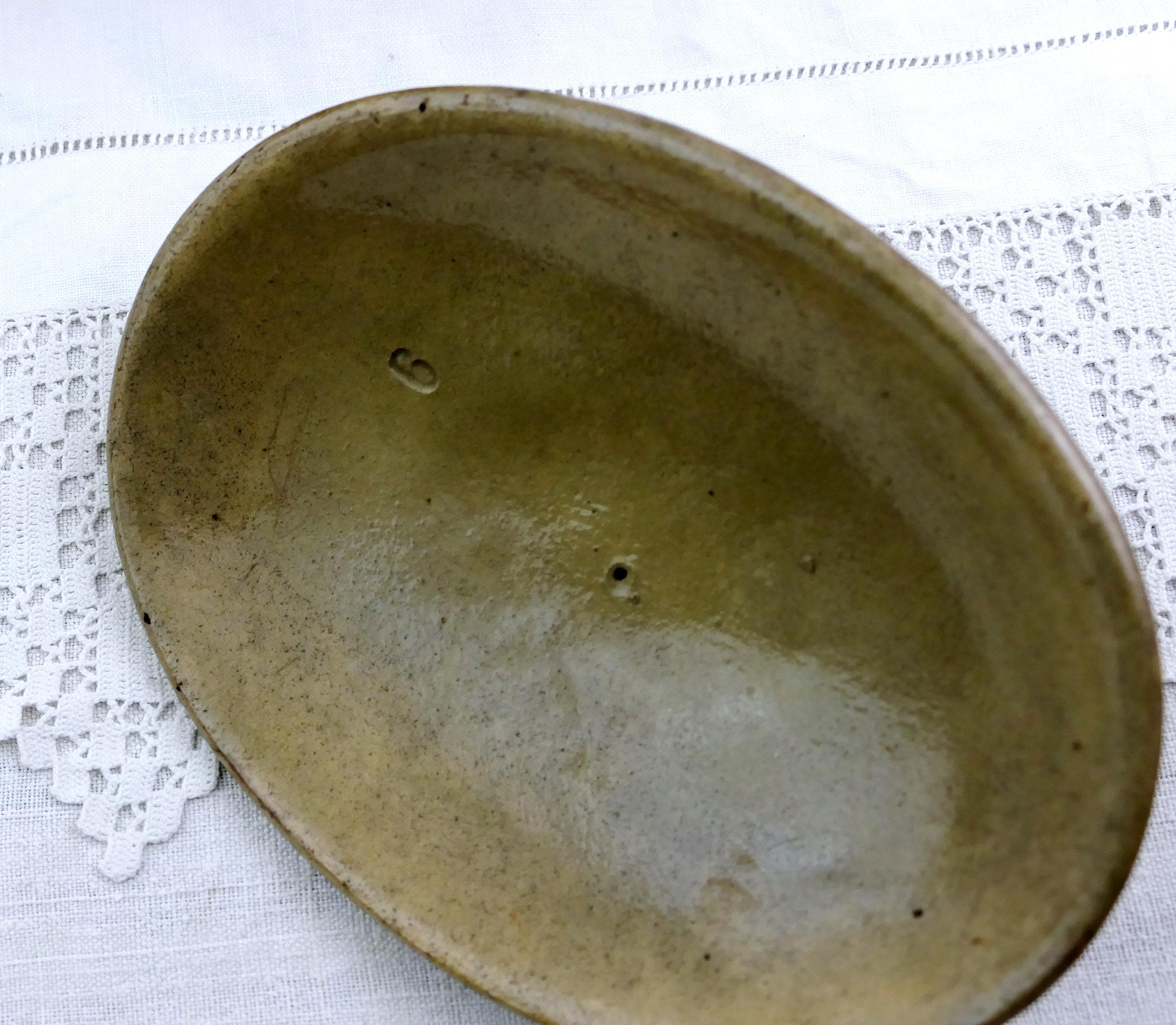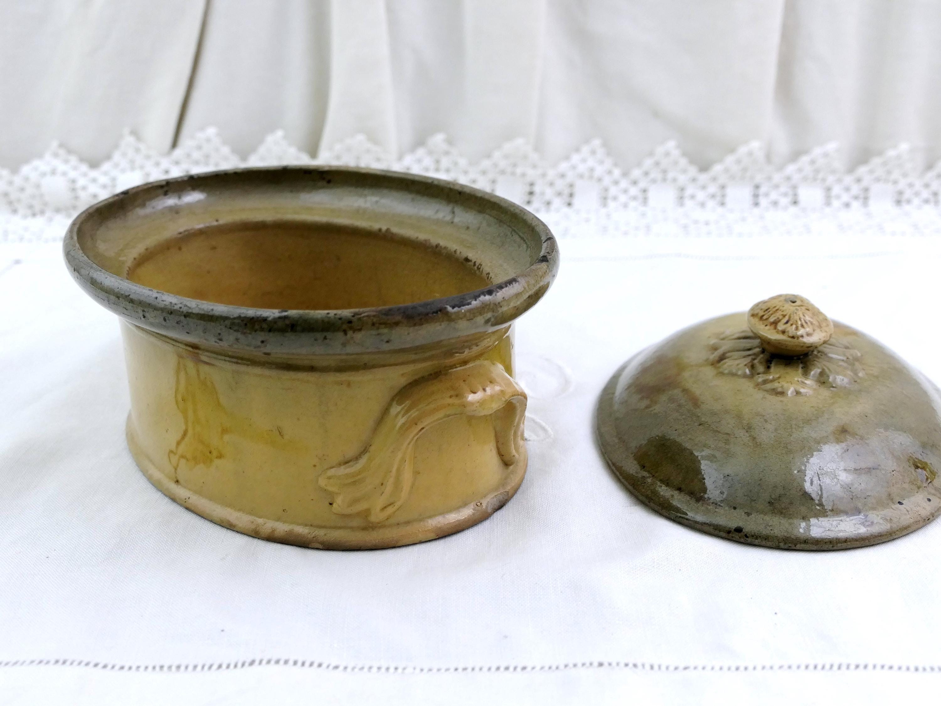 Antique French terrine / casserole dish. Made of stoneware with a drip pattern glaze. Stamped with the maker's mark on the base. Primitive traditional ceramic dish that would have been used in a farmhouse kitchen for paté baking. Beige colored glaze. Found near Le Mans renown for it's Rillettes. Ca 1800s.