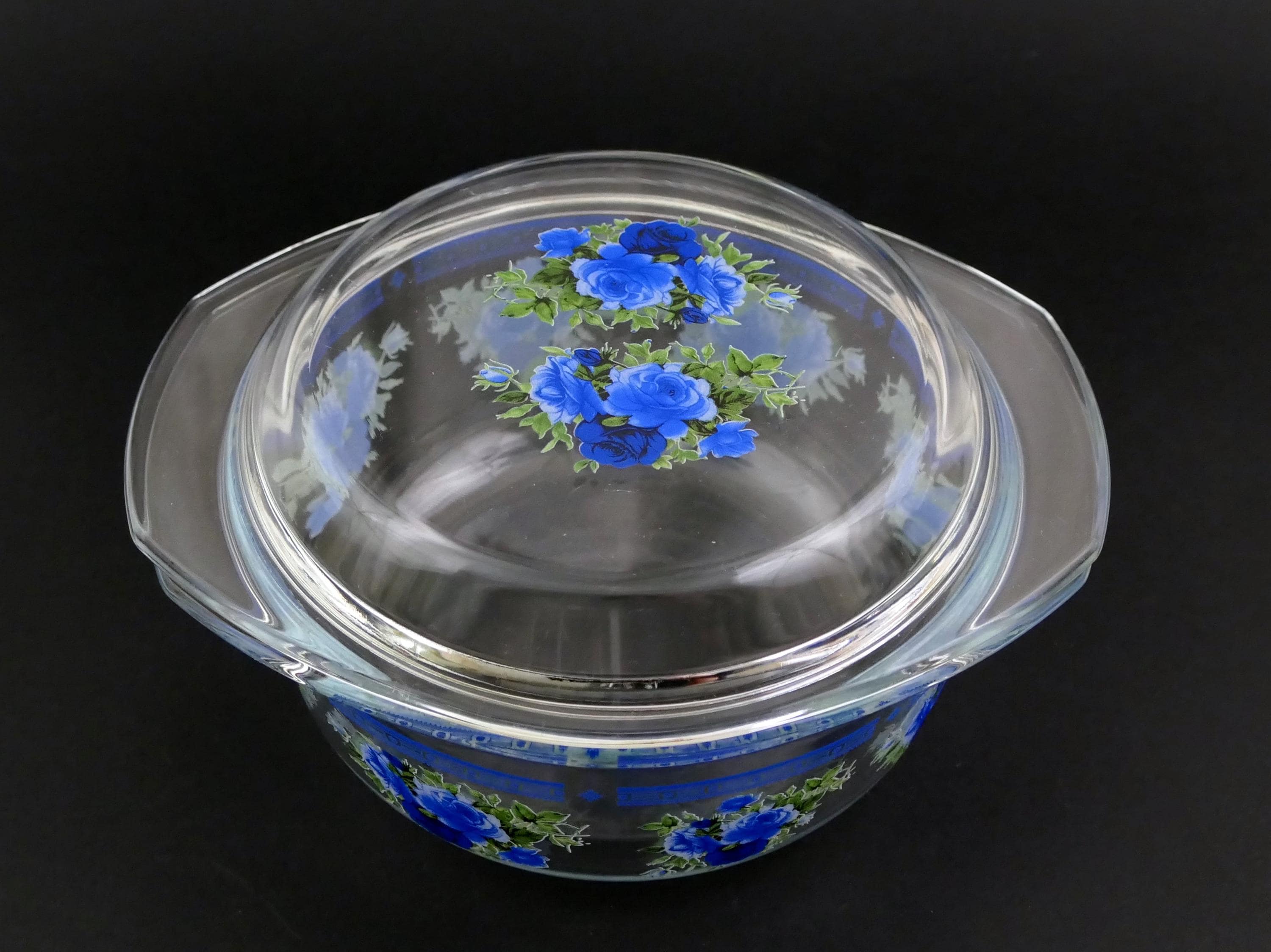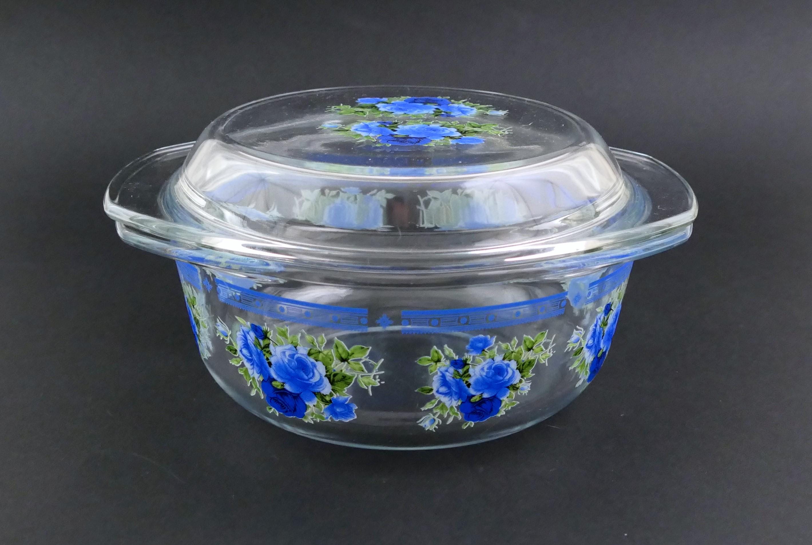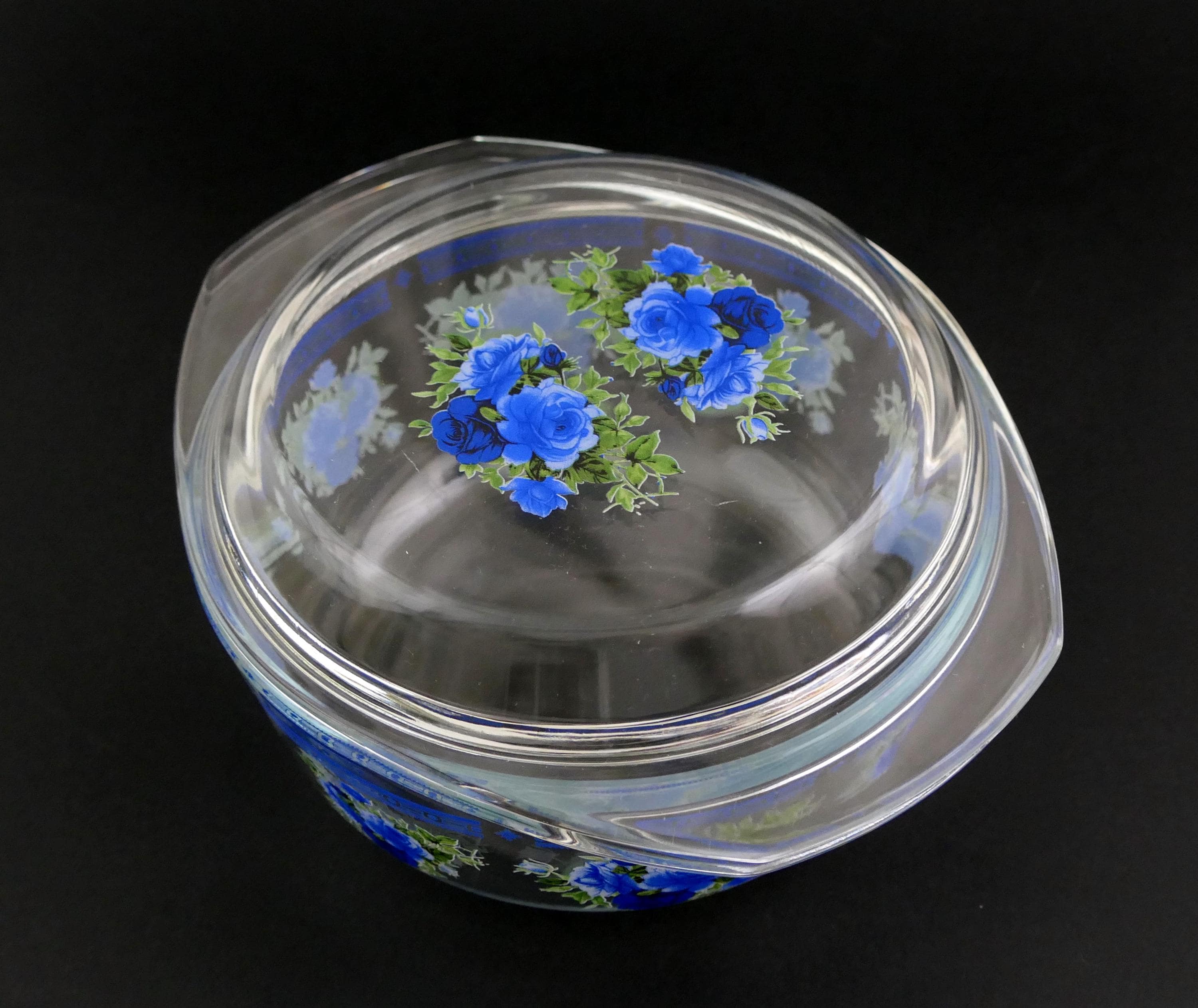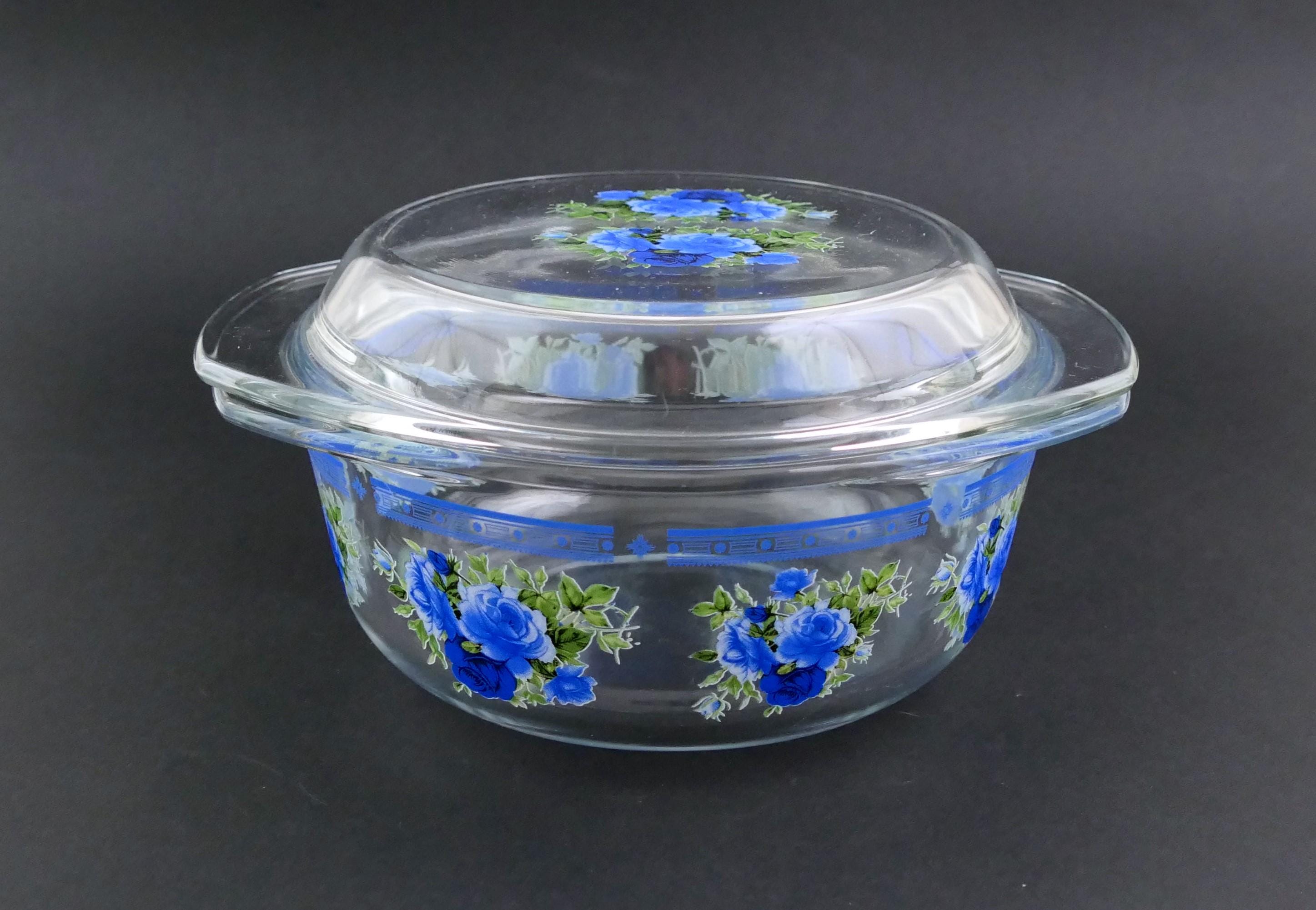 Small vintage casserole dish with clear glass lid and 2 side handles decorated with blue rose pattern. Made of clear glass. Circa 1970s.