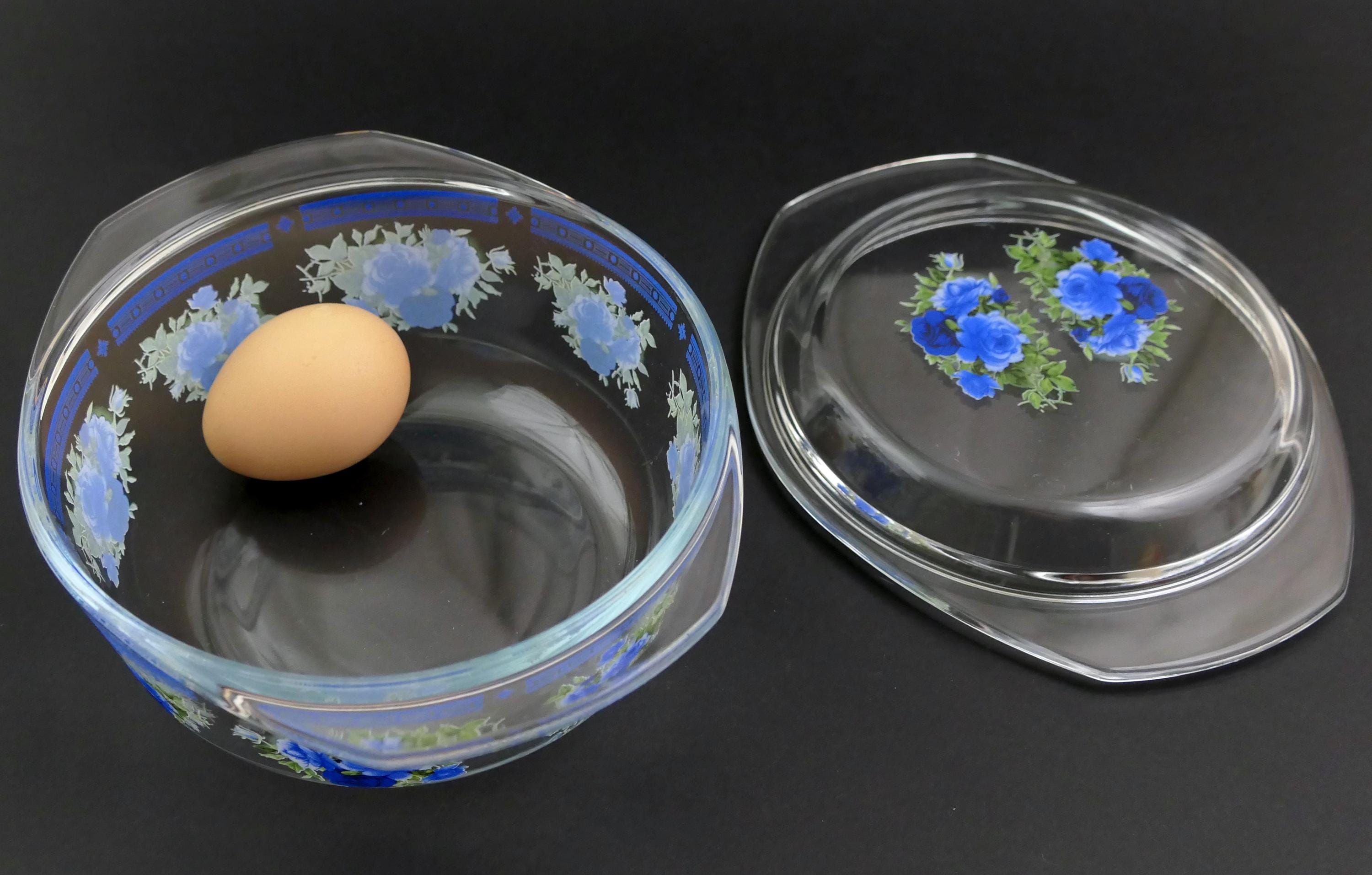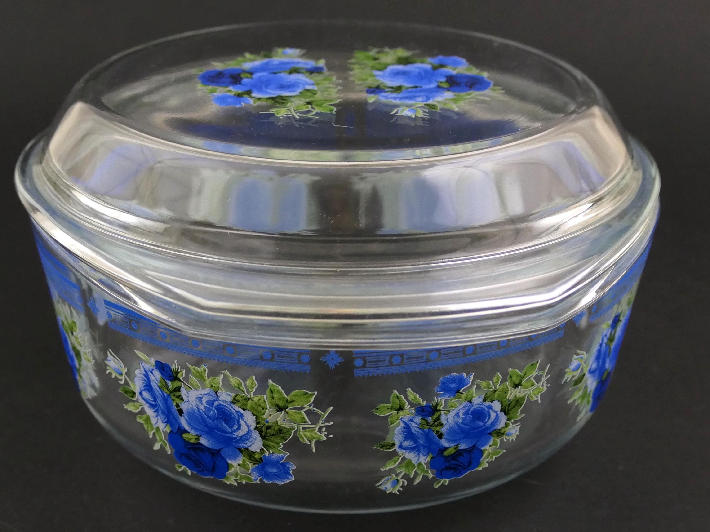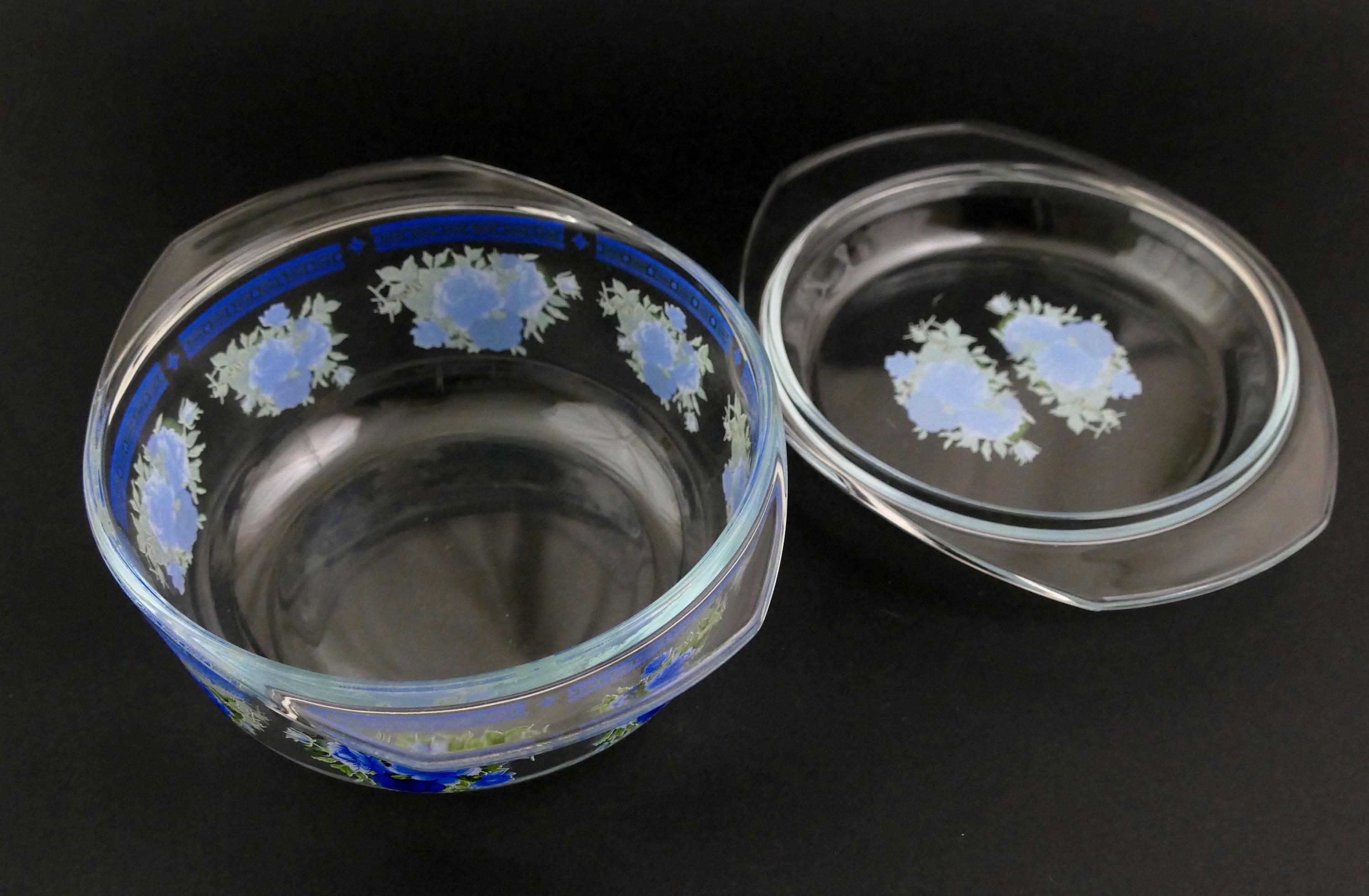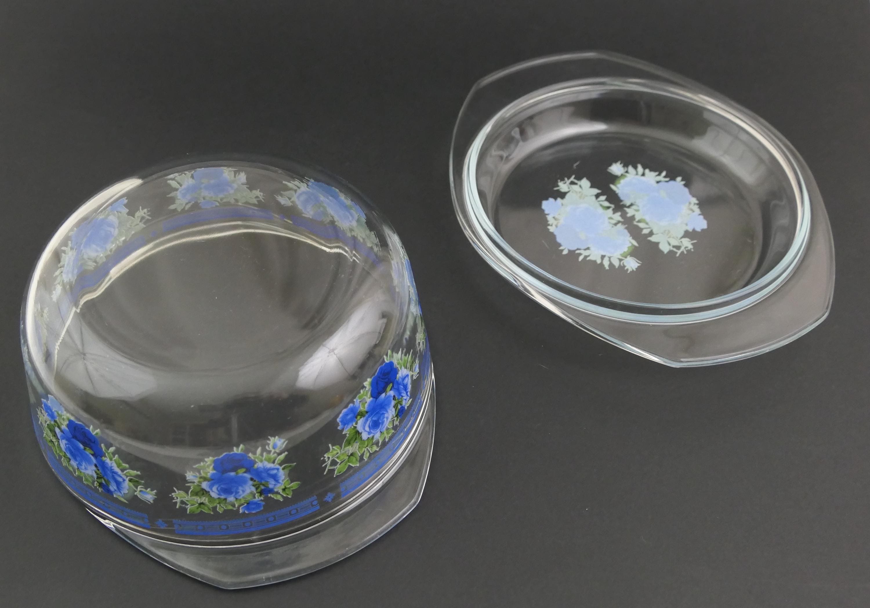 Small vintage casserole dish with clear glass lid and 2 side handles decorated with blue rose pattern. Made of clear glass. Circa 1970s.
