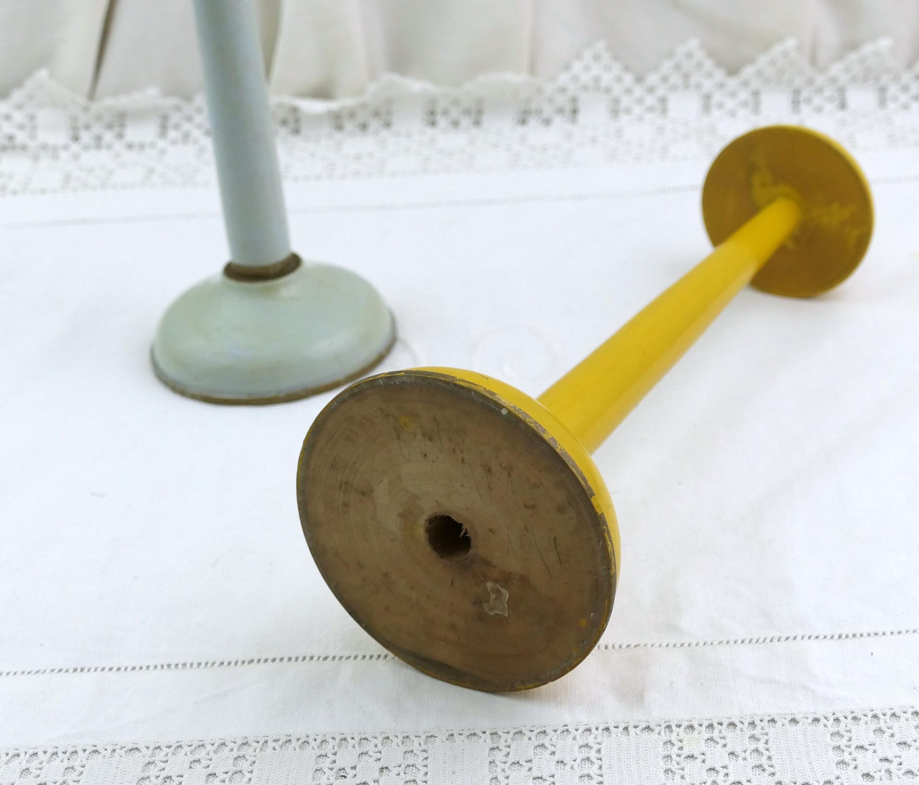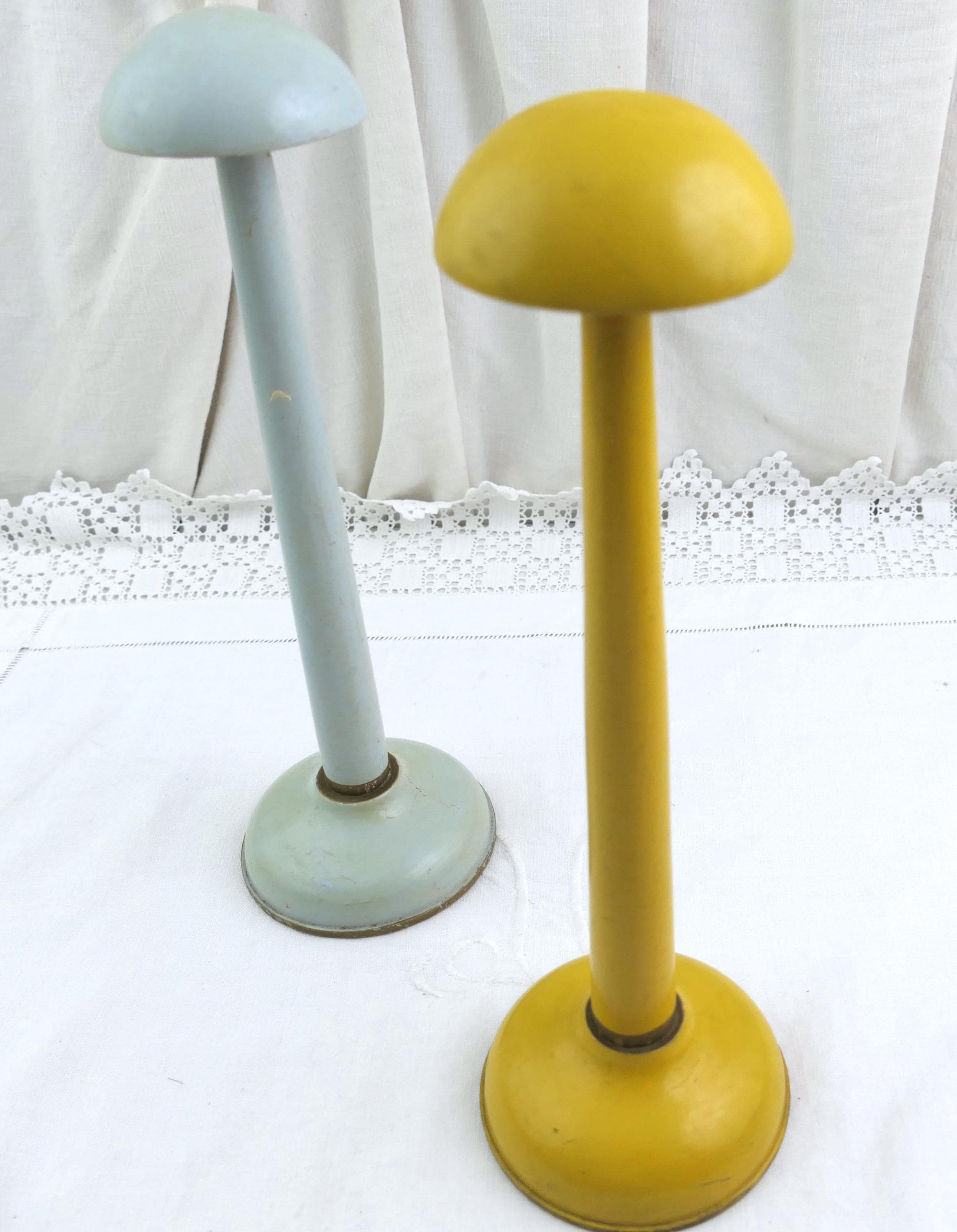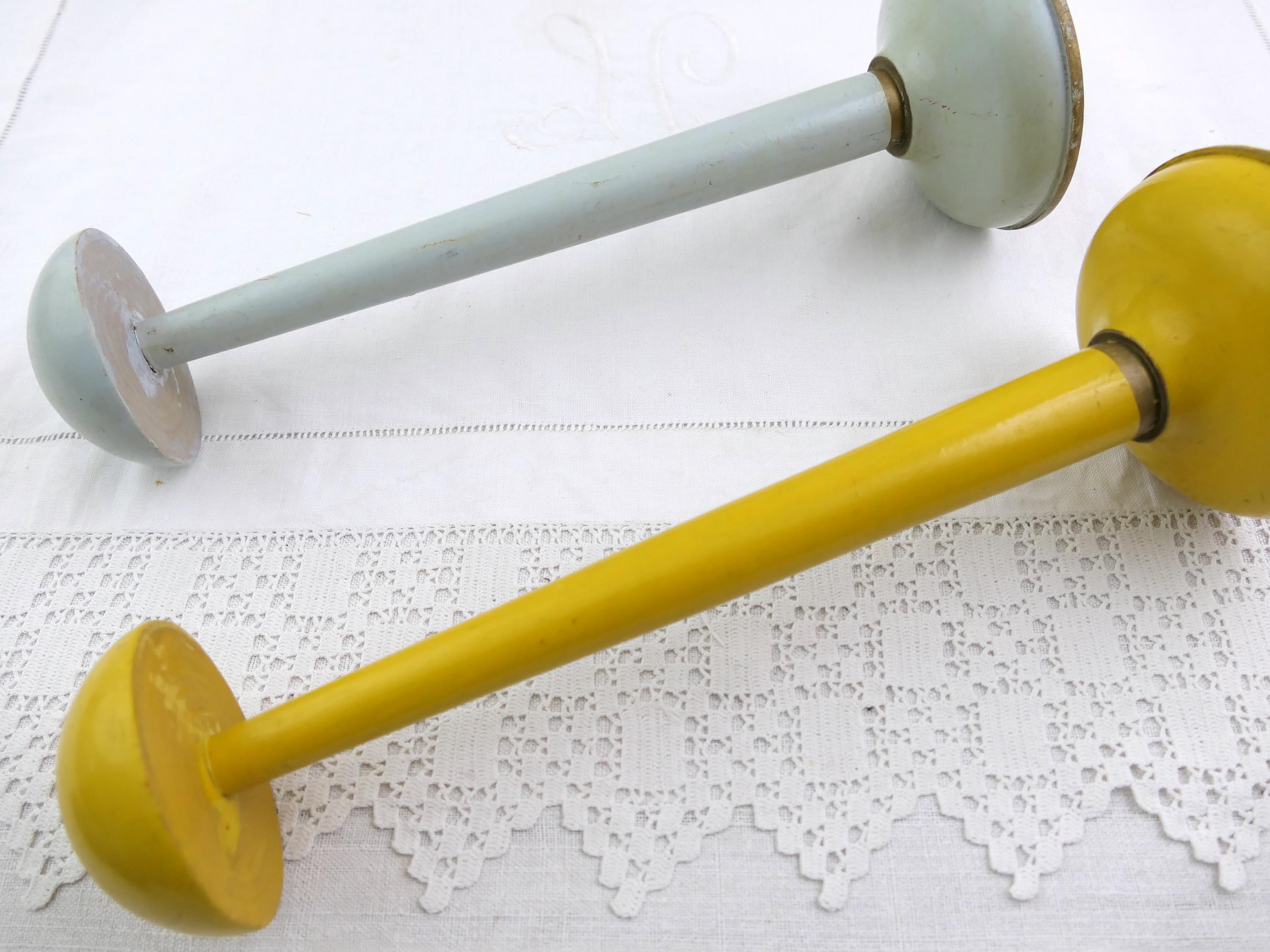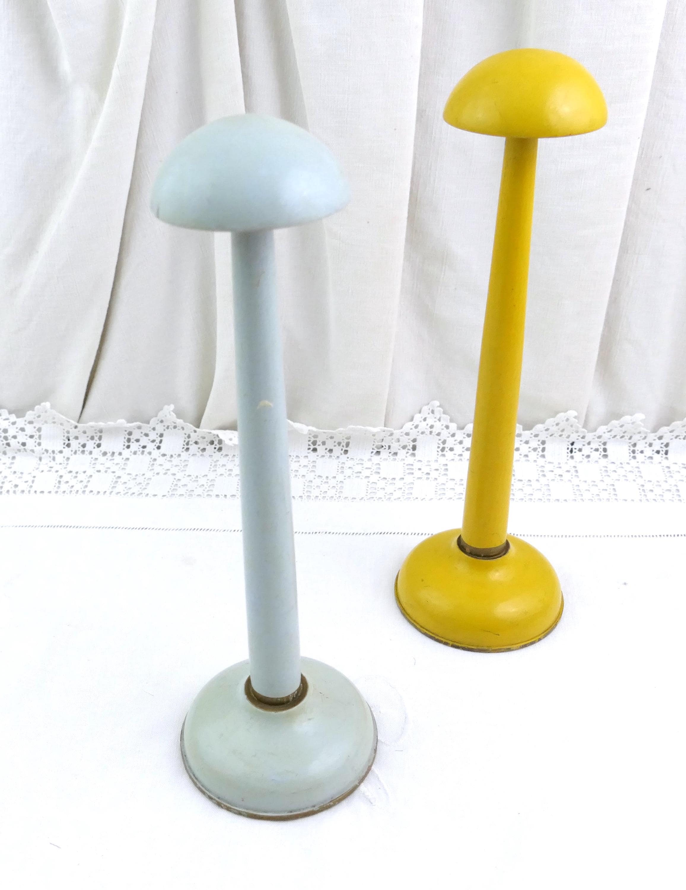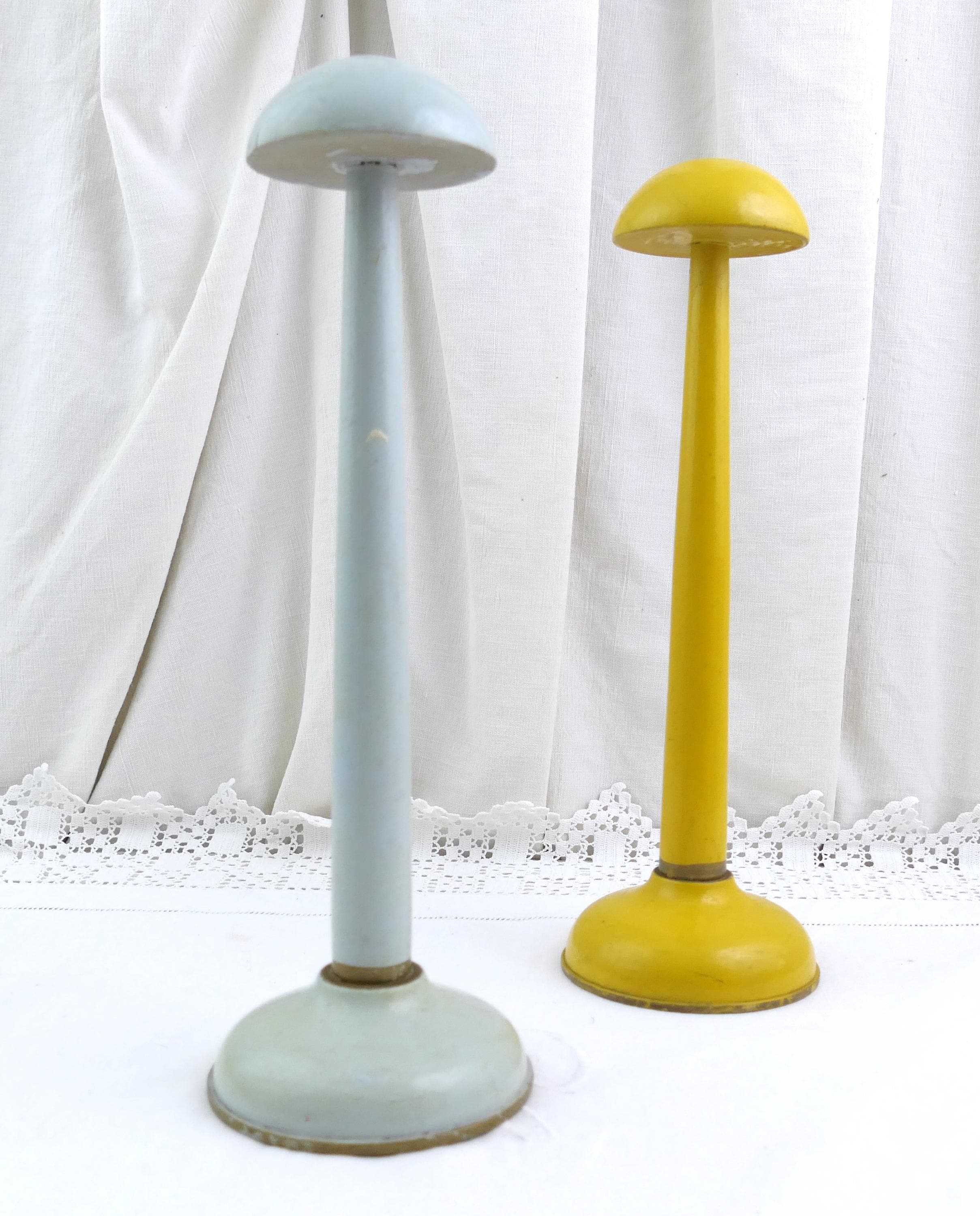 Vintage pair of pale blue and yellow hat stands. Made of lacquered turned wood. Ca early to mid 1900s.