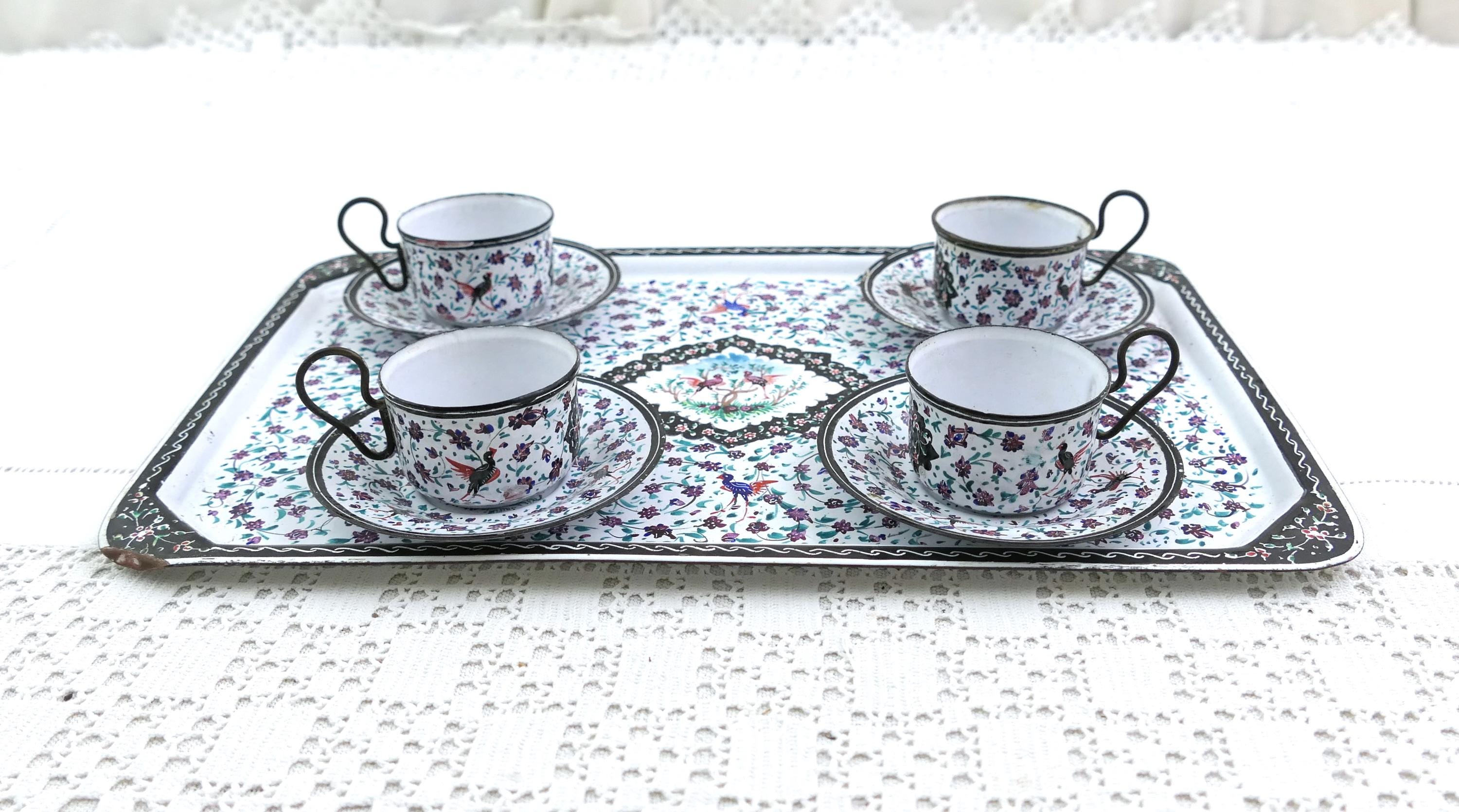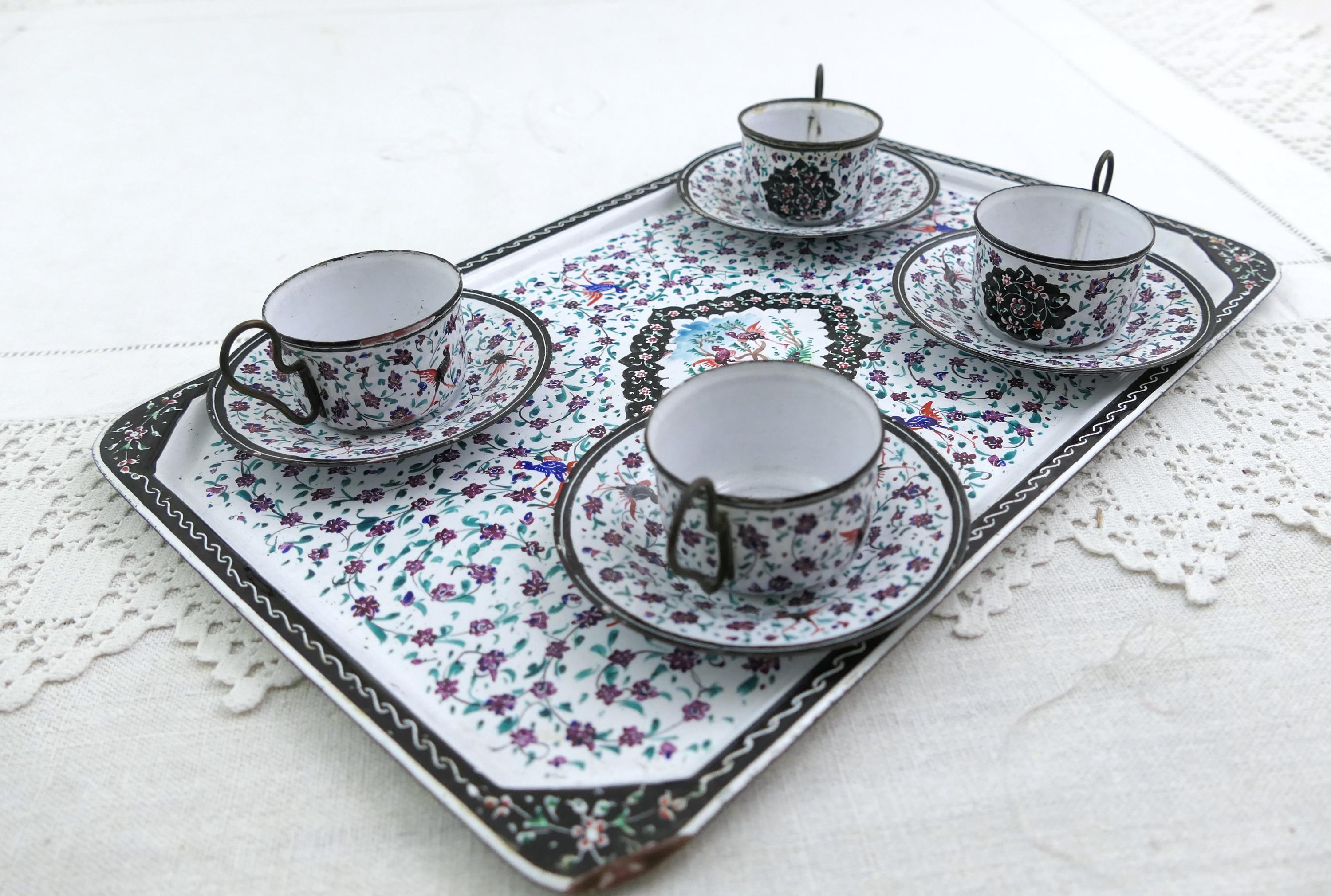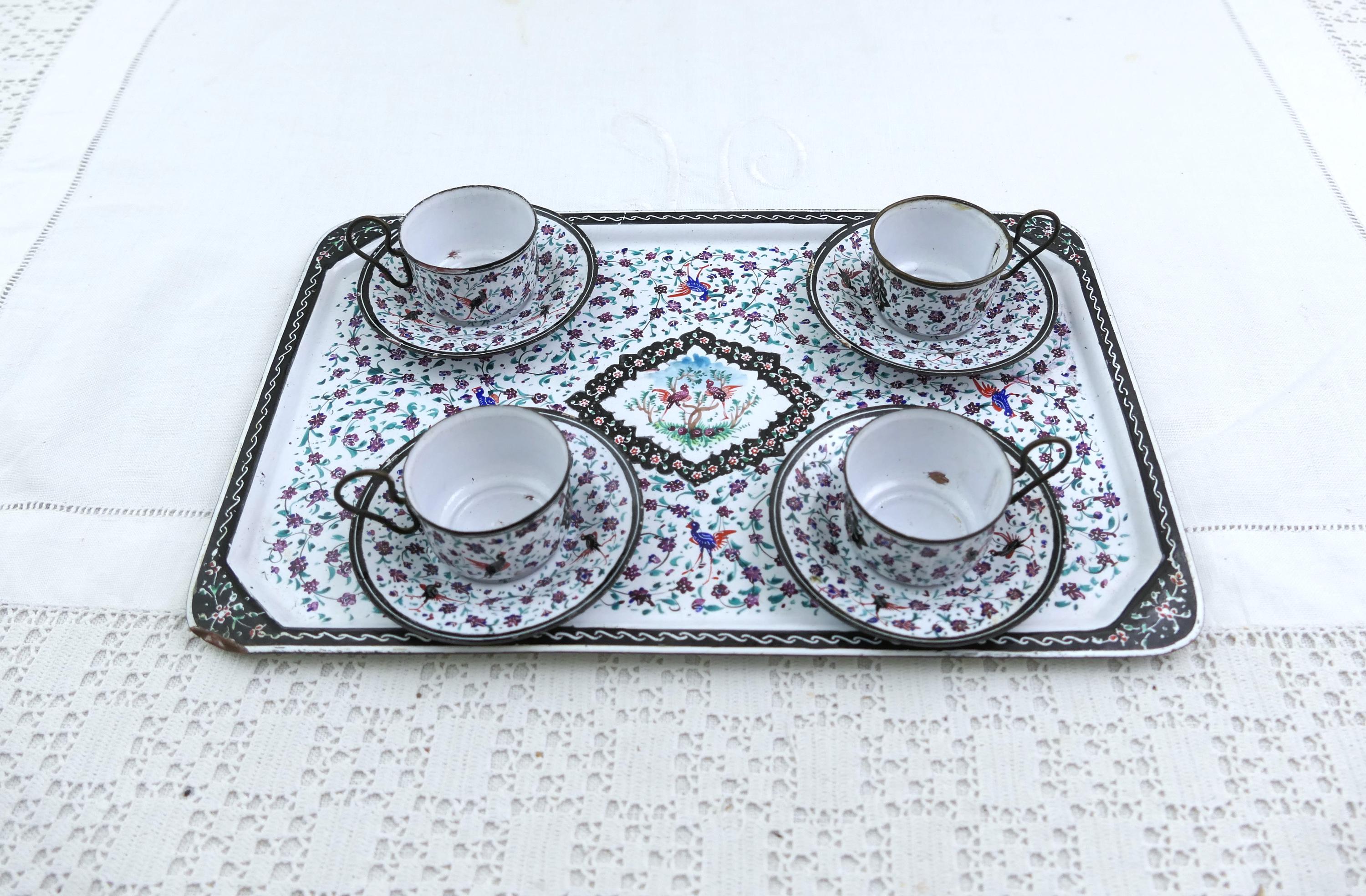 Antique Persian enameled handpainted tea set with cups and saucers with matching tray. Made of handpainted enameled copper. Ca 1900s.