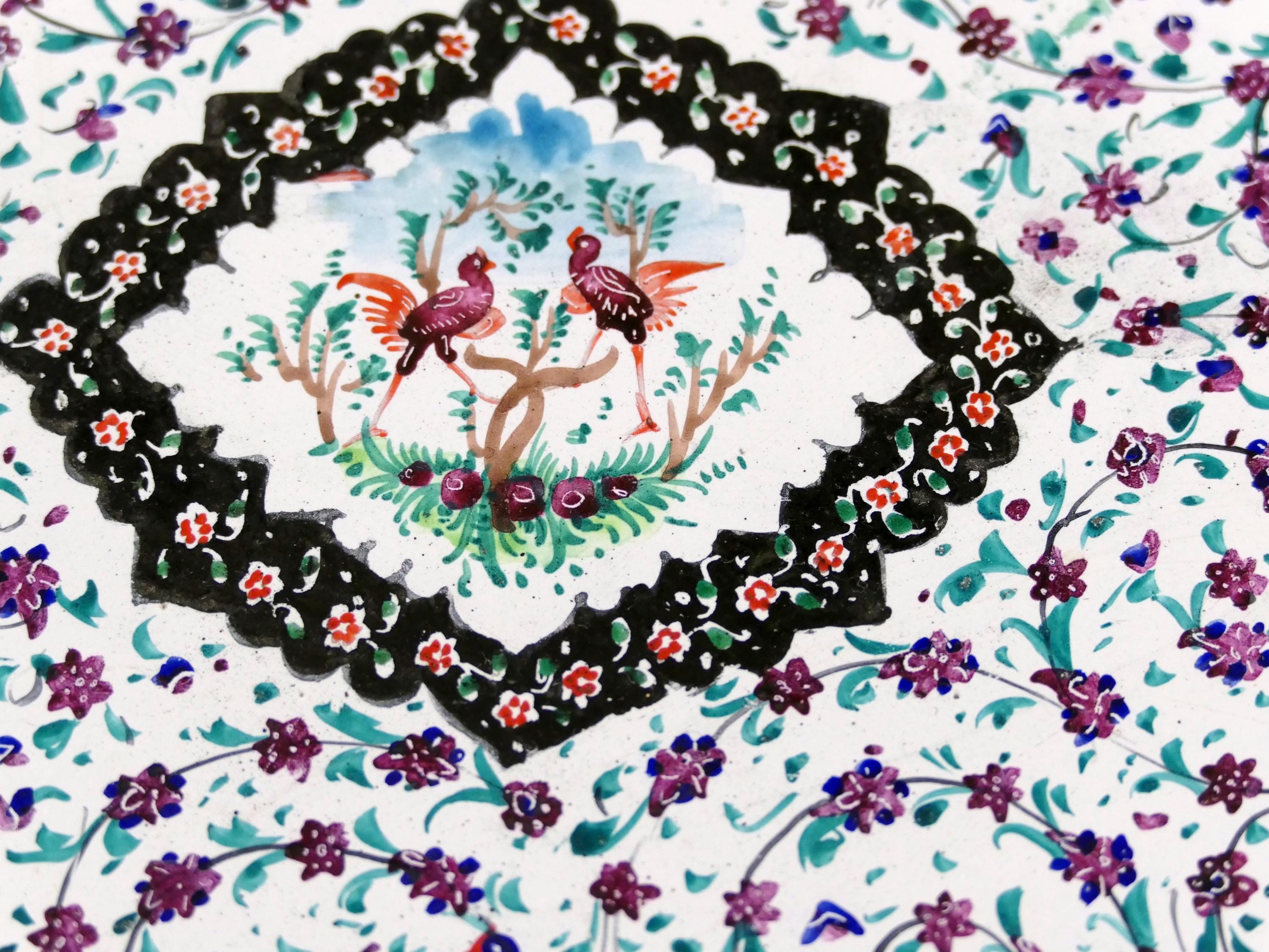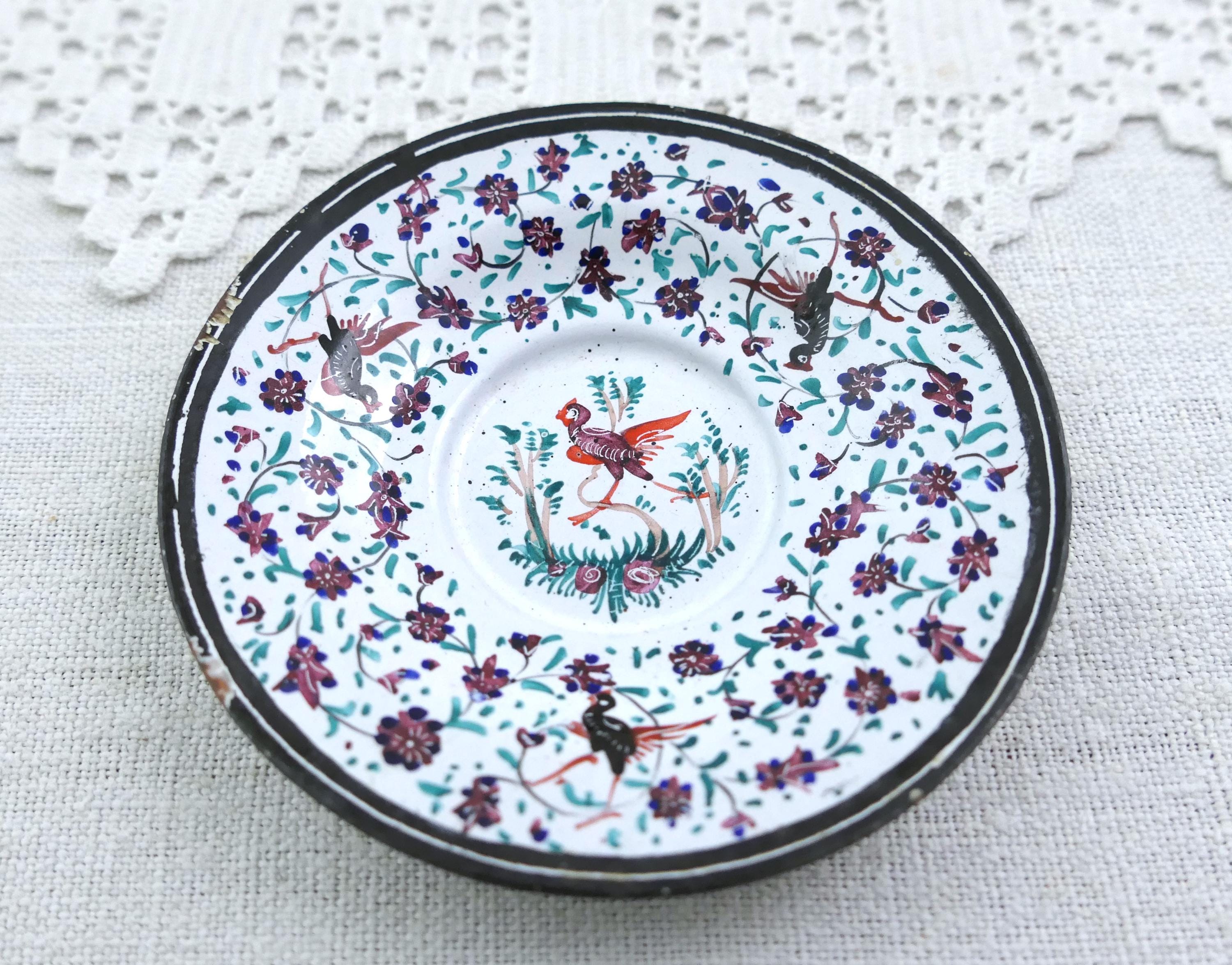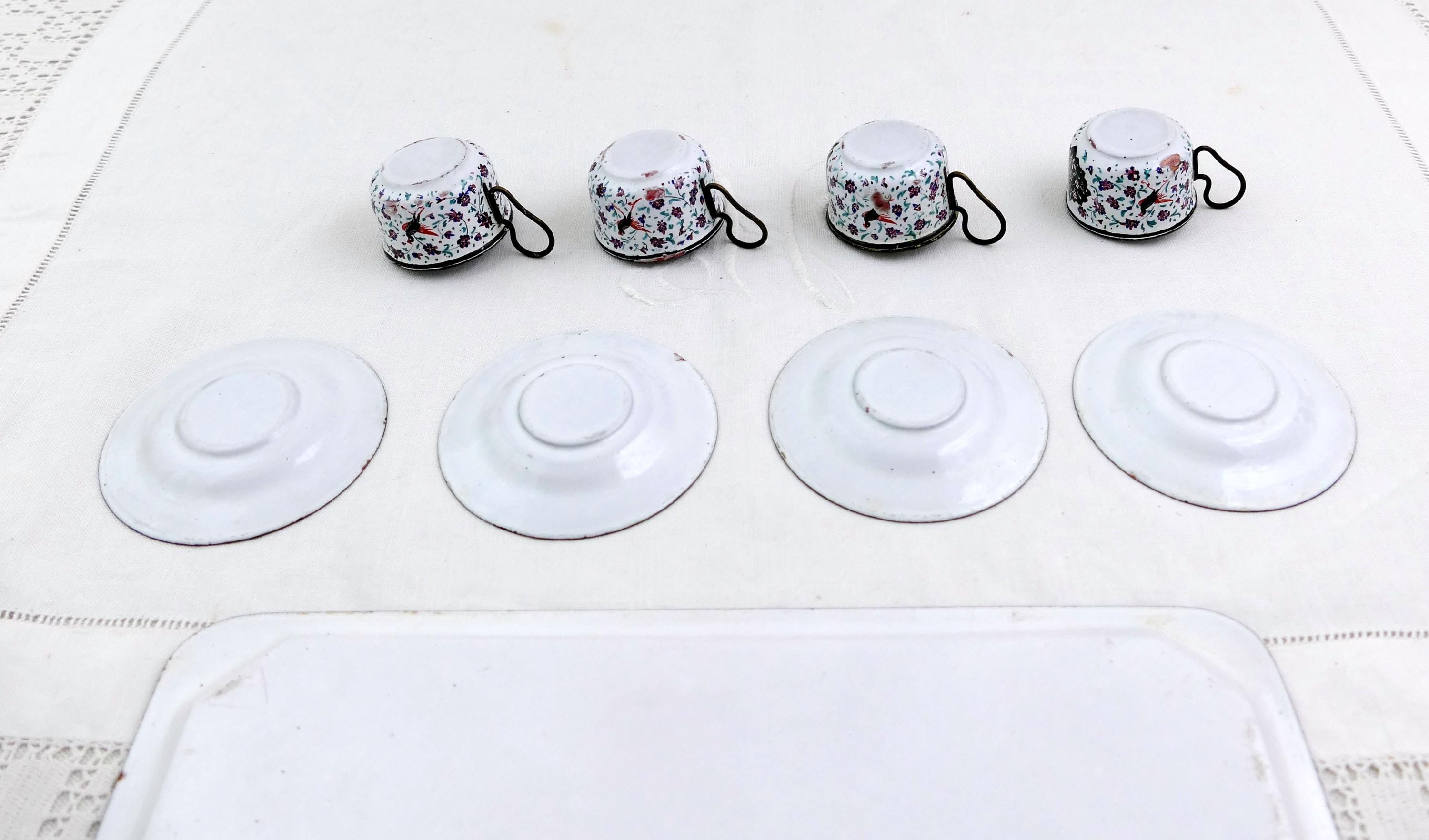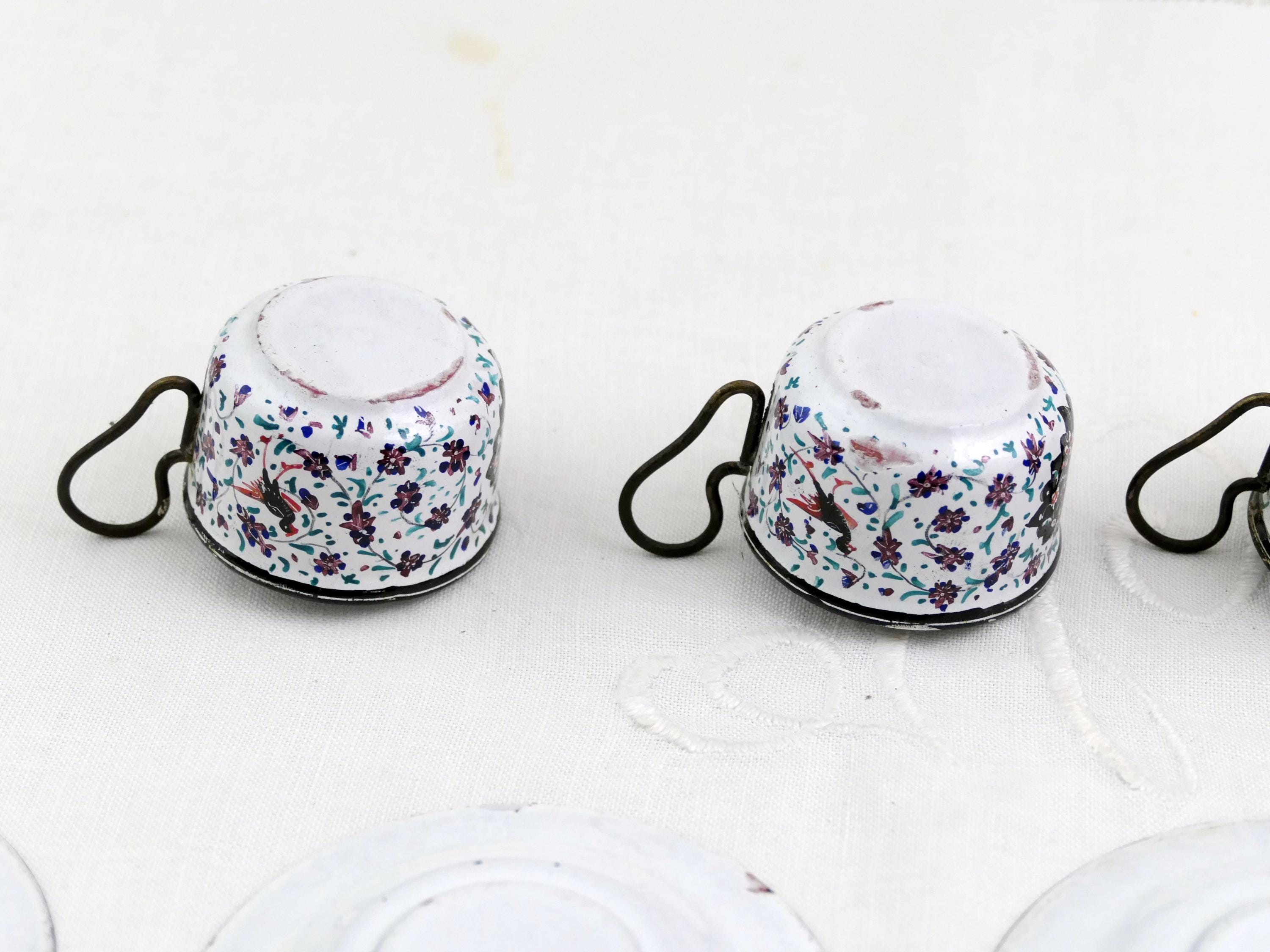 Antique Persian enameled handpainted tea set with cups and saucers with matching tray. Made of handpainted enameled copper. Ca 1900s.