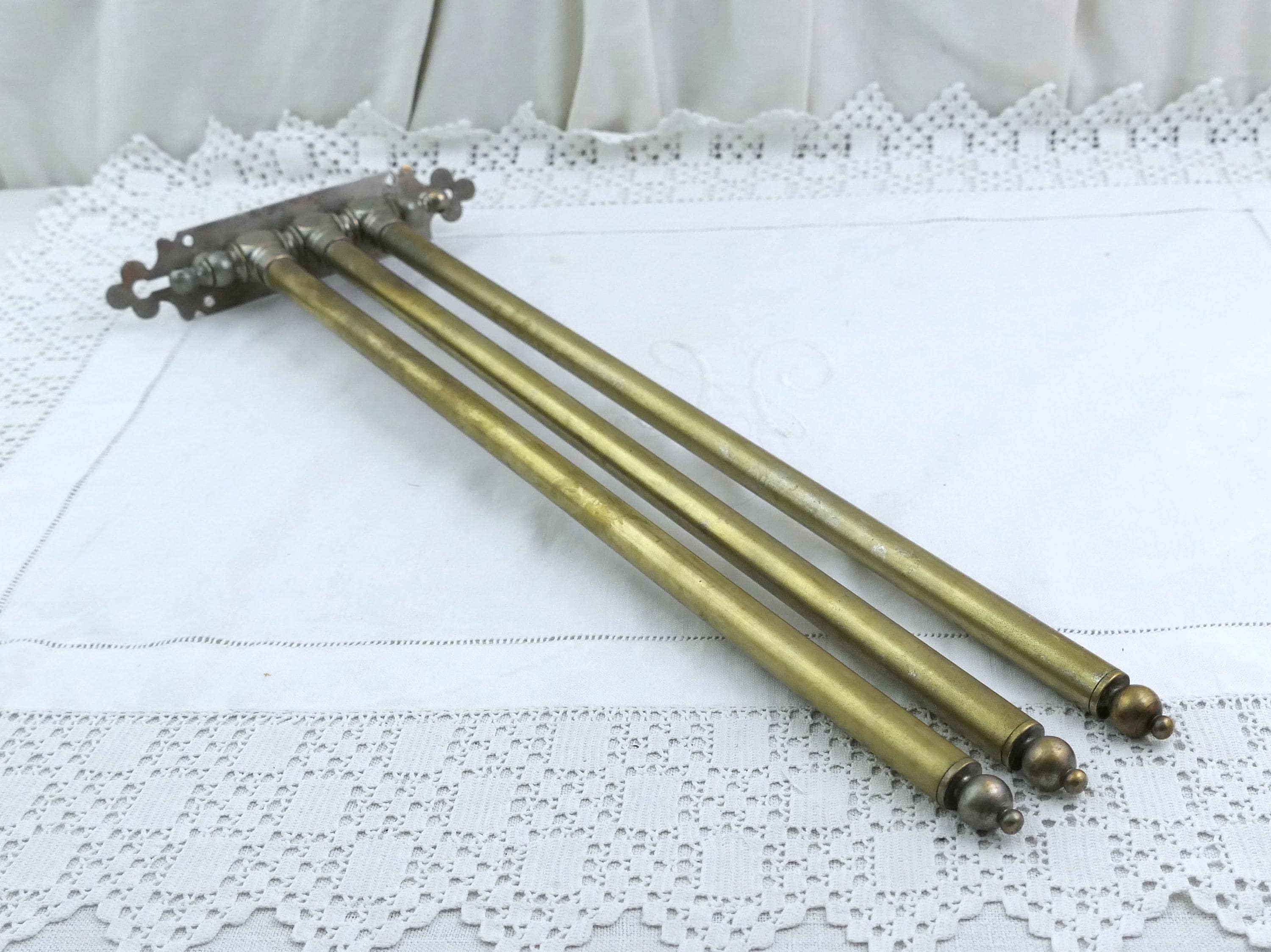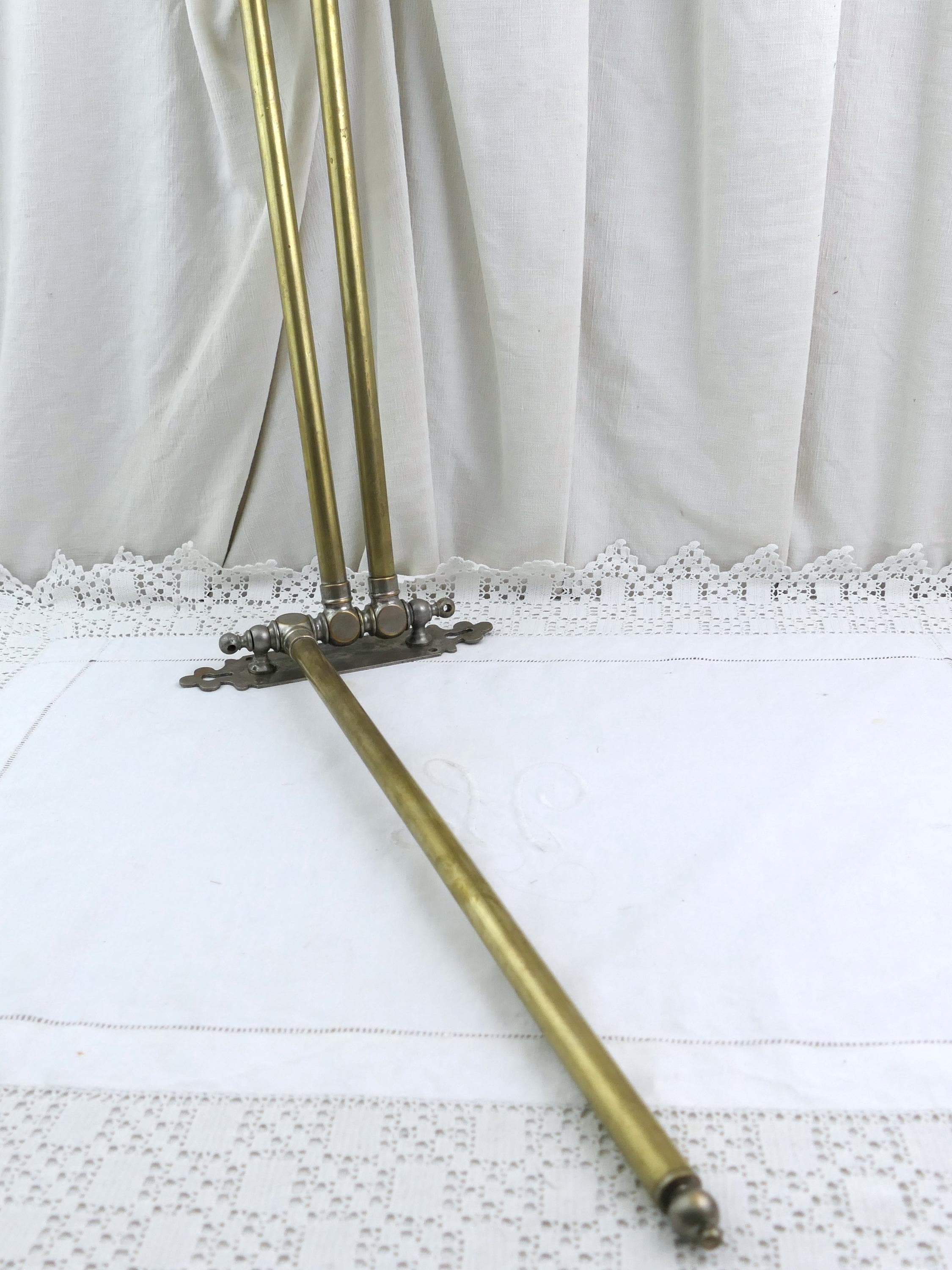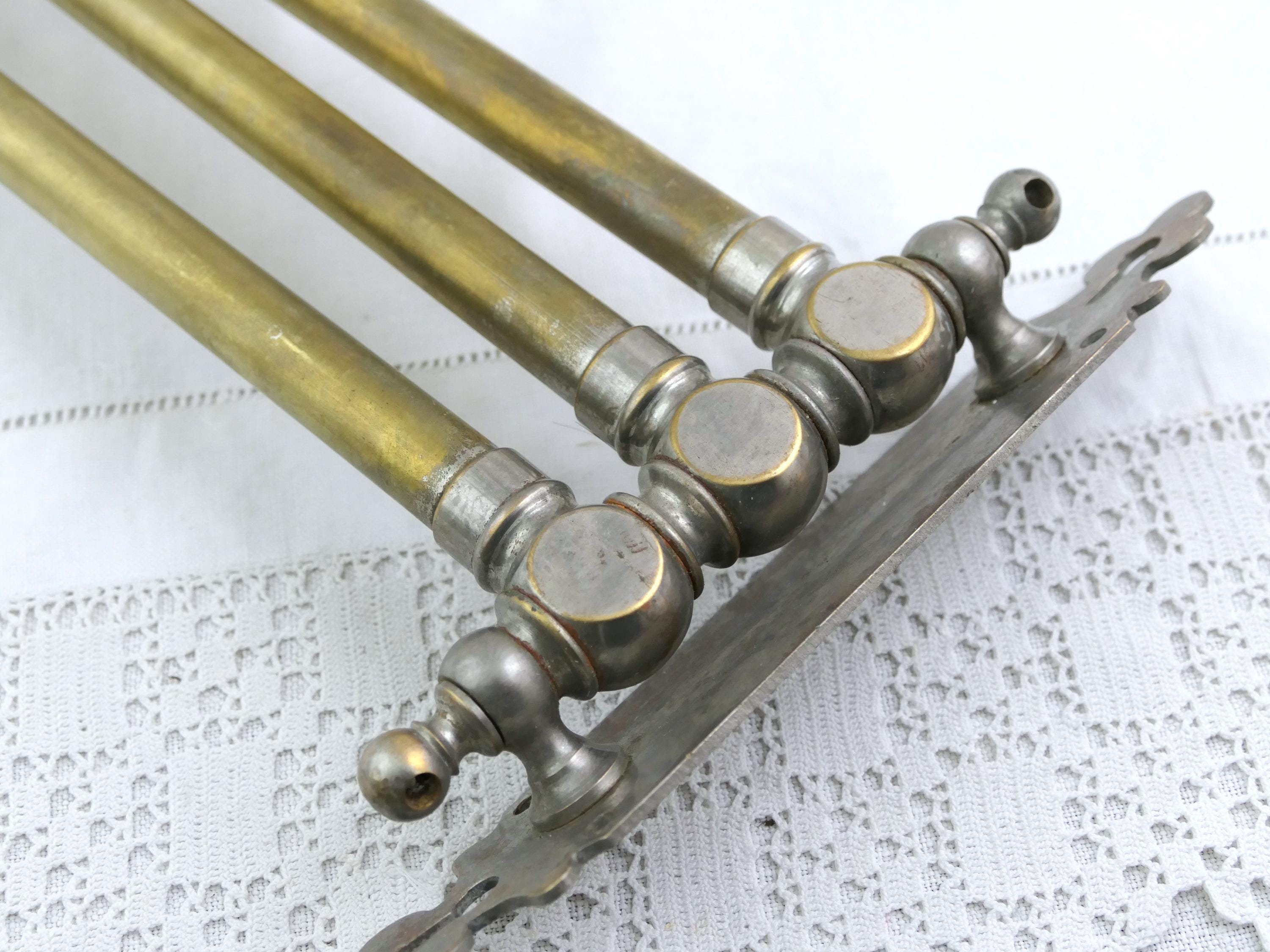 Large antique French swivel towel rack with 3 rods. Made of brass with worn silver plate. Ca late 1800s - mid 1900s.