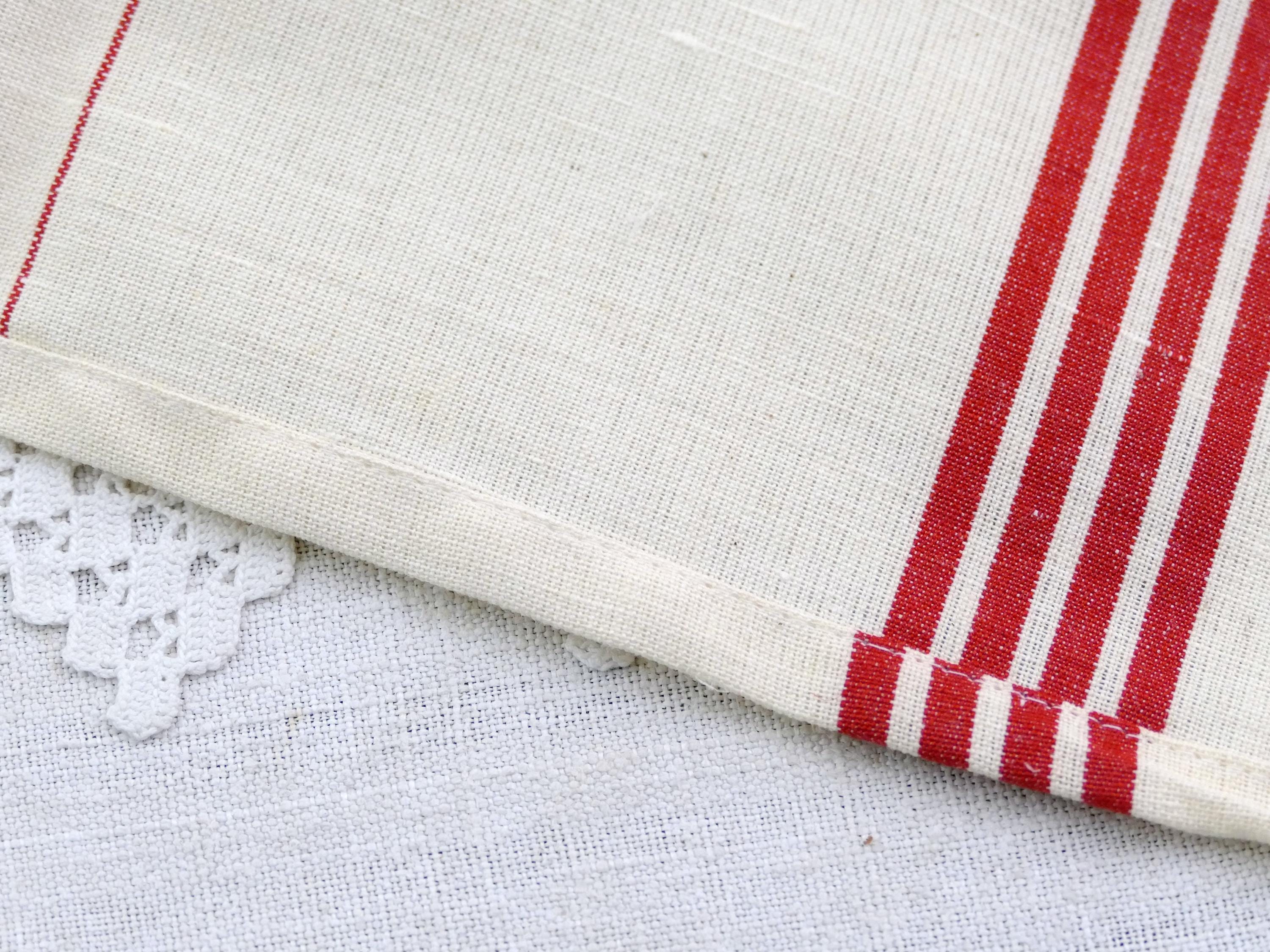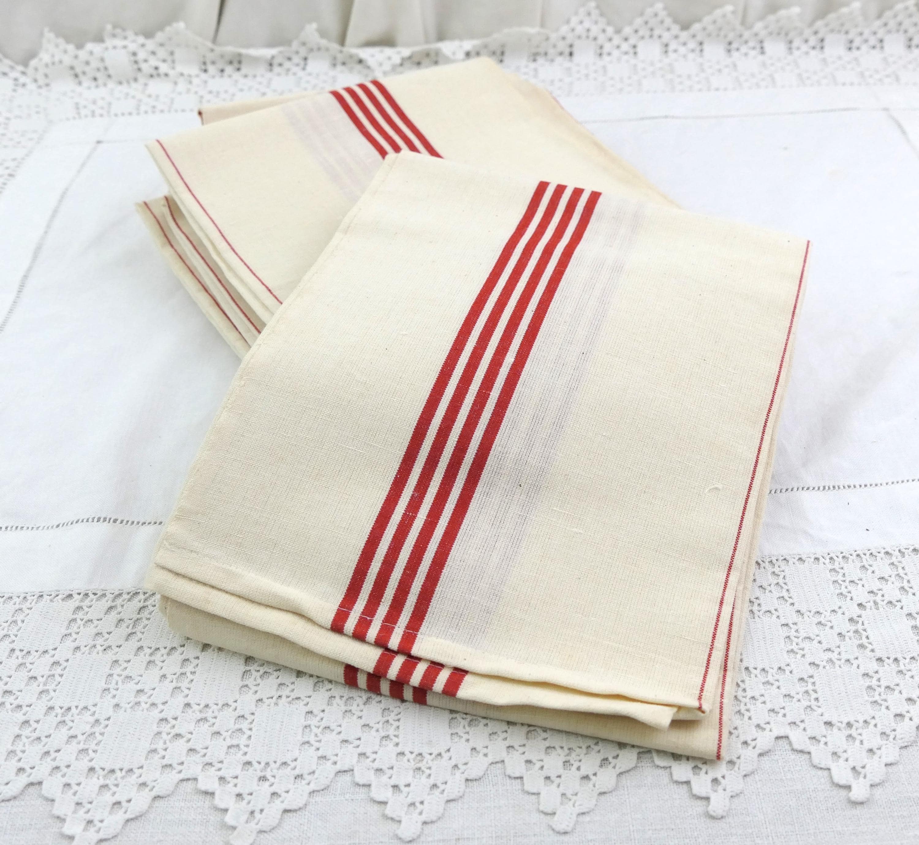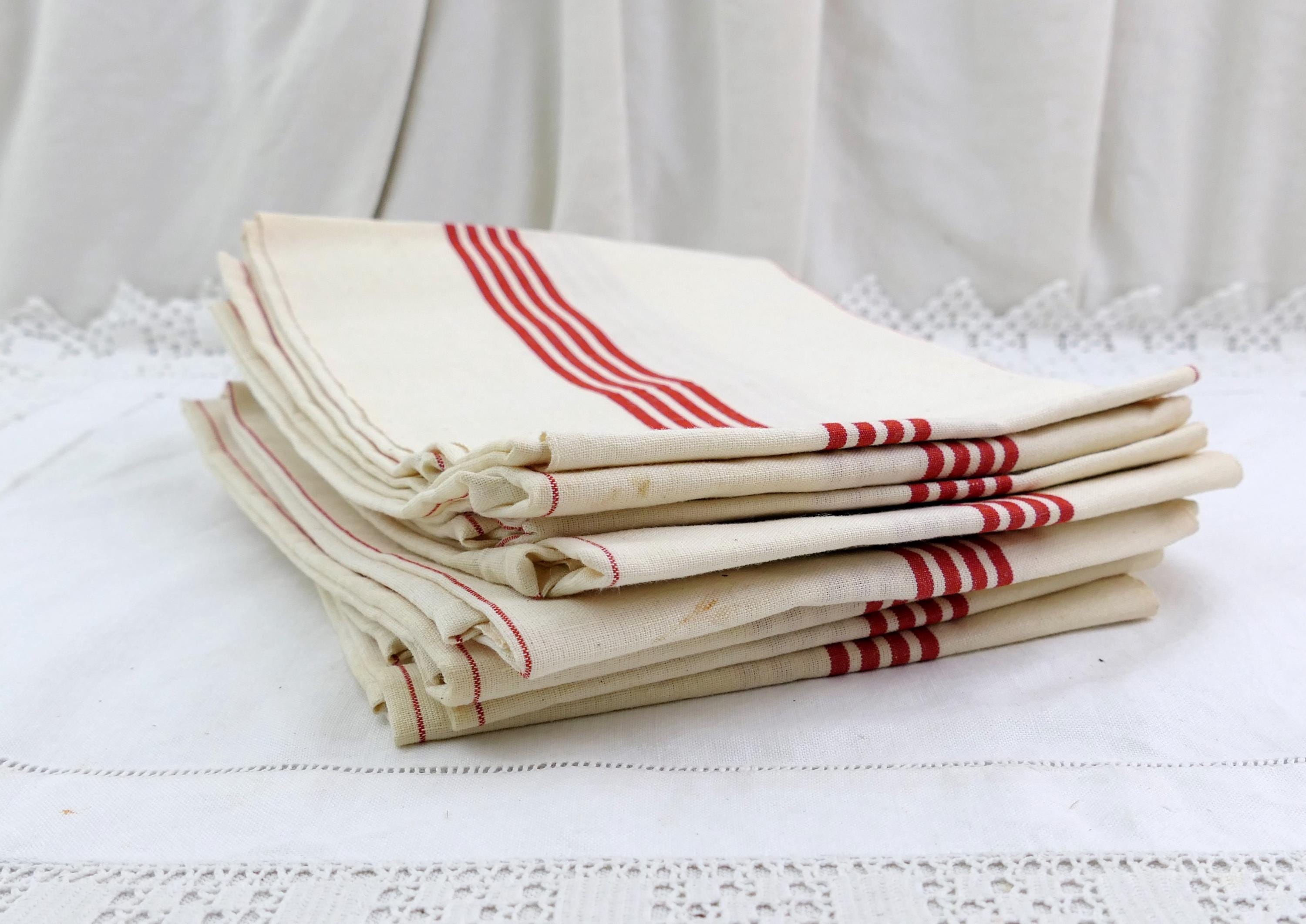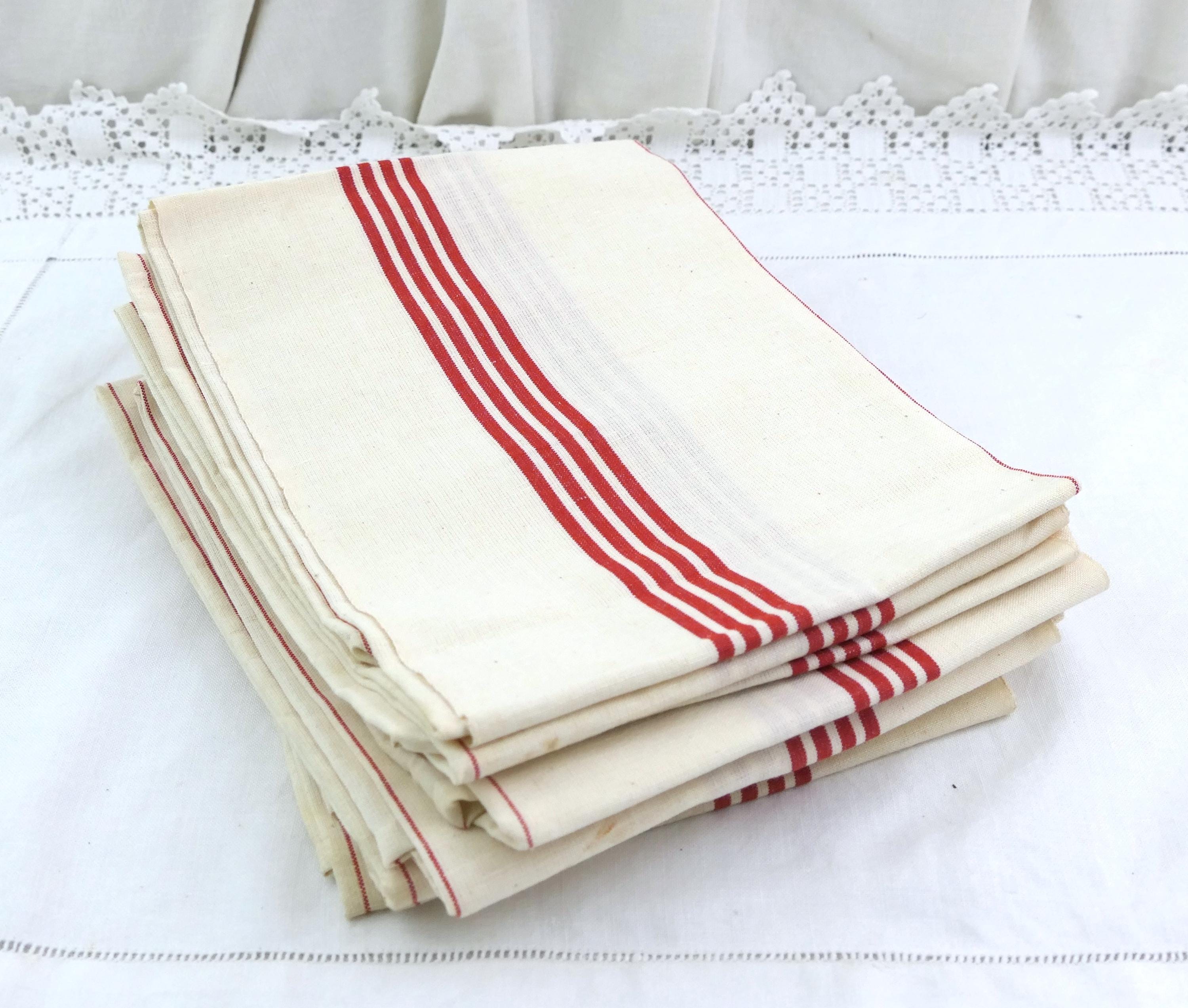 8 unused matching vintage French ecru tea towels with red lines. Made of cotton. Ca mid 1900s.