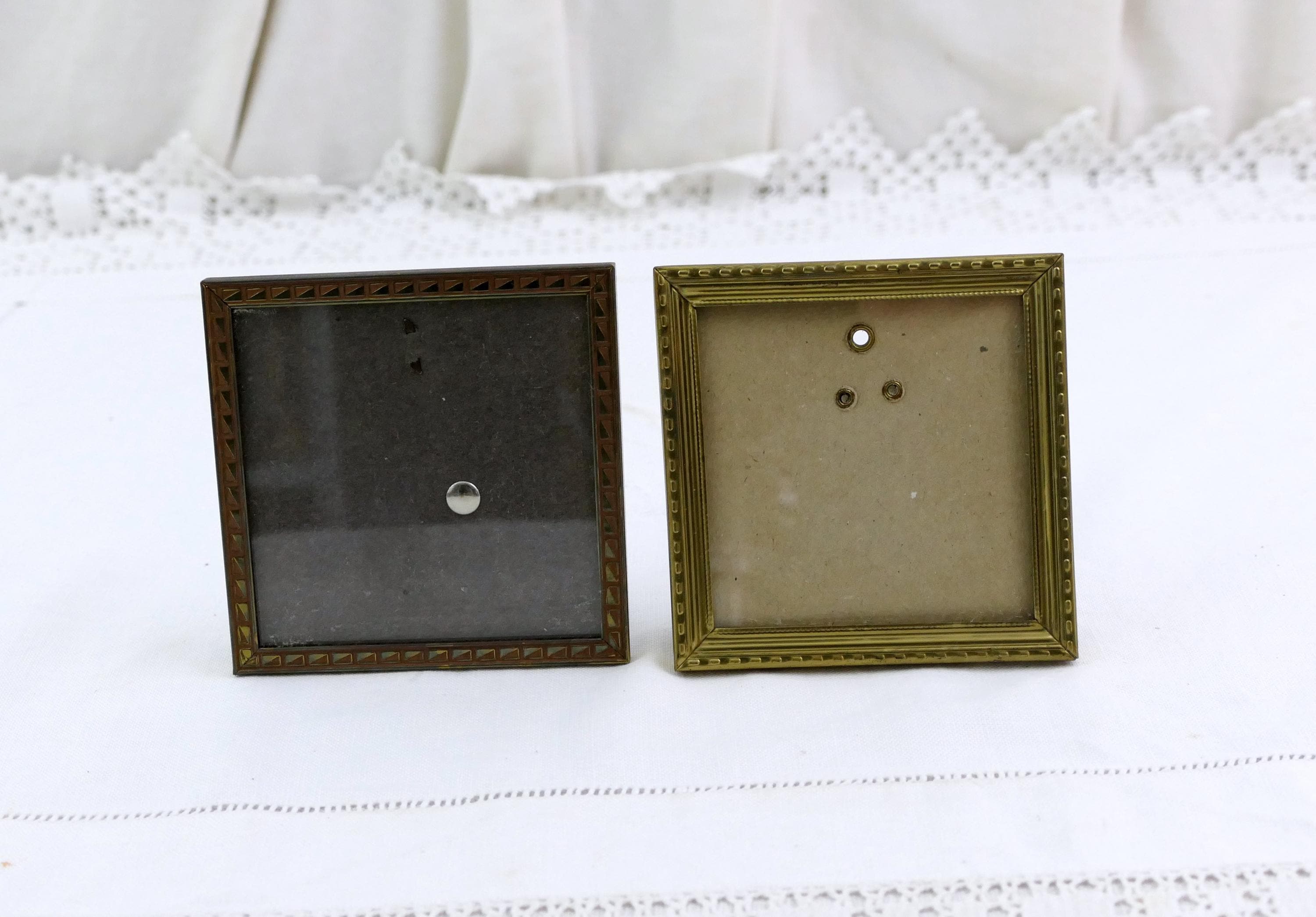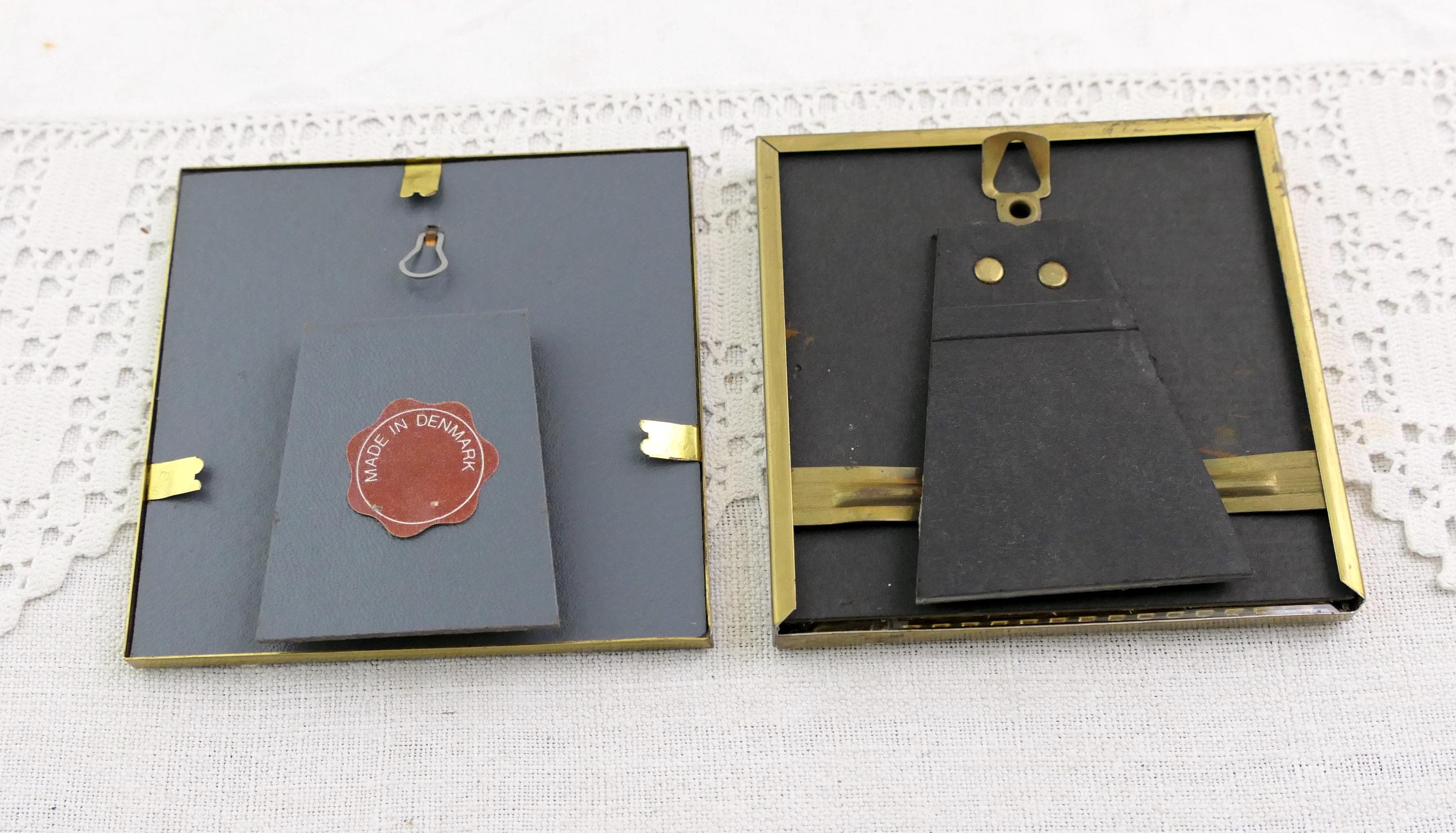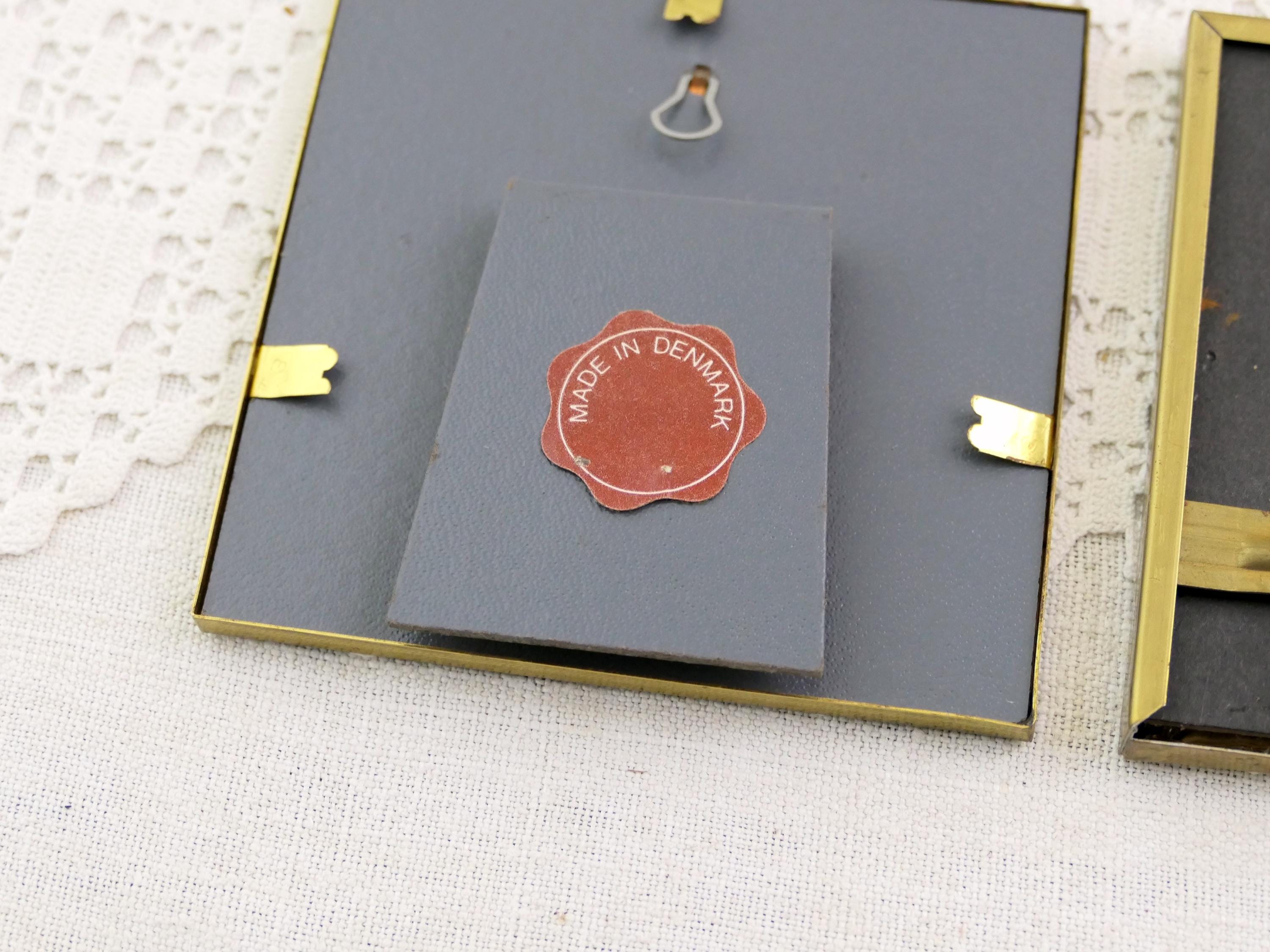 2 small vintage square portrait frames. Made in Denmark of brass metal with glass. Easel stand or hanging loop. Circa 1950s / 1960s.