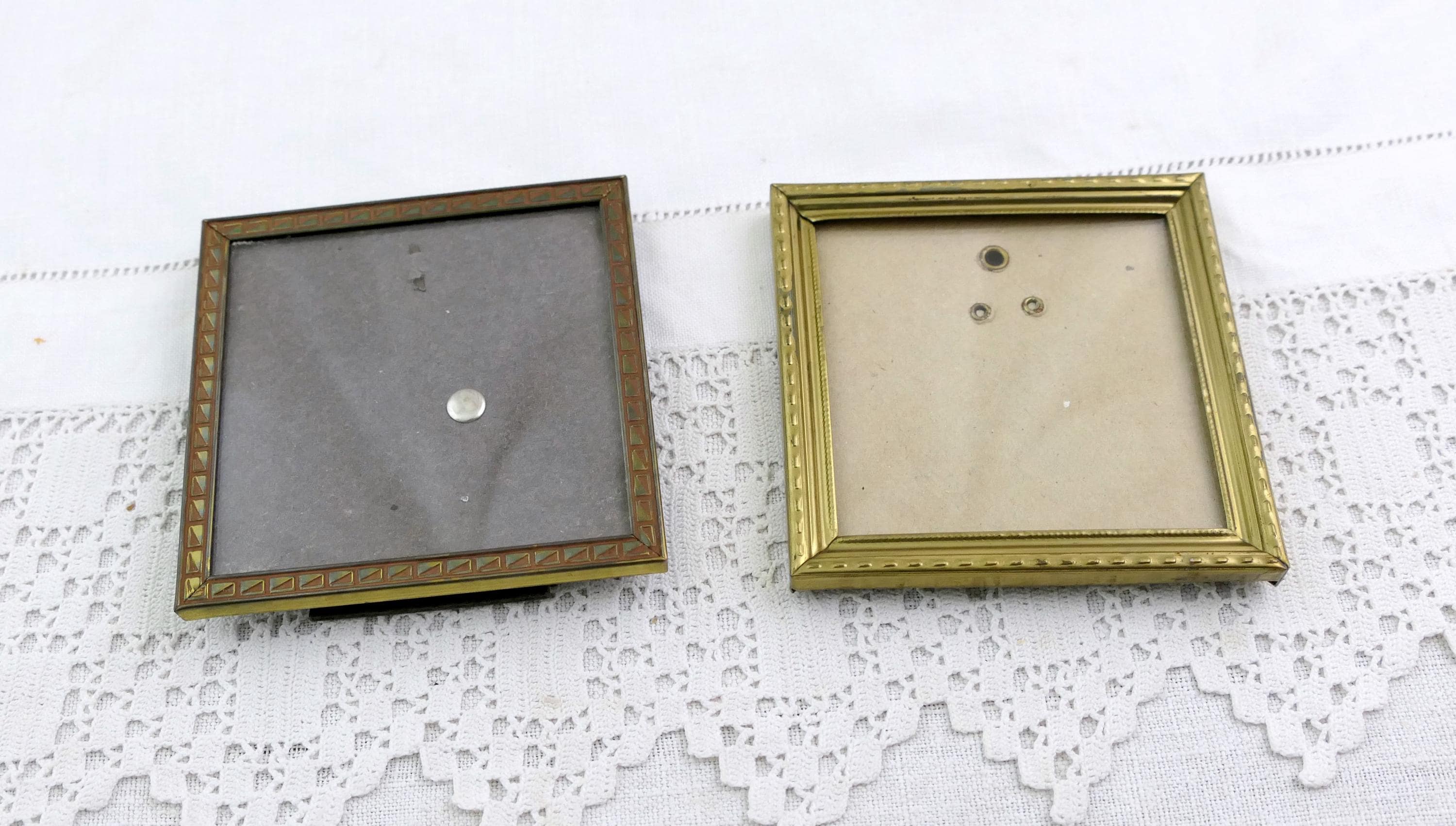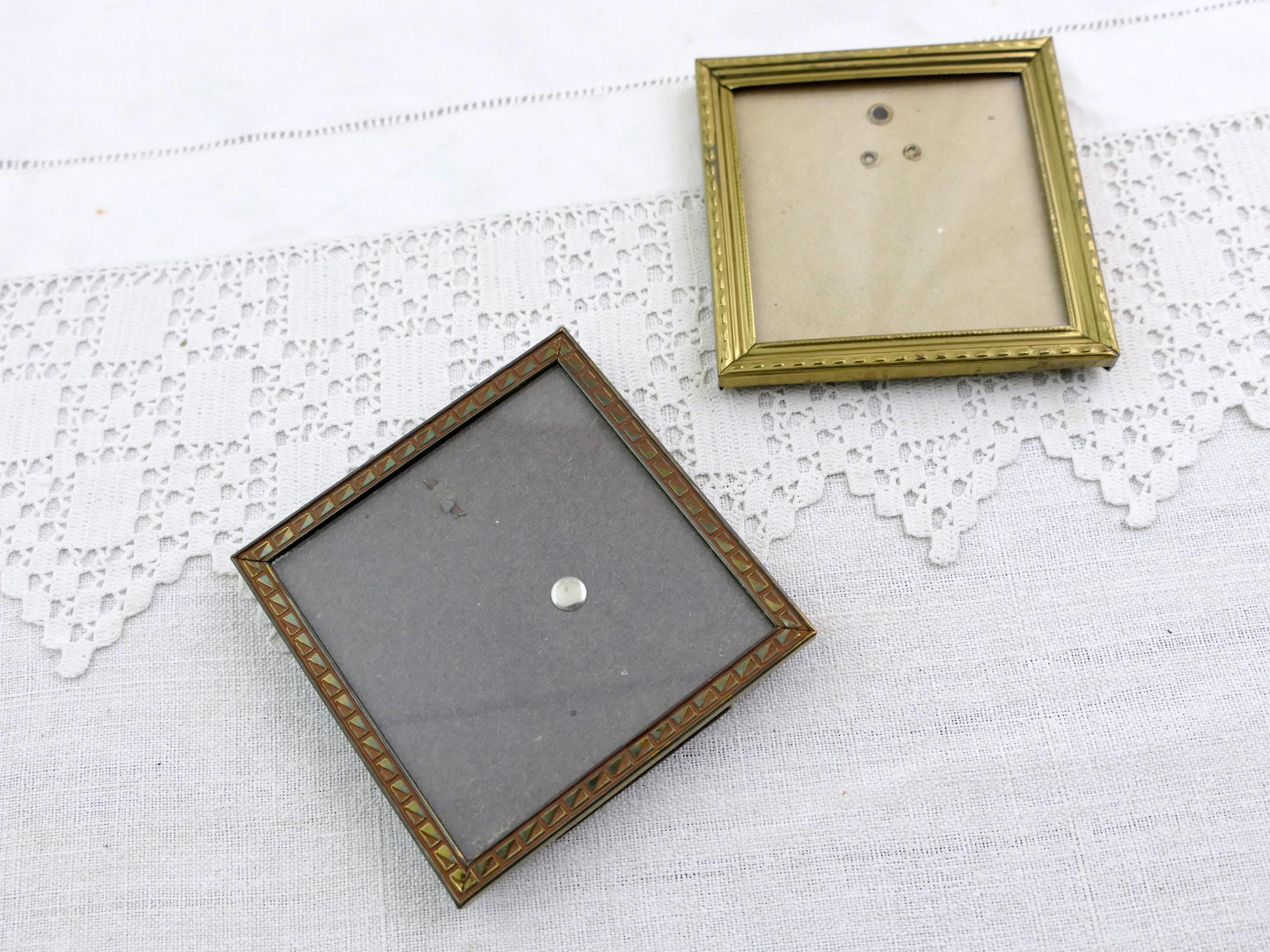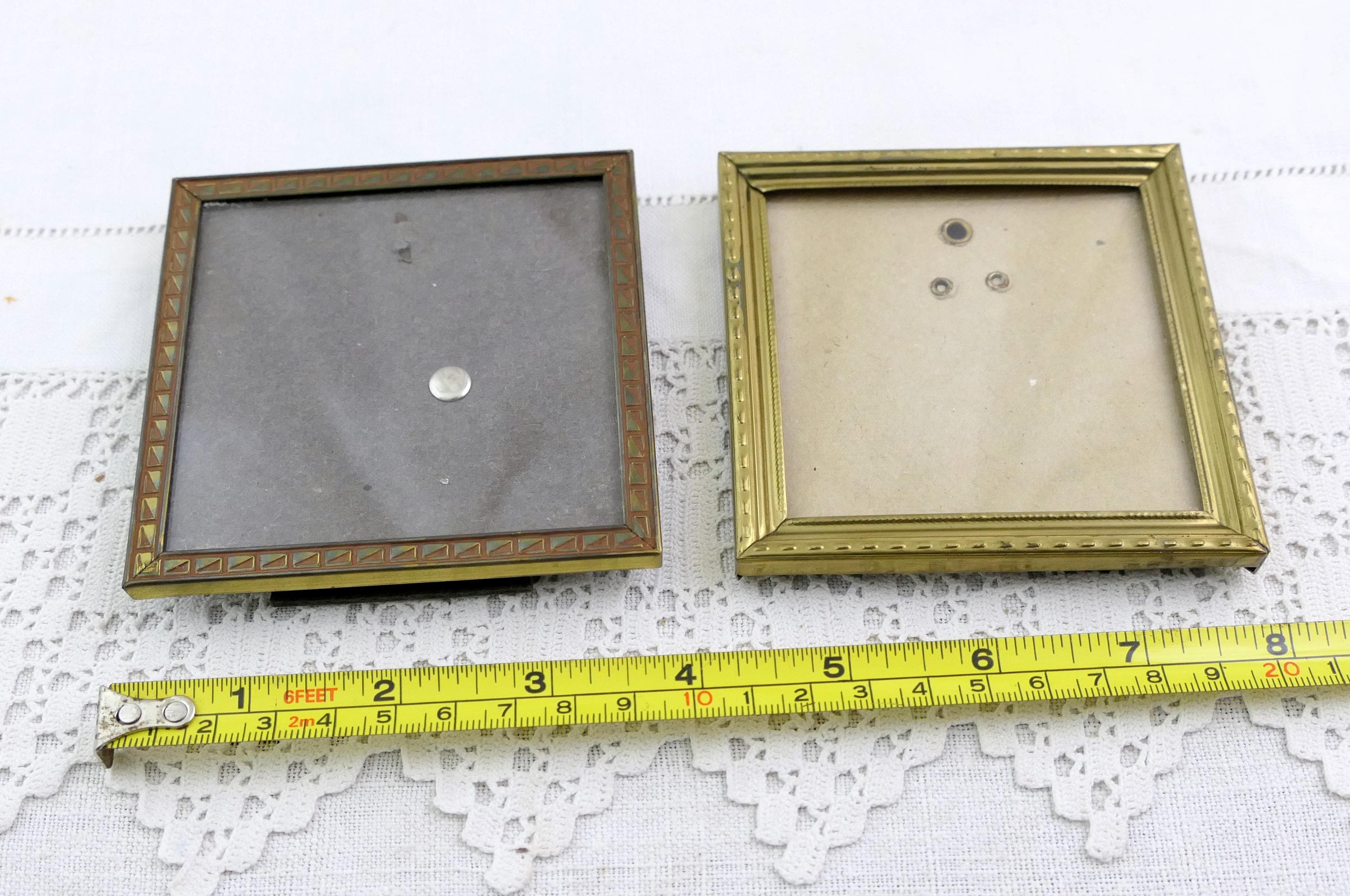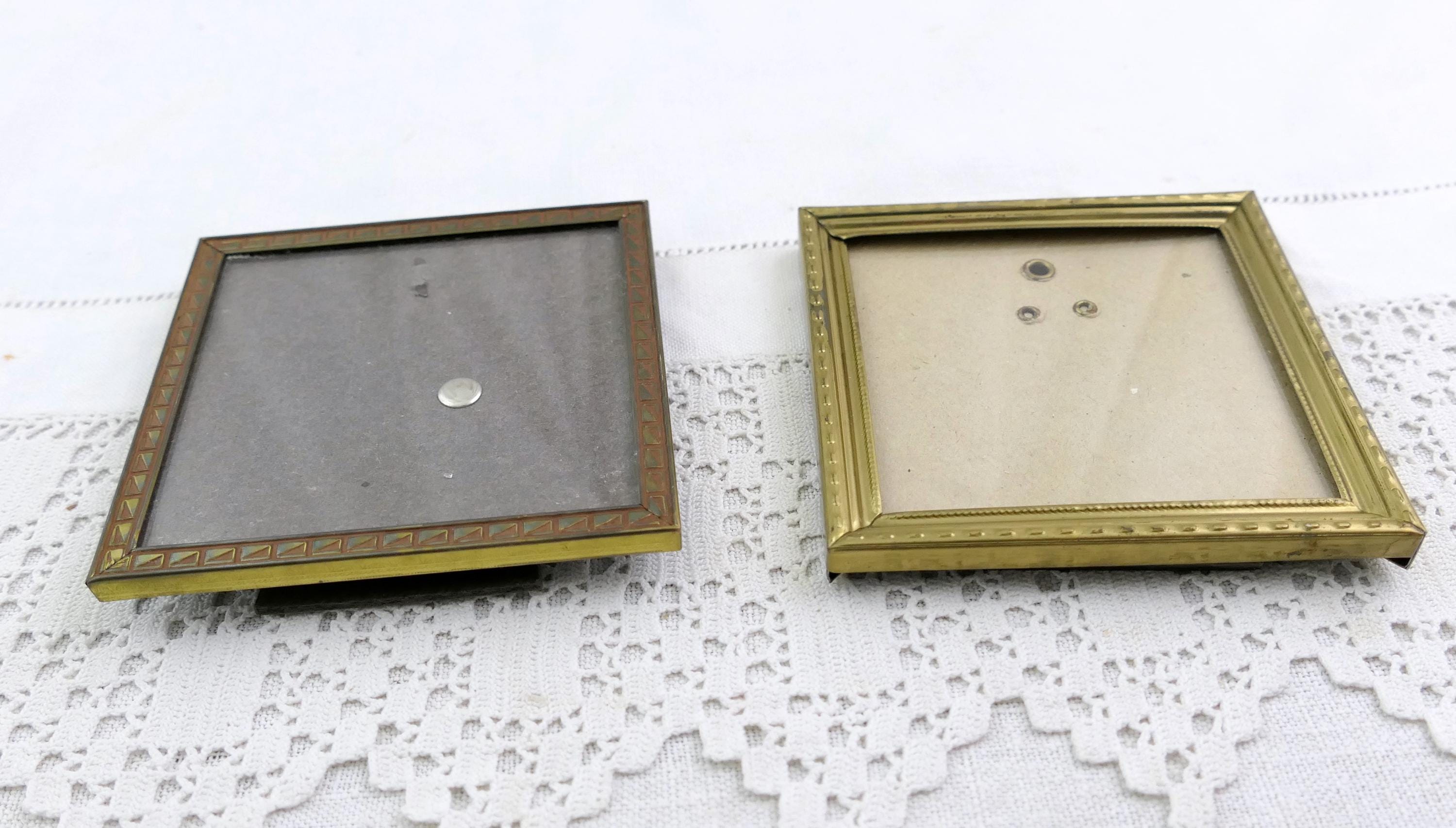2 small vintage square portrait frames. Made in Denmark of brass metal with glass. Easel stand or hanging loop. Circa 1950s / 1960s.