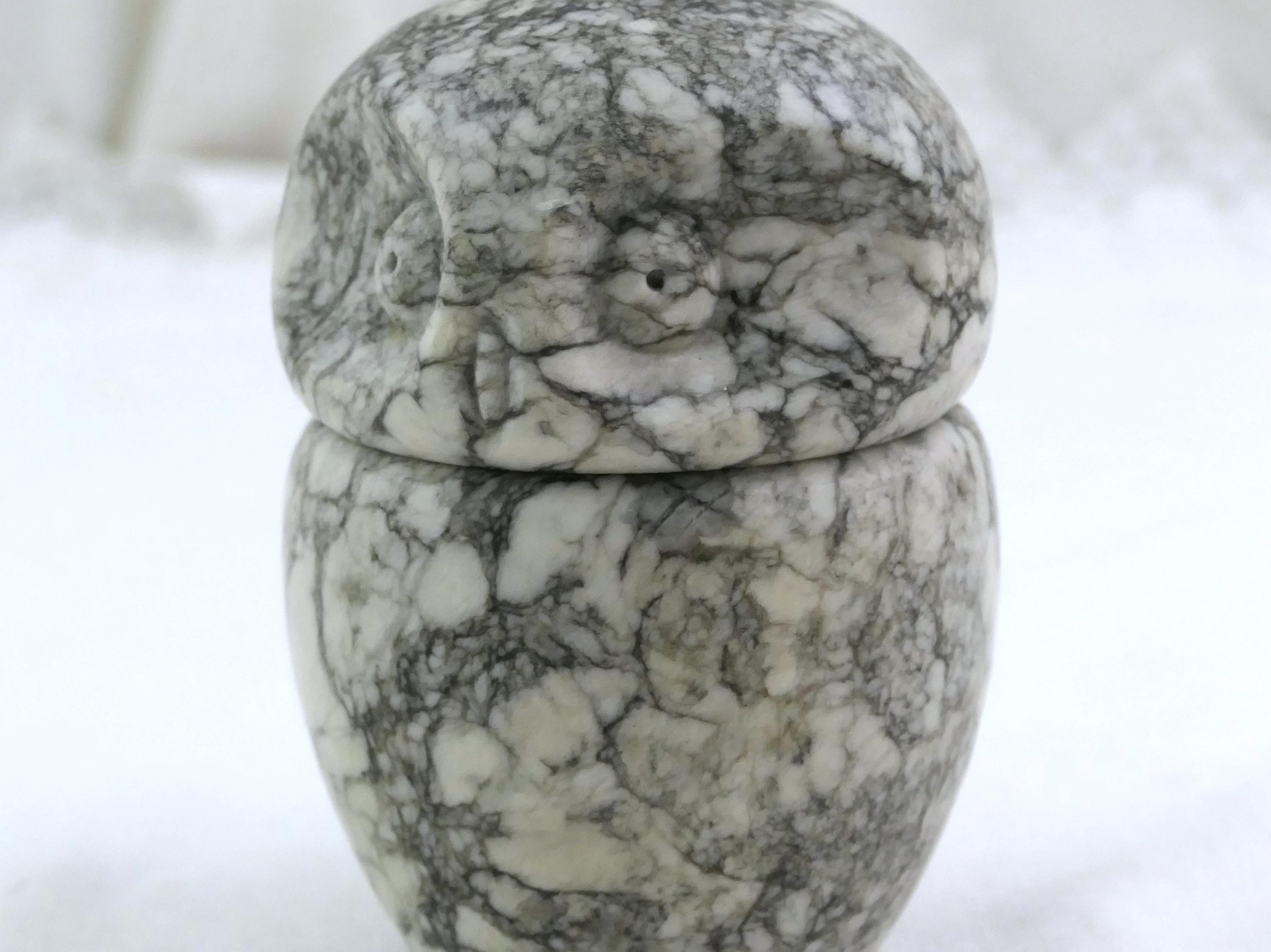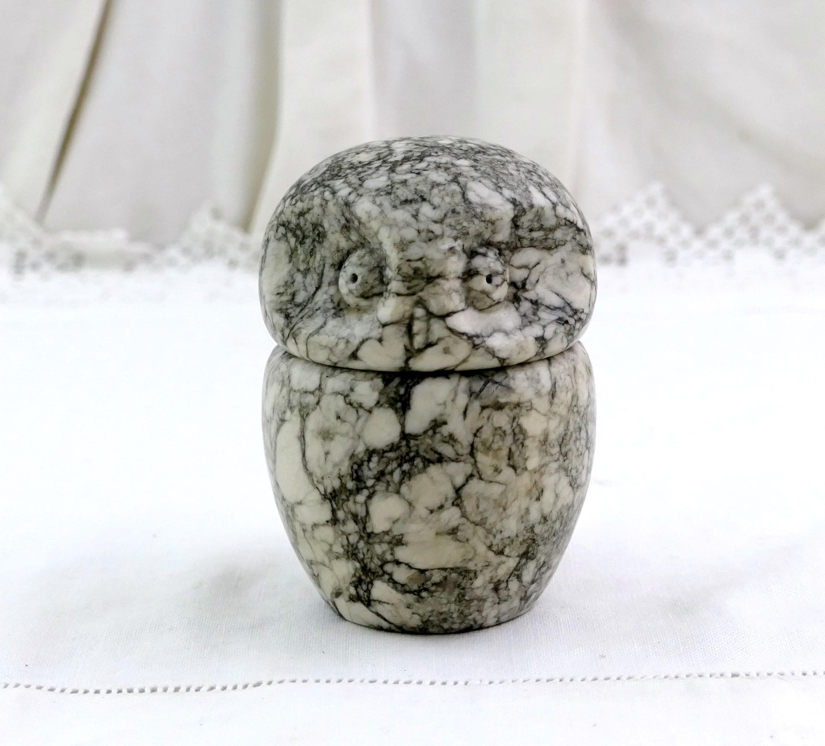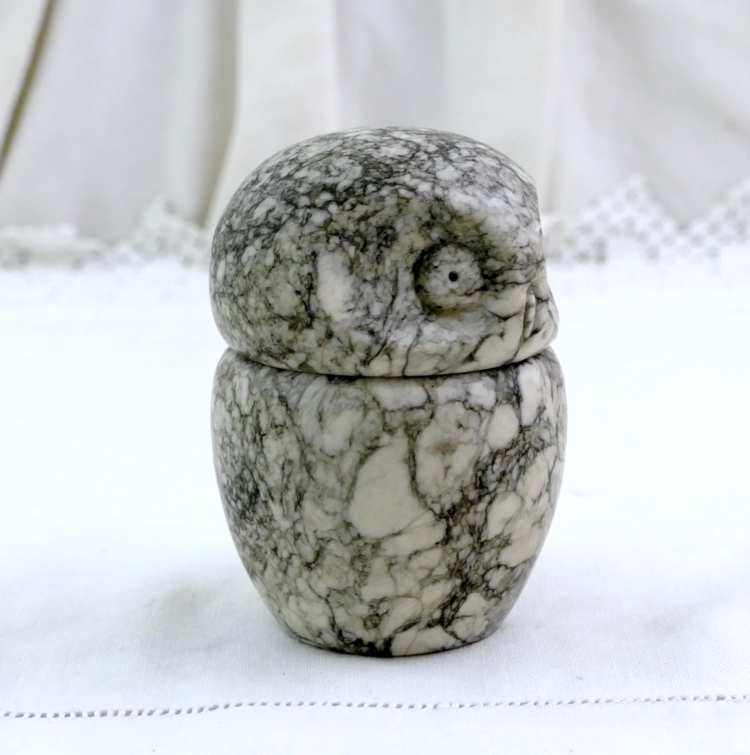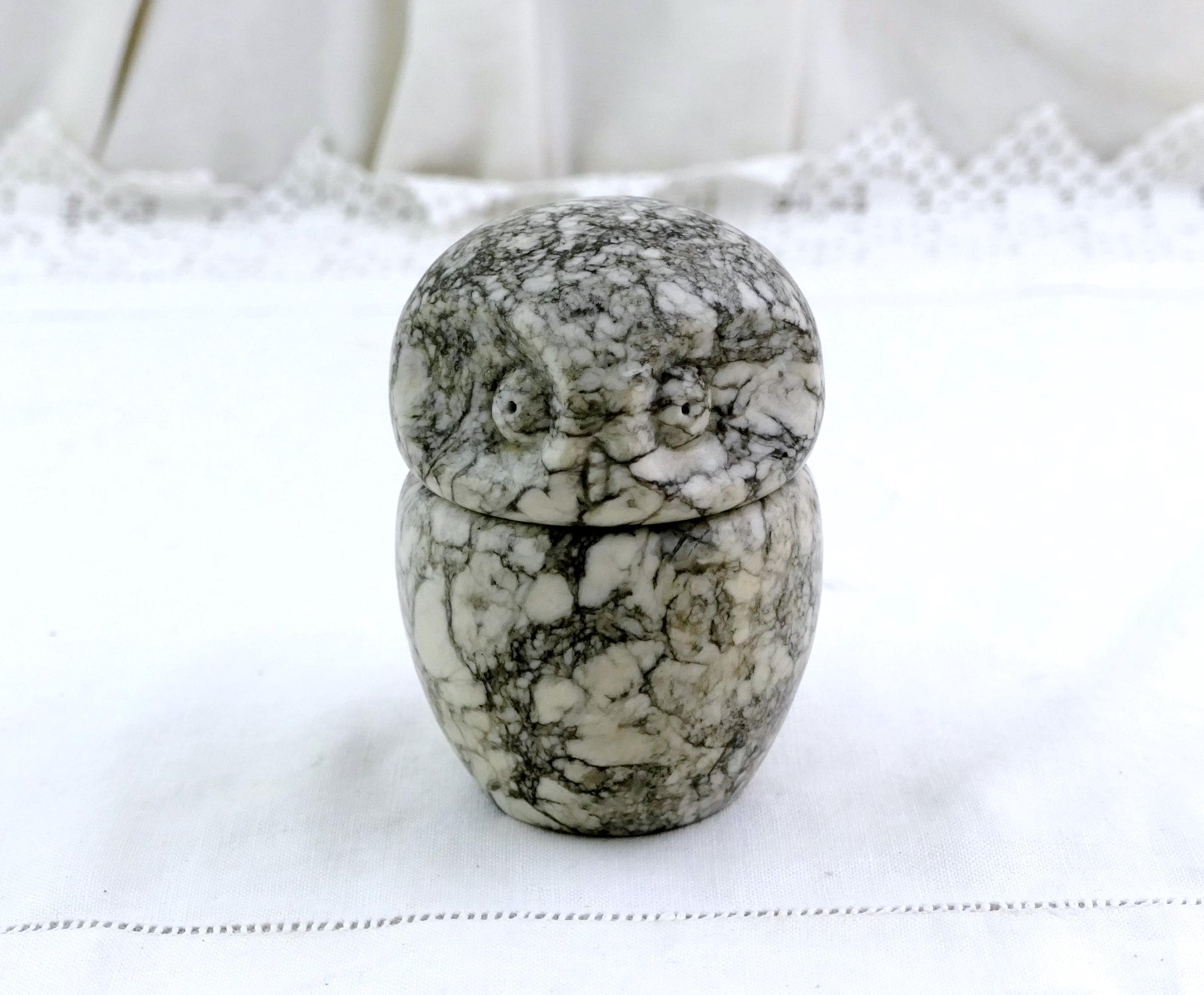 Retro vintage stone owl box. Made of carved, polished black and white alabaster stone. Ca mid 1900s.
