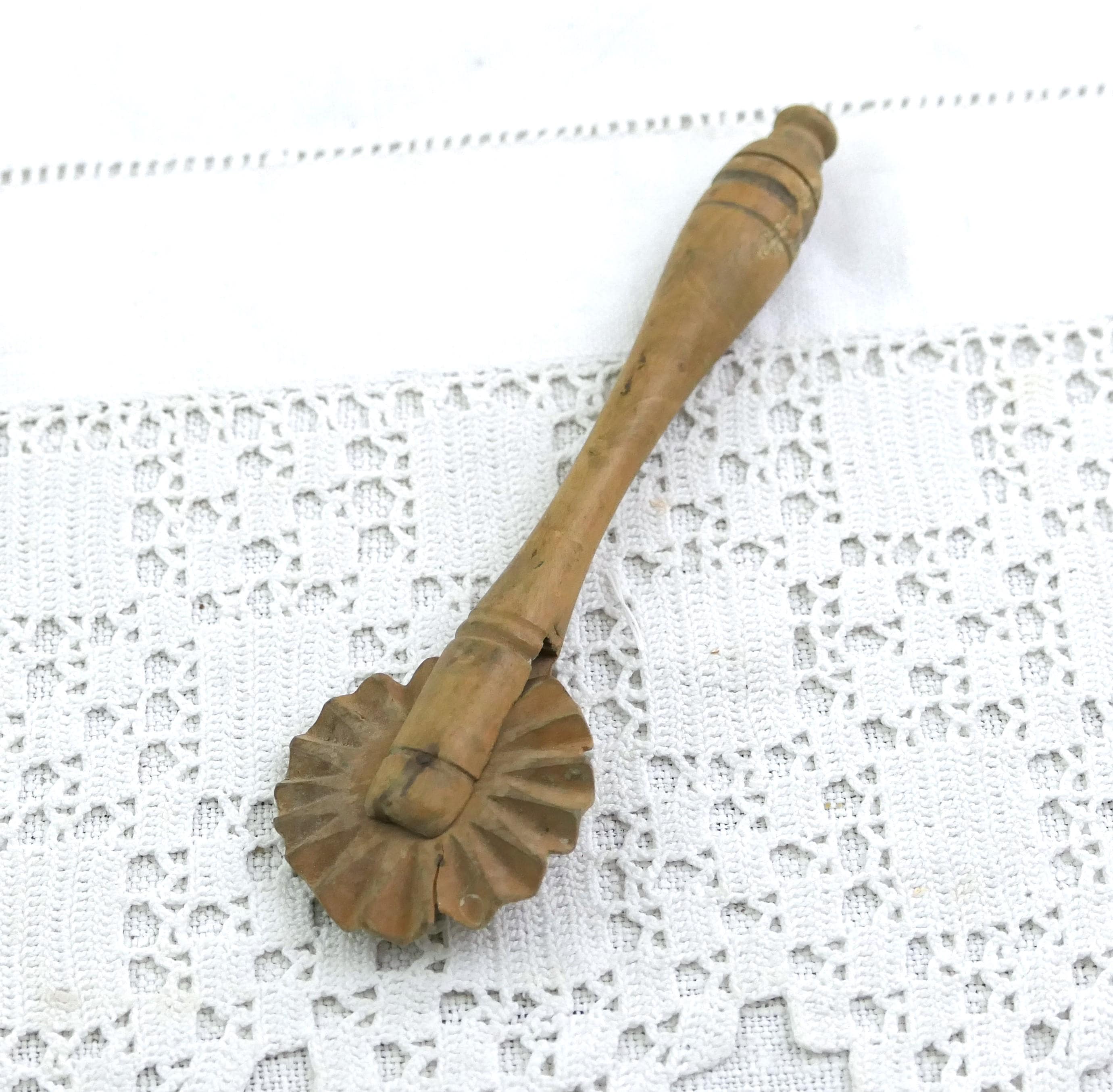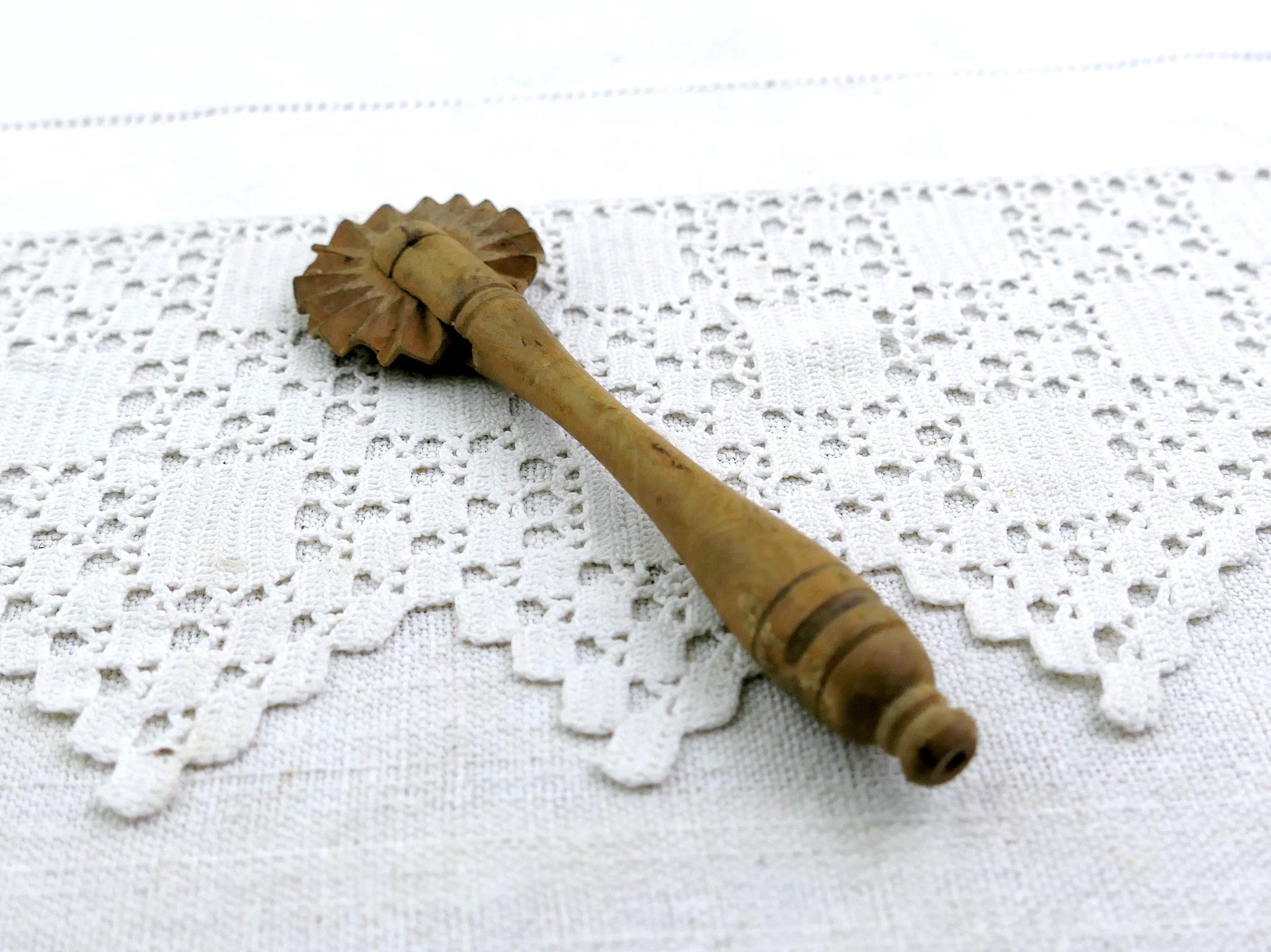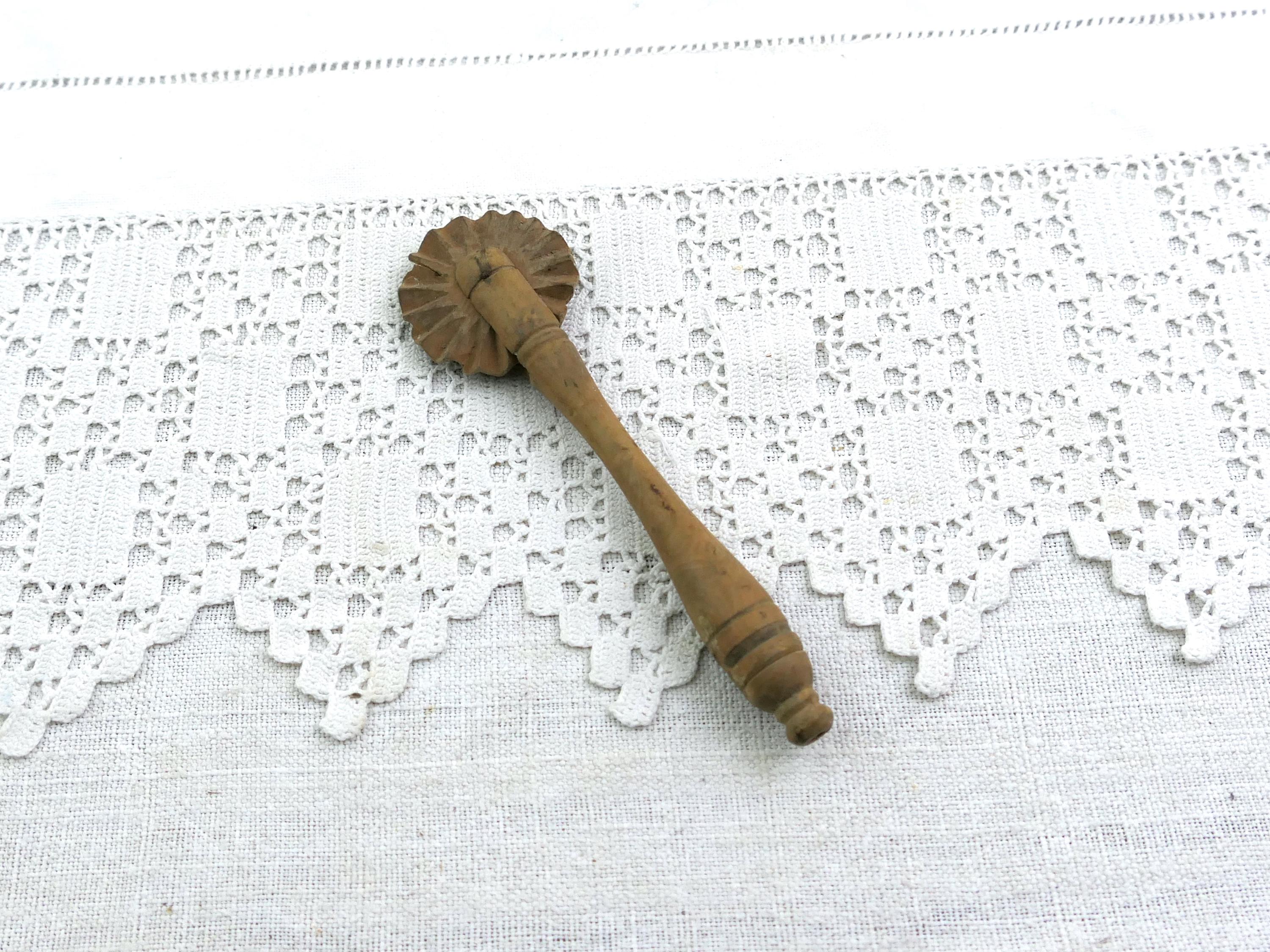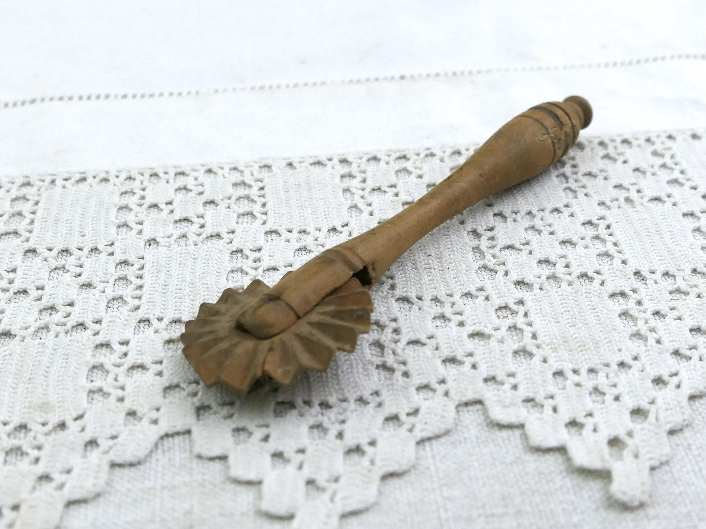 Antique turned wooden wheel pastry crimper. Used back in the day when home baking was an everyday activity also used in butter making. Made of fruitwood. Circa 1920s.