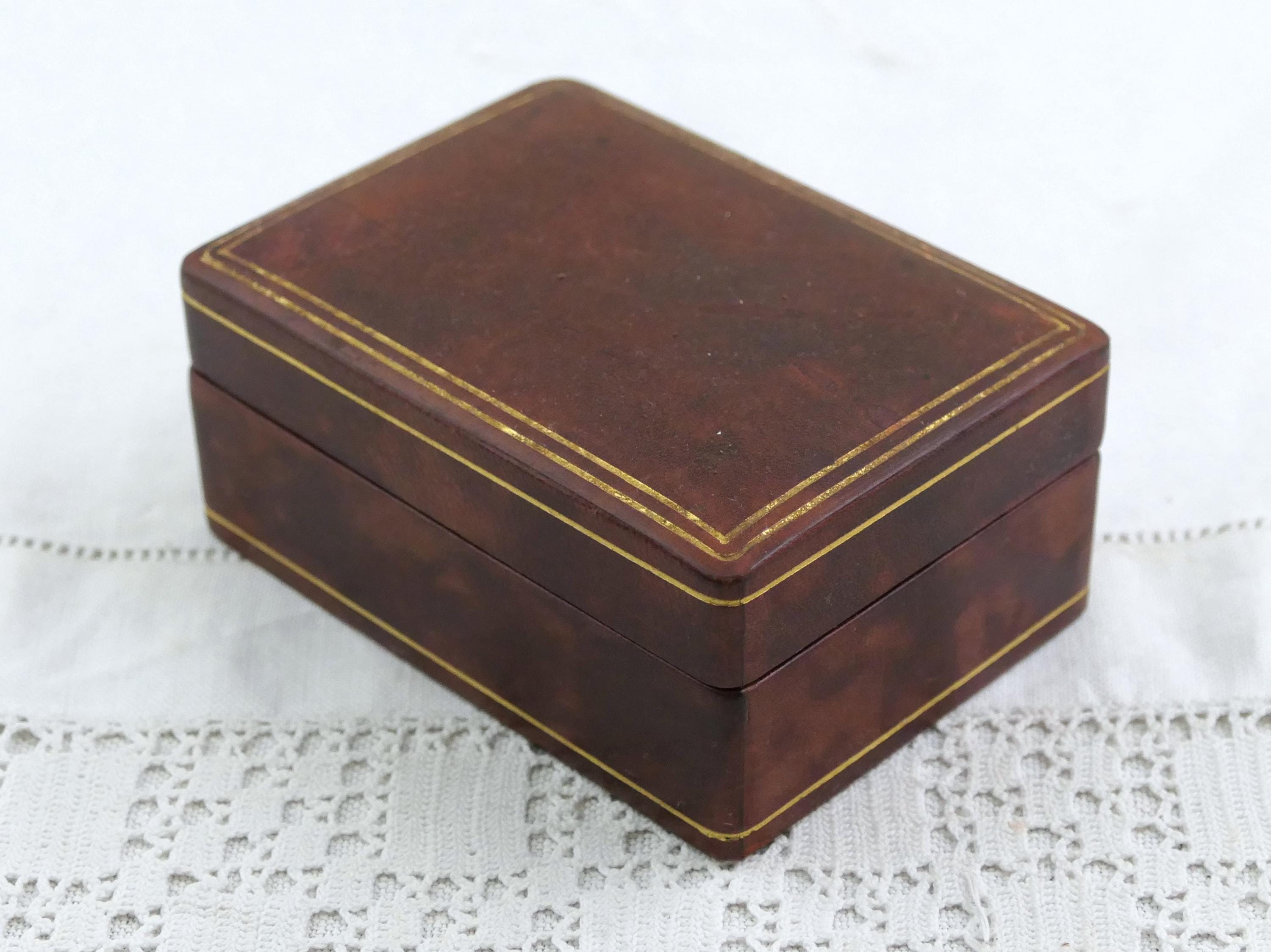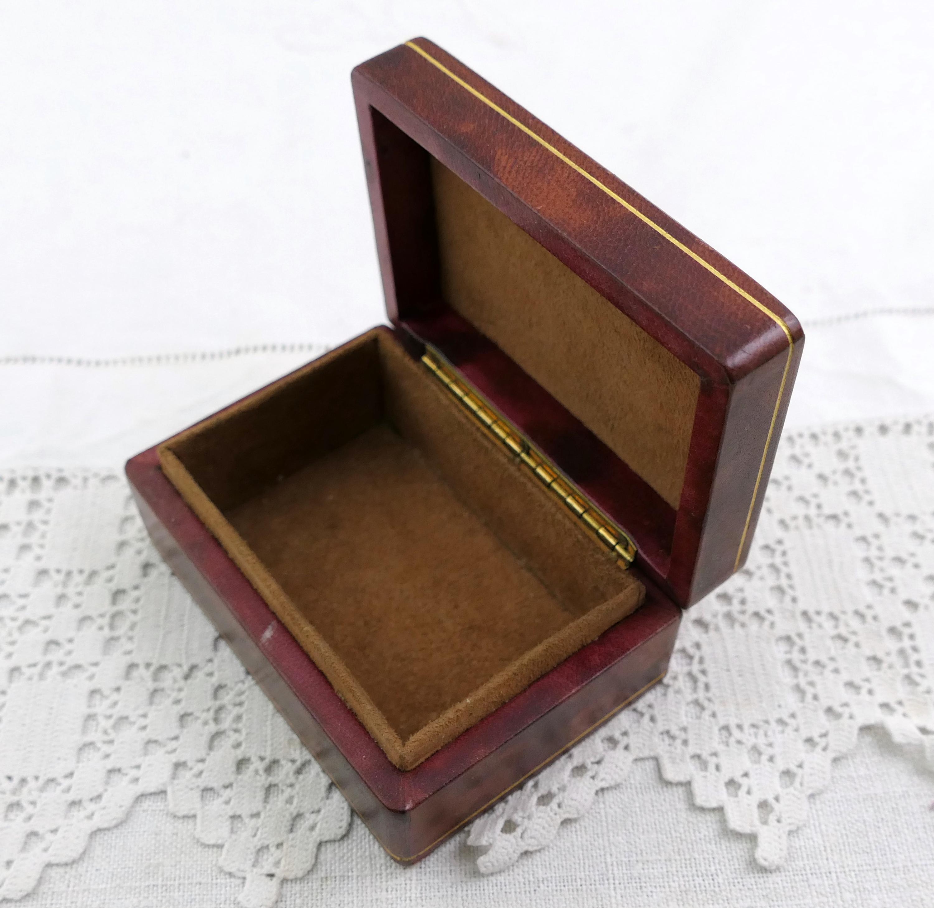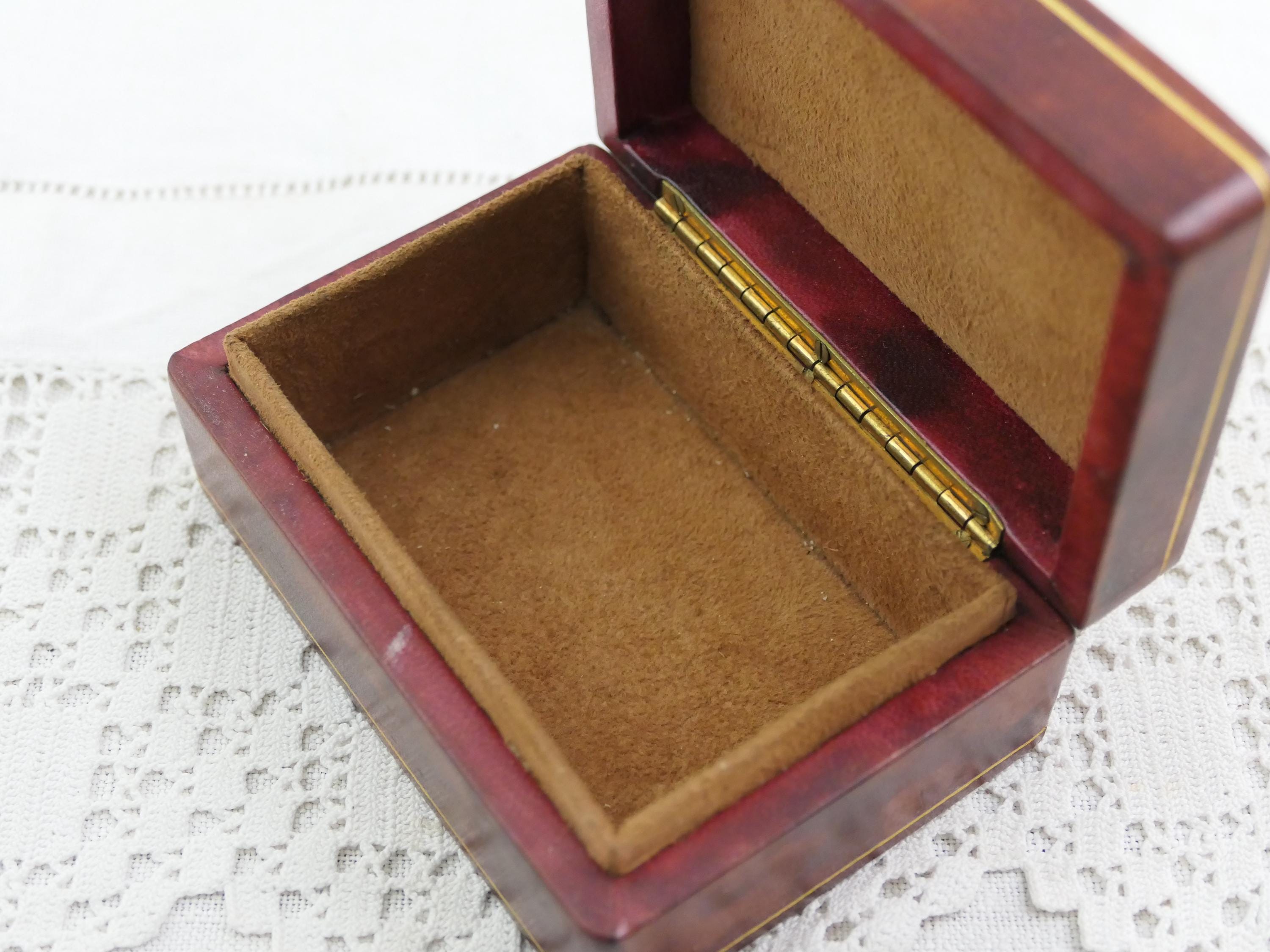 Small vintage rectangular jewelry box. Made of Moroccan leather leather with brown suede interior lining. Ca mid to late 1900s.