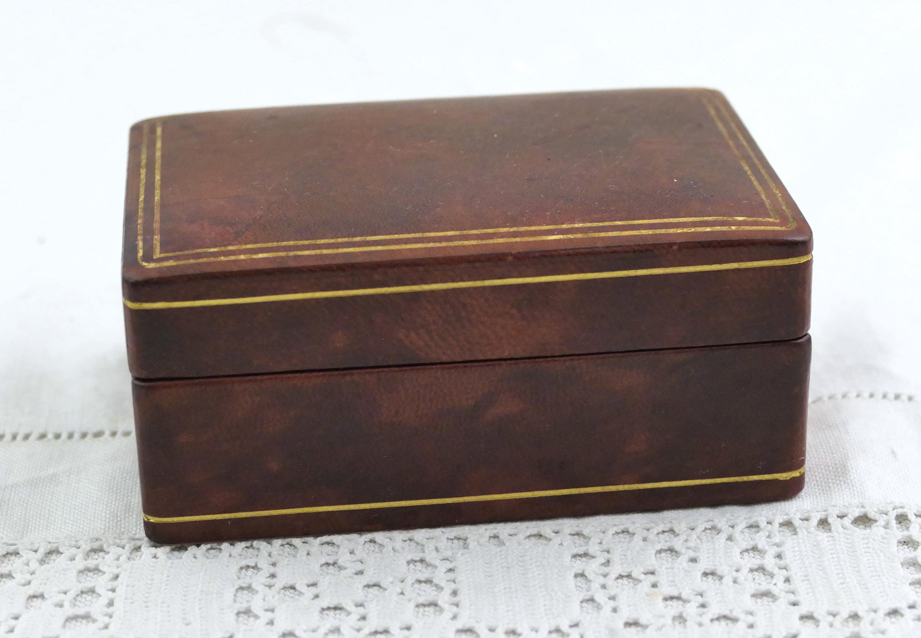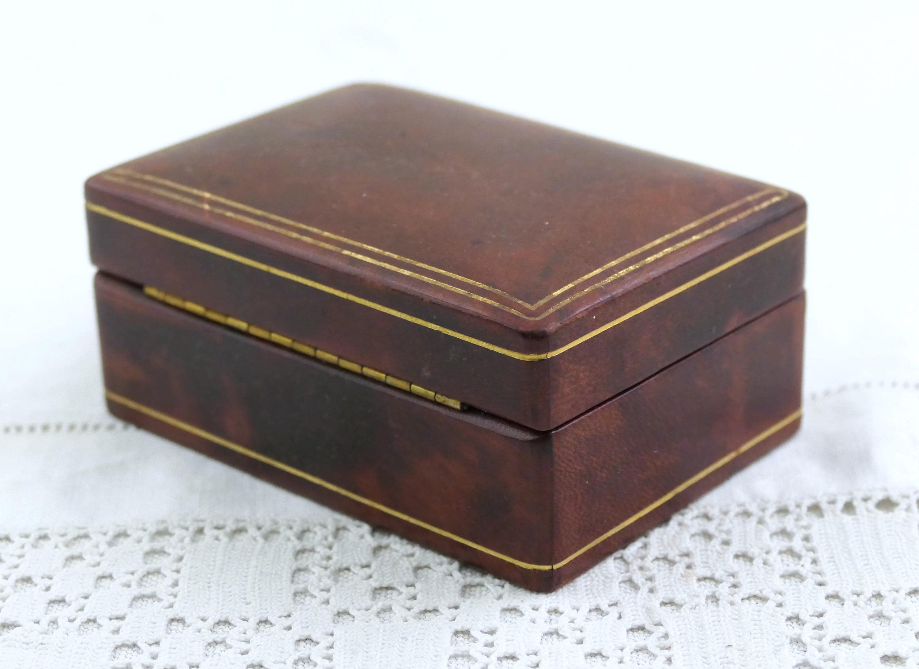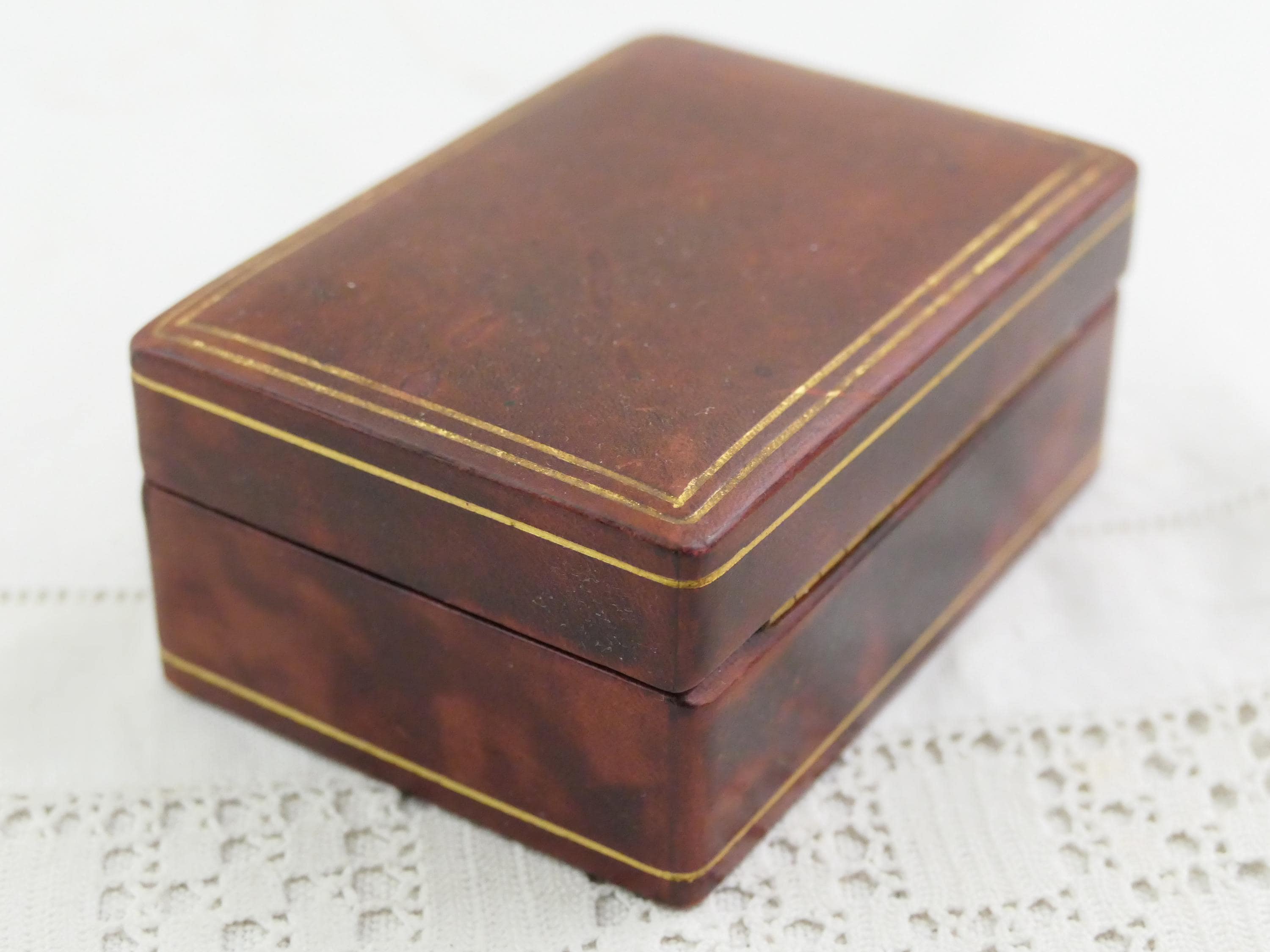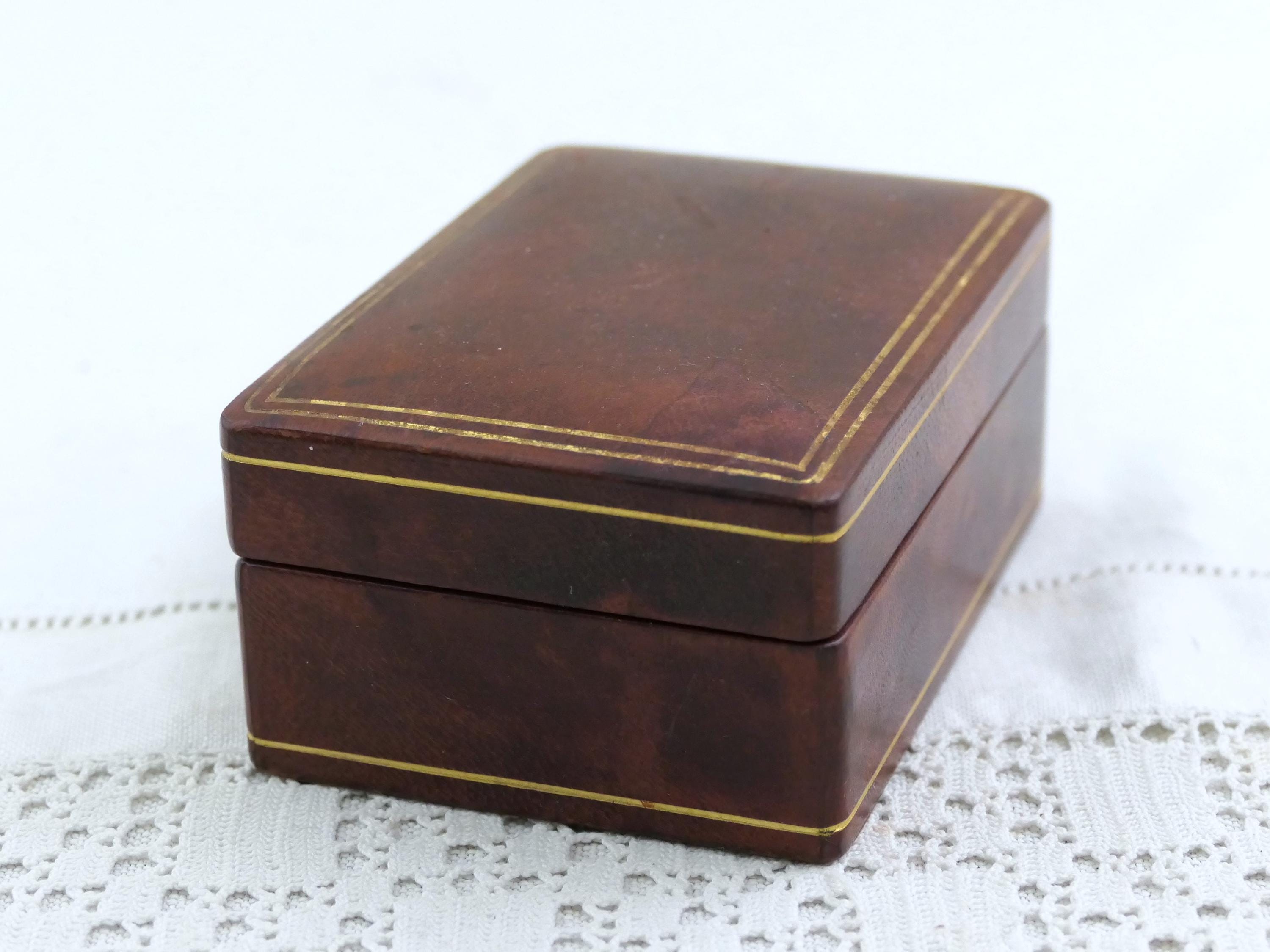 Small vintage rectangular jewelry box. Made of Moroccan leather leather with brown suede interior lining. Ca mid to late 1900s.