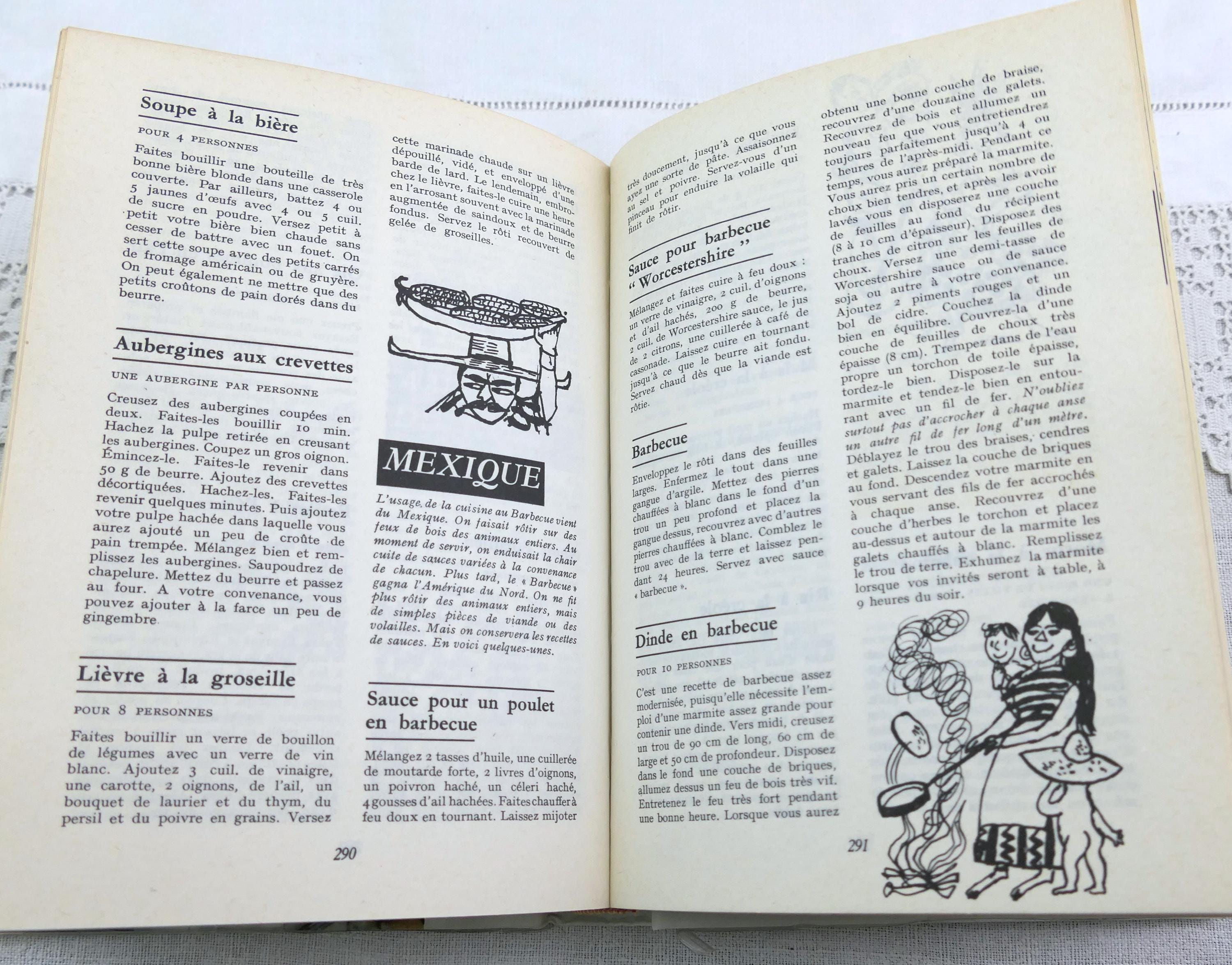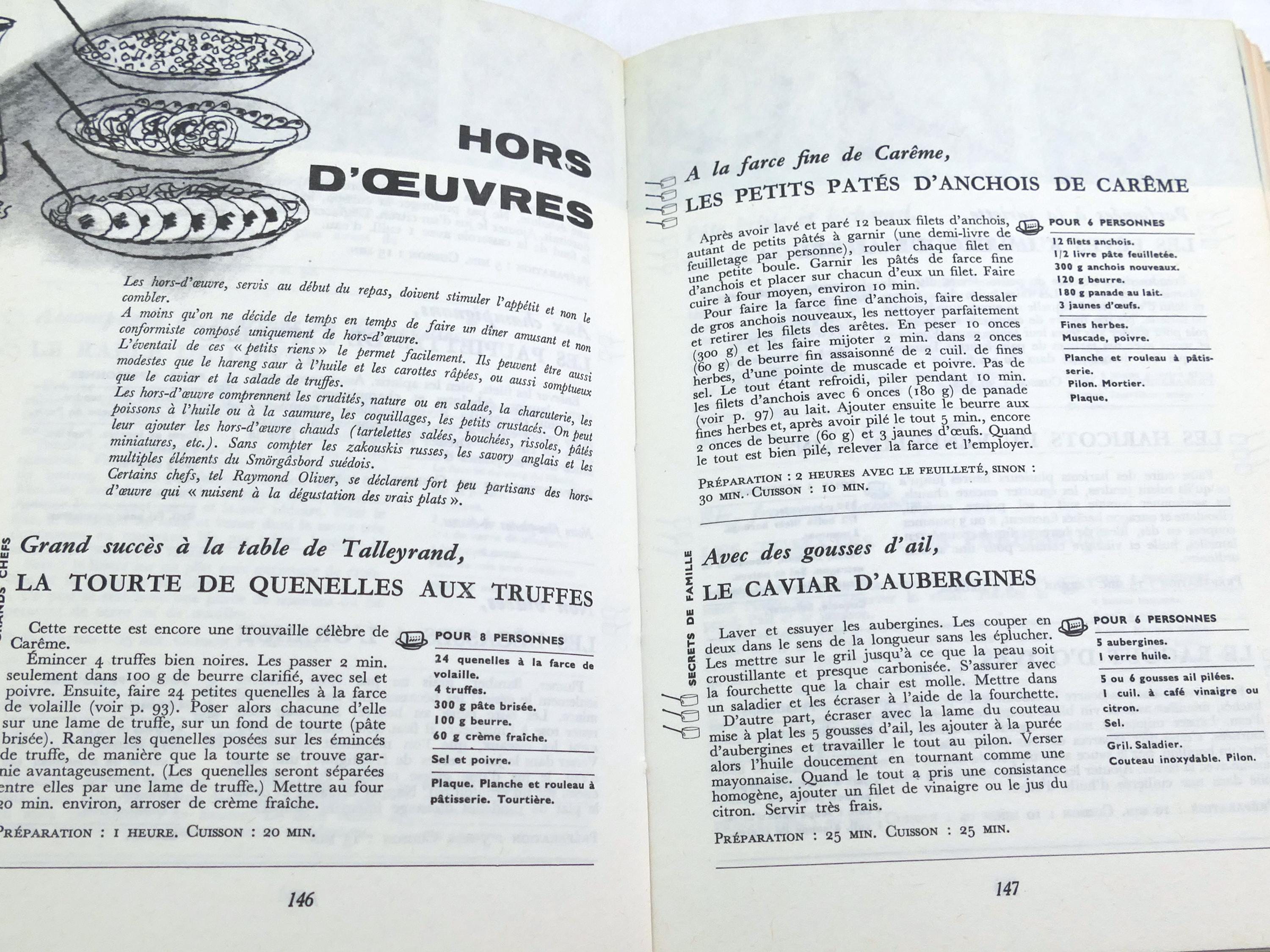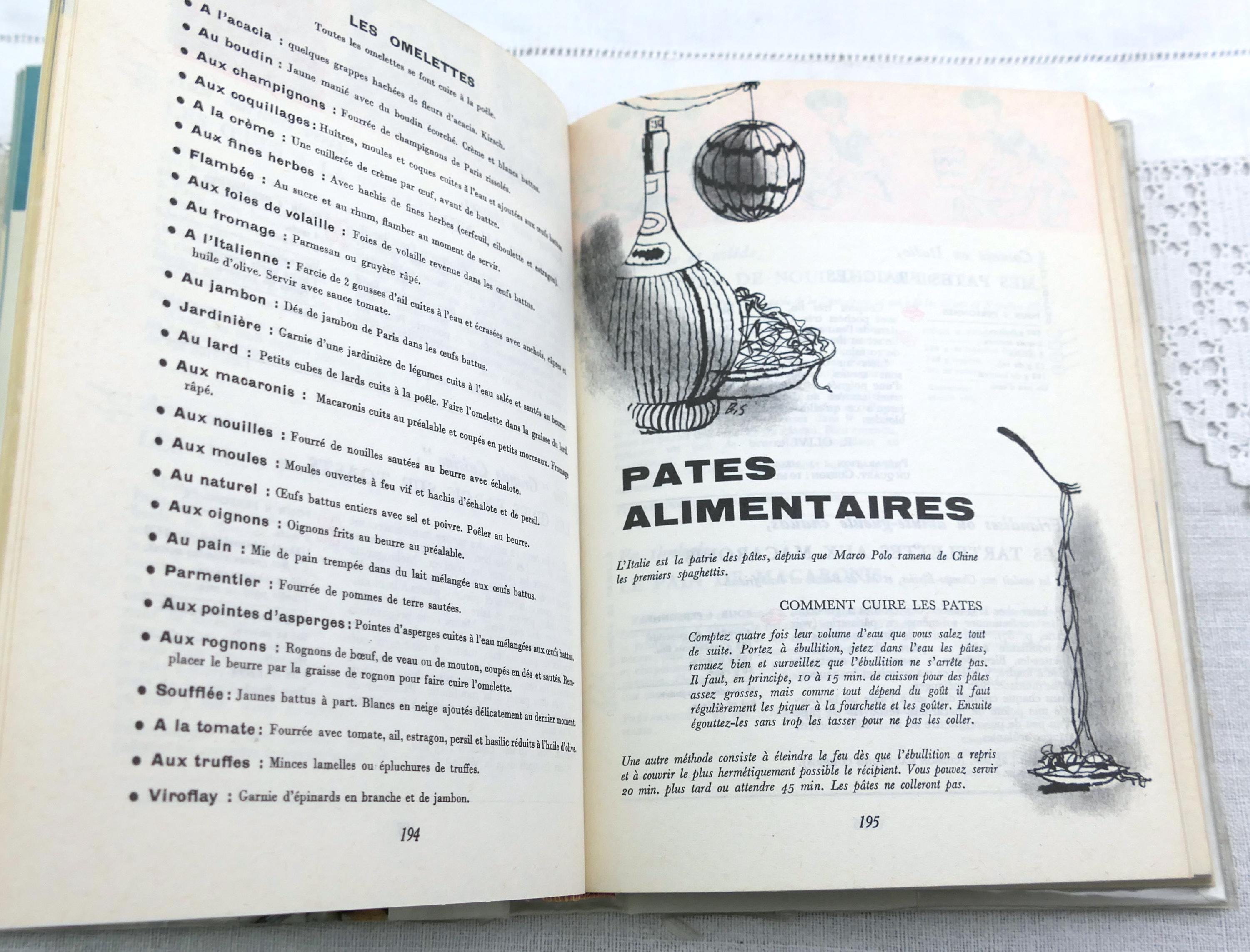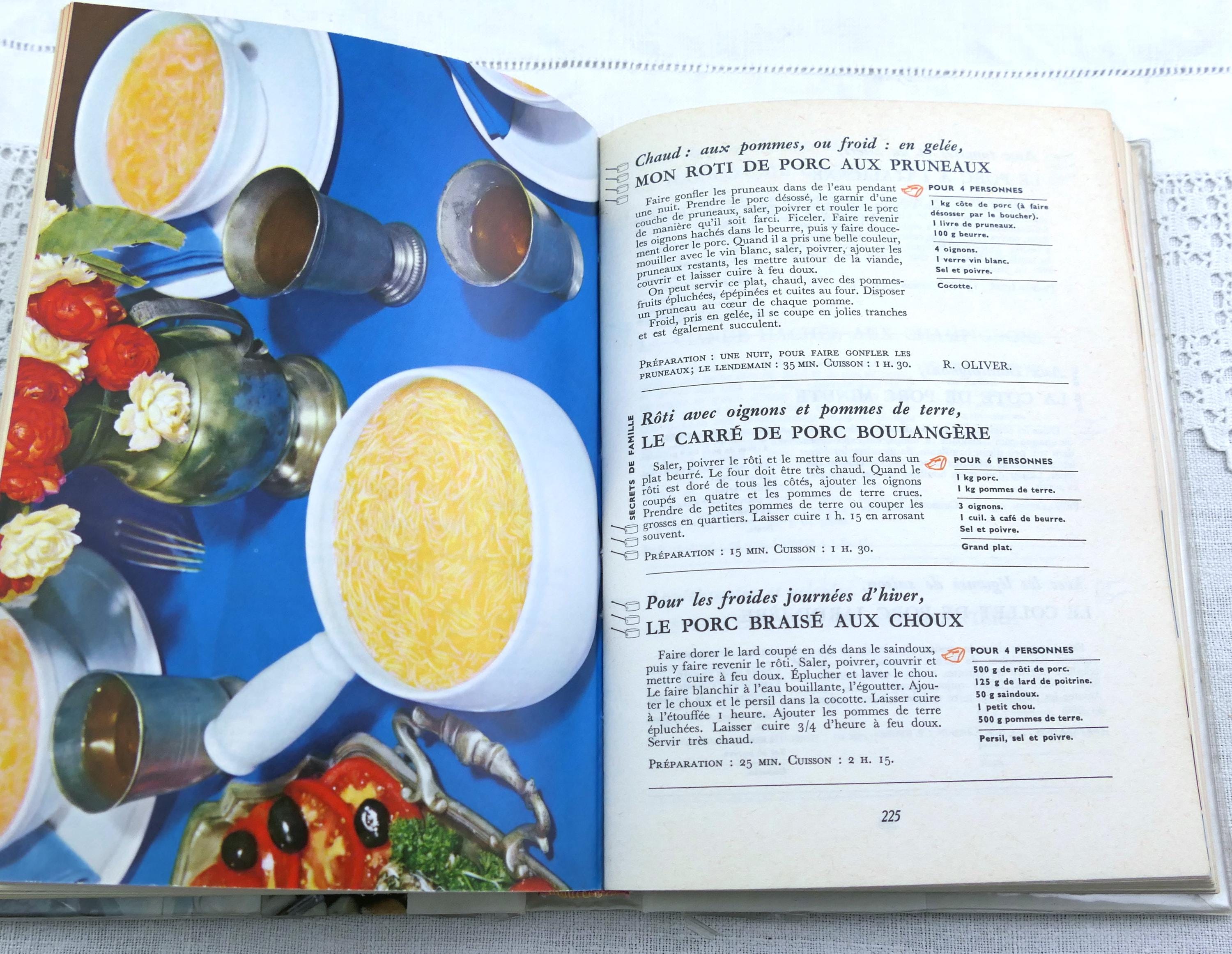 Large vintage well used French cookbook. L'Encyclopediede la Grande et Petite Cuisine. 370 pages of traditional recipes with photographs. Written in French. Printed in 1959.