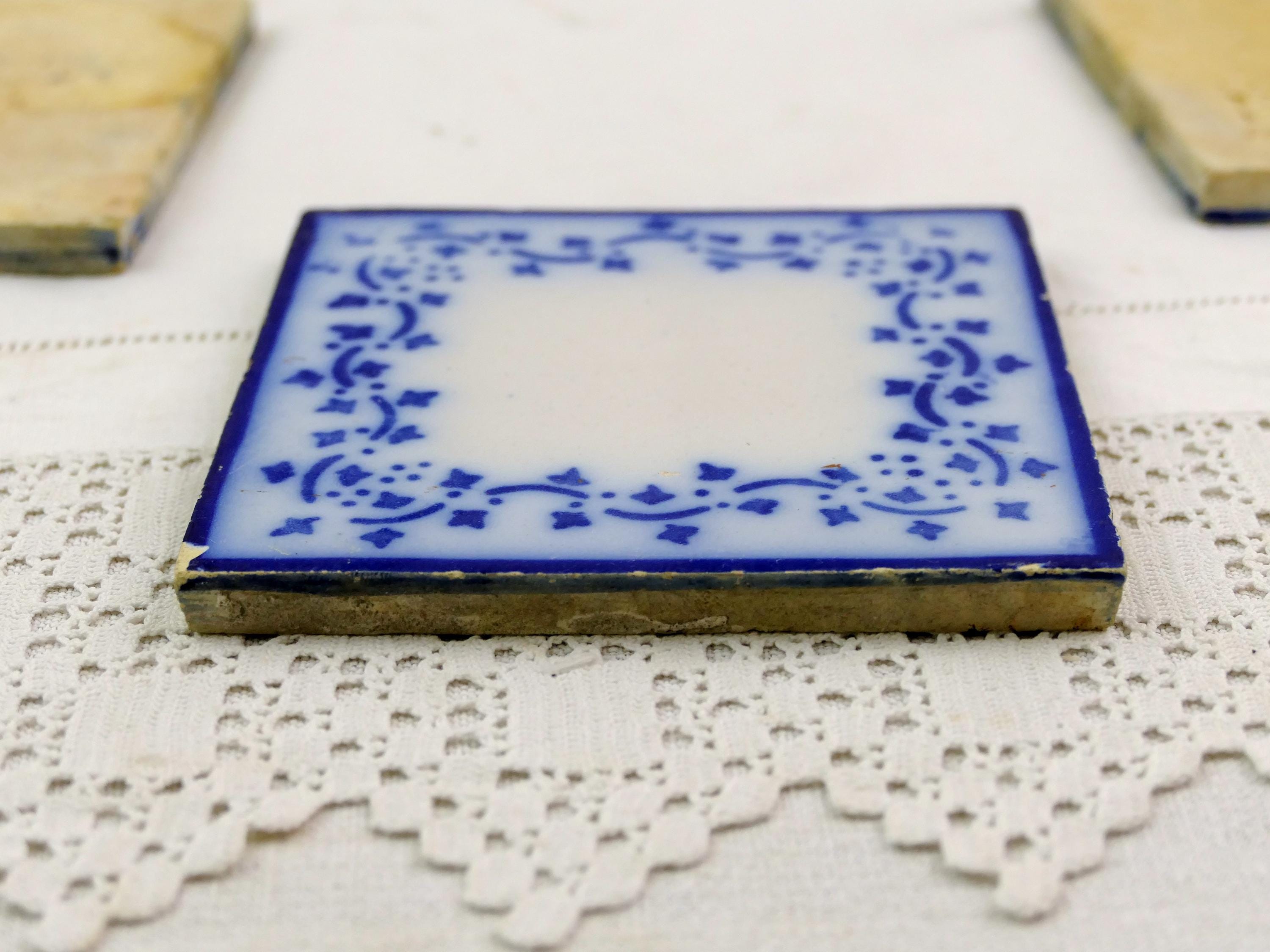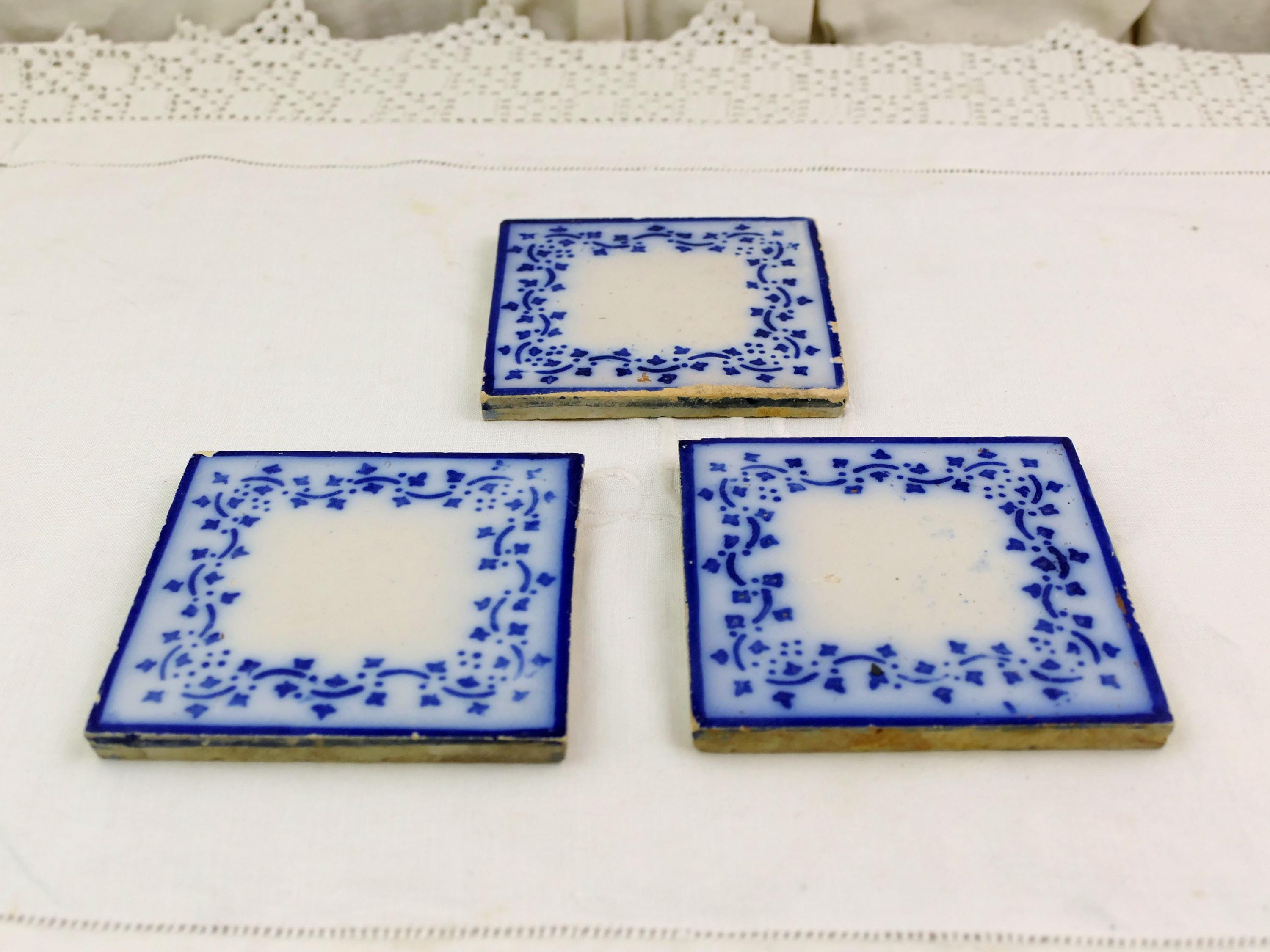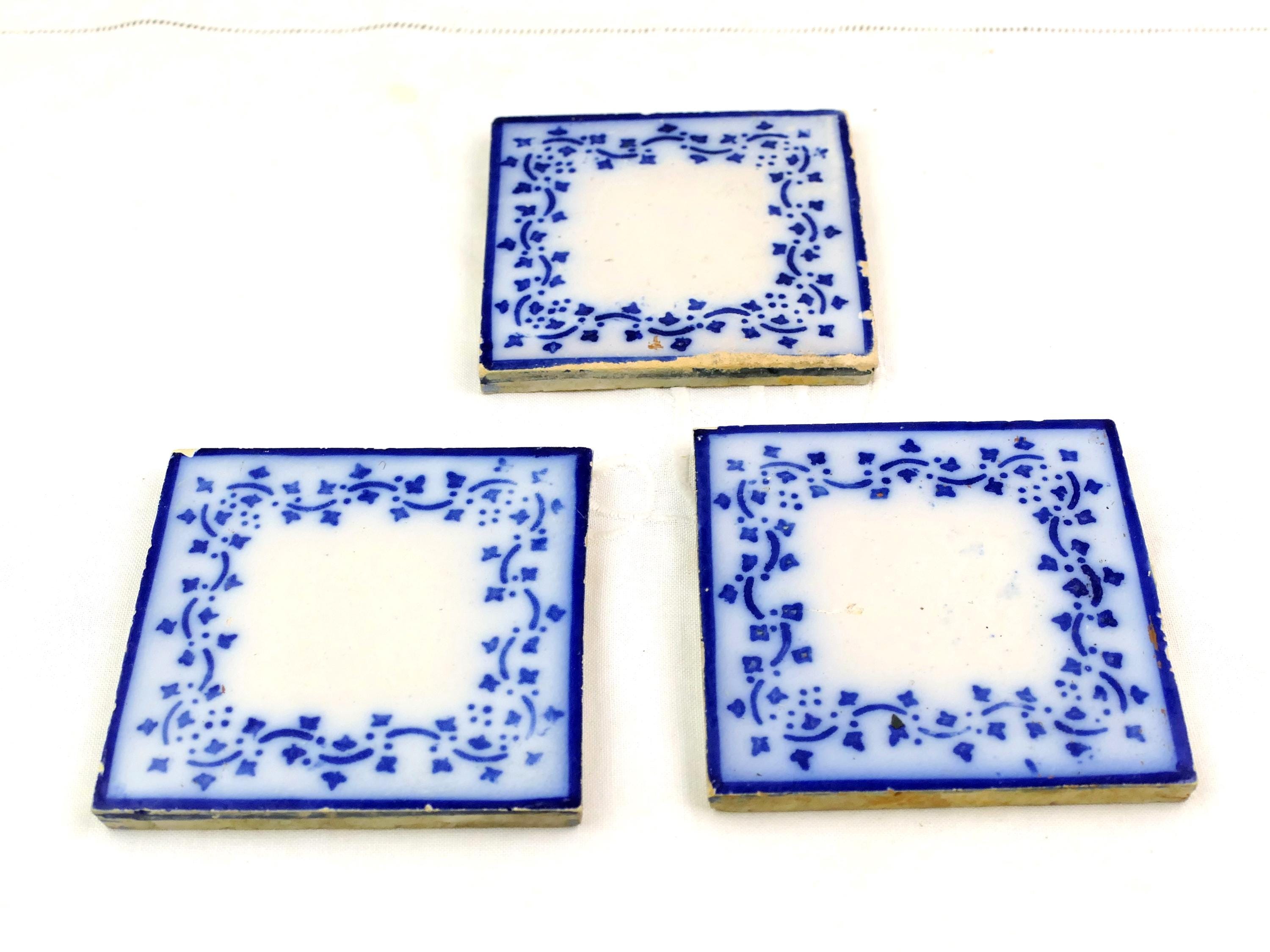 3 Antique French wall tiles in white with blue pattern. Made of glazed pottery. Ca late 1800s early 1900s.