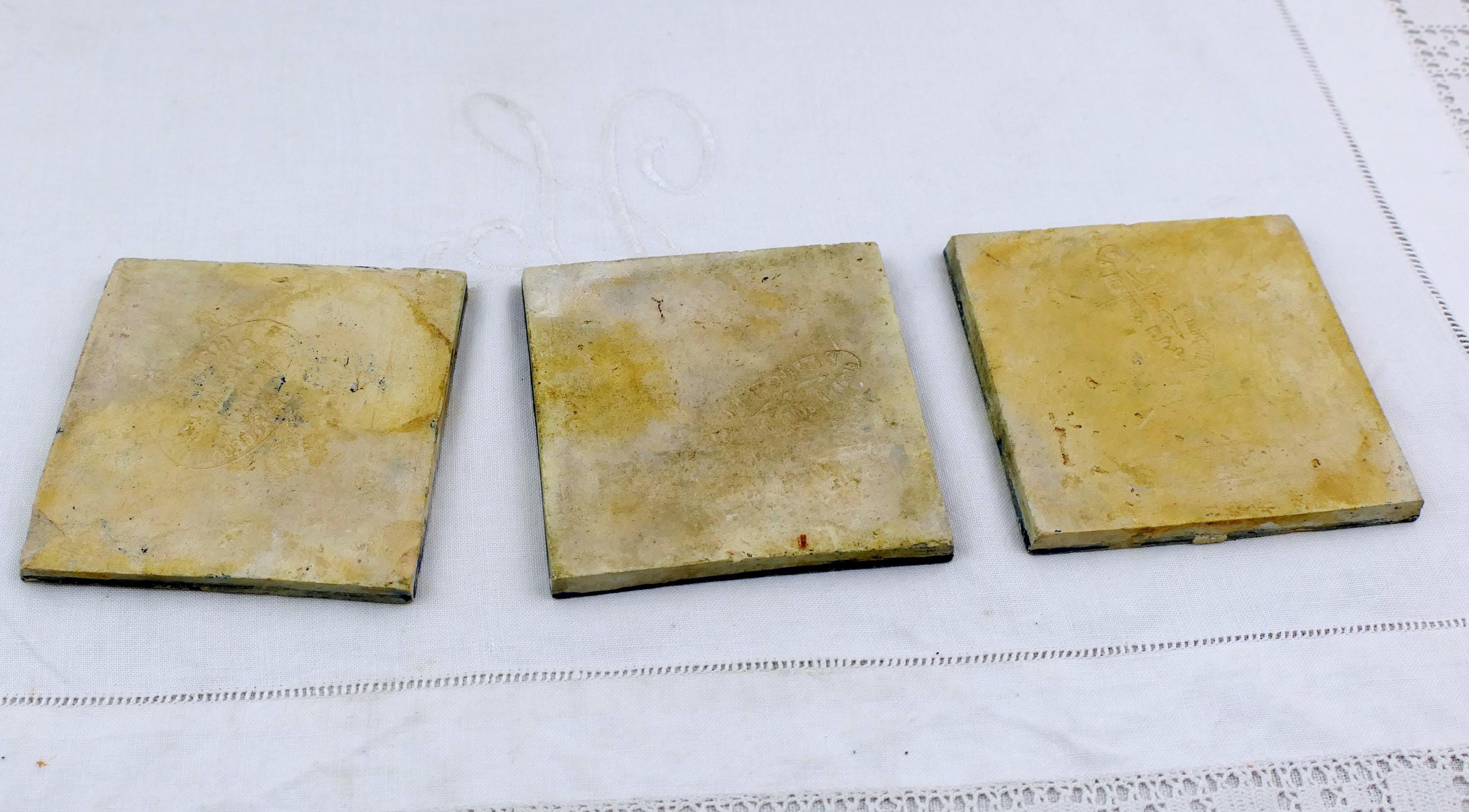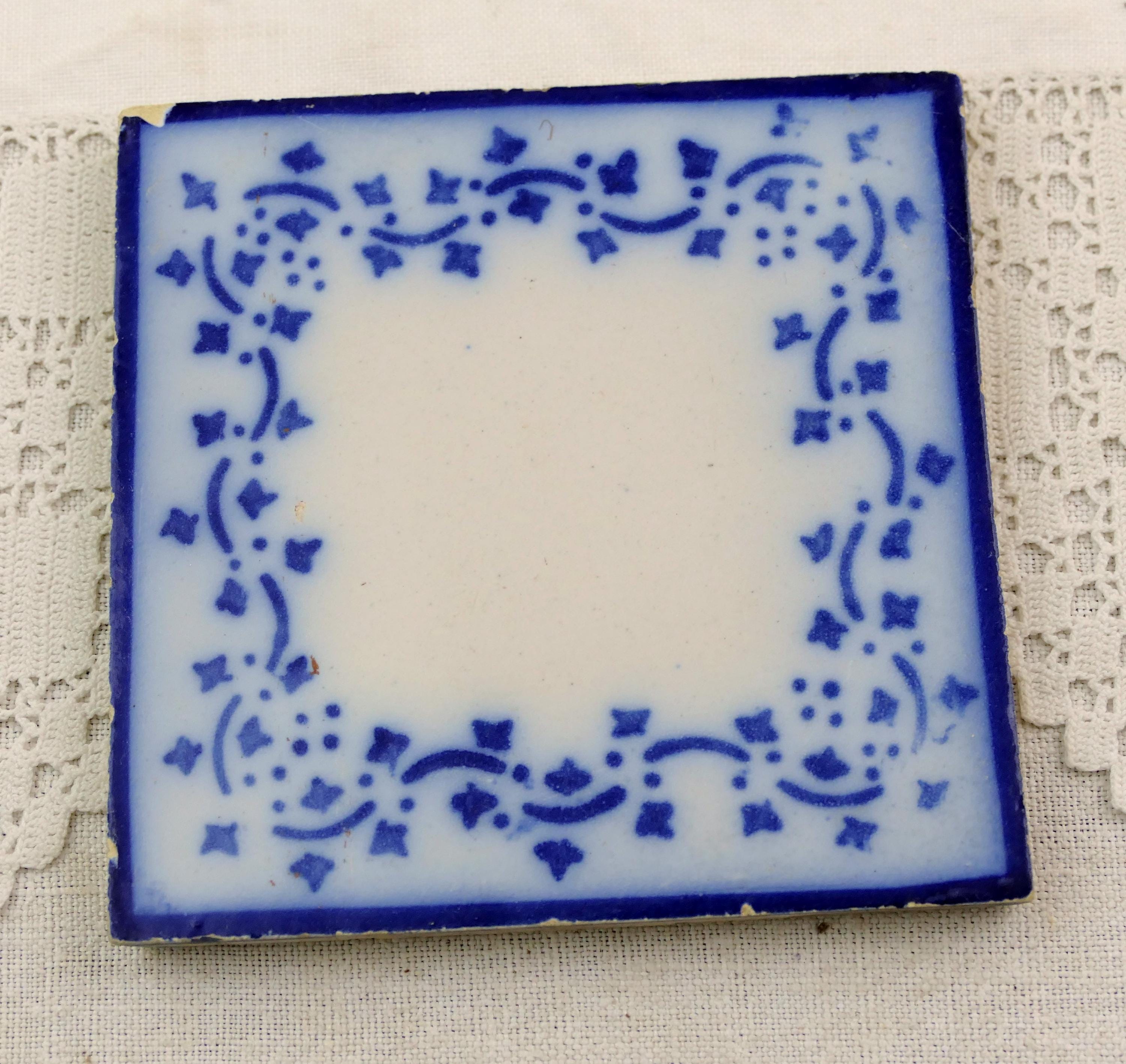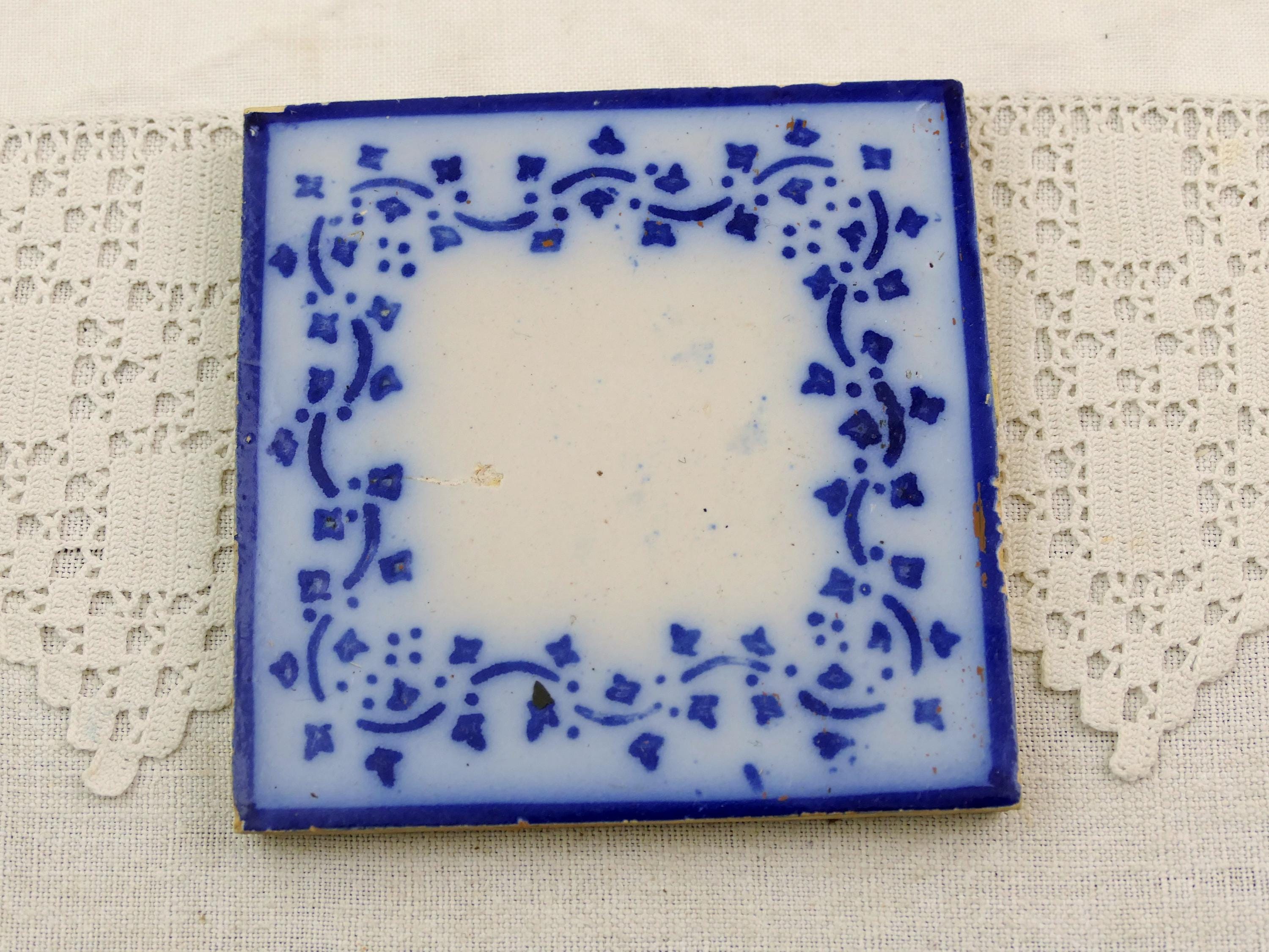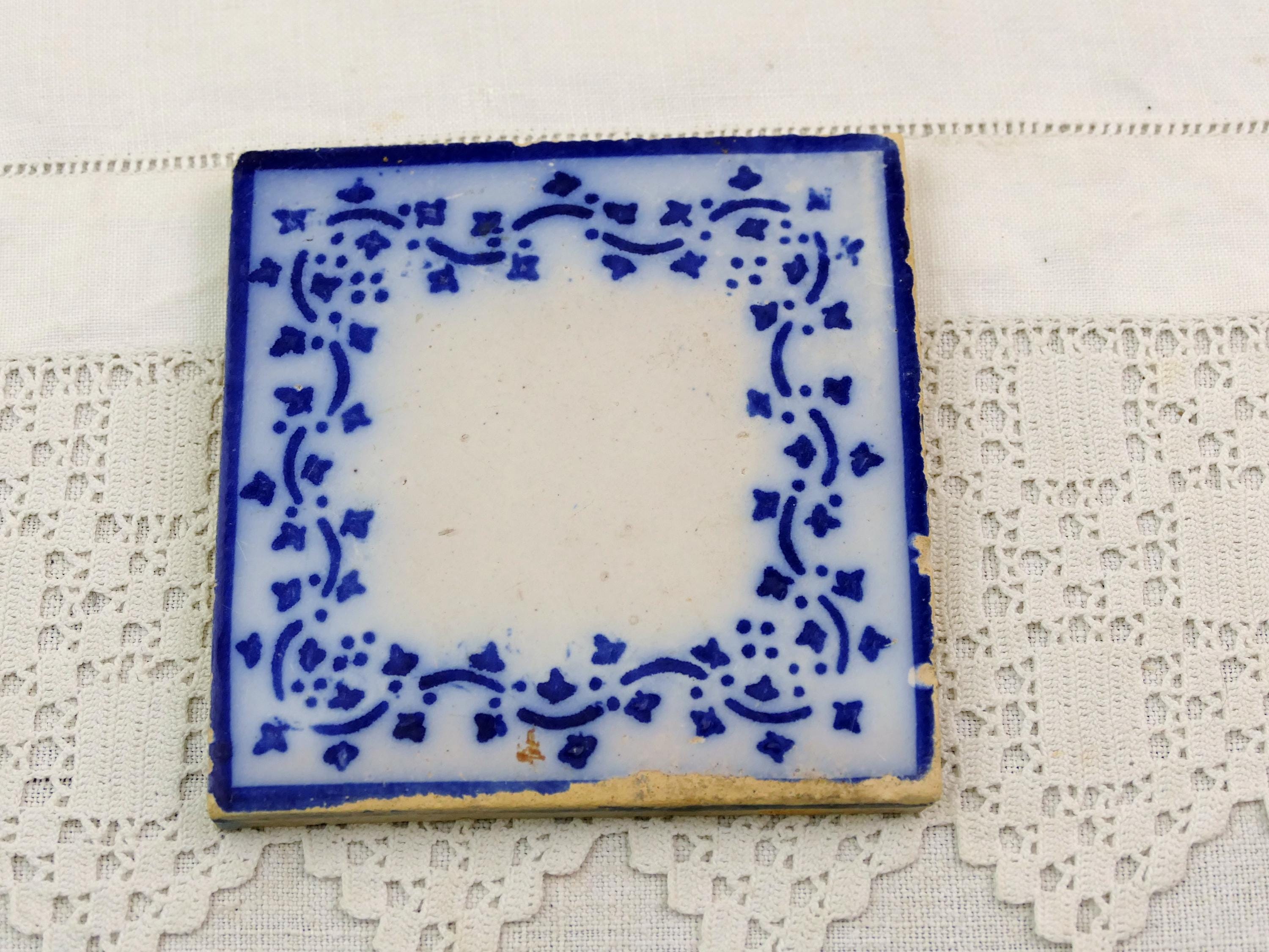 3 Antique French wall tiles in white with blue pattern. Made of glazed pottery. Ca late 1800s early 1900s.