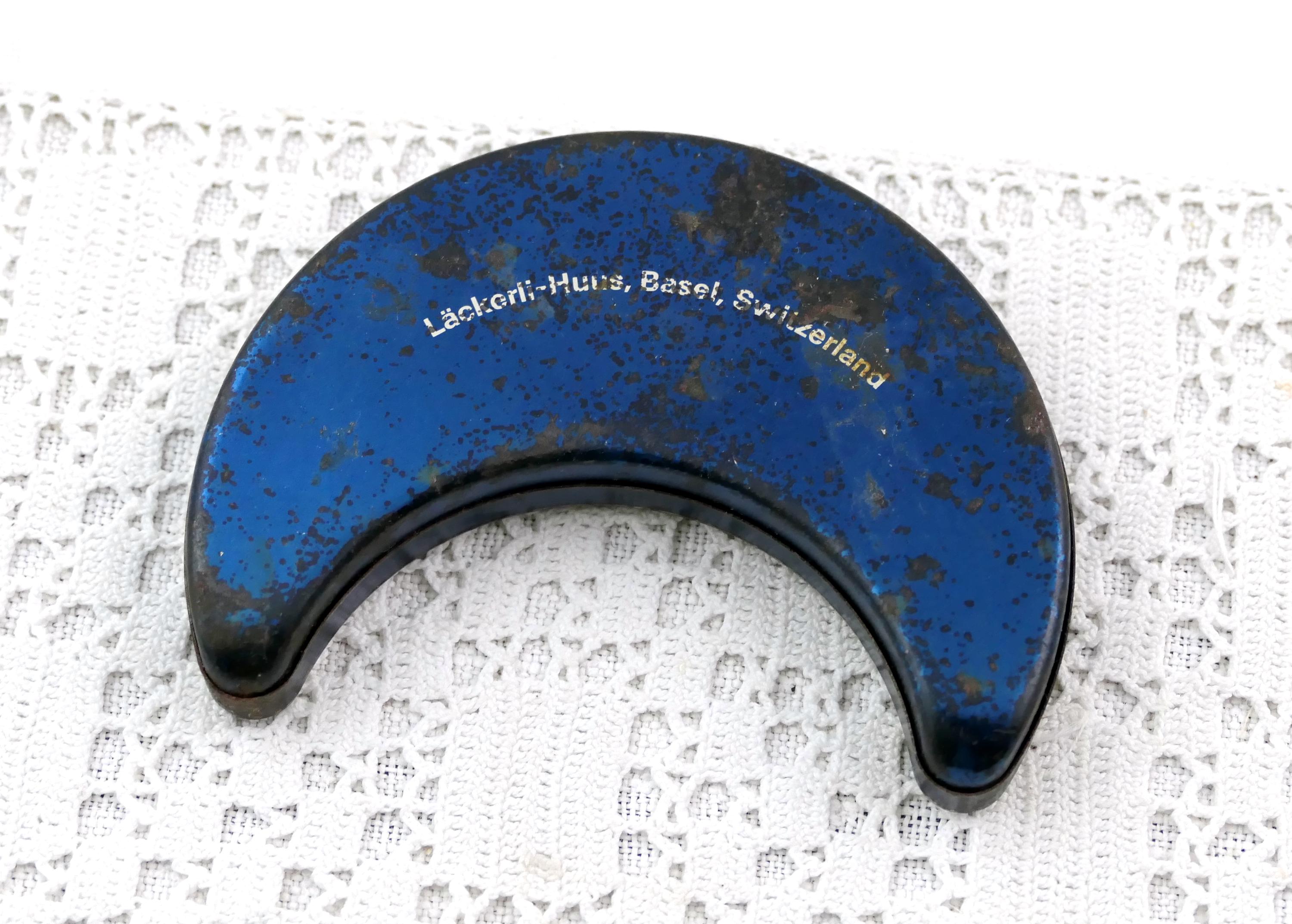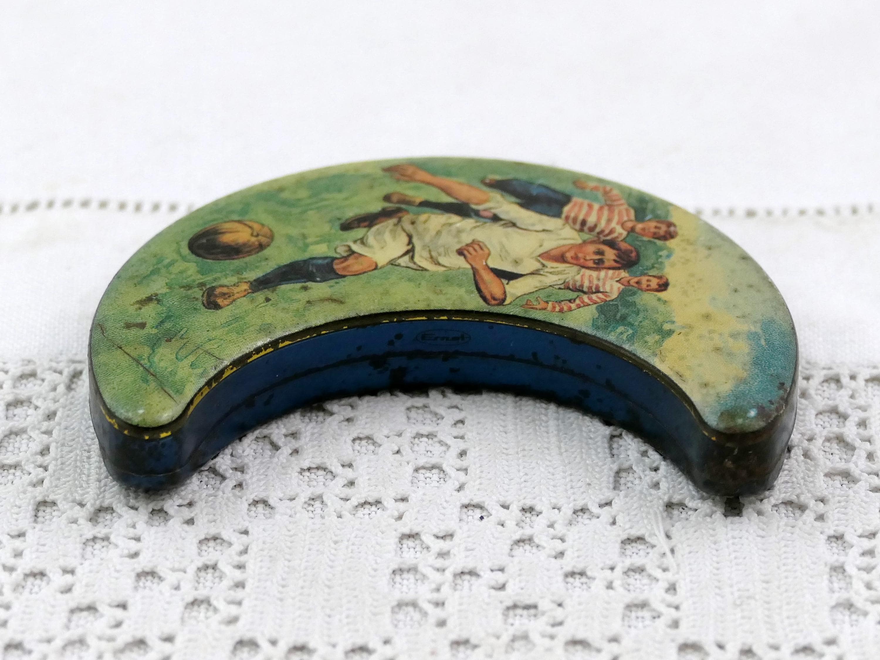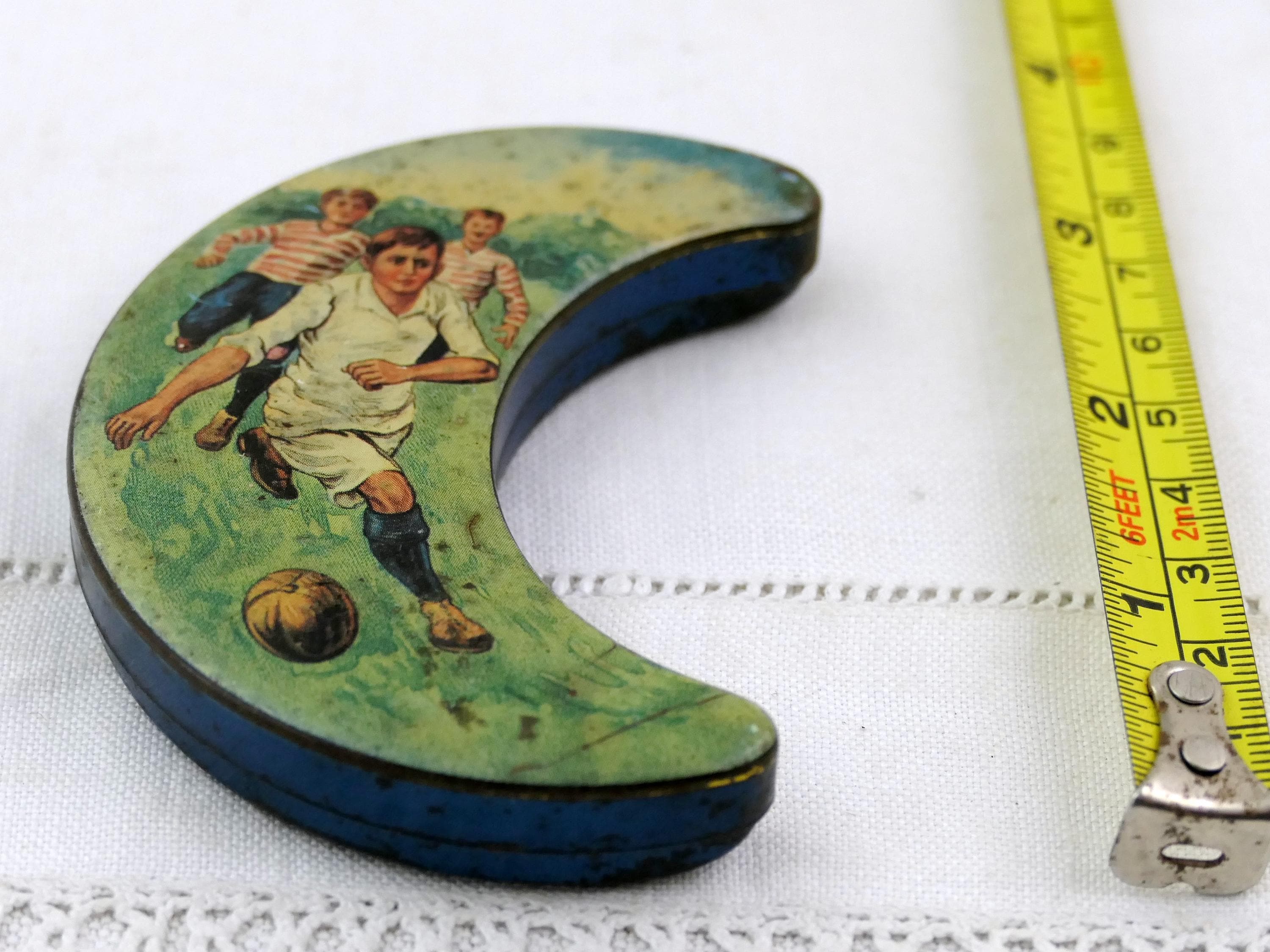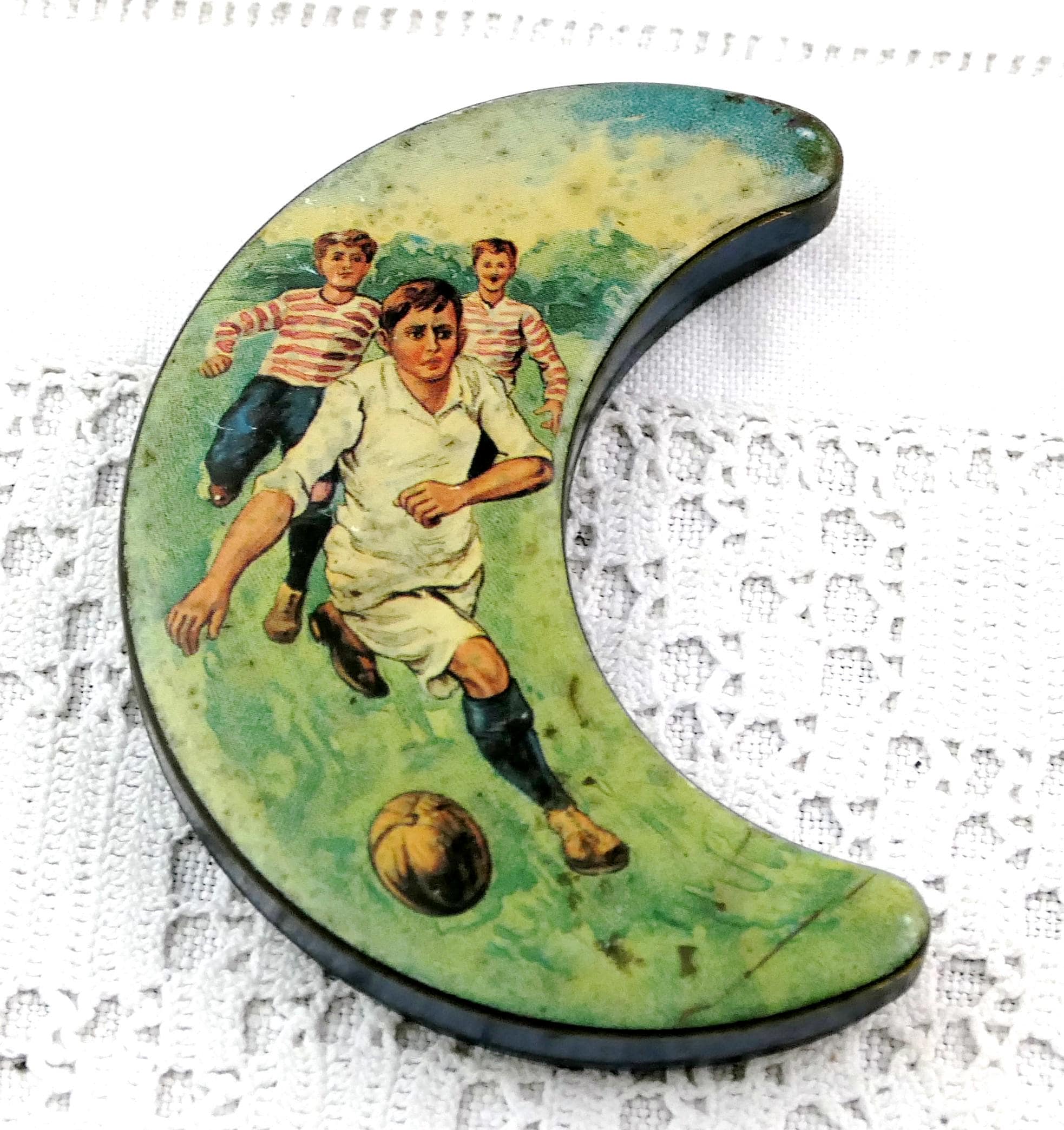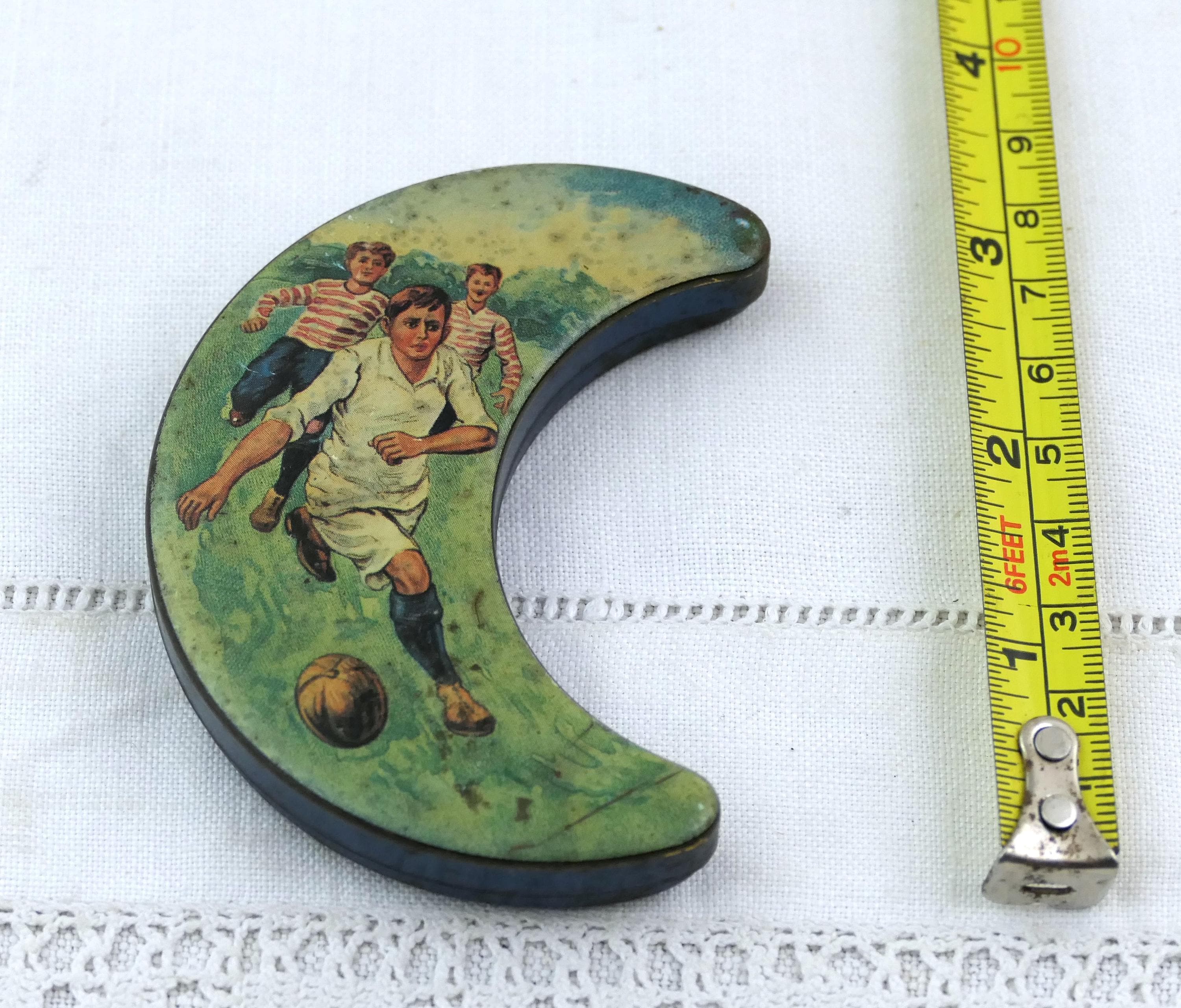 Vintage Swiss Lackerli-Huus crescent moon shaped metal tin with football themed design. Made of metal. Ca mid 1900s.