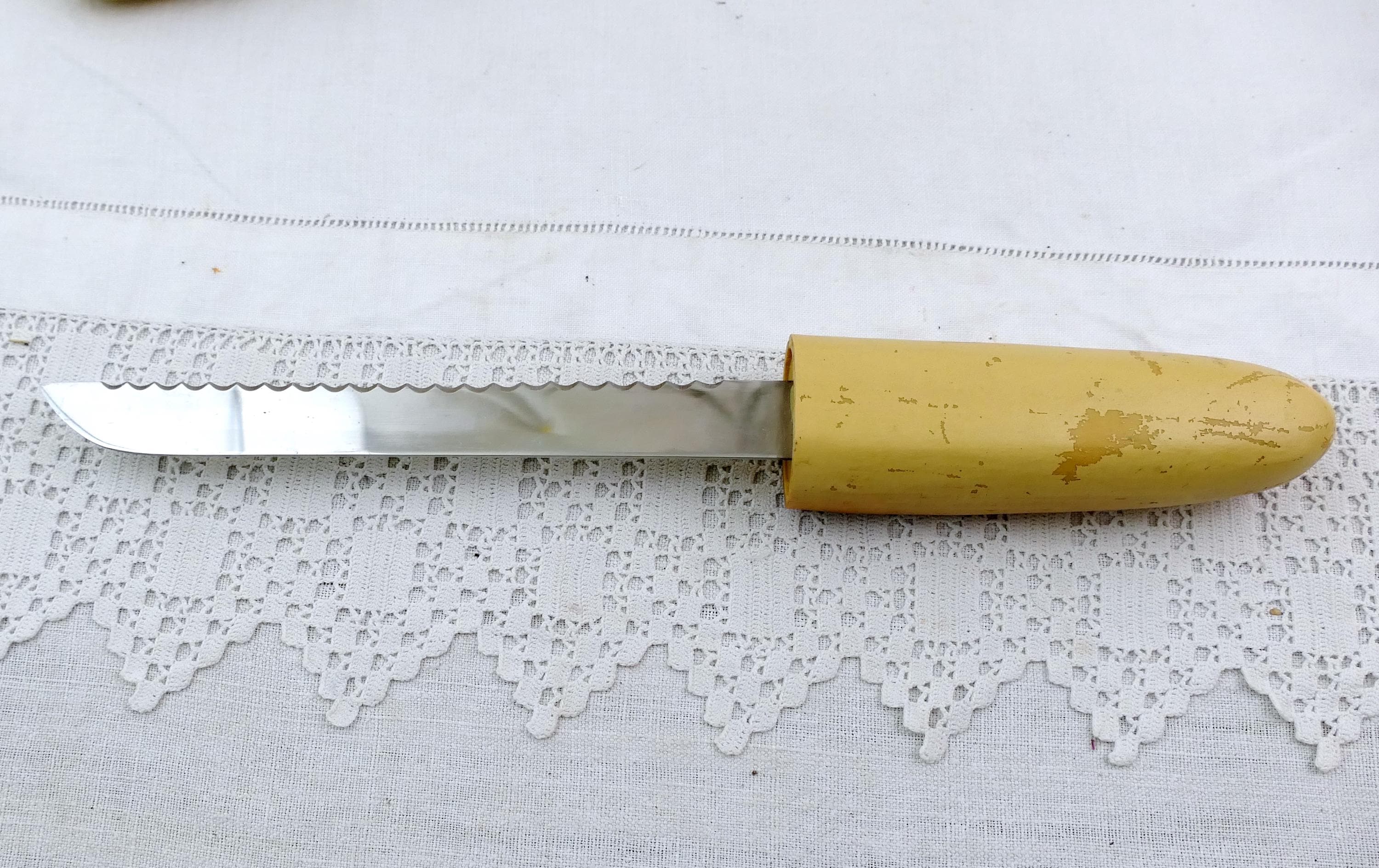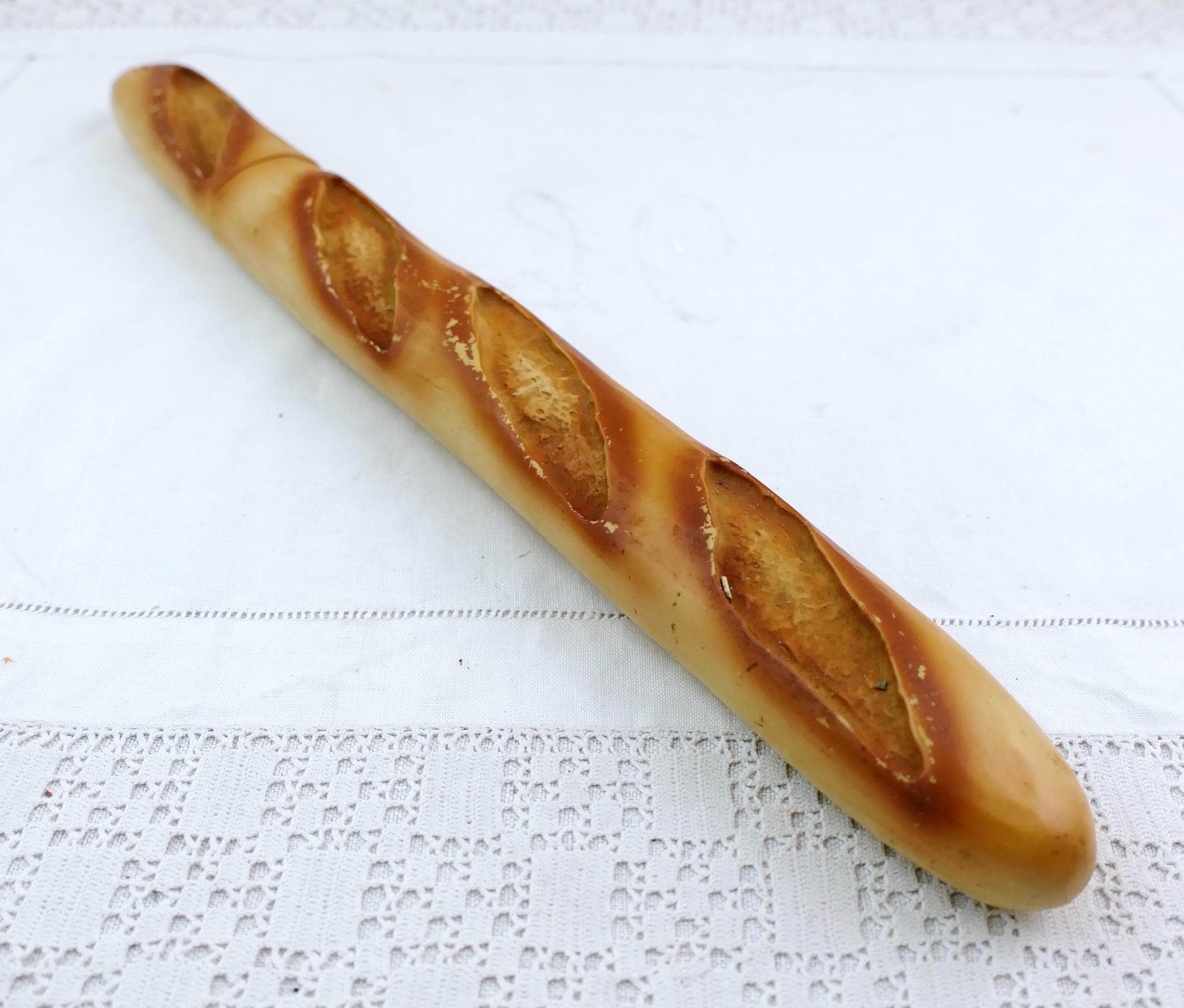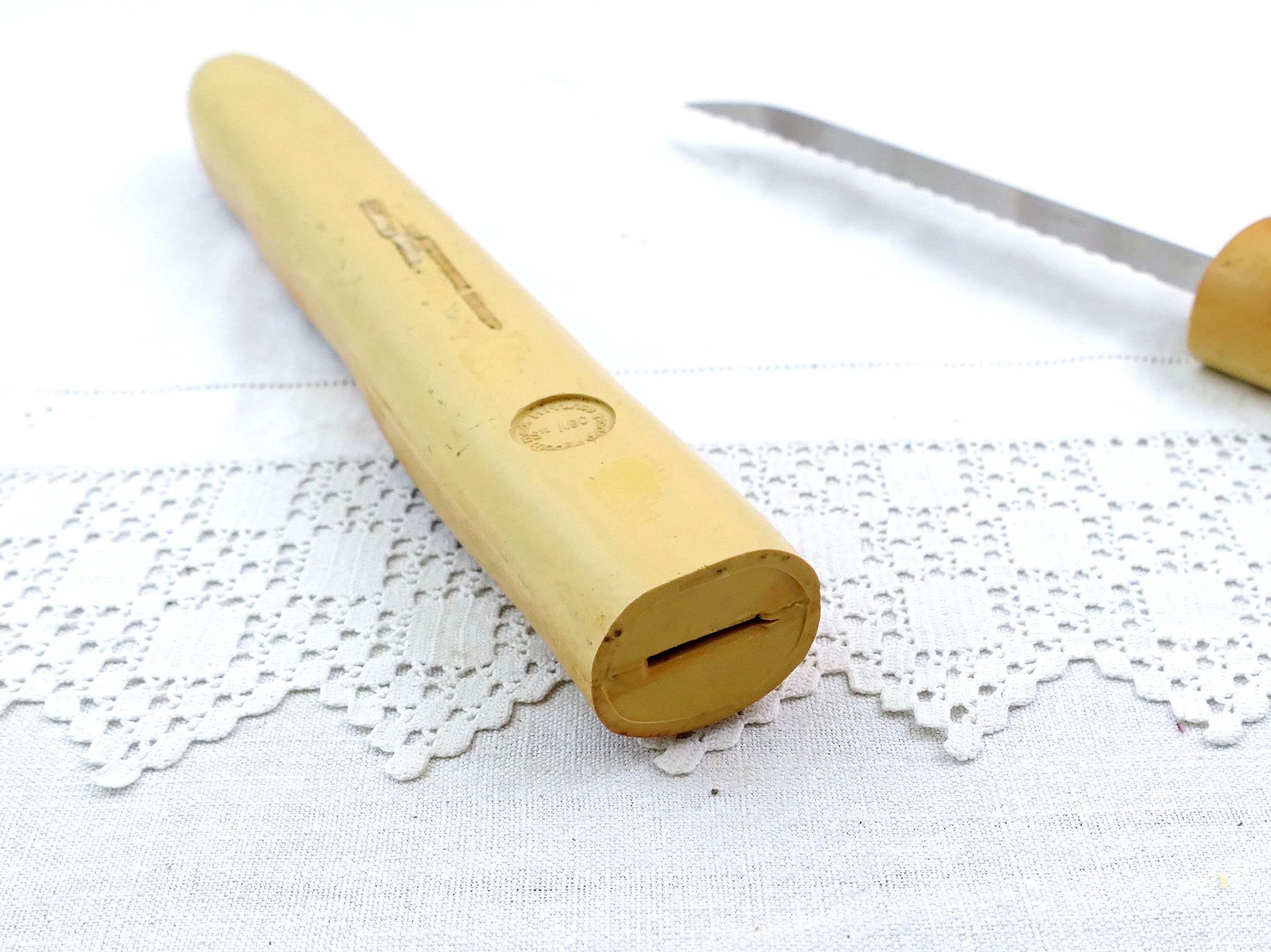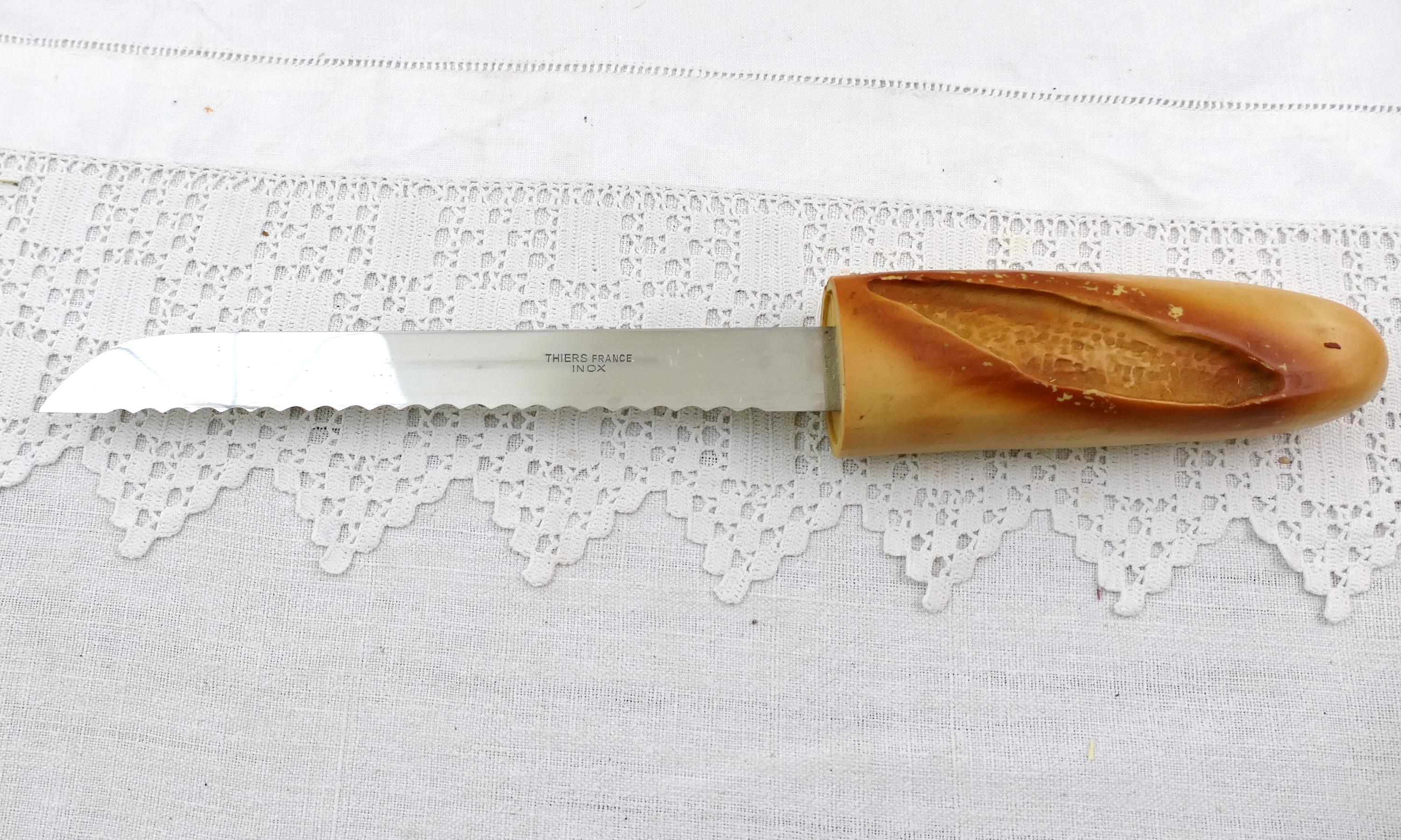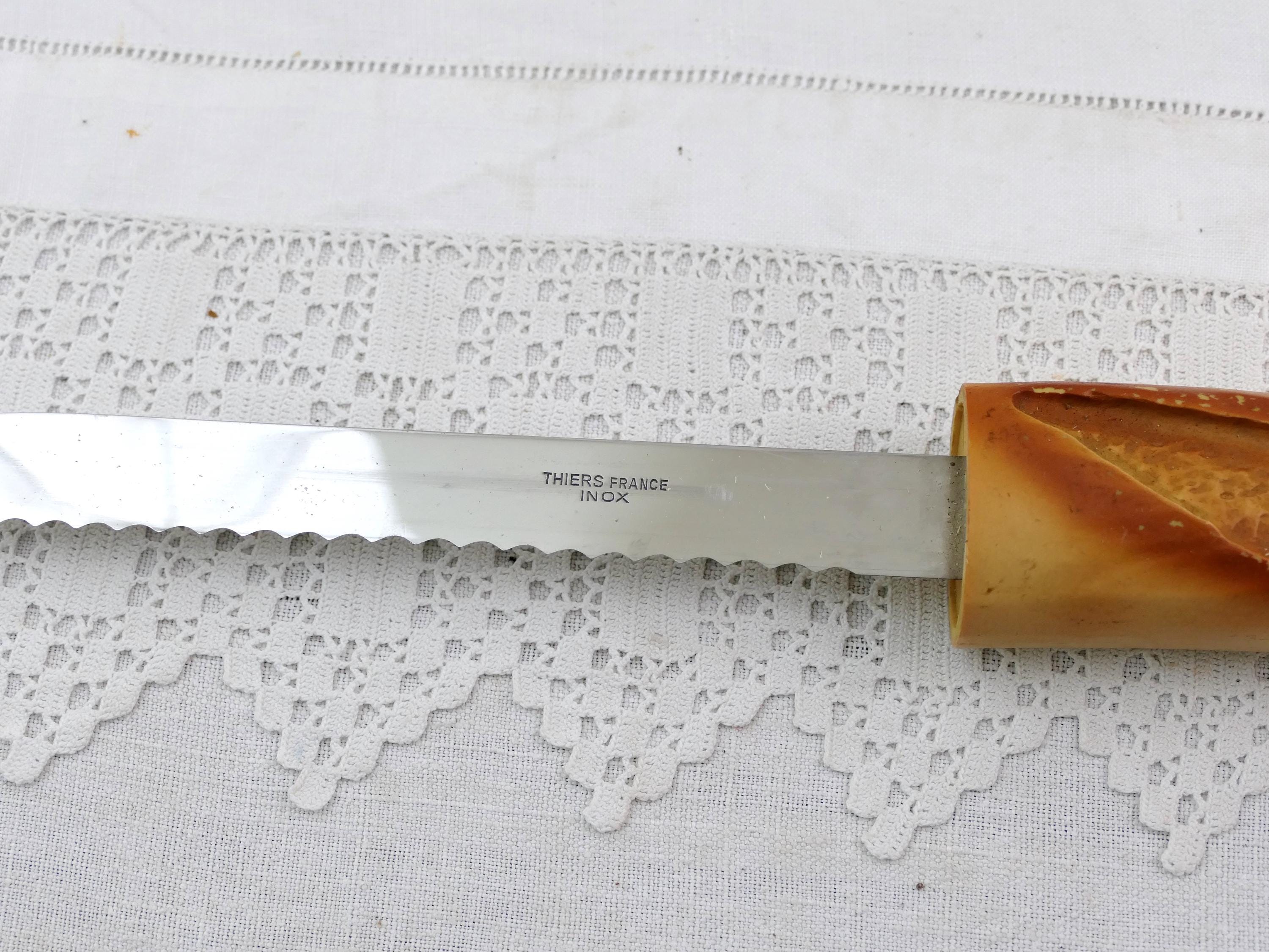 Vintage French bread knife shaped as a baguette loaf. Made in France of resin composite and stainless steel. Ca 1980s- 2000s.