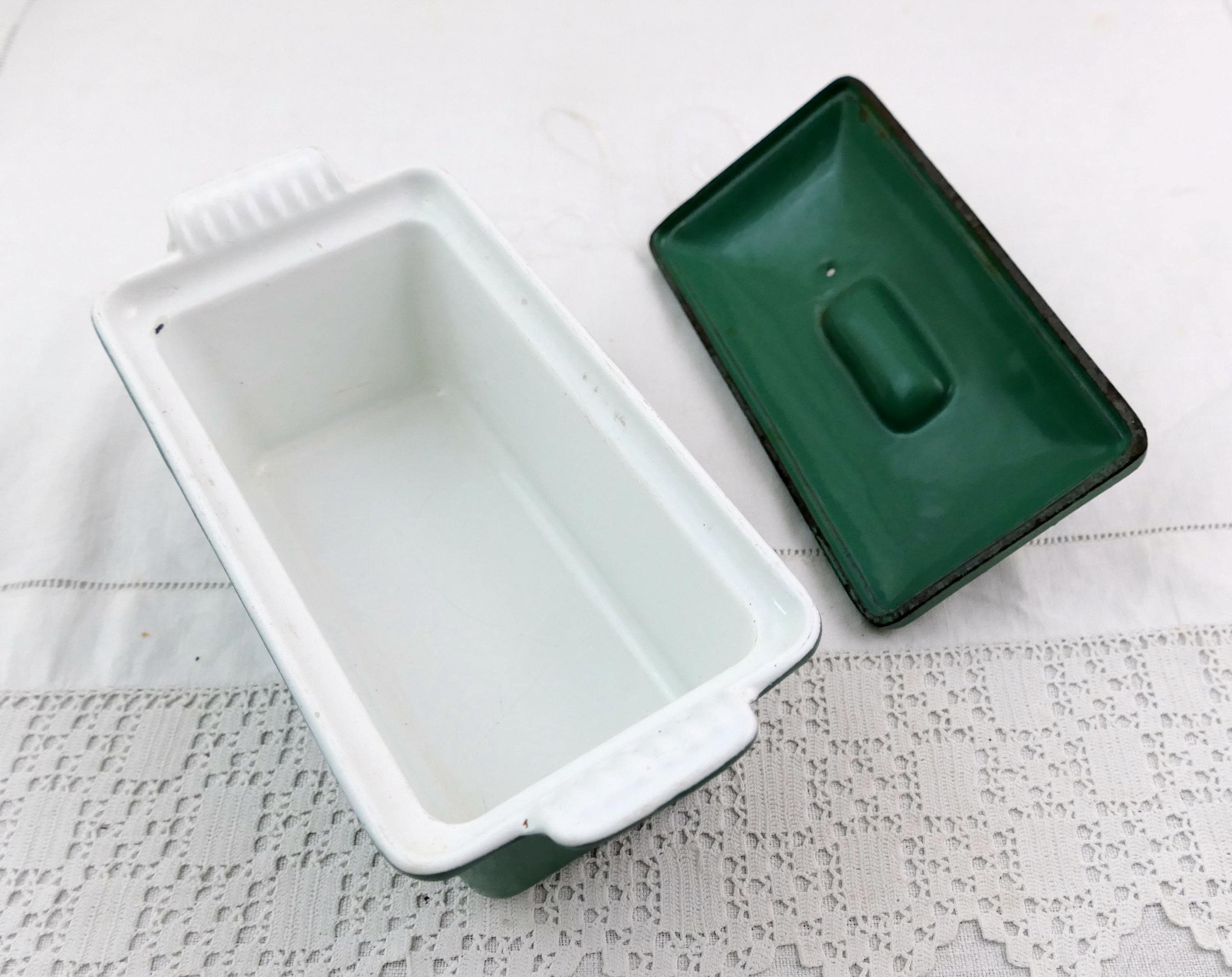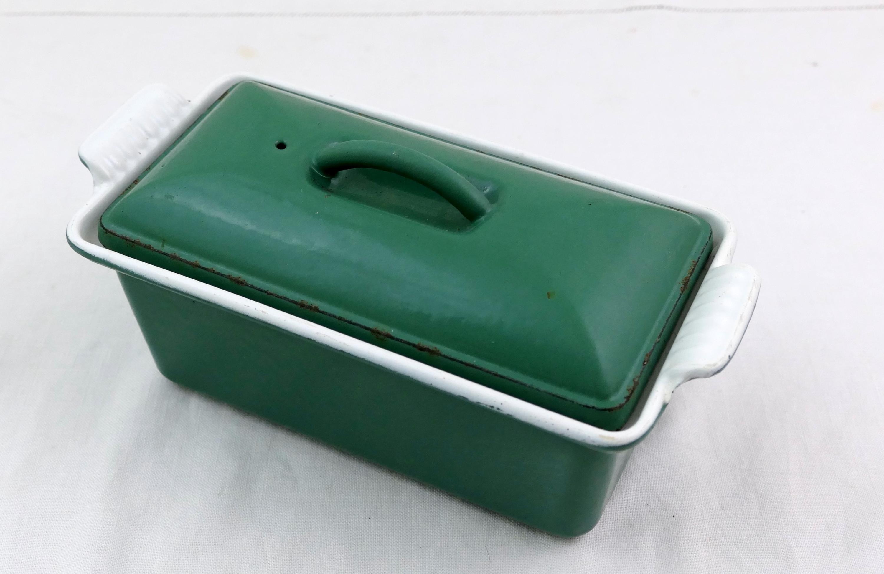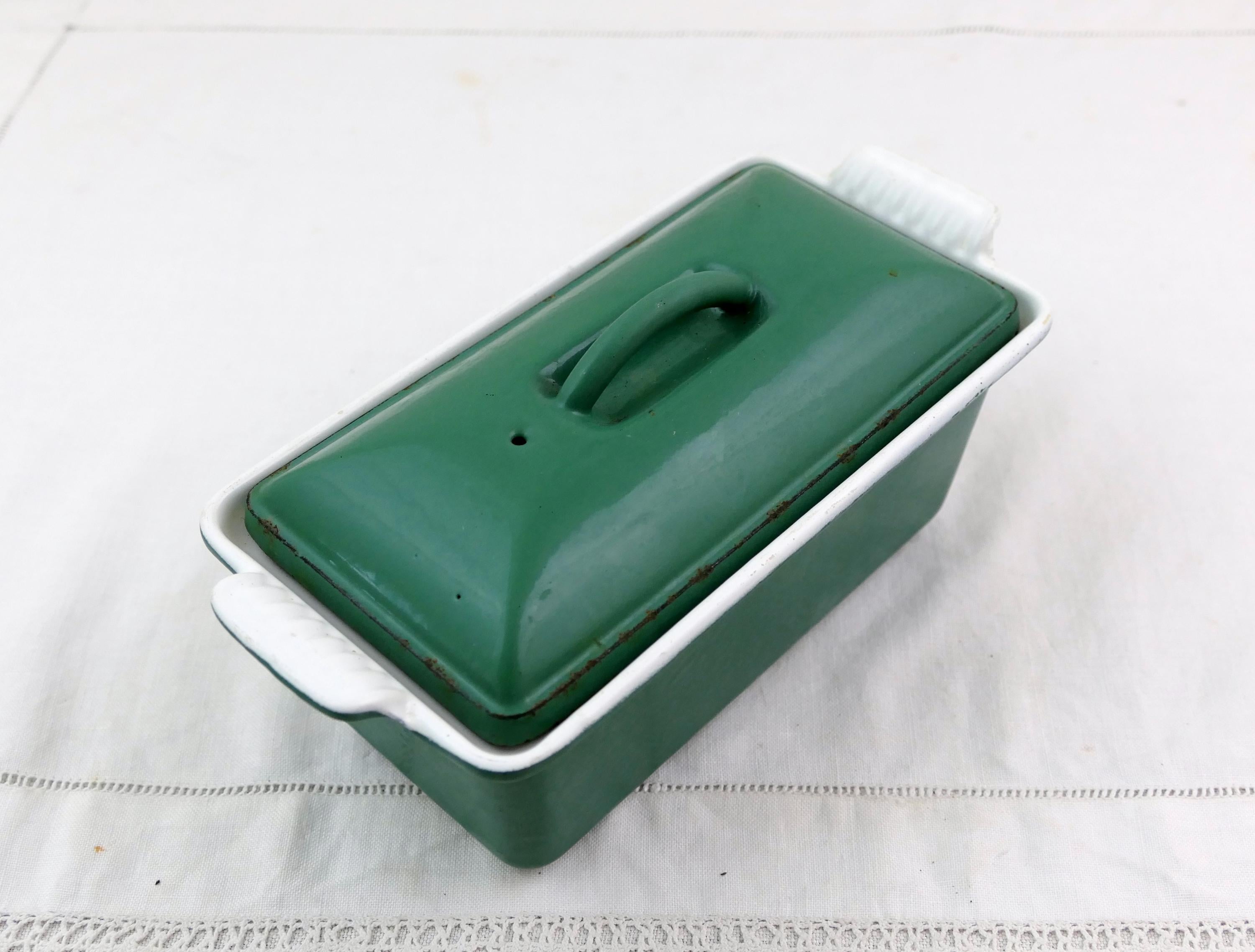 Vintage French rectangular Le Creuset pâté terrine in green and white. Made of enameled cast iron. Ca late 1900s.