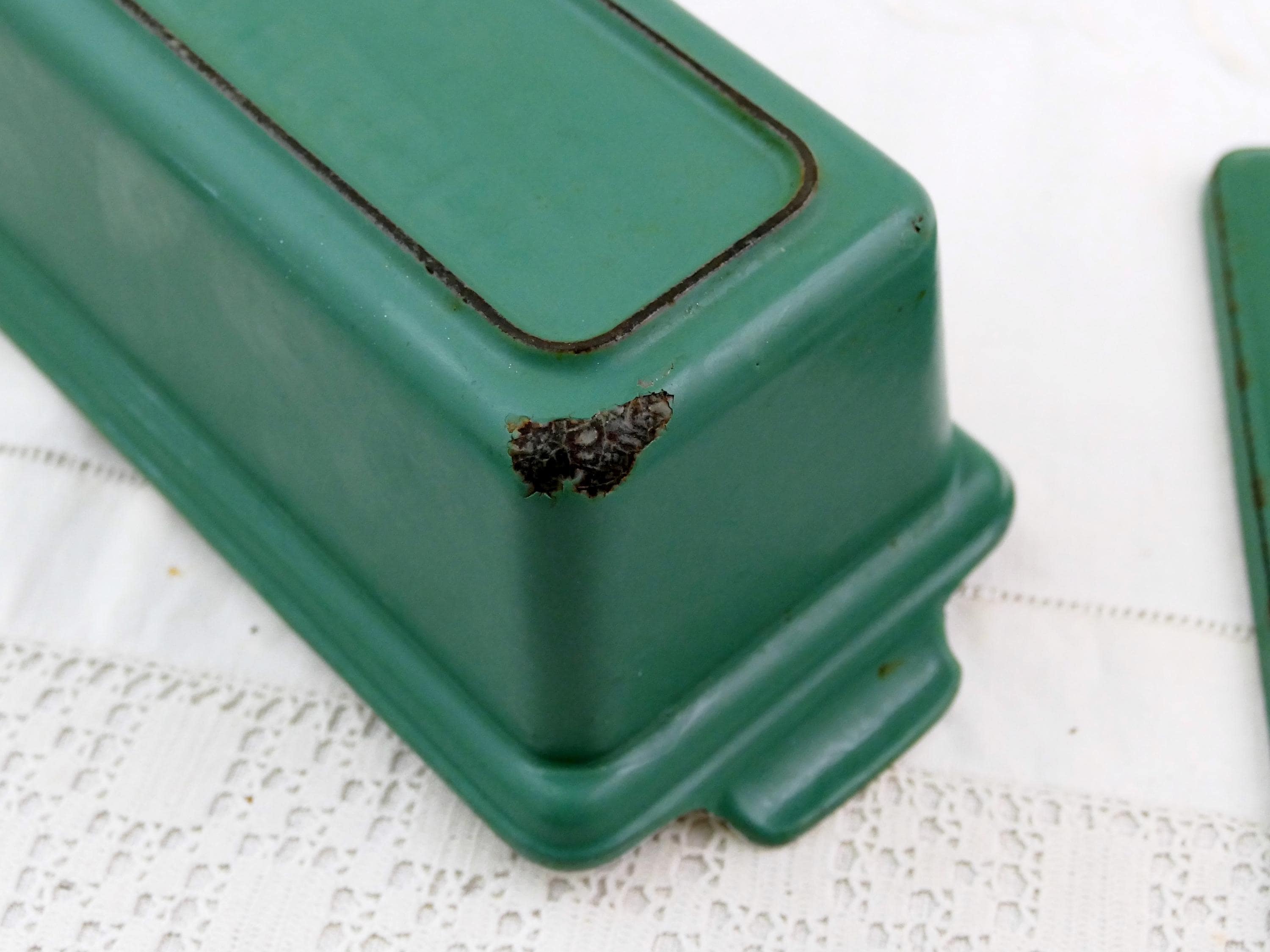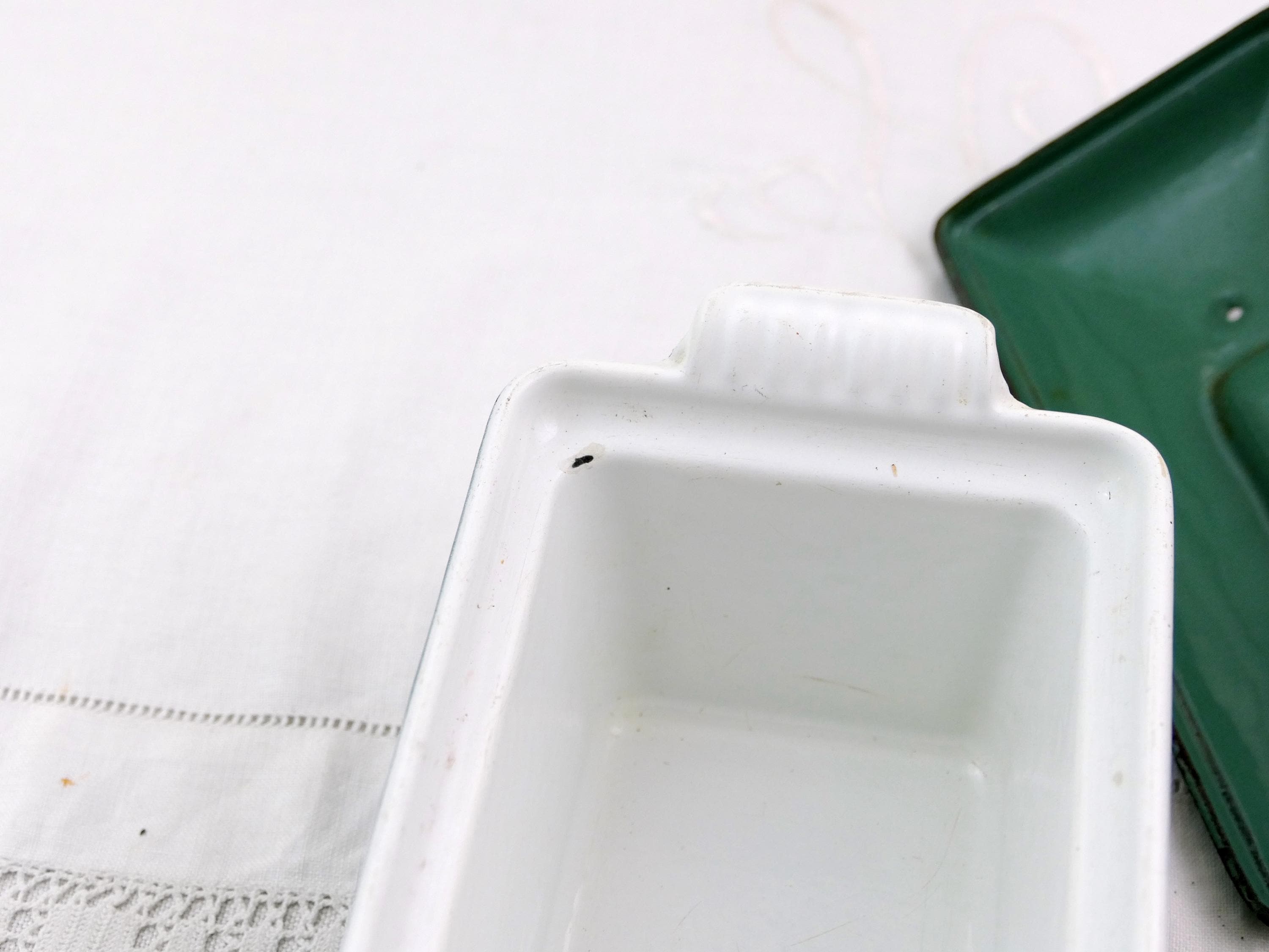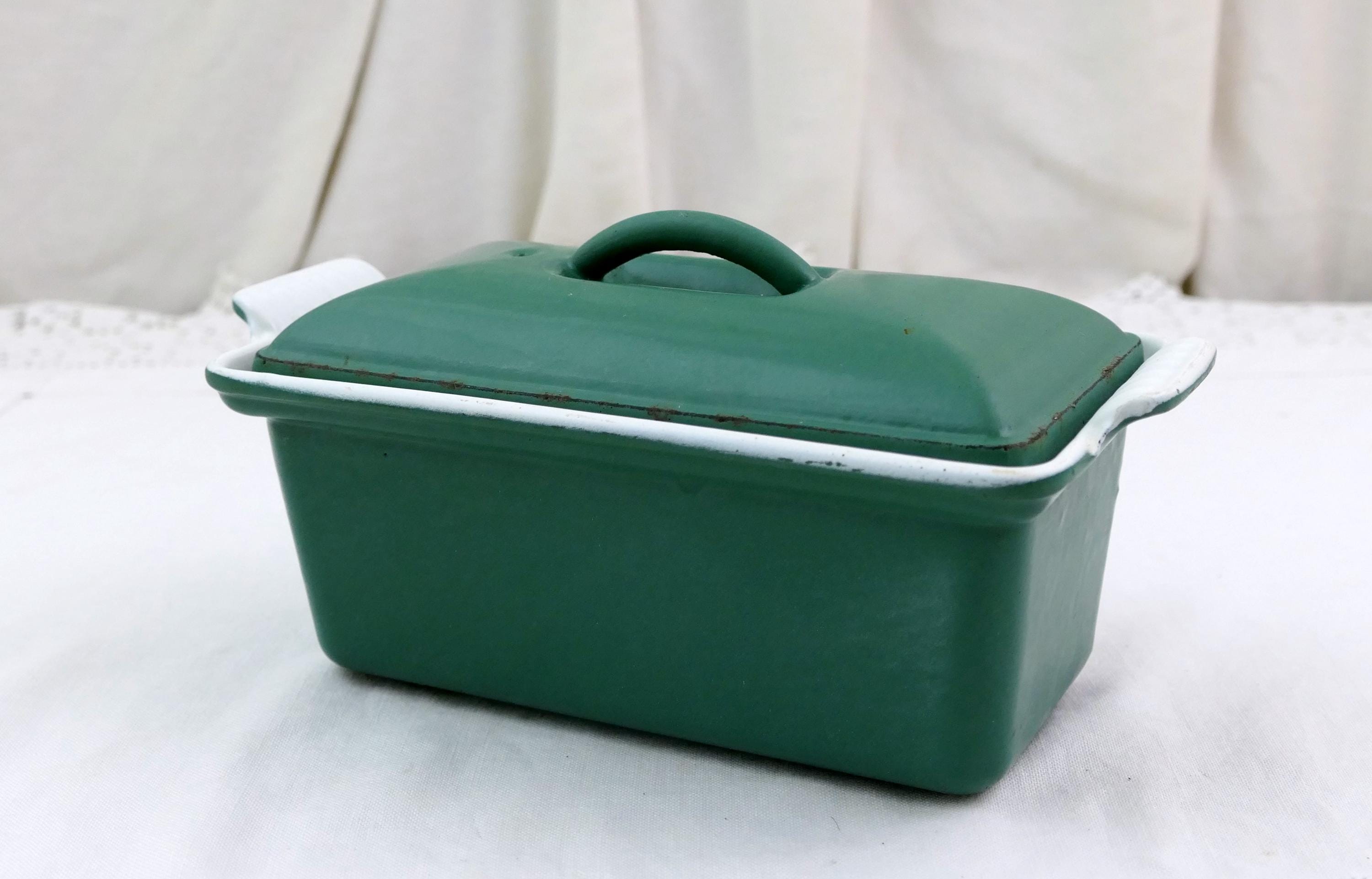 Vintage French rectangular Le Creuset pâté terrine in green and white. Made of enameled cast iron. Ca late 1900s.