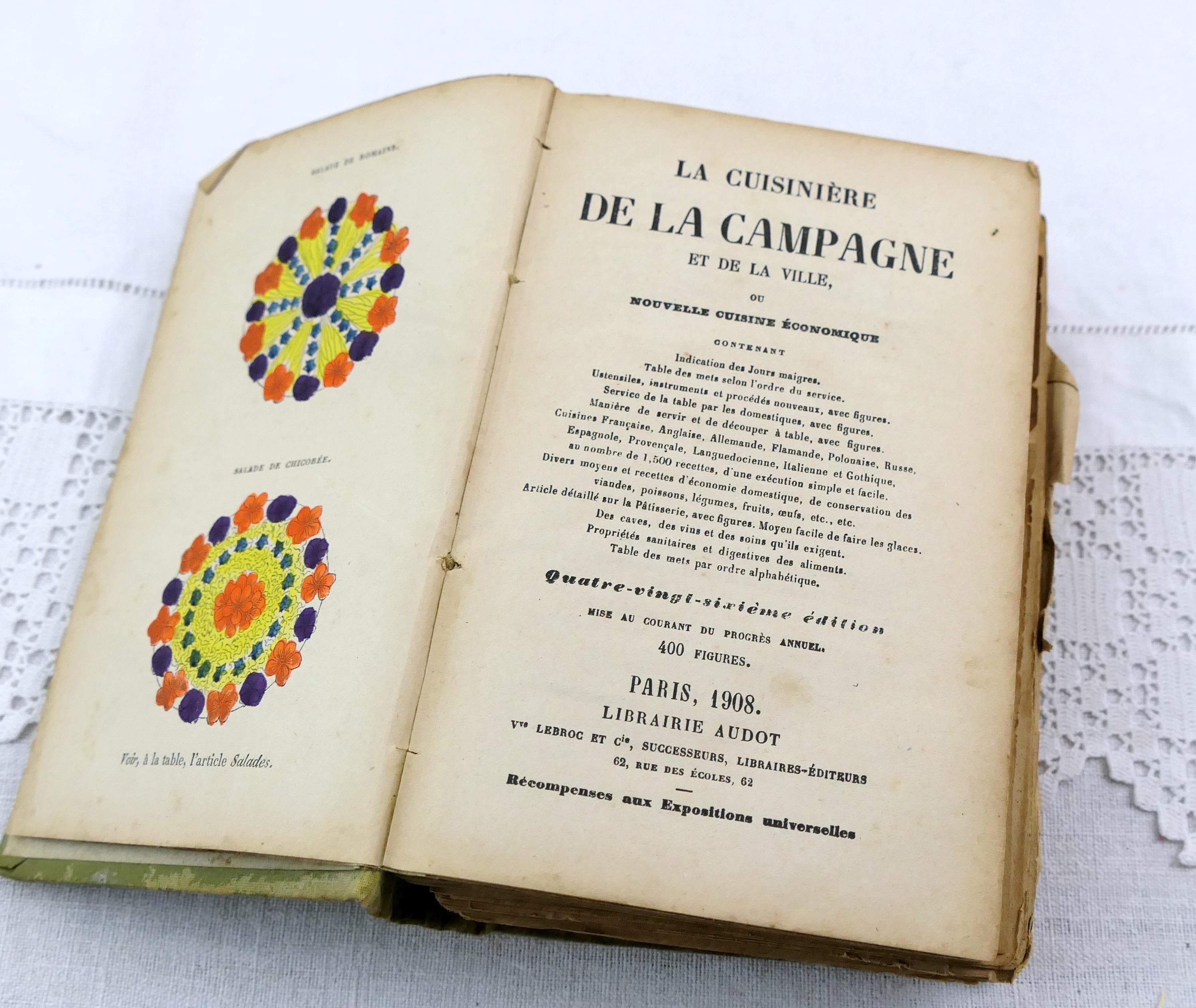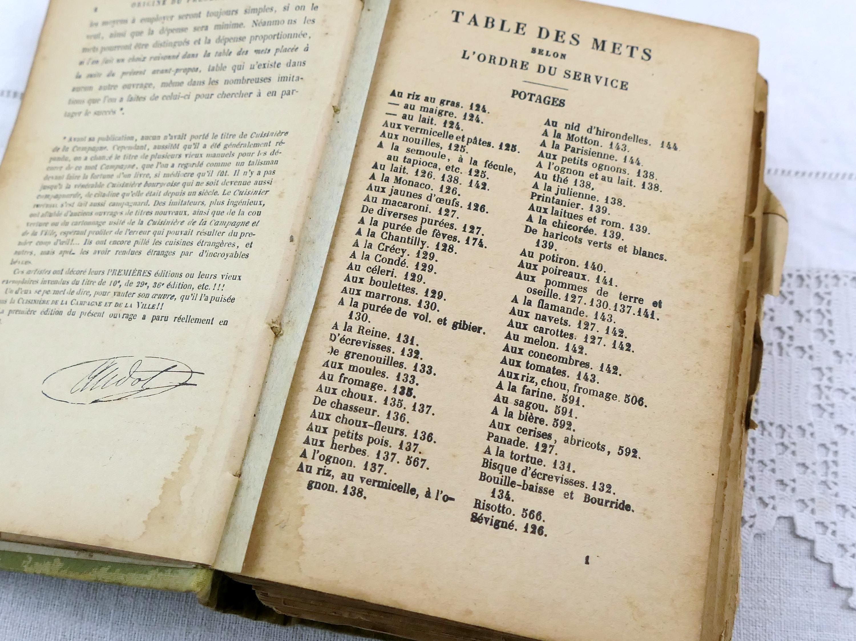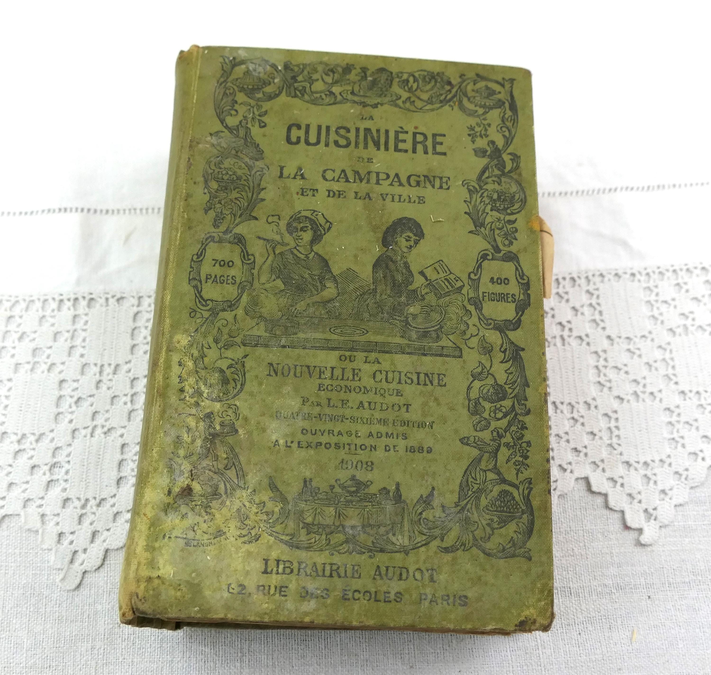 Antique French early 1900s cookbook, La Cuisiniere de la campagne et de la ville. 717 pages of recipes, illustrations, menu planers and a few adverts at the end of the book. Ca 1908s.