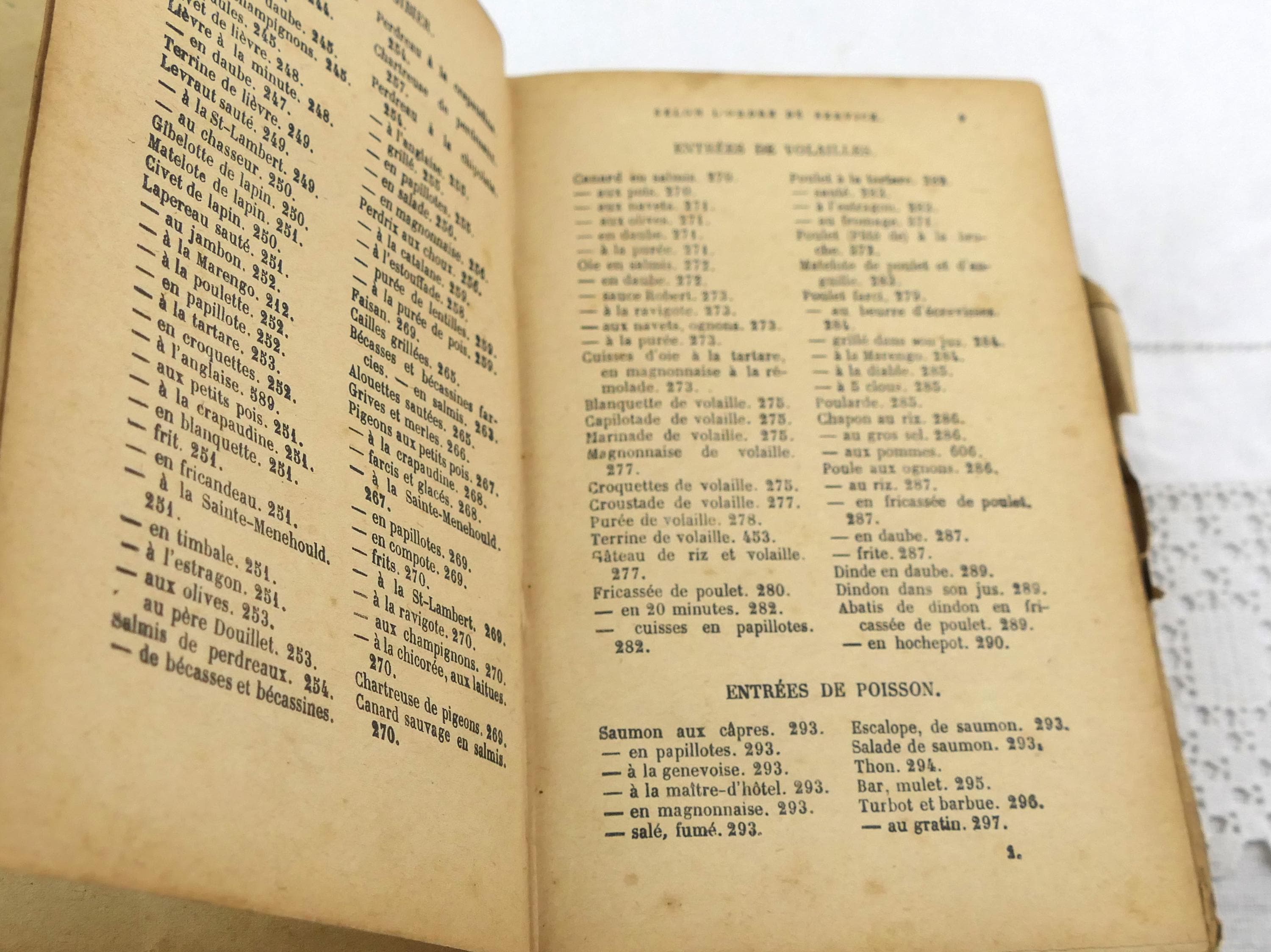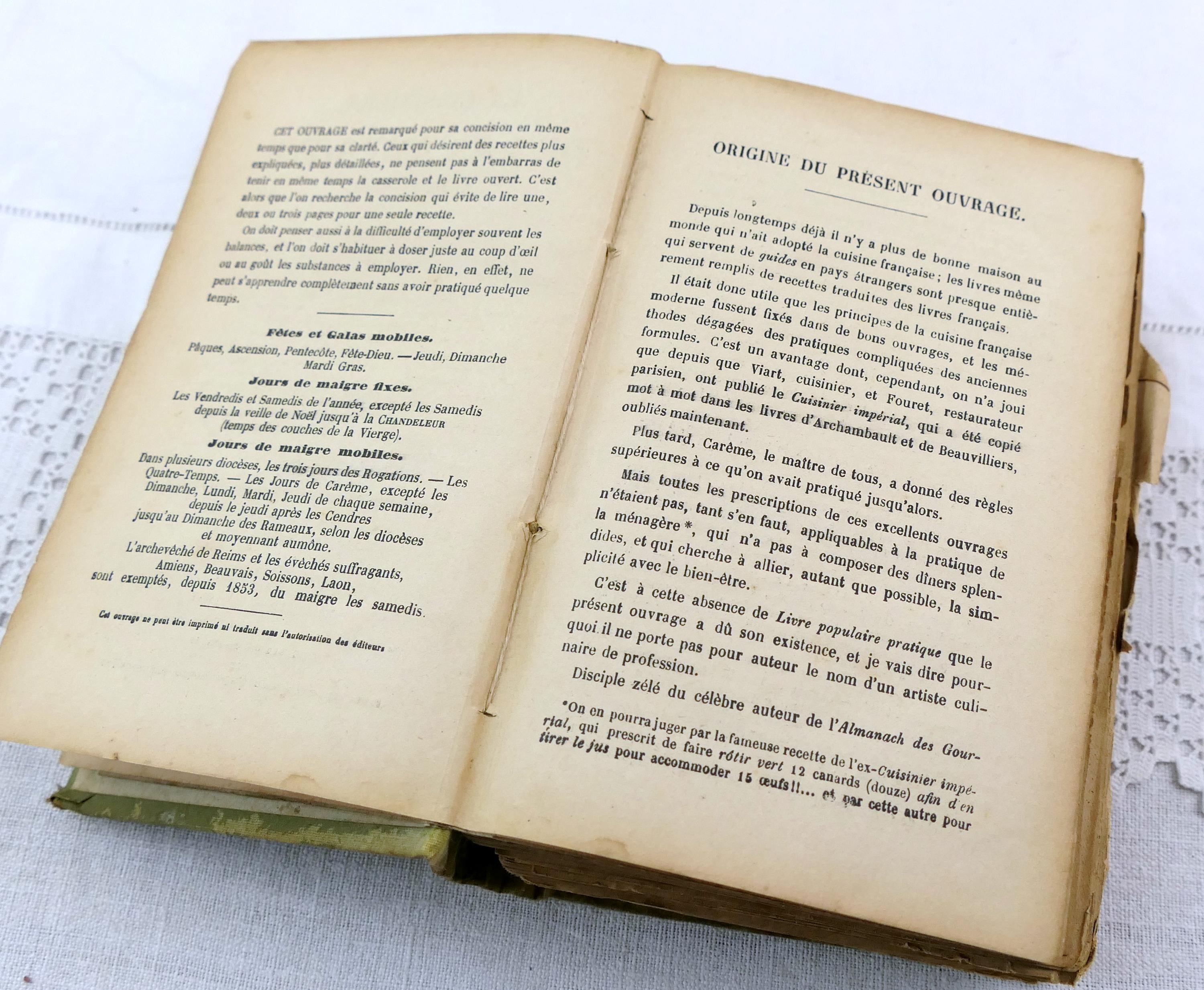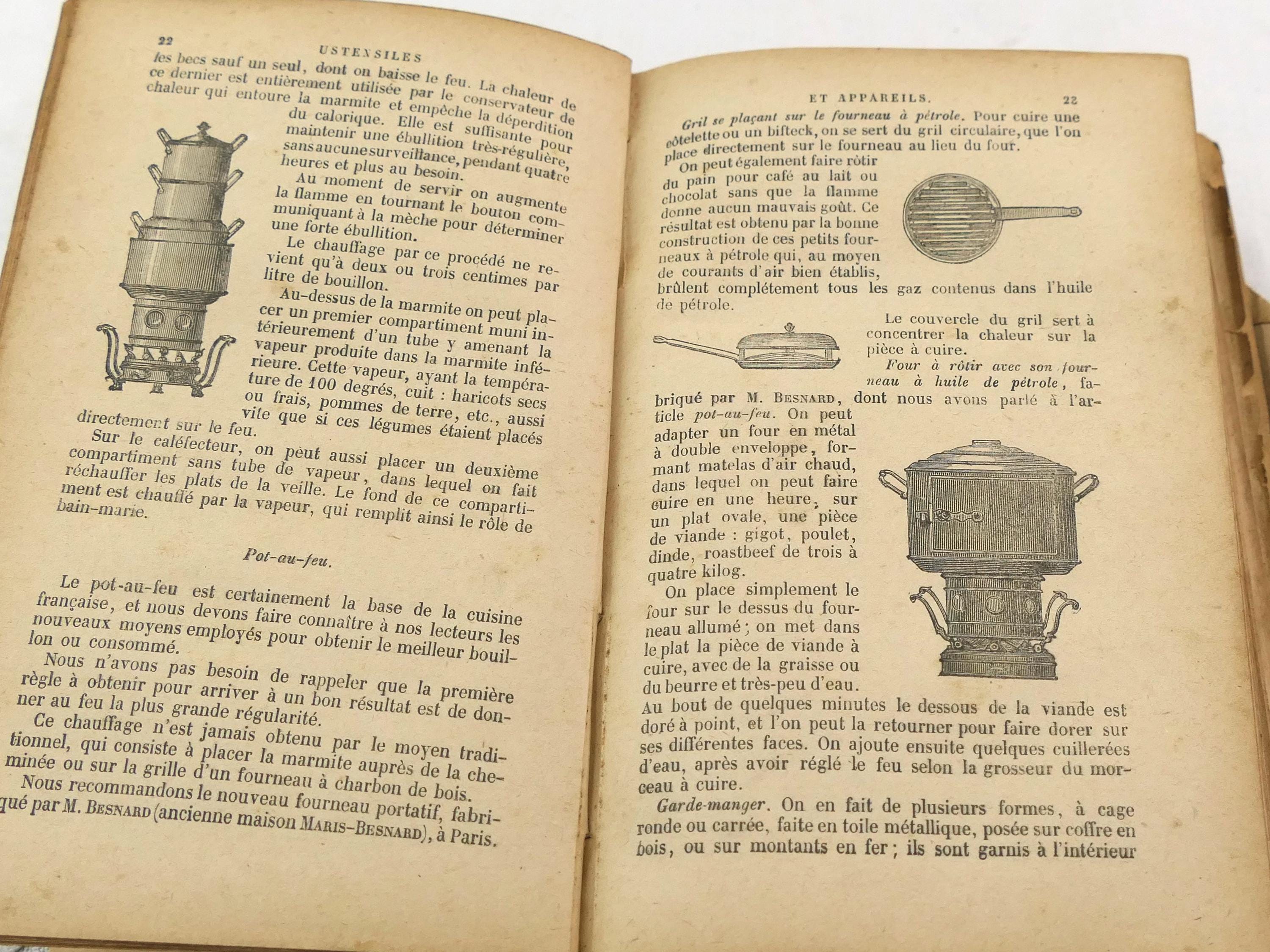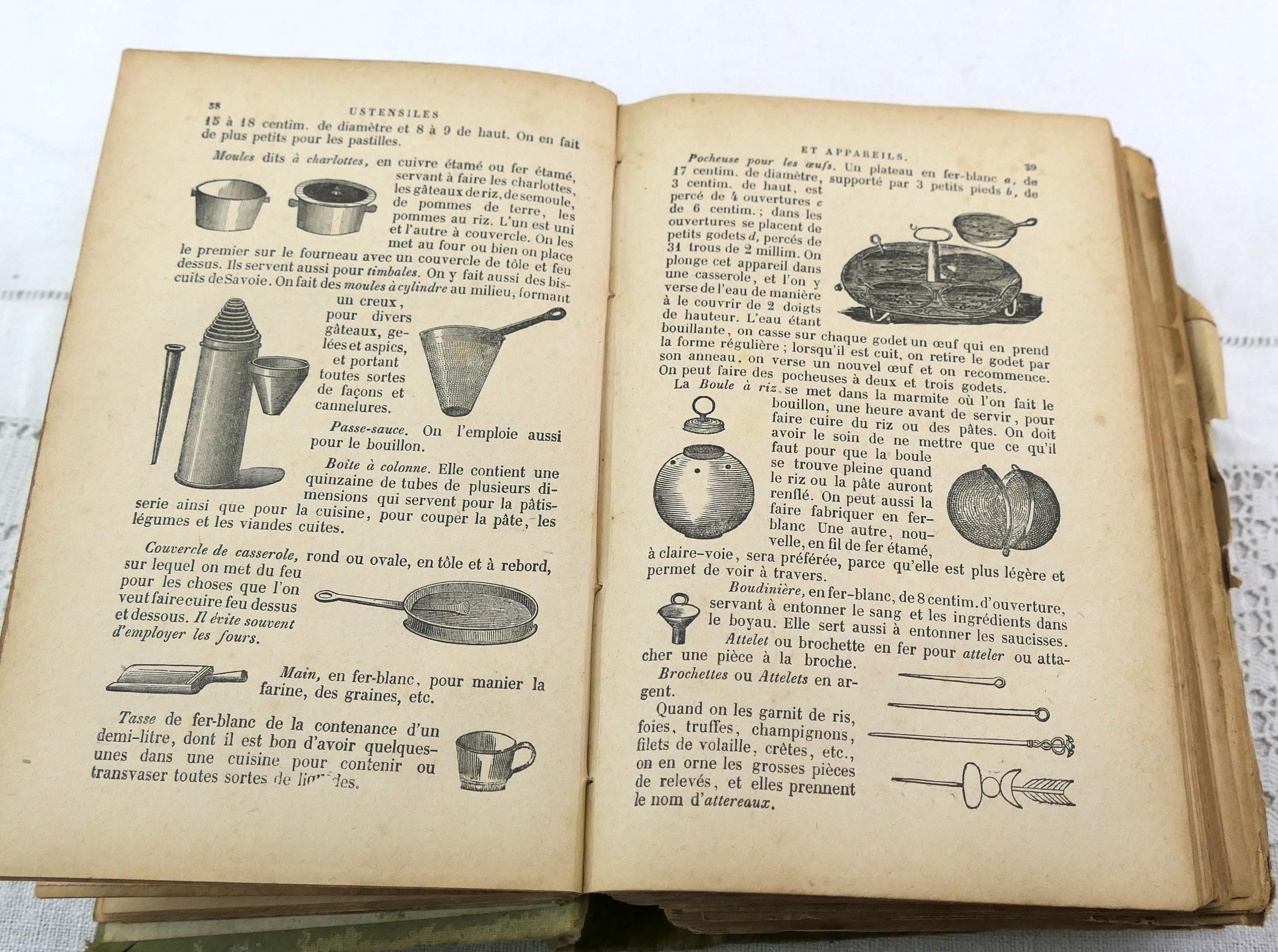 Antique French early 1900s cookbook, La Cuisiniere de la campagne et de la ville. 717 pages of recipes, illustrations, menu planers and a few adverts at the end of the book. Ca 1908s.