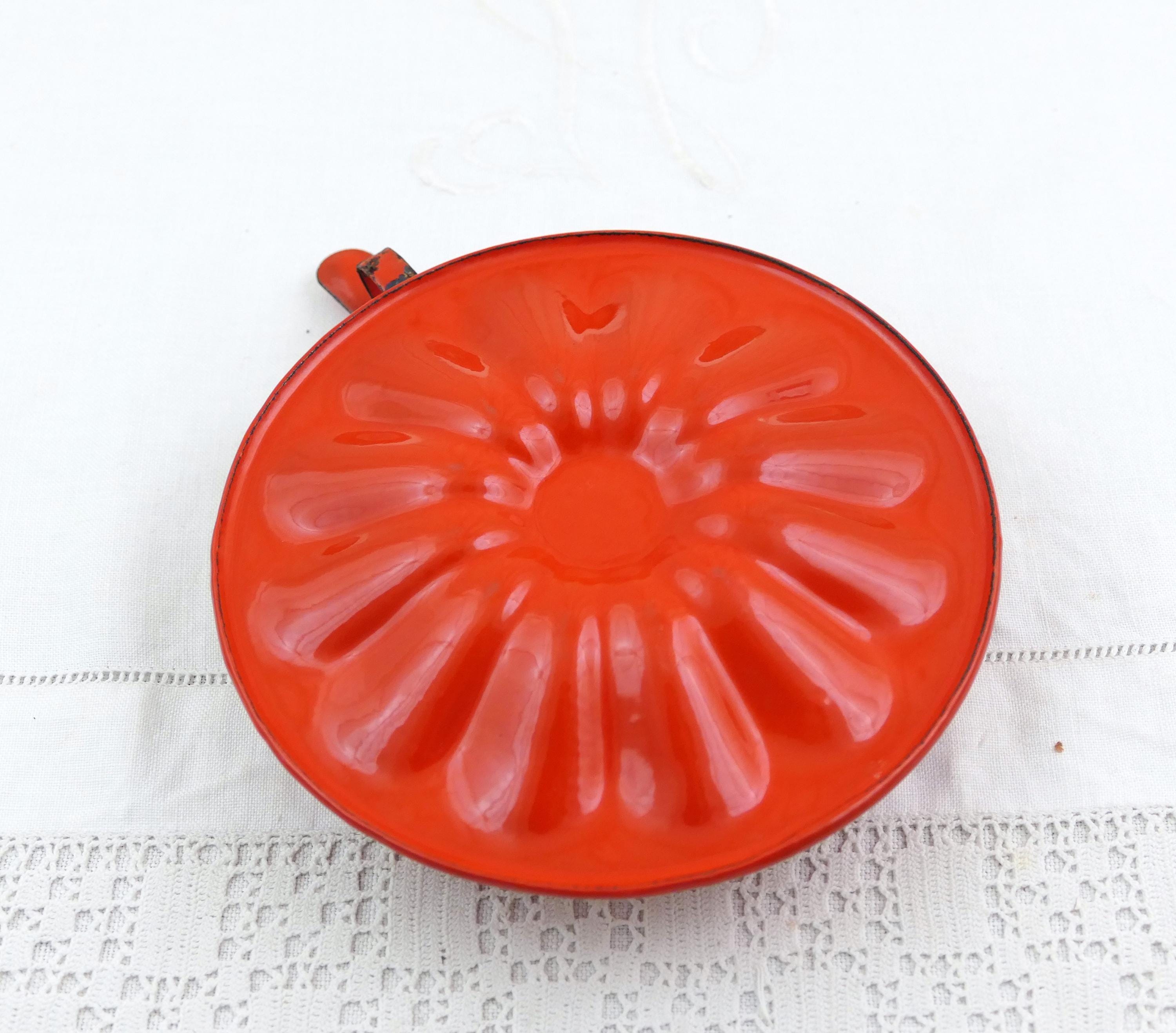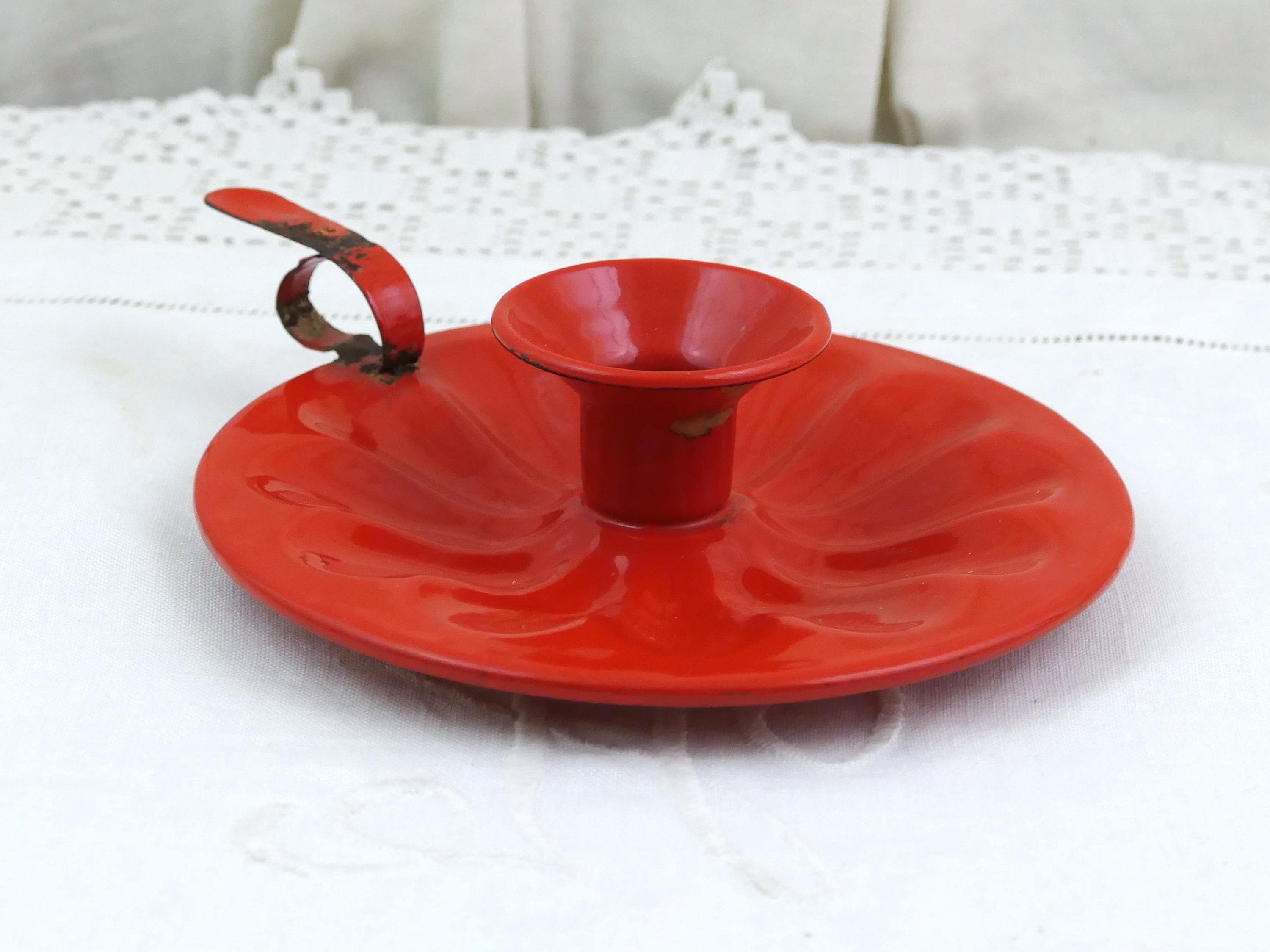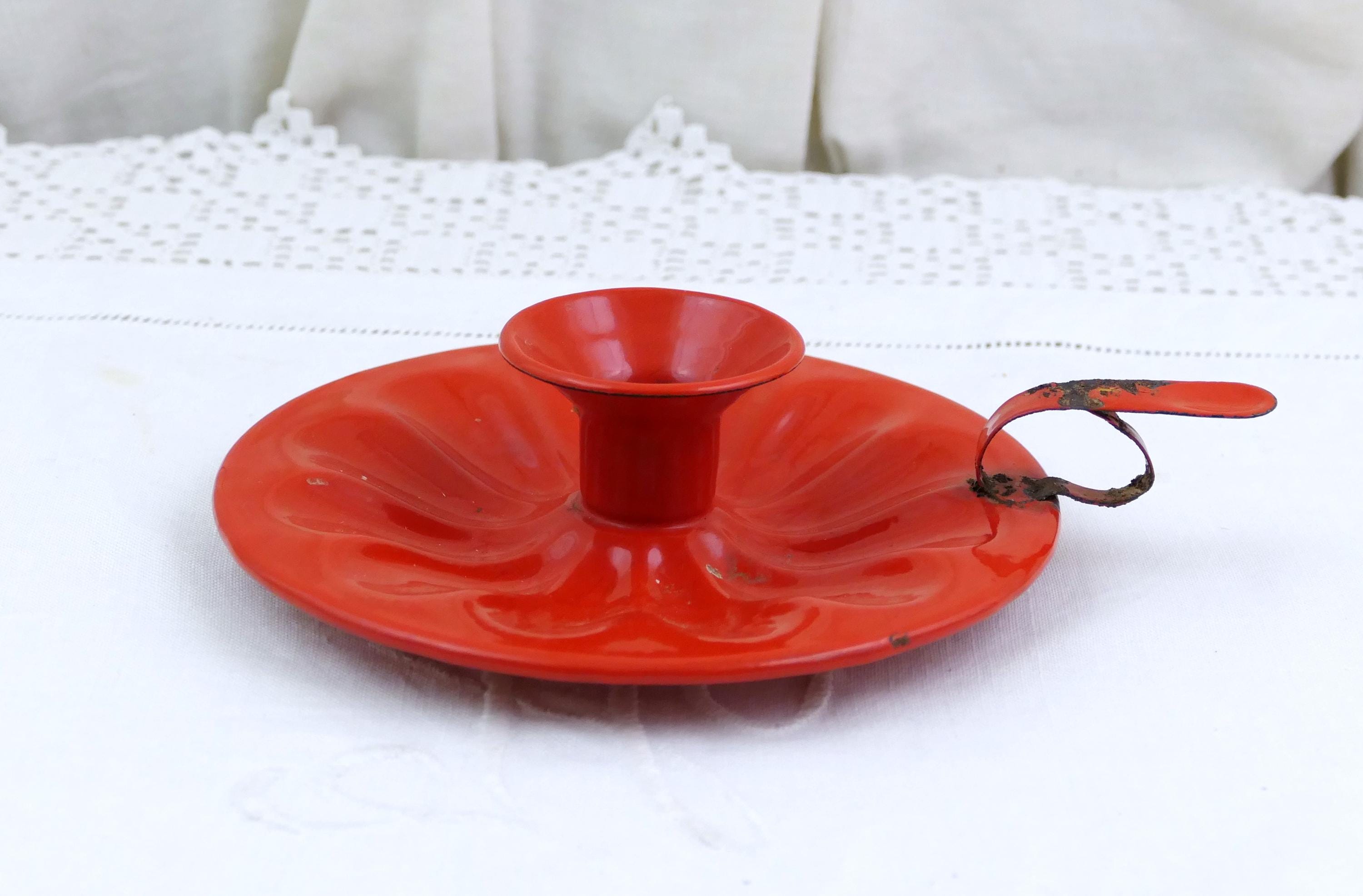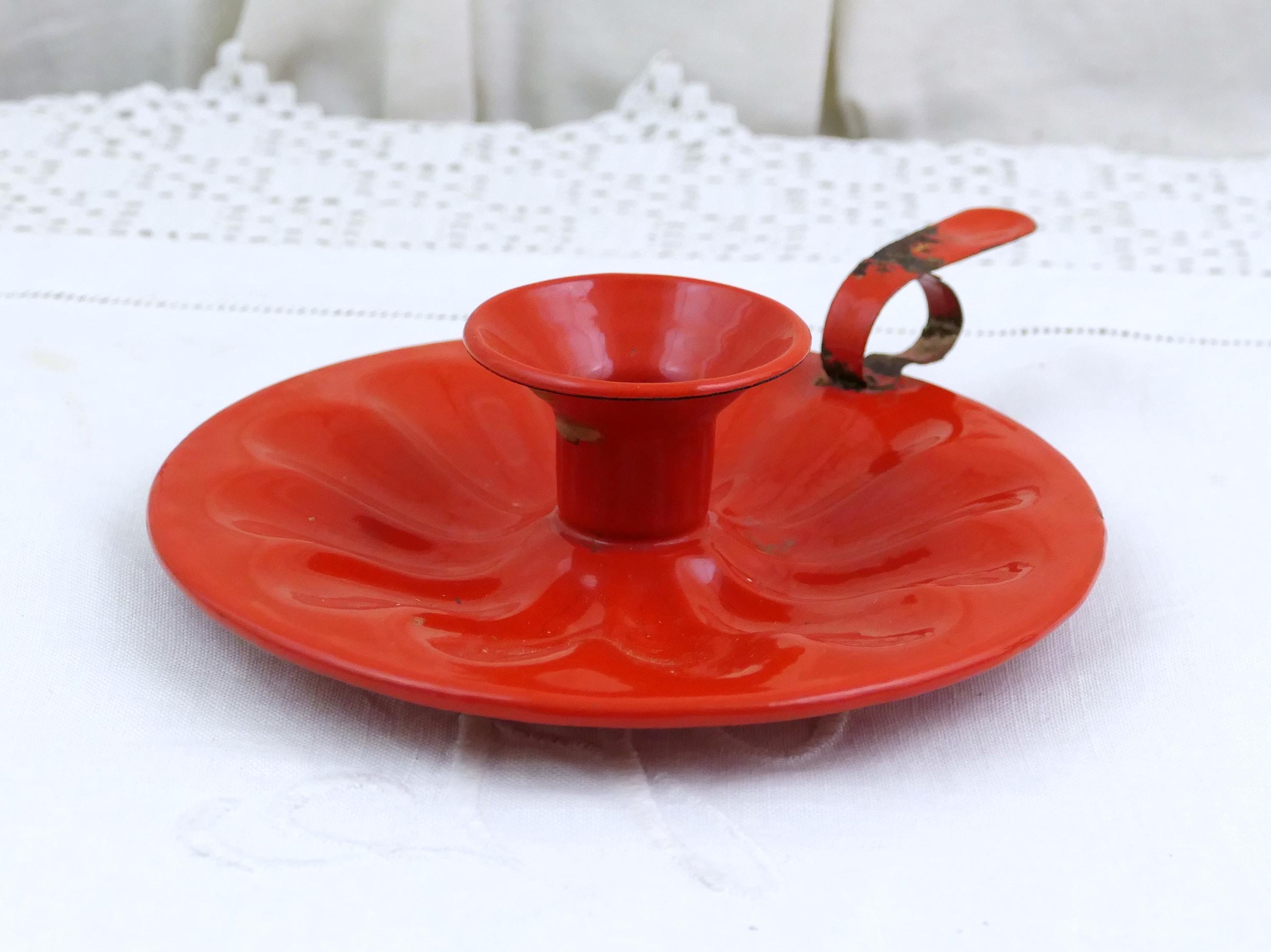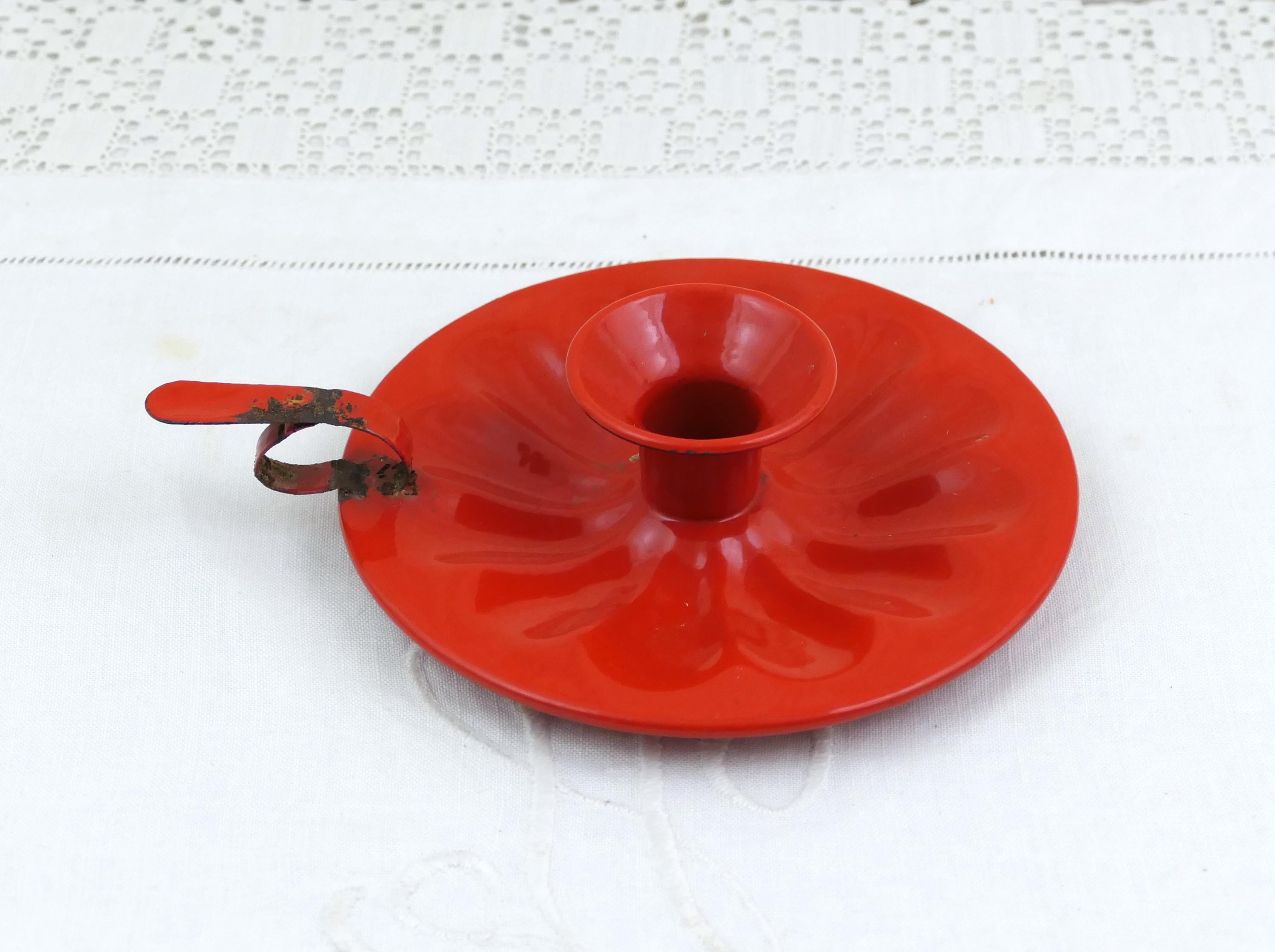 Antique French red enamelware bedchamber stick. Made of enameled metal. Ca 1800s.