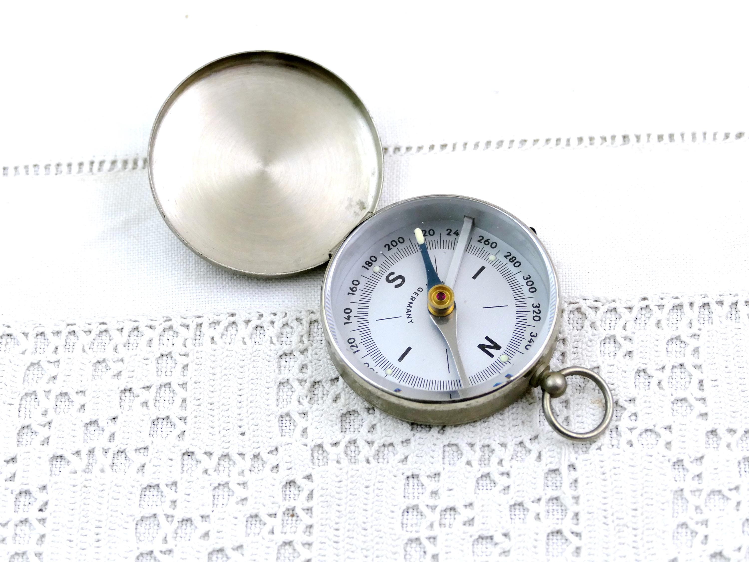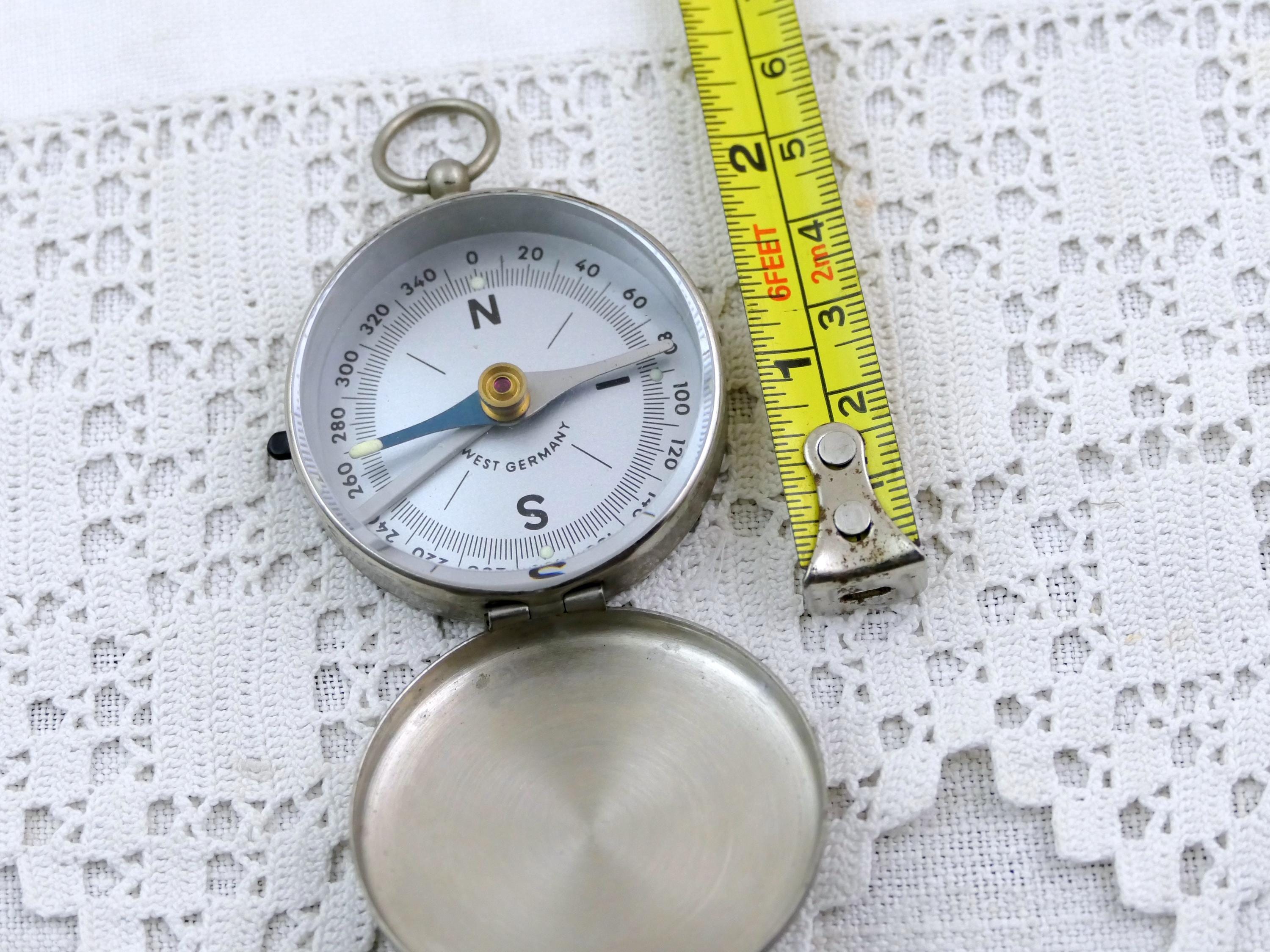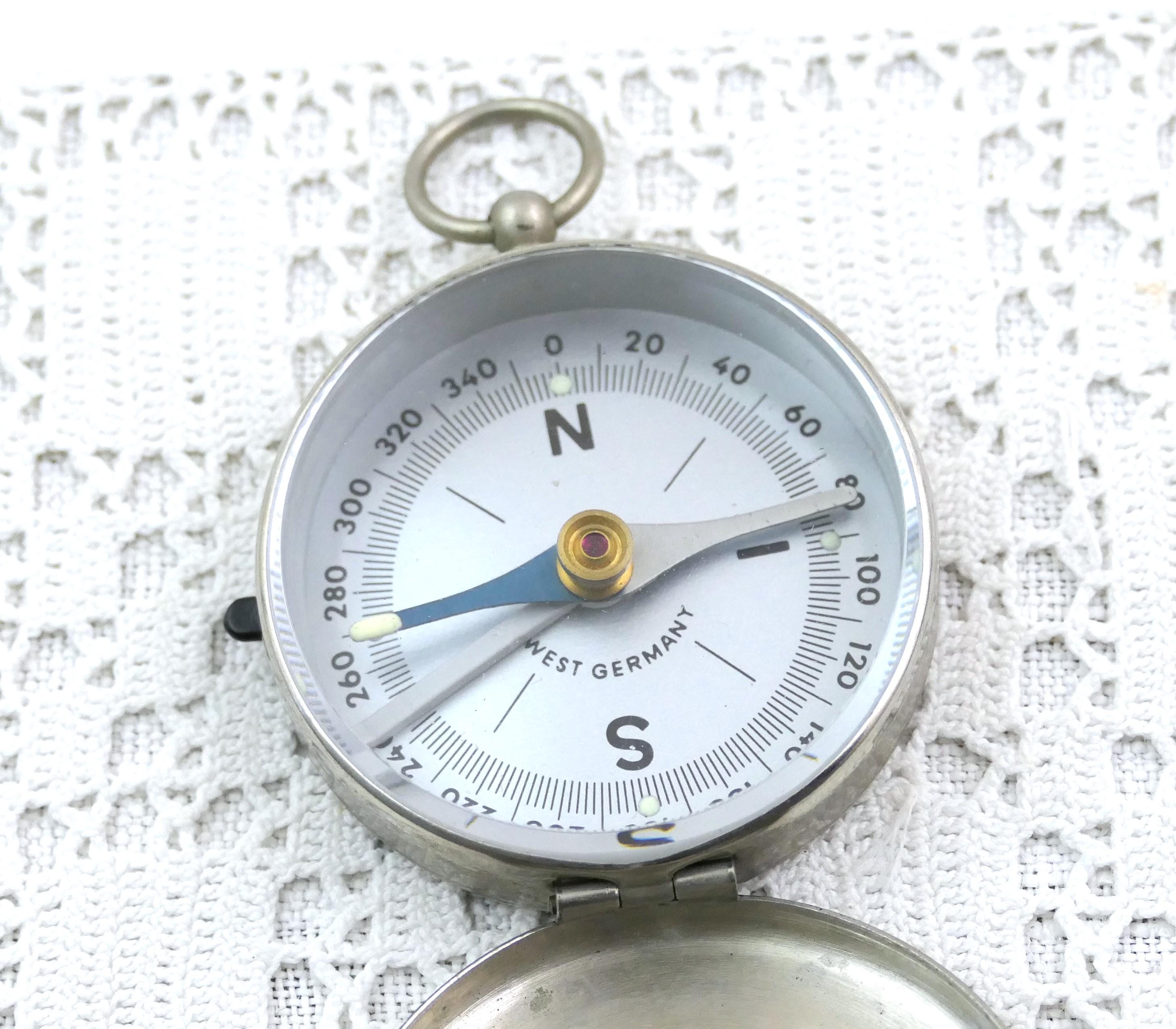 Vintage round dry magnetic portable compass. Made in West Germany of metal with Perspex. Glow in the dark spots. Ca mid 1900s.