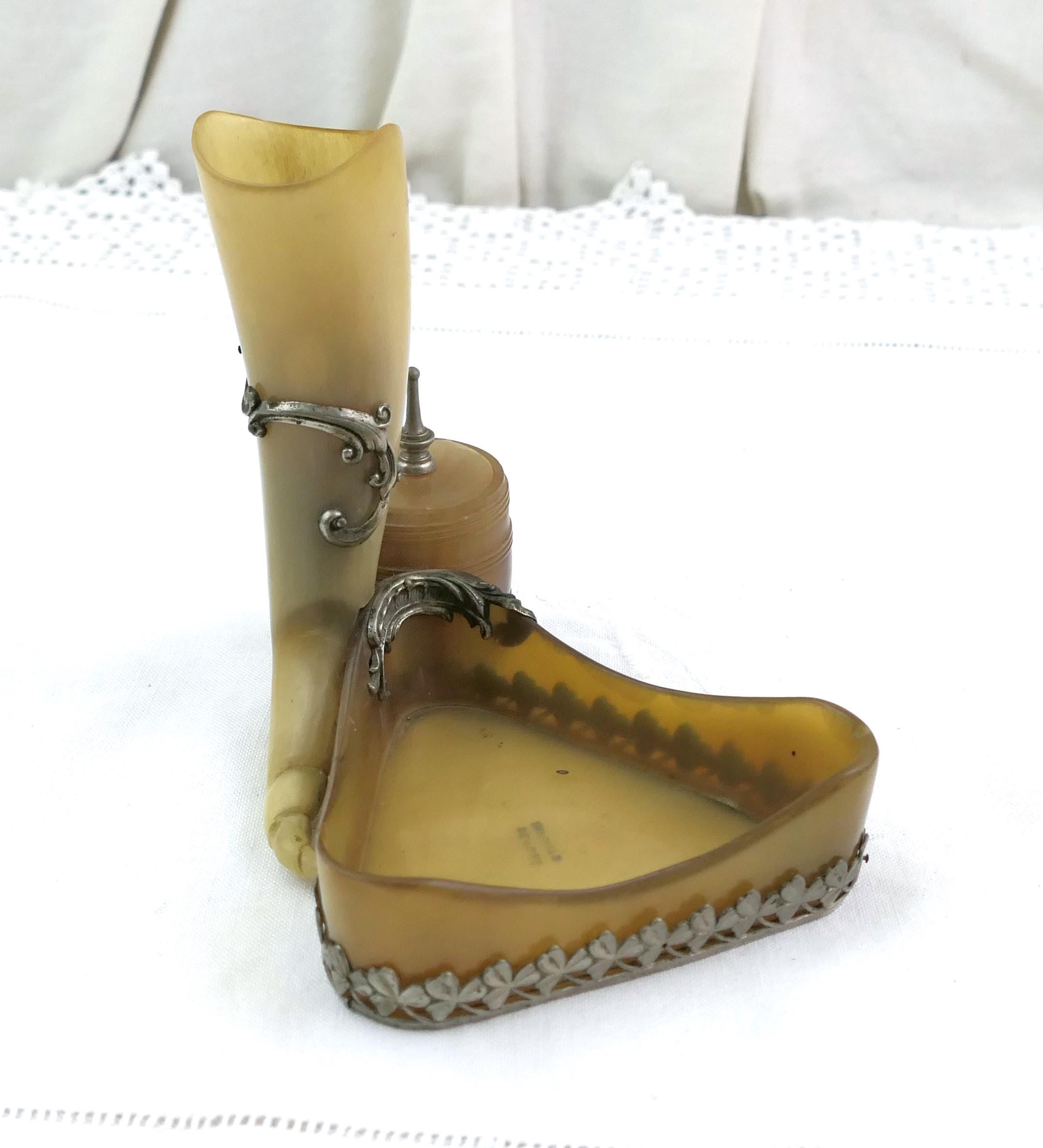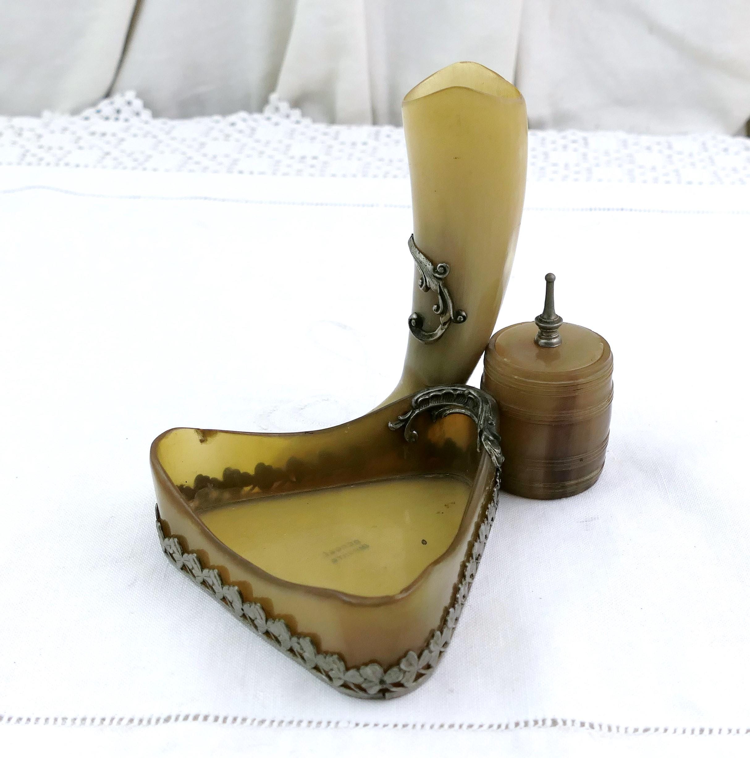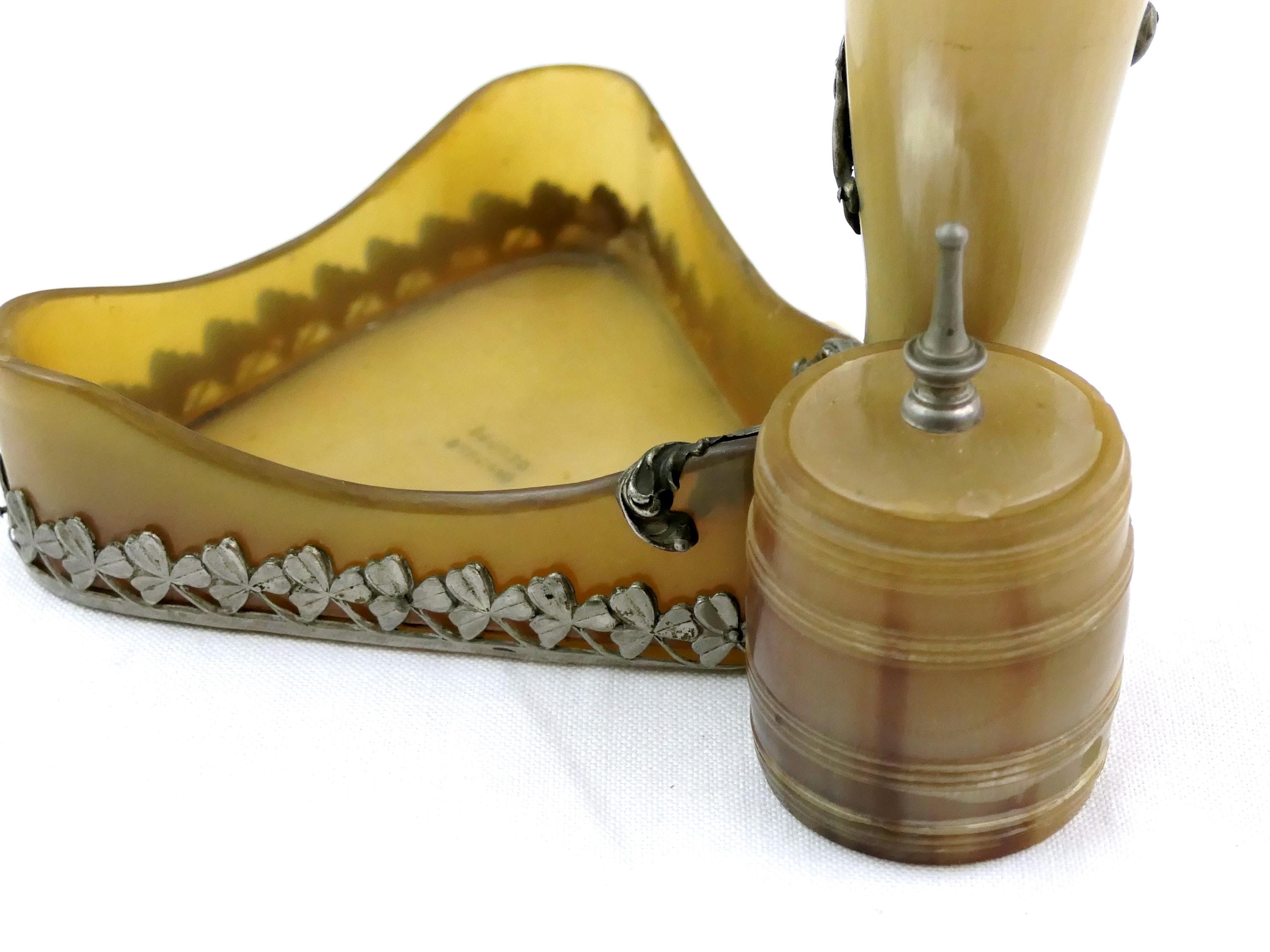 Antique desk tidy / condiment set holder. Made of horn with silver plated metal ornamentation. Ca 1800s.