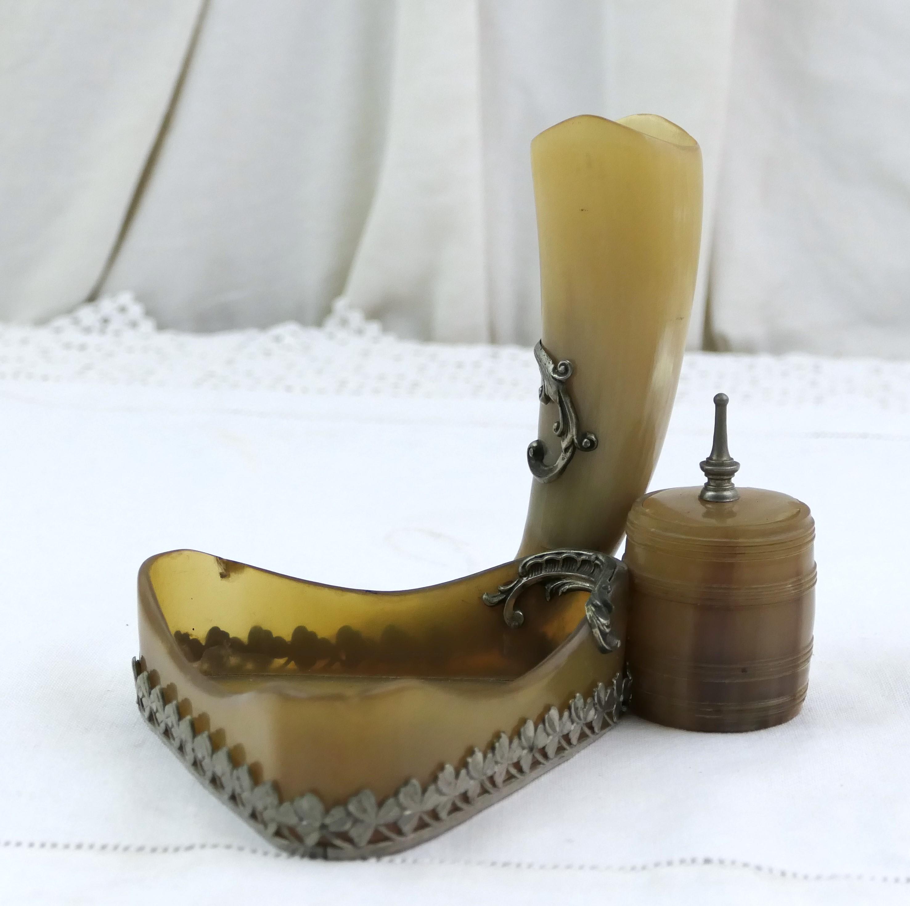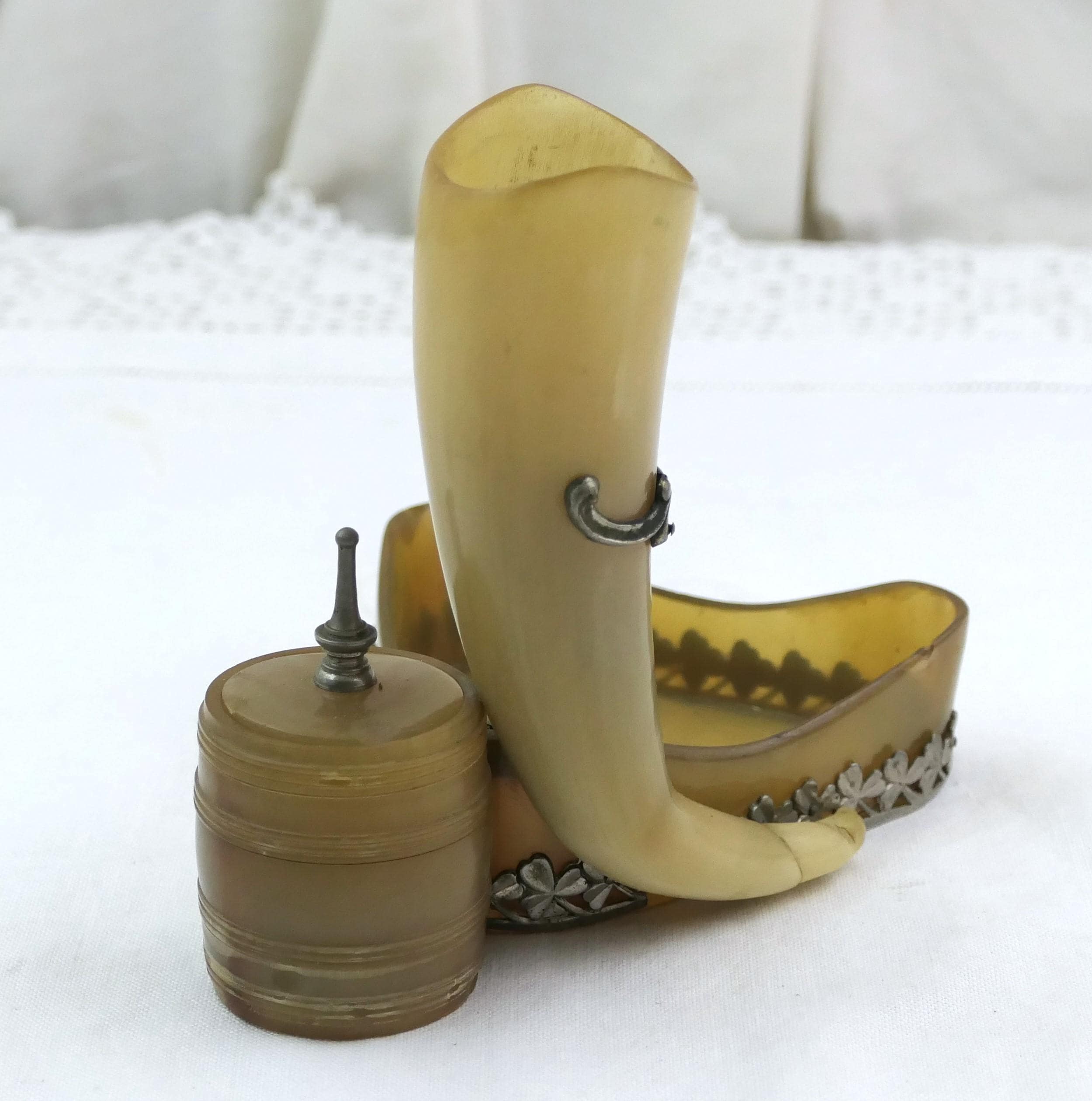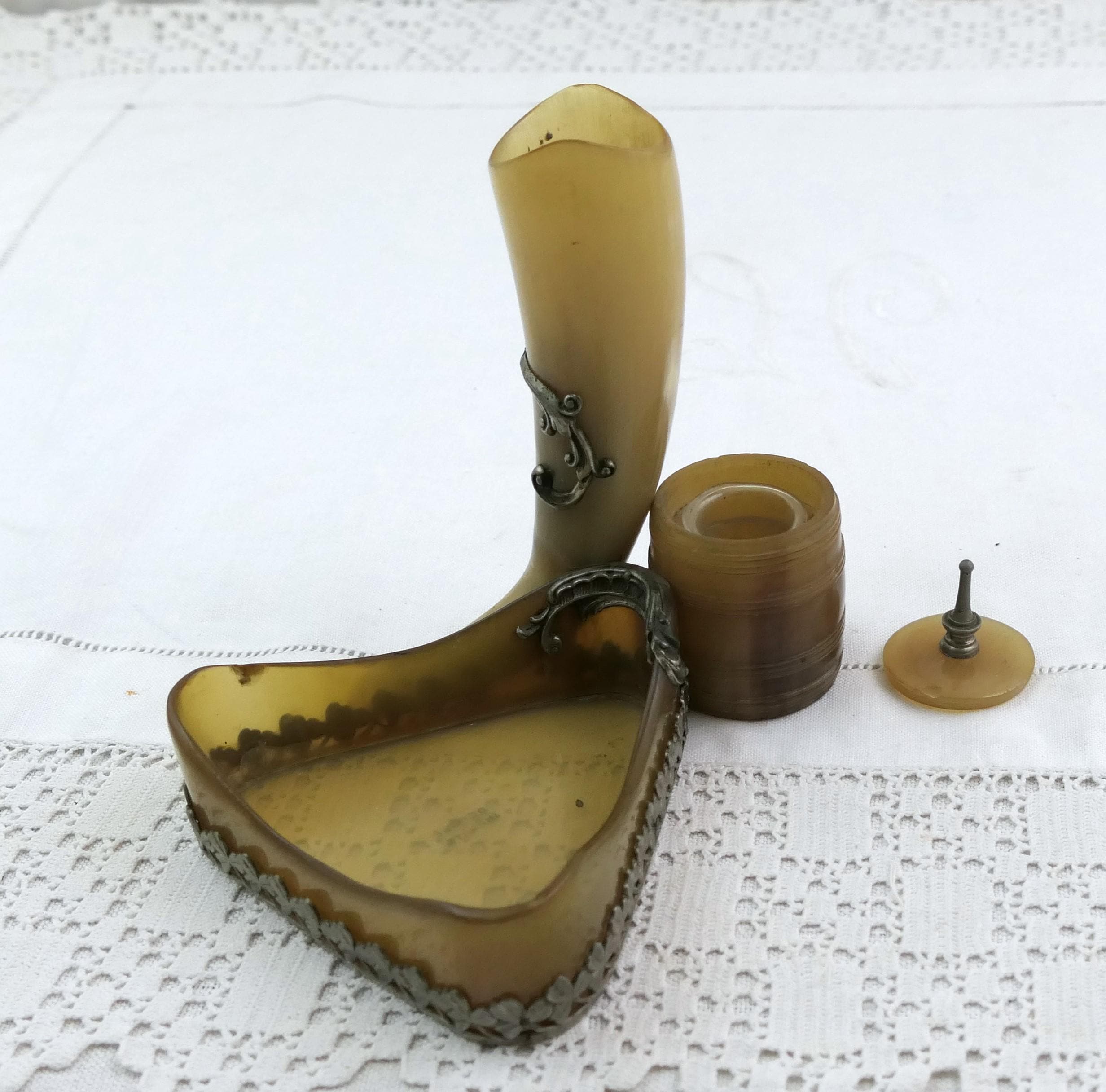 Antique desk tidy / condiment set holder. Made of horn with silver plated metal ornamentation. Ca 1800s.