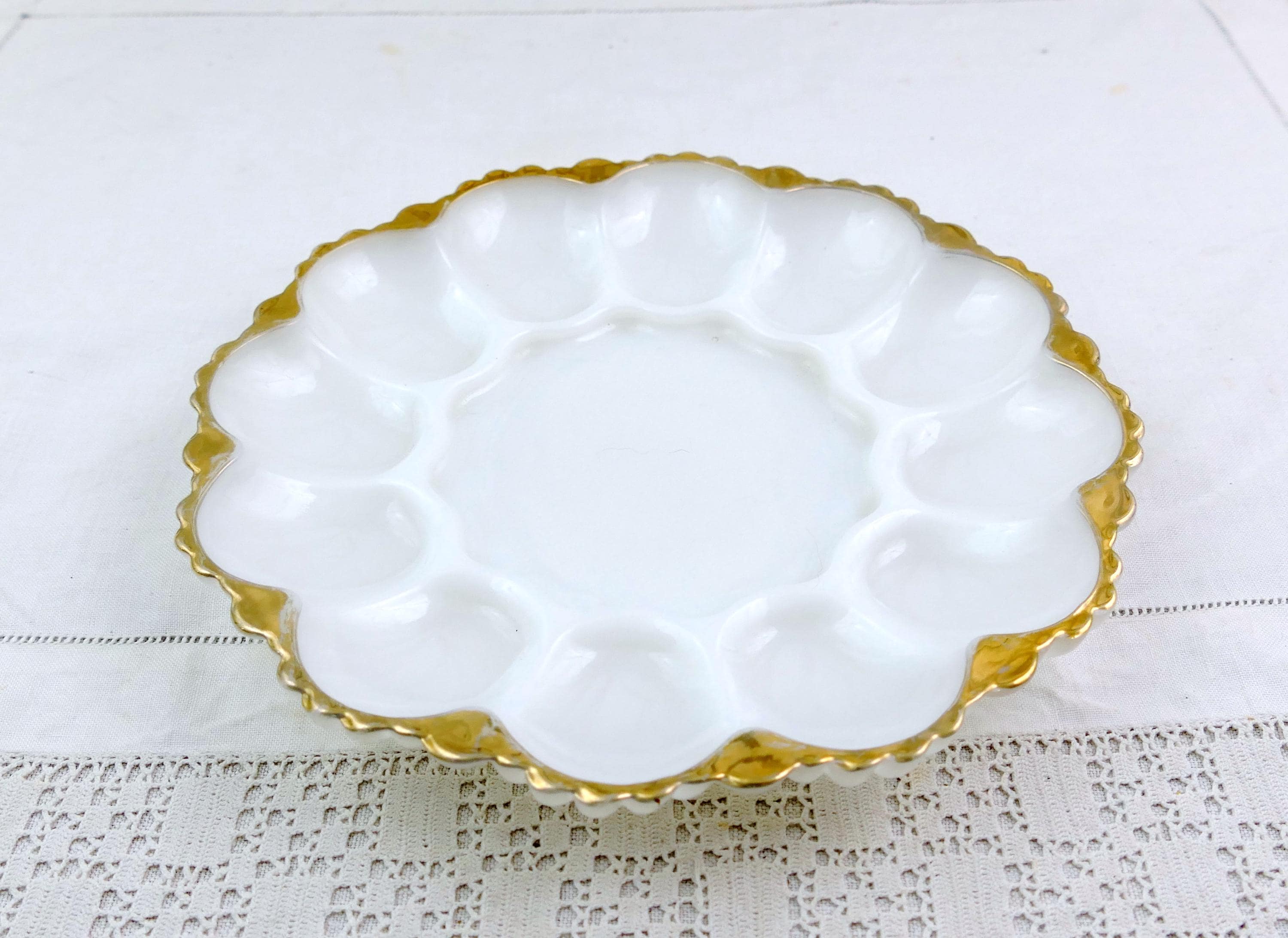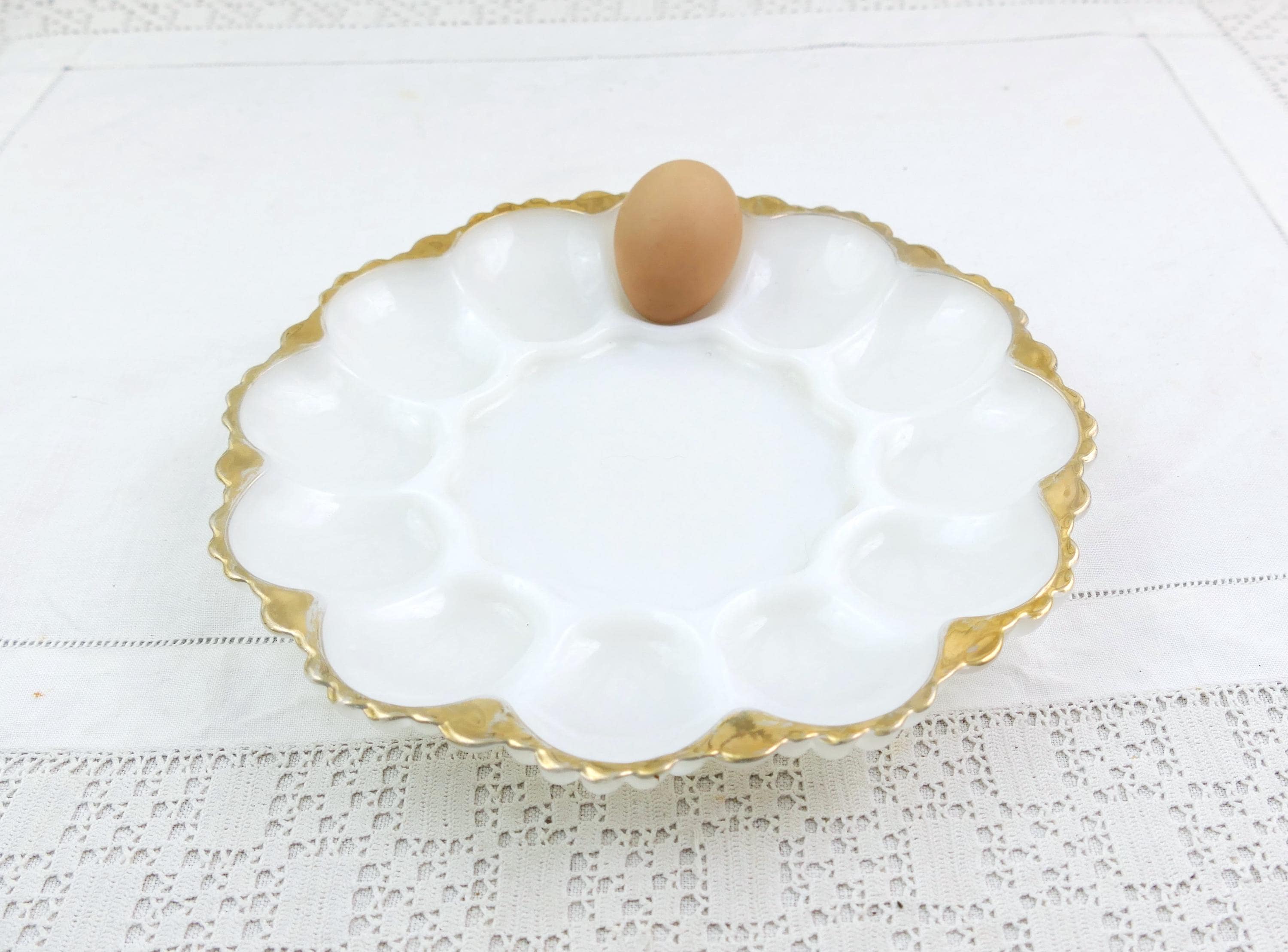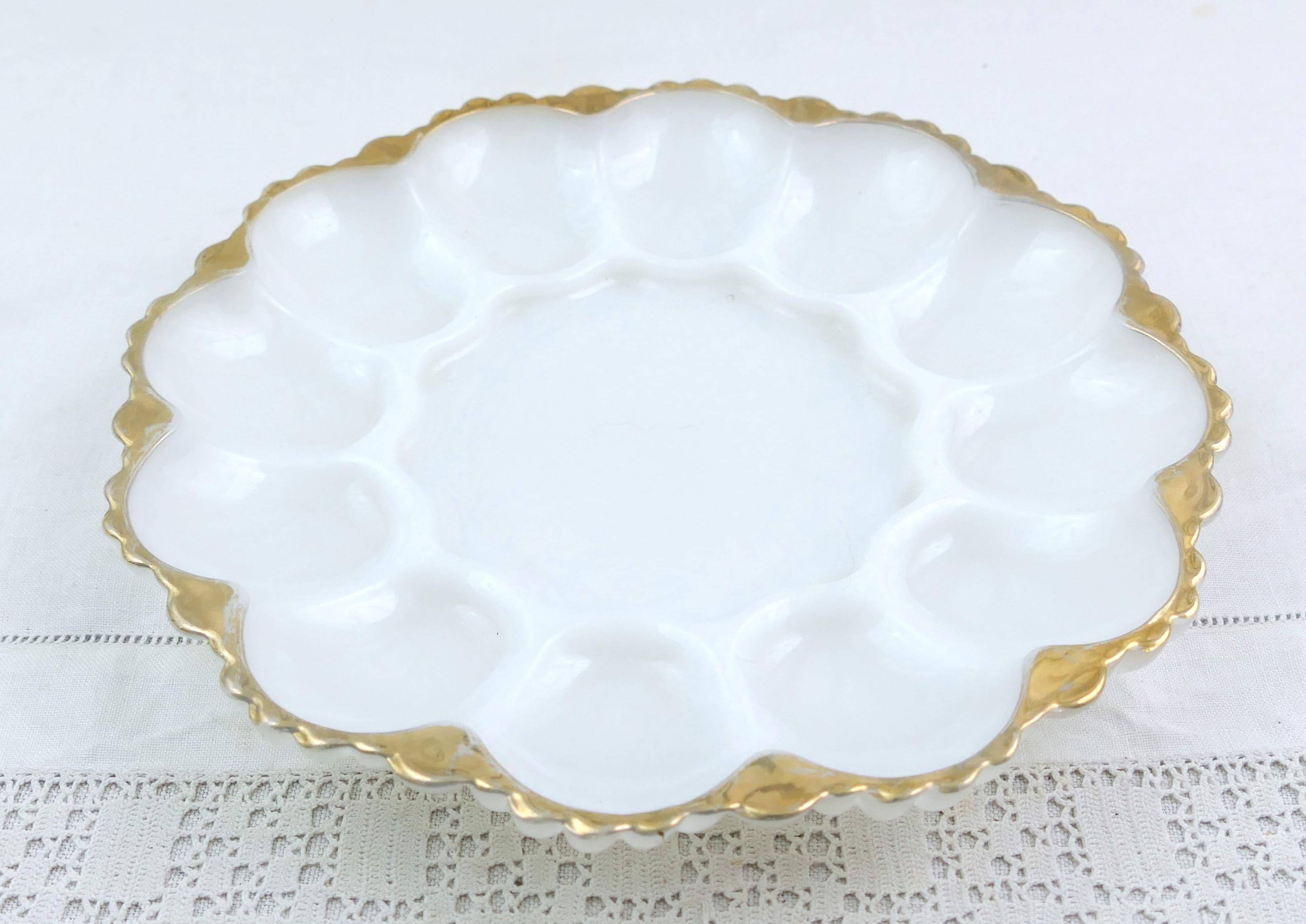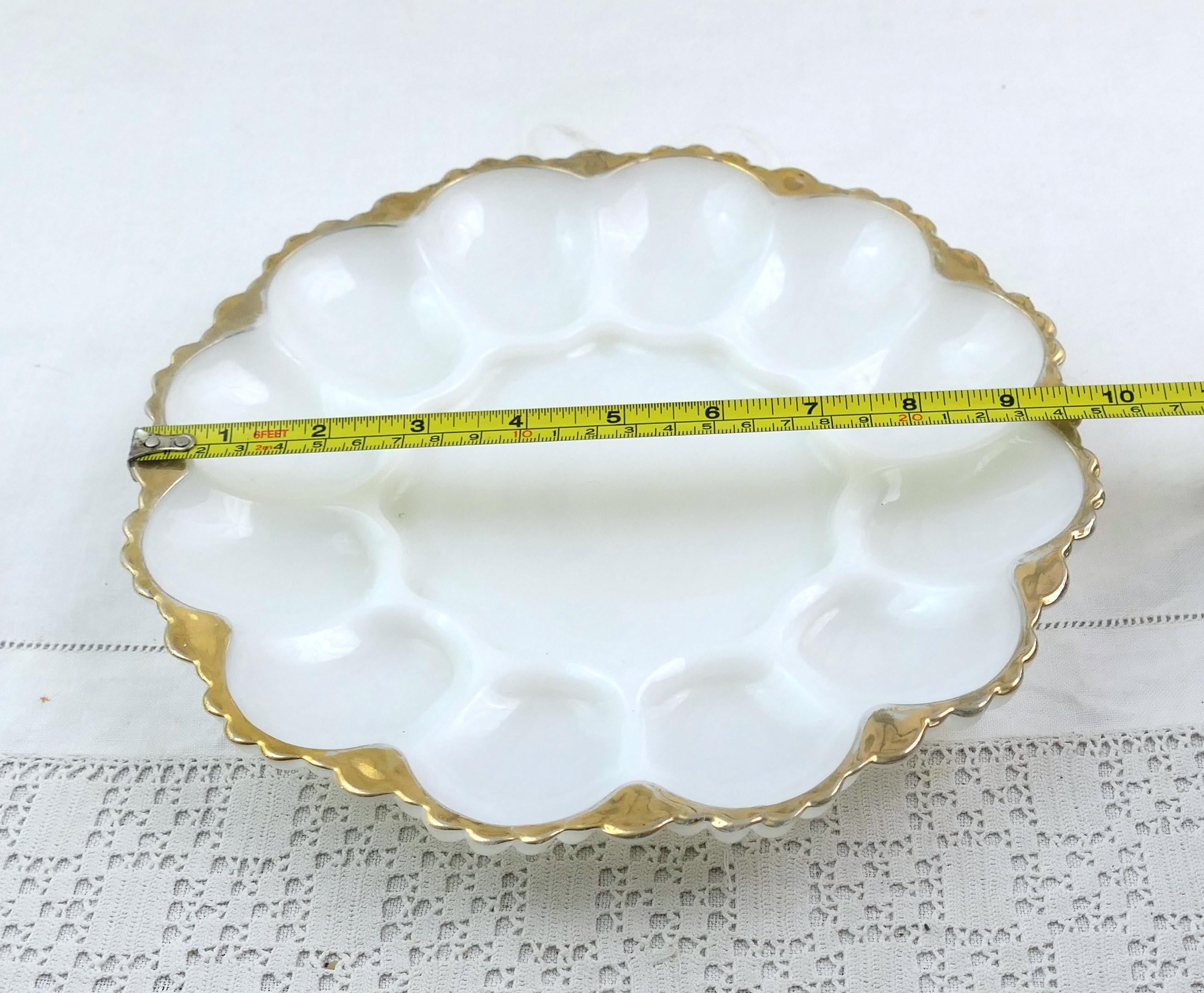 Vintage deviled egg plate. Made of white milk glass. Ca 1950s.