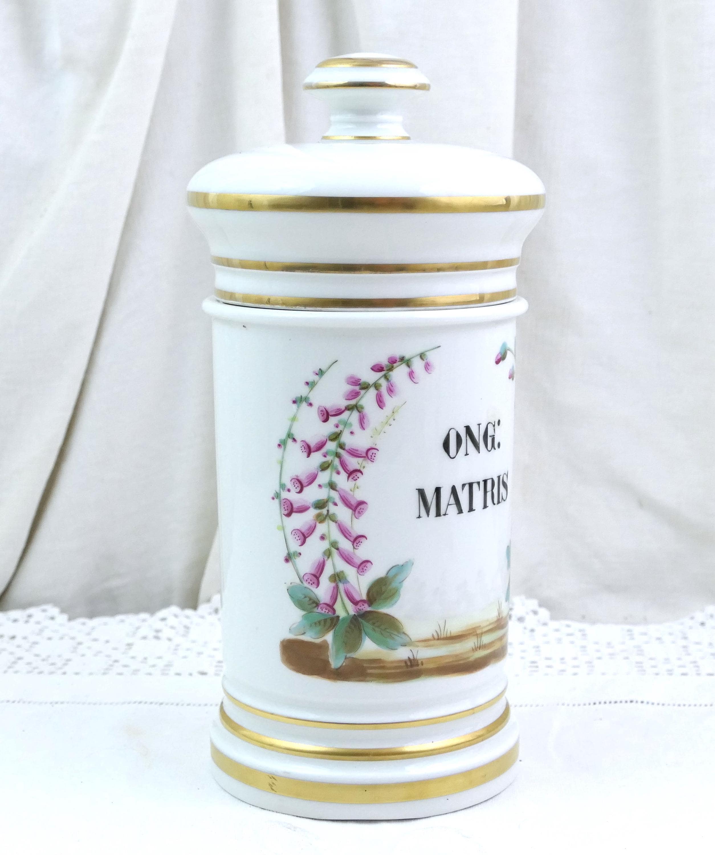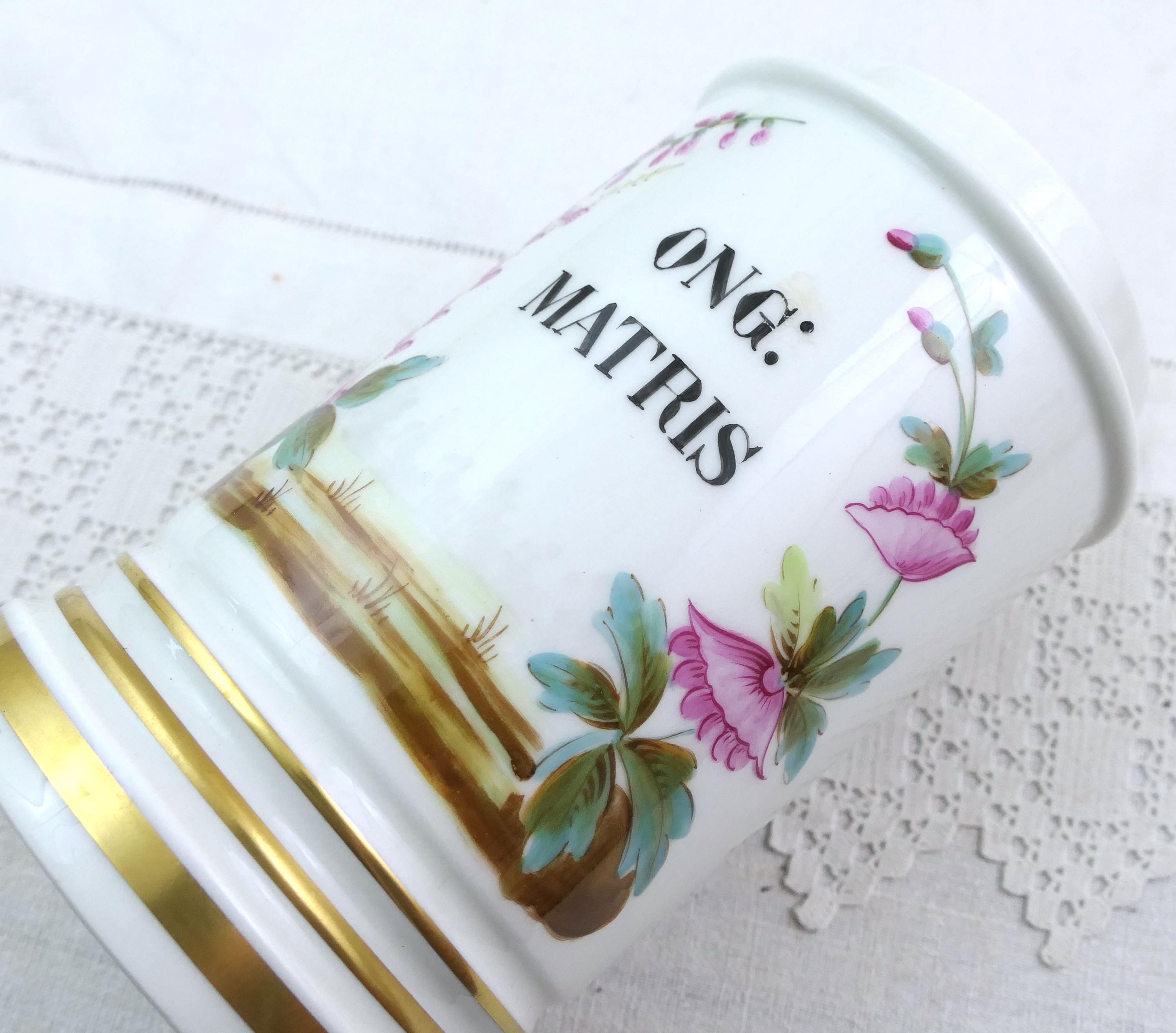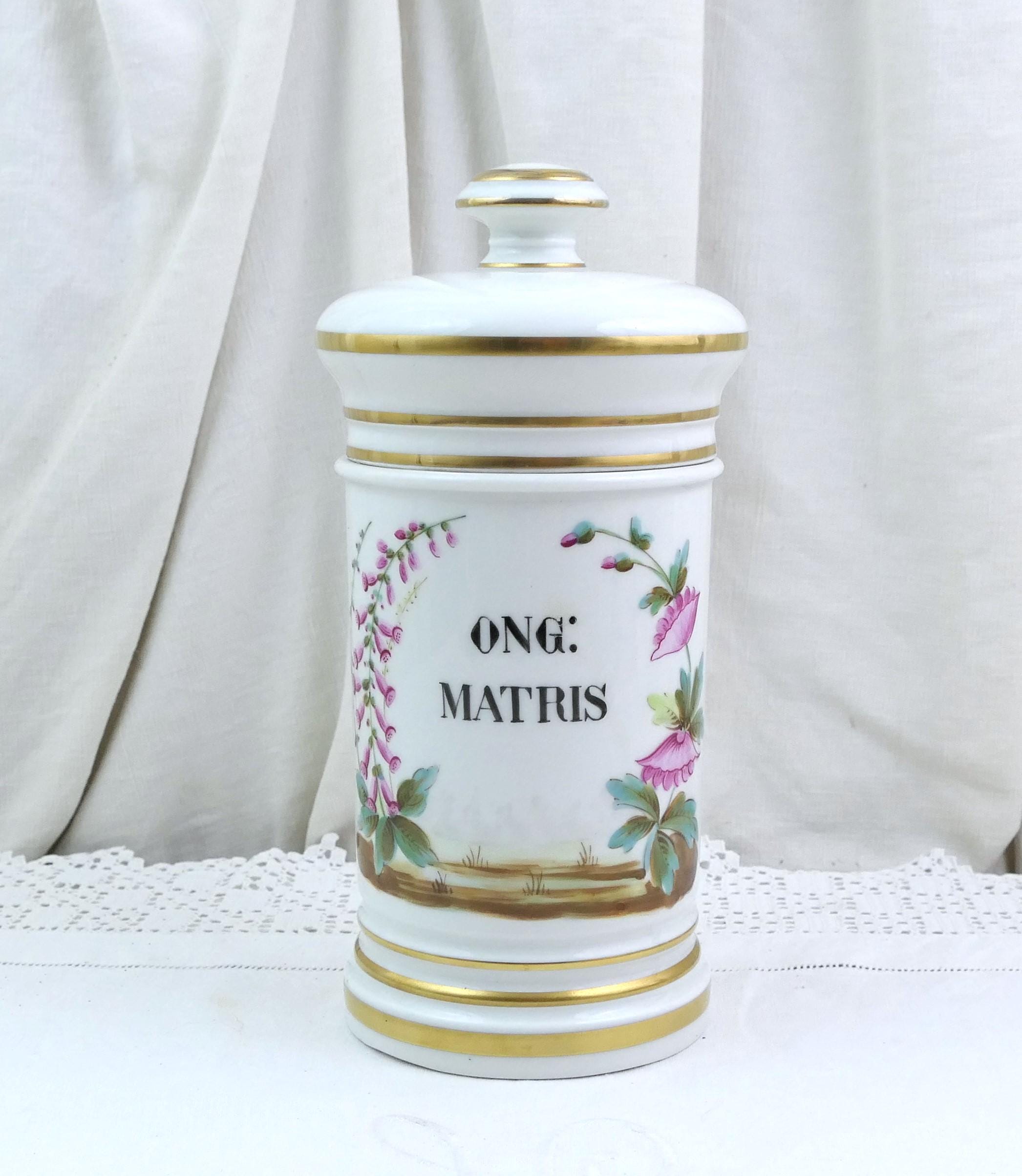 Vintage white apothecary jar inscribe Ong Matris with handpainted pattern. Made of white glazed pottery. Ca 1800s.