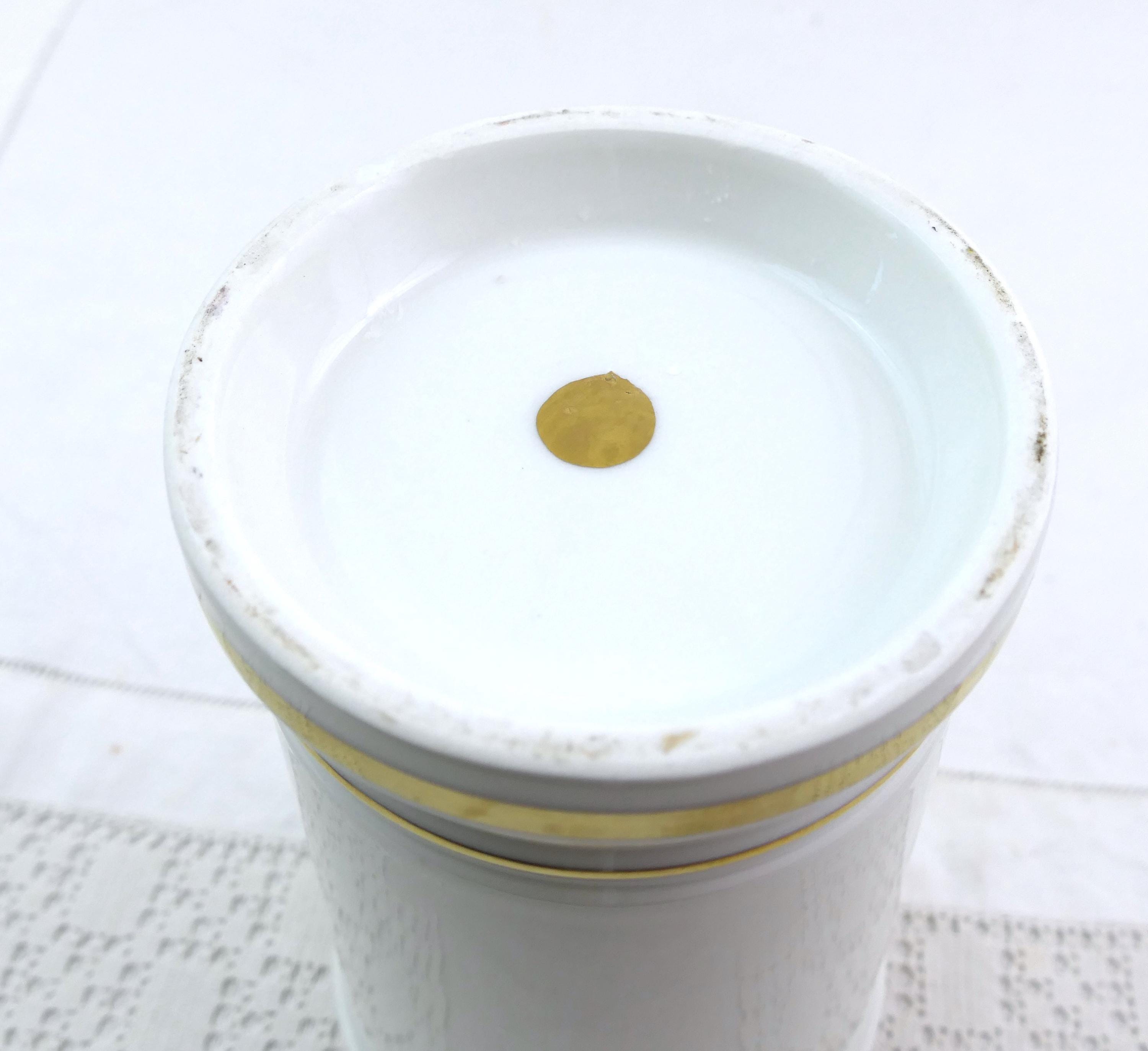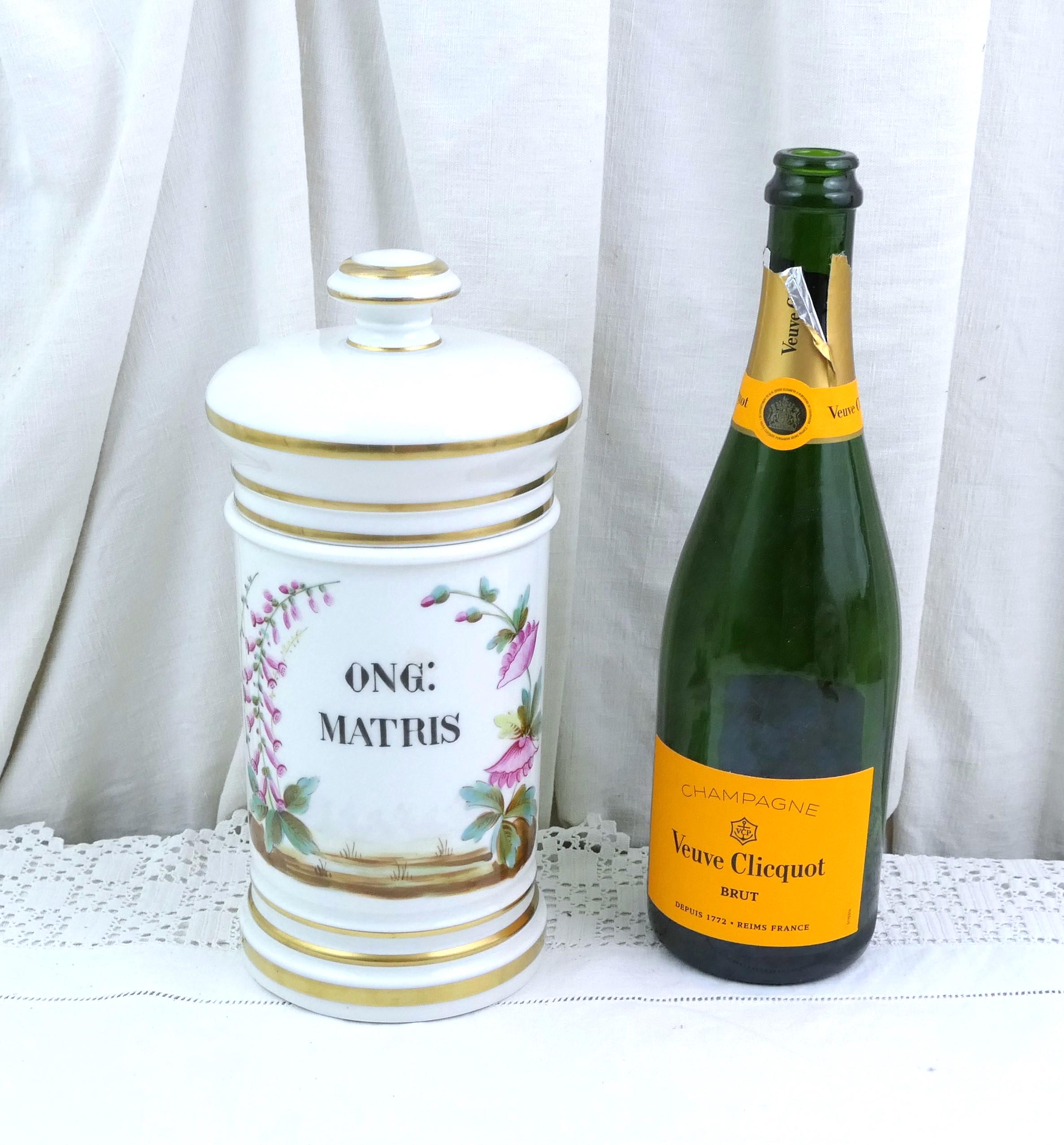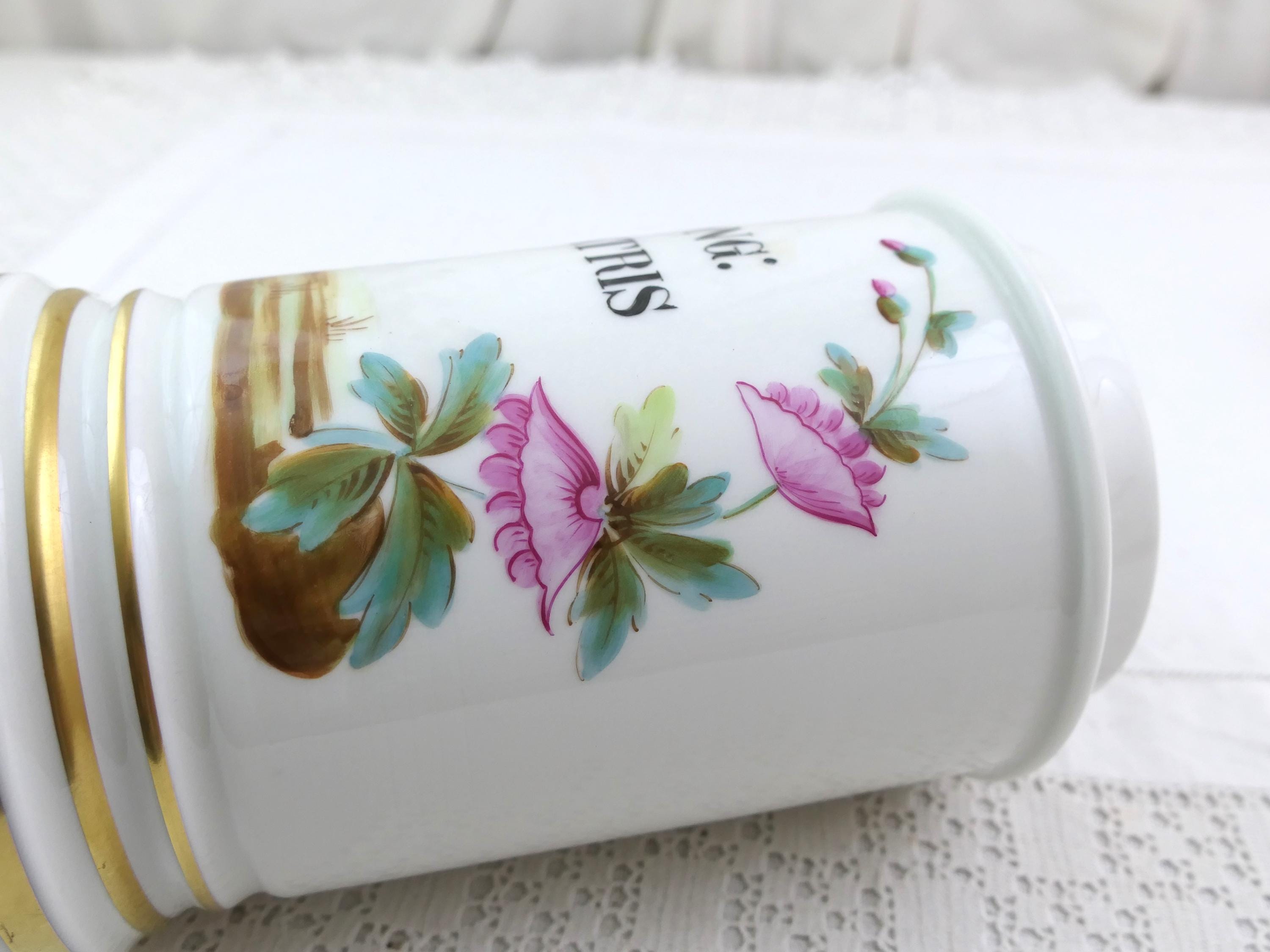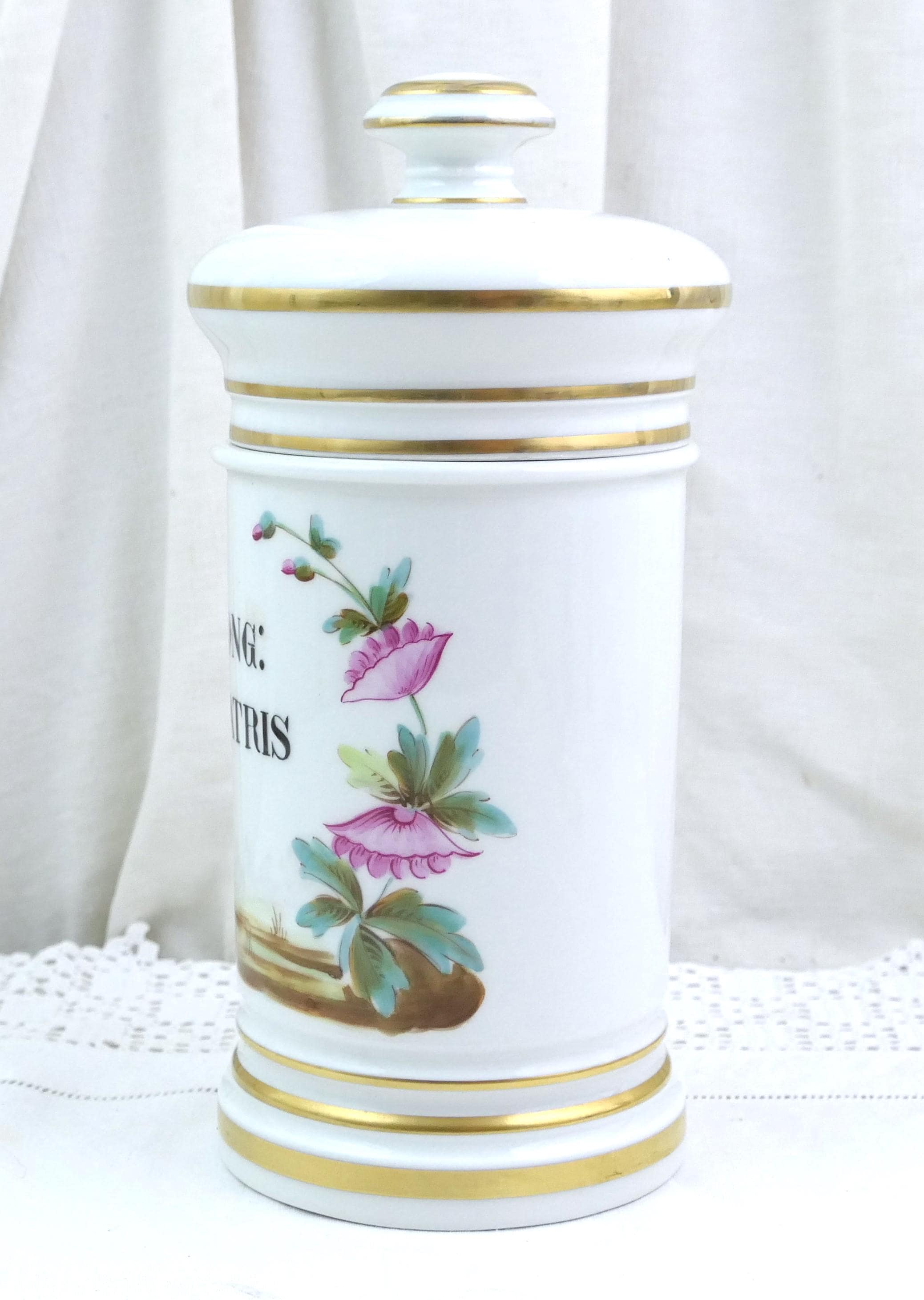 Vintage white apothecary jar inscribe Ong Matris with handpainted pattern. Made of white glazed pottery. Ca 1800s.