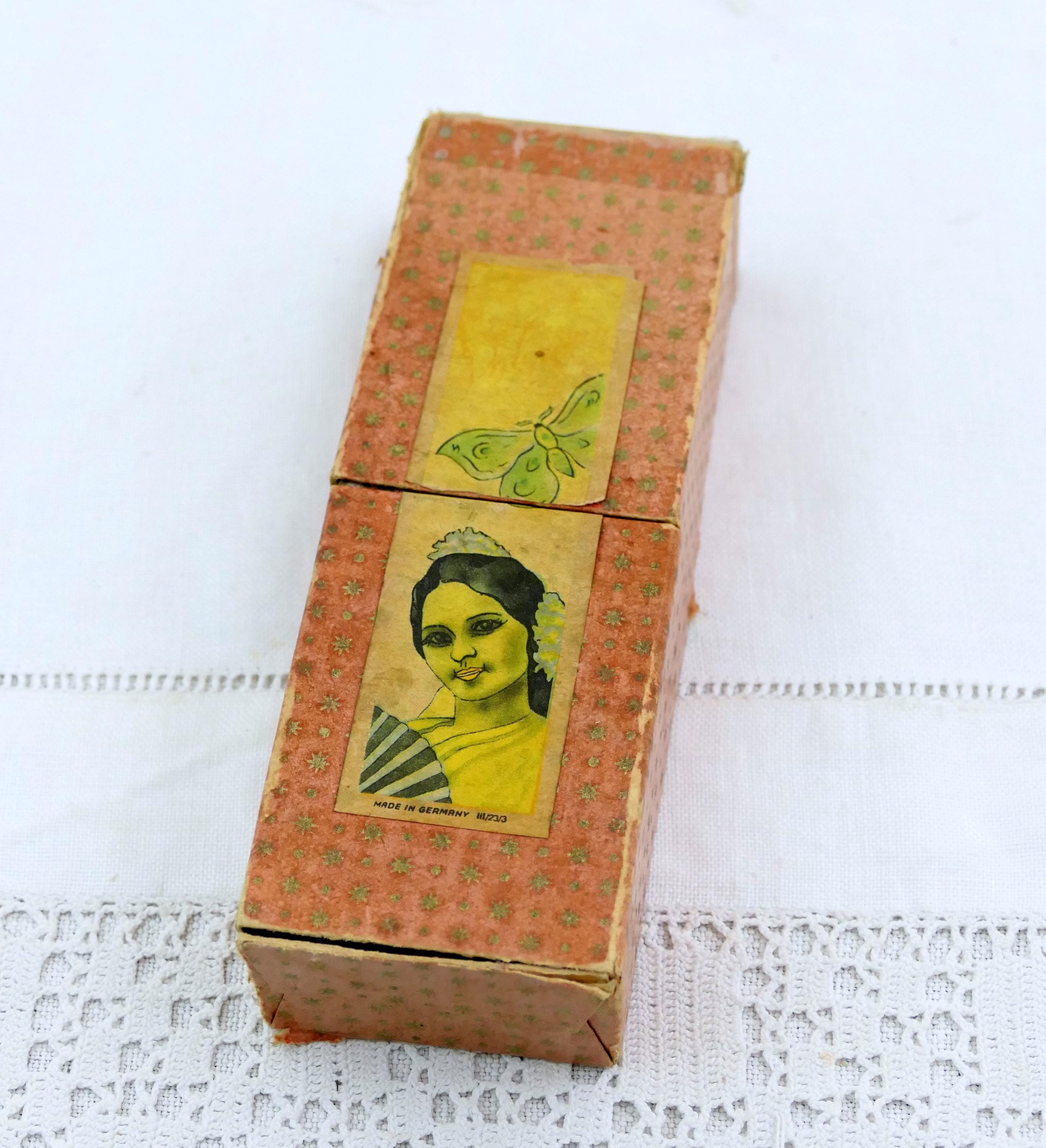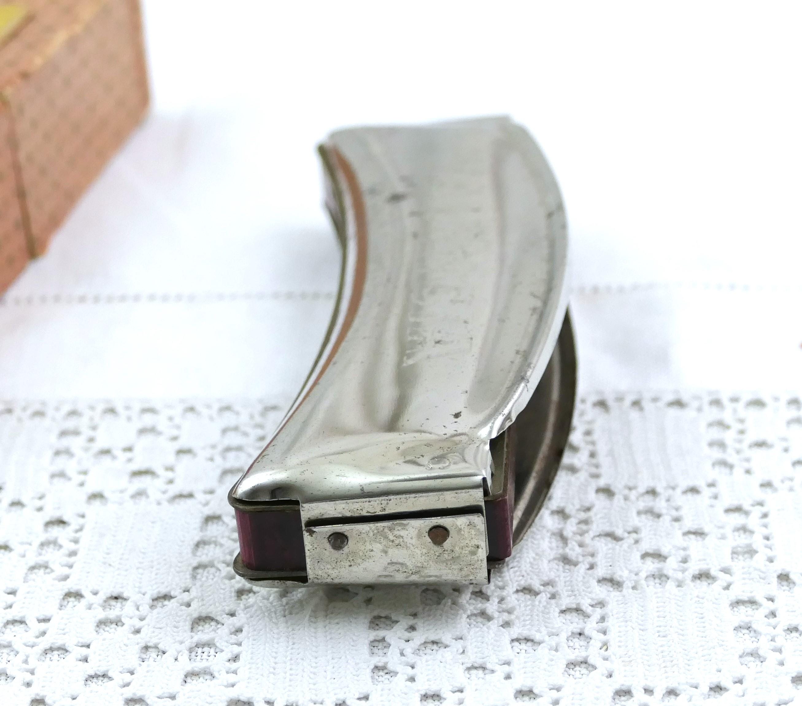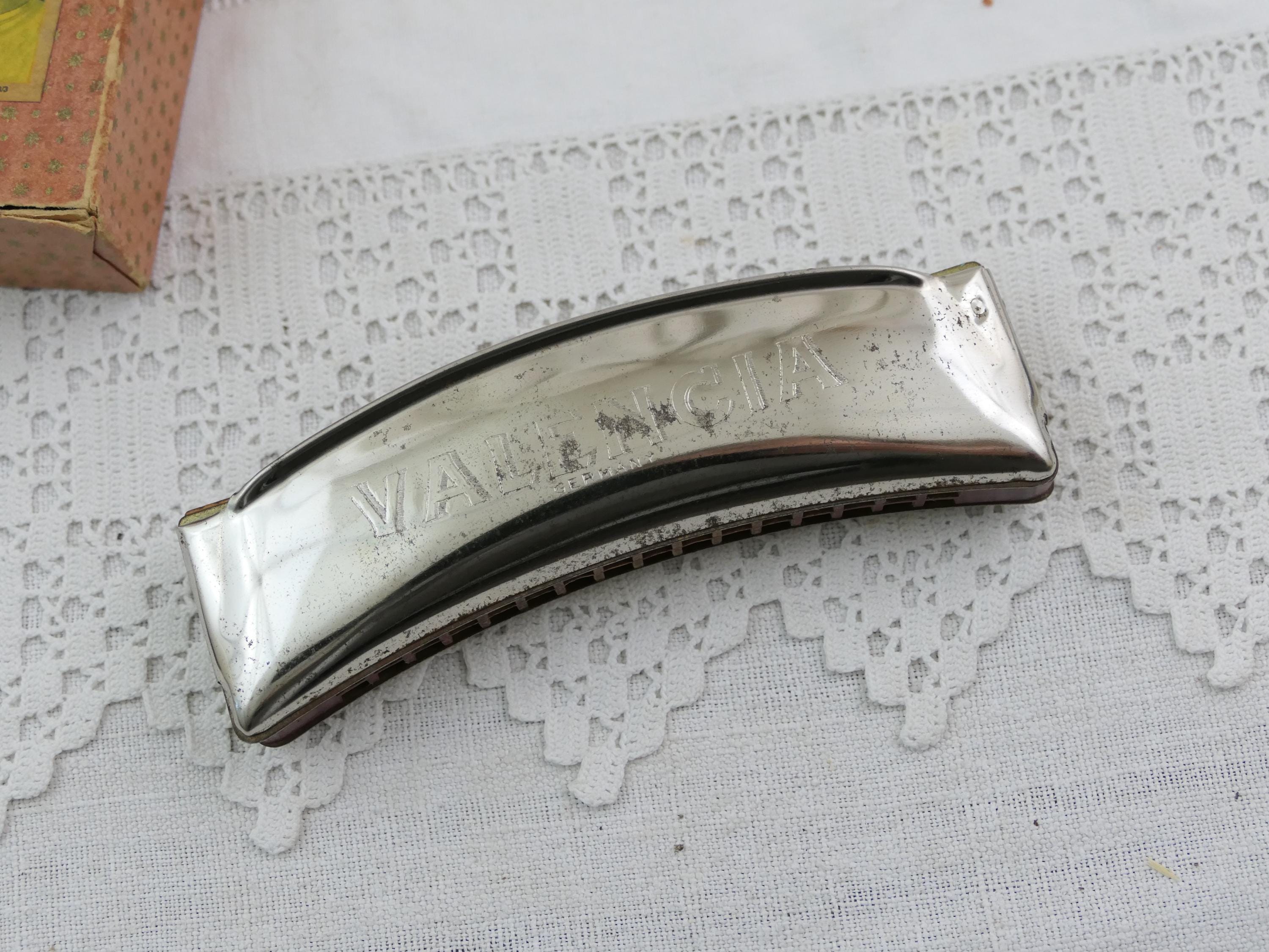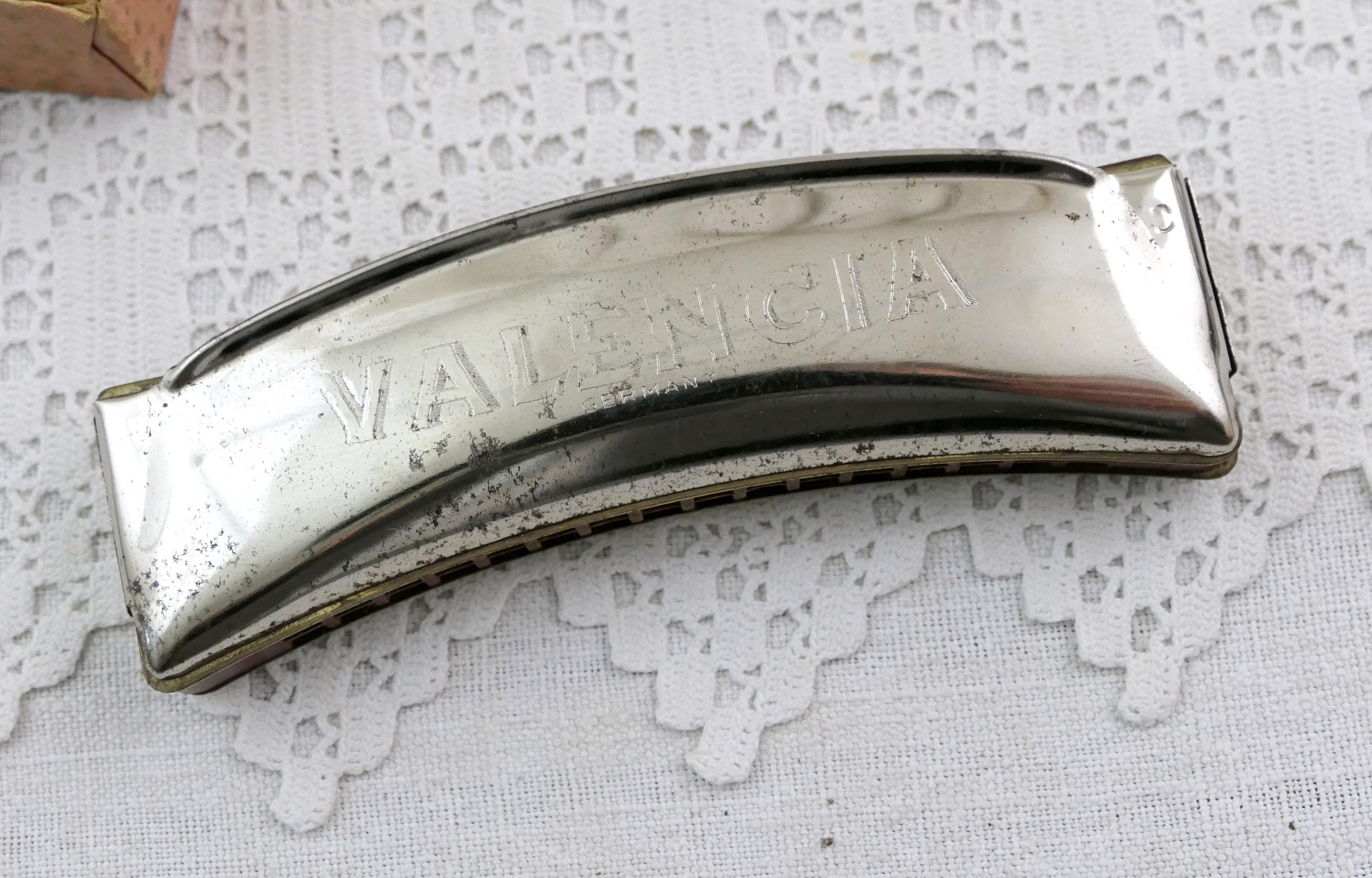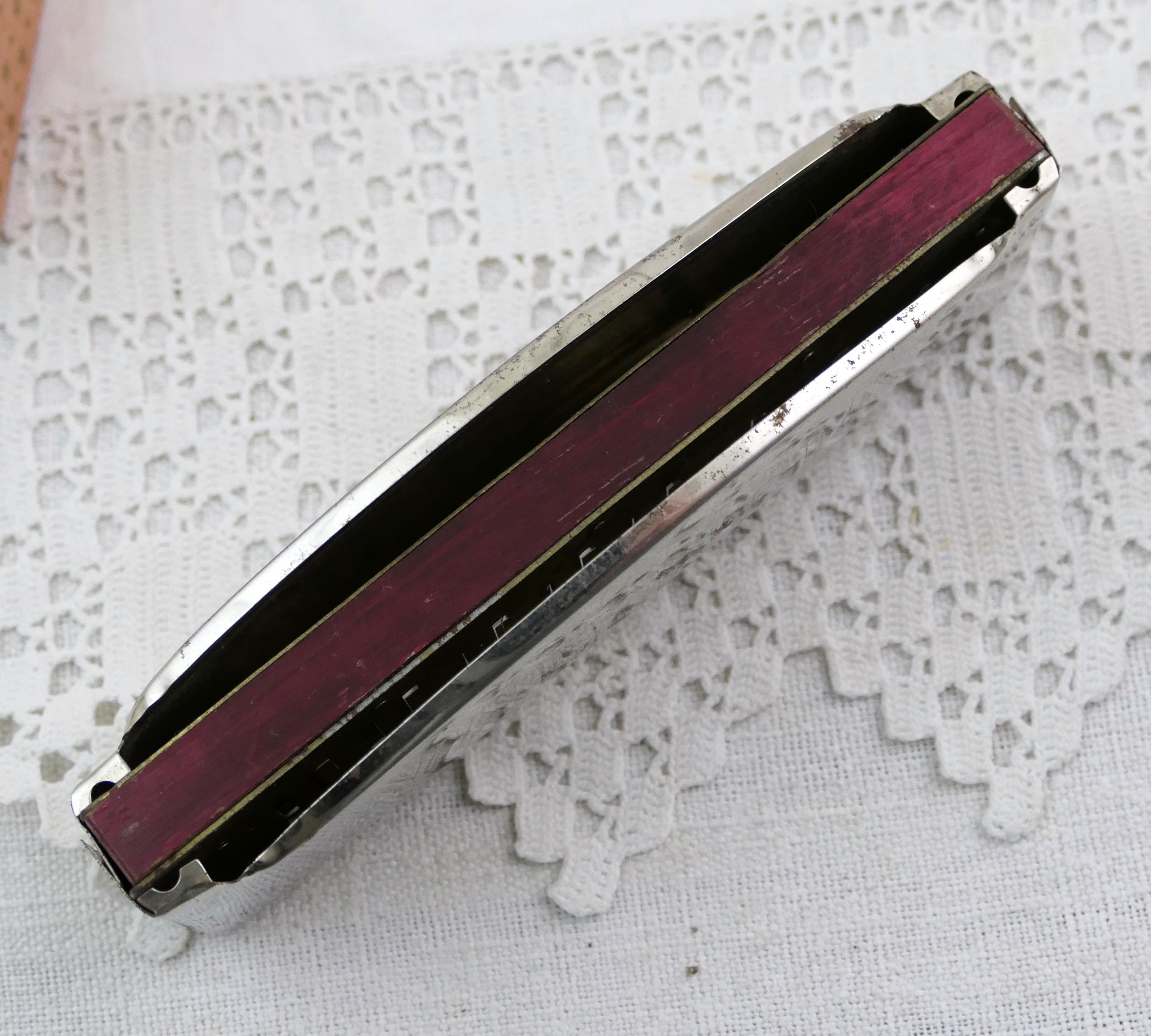Vintage German harmonica with original box. Made of metal and wood. Ca mid 1900s.
