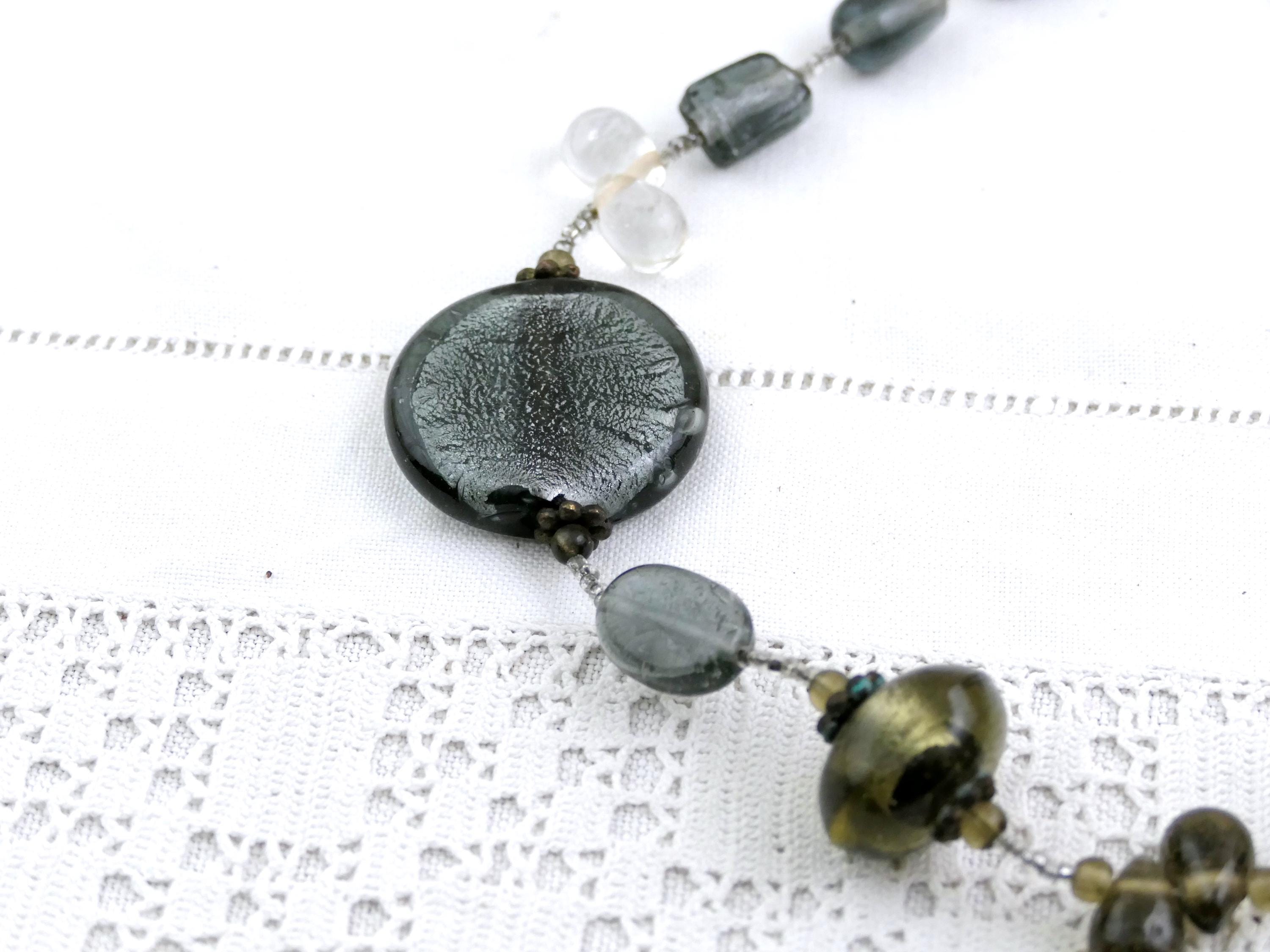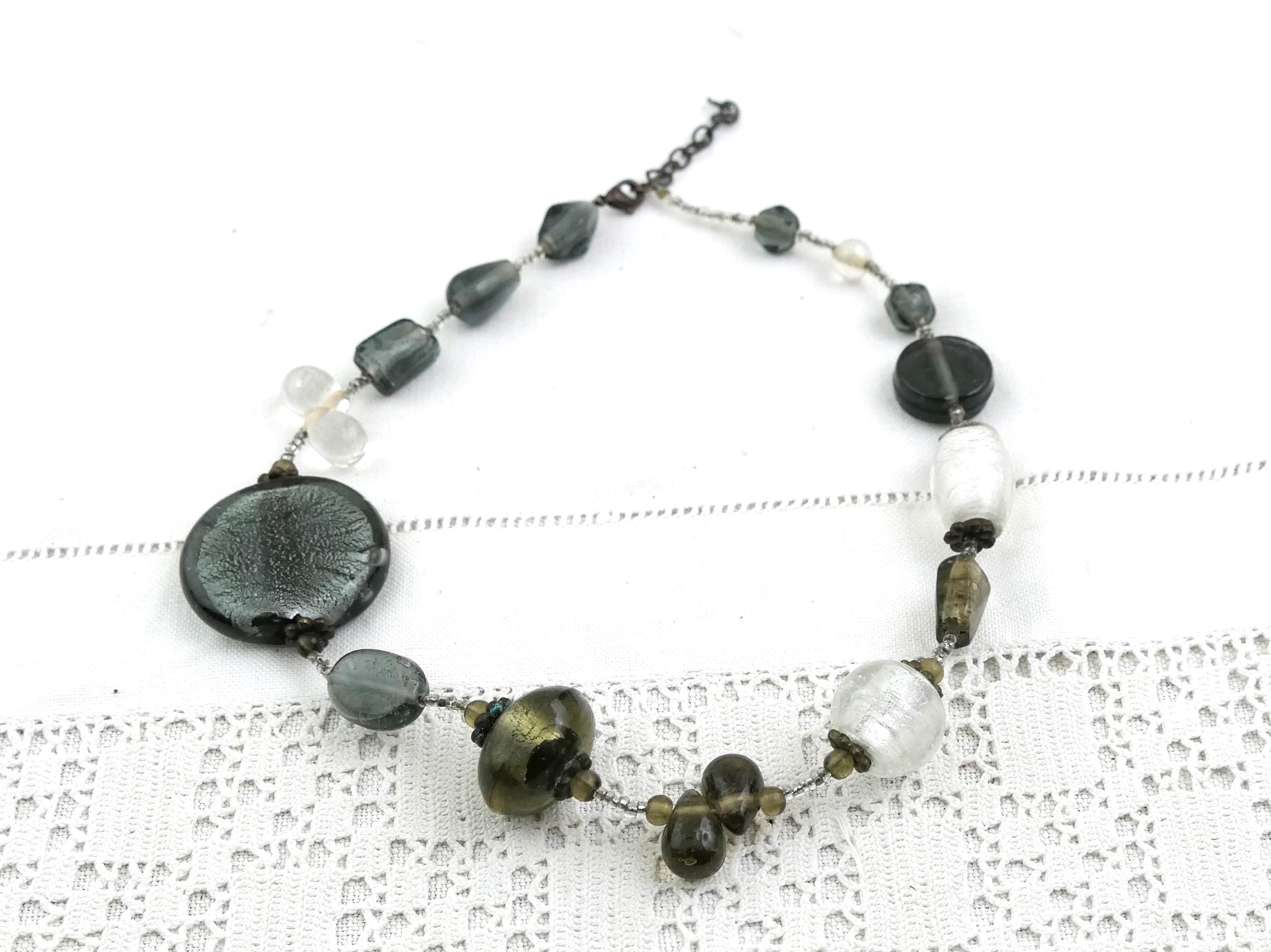 Vintage foil backed asymmetric bead necklace. Made of glass beads with metal clasp. Ca early 2000s.