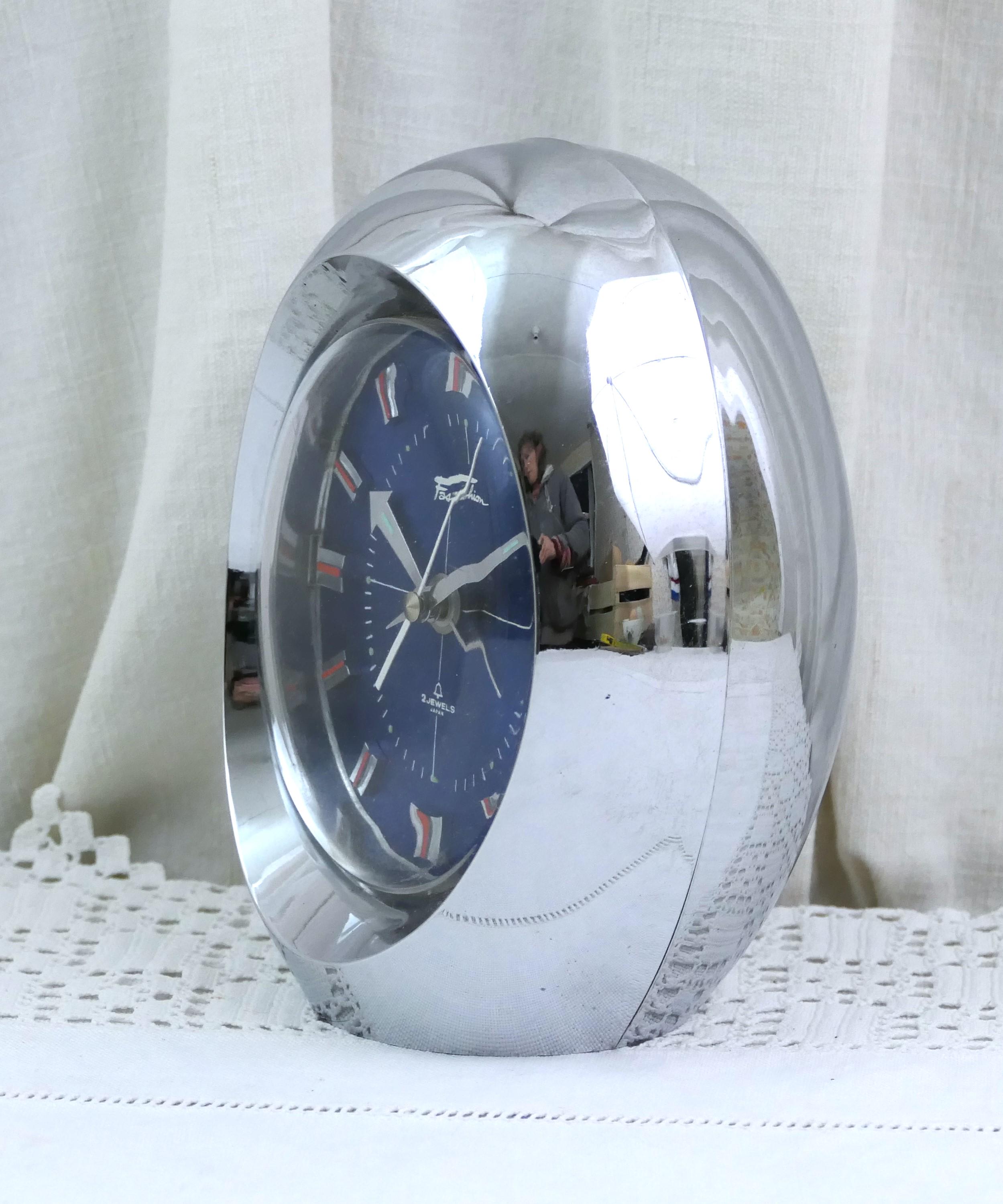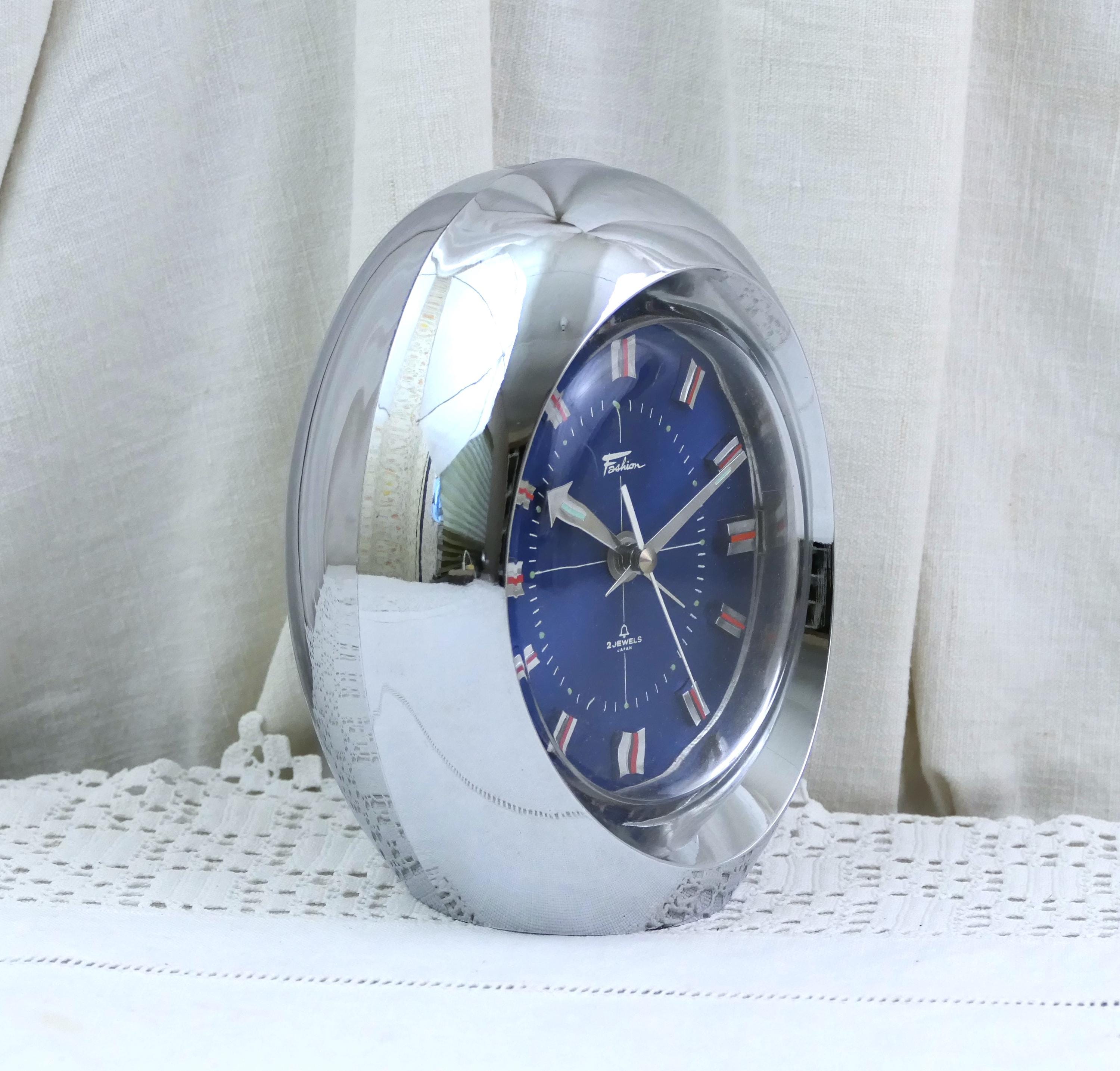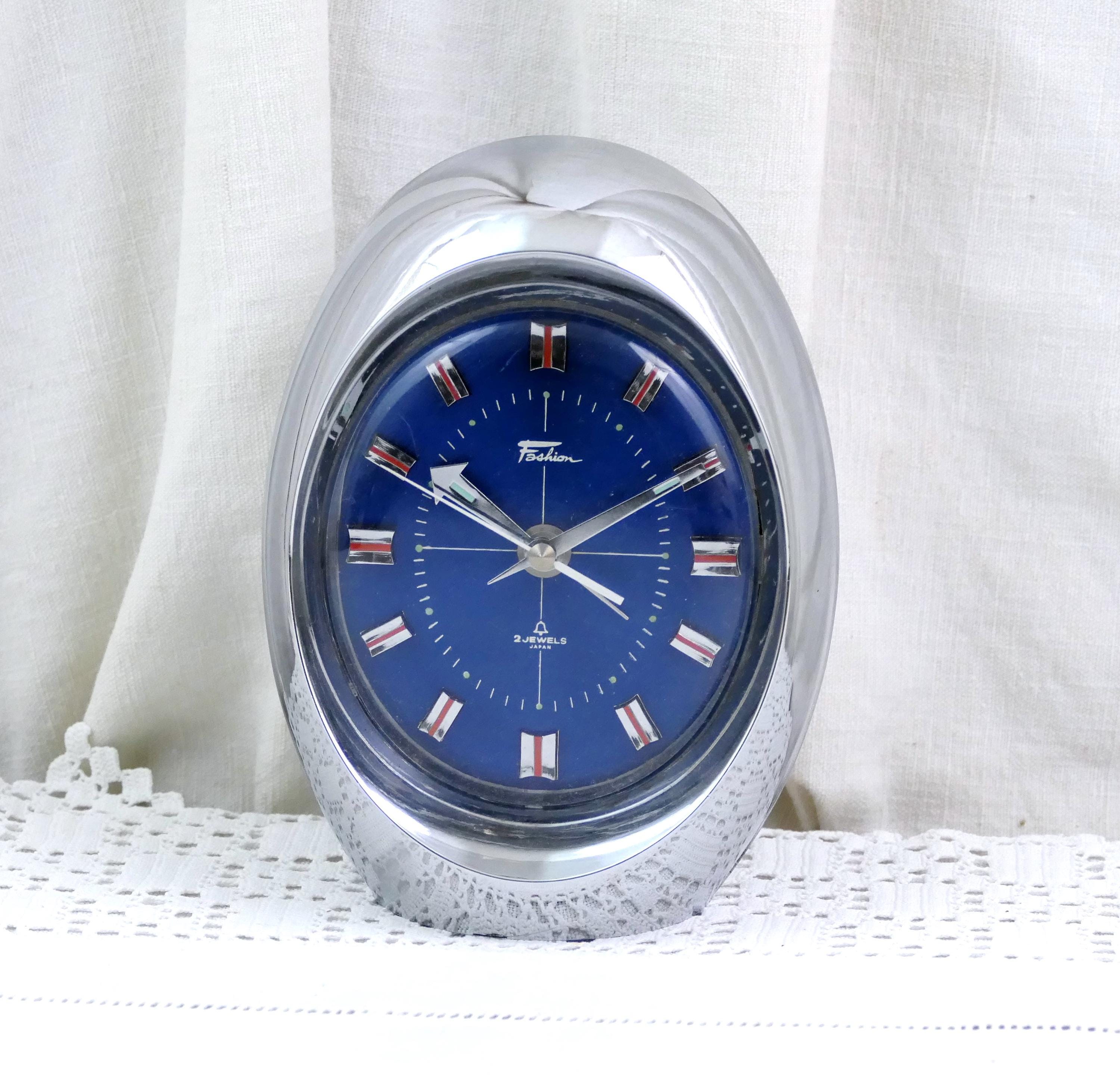 Vintage wind up clock Mechanical alarm clock. In working order. Manufactured by the Japanese brand Fashion, it has a 2 jewel mechanism. Silver body with a vibrant electric blue clock face.