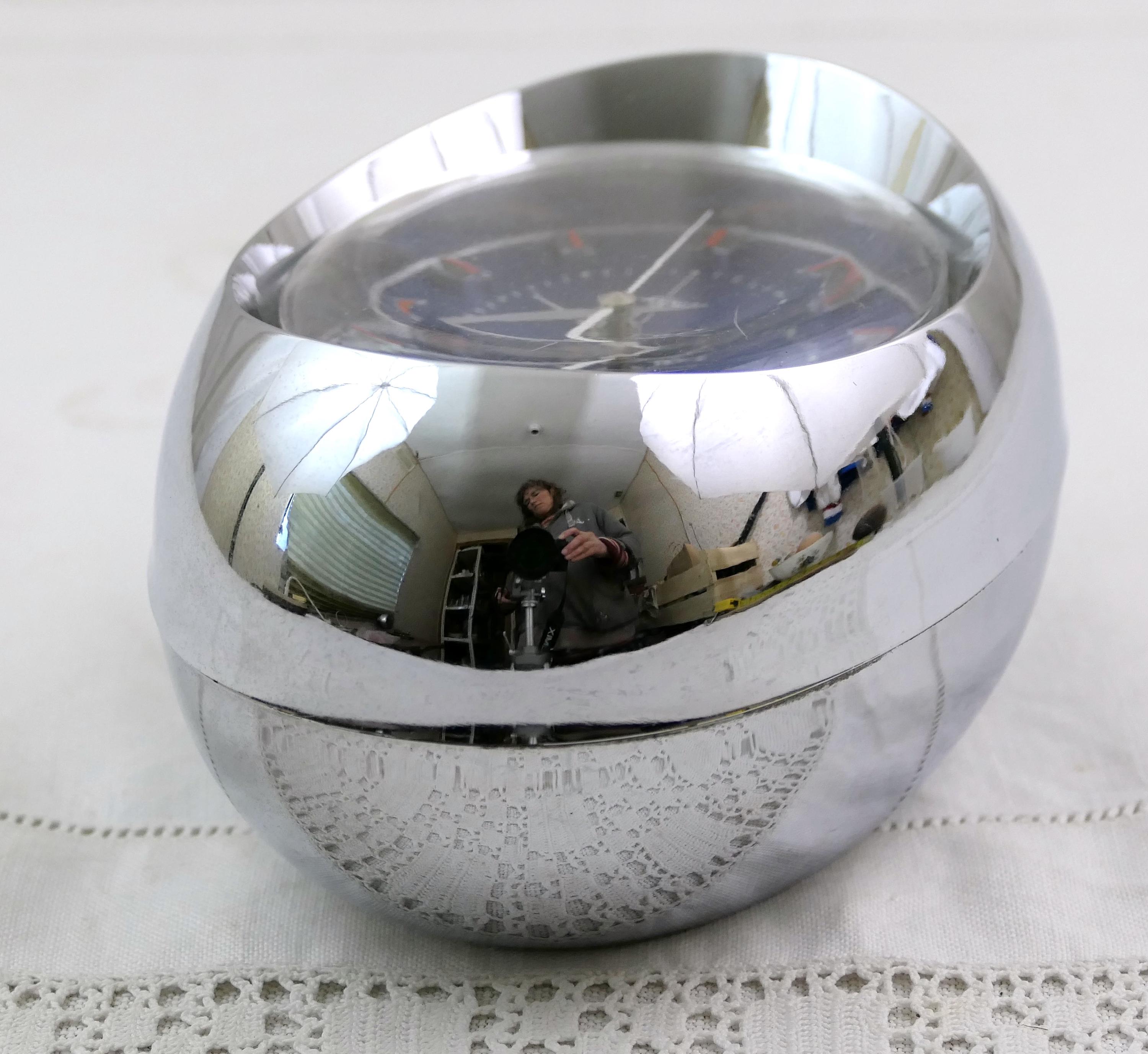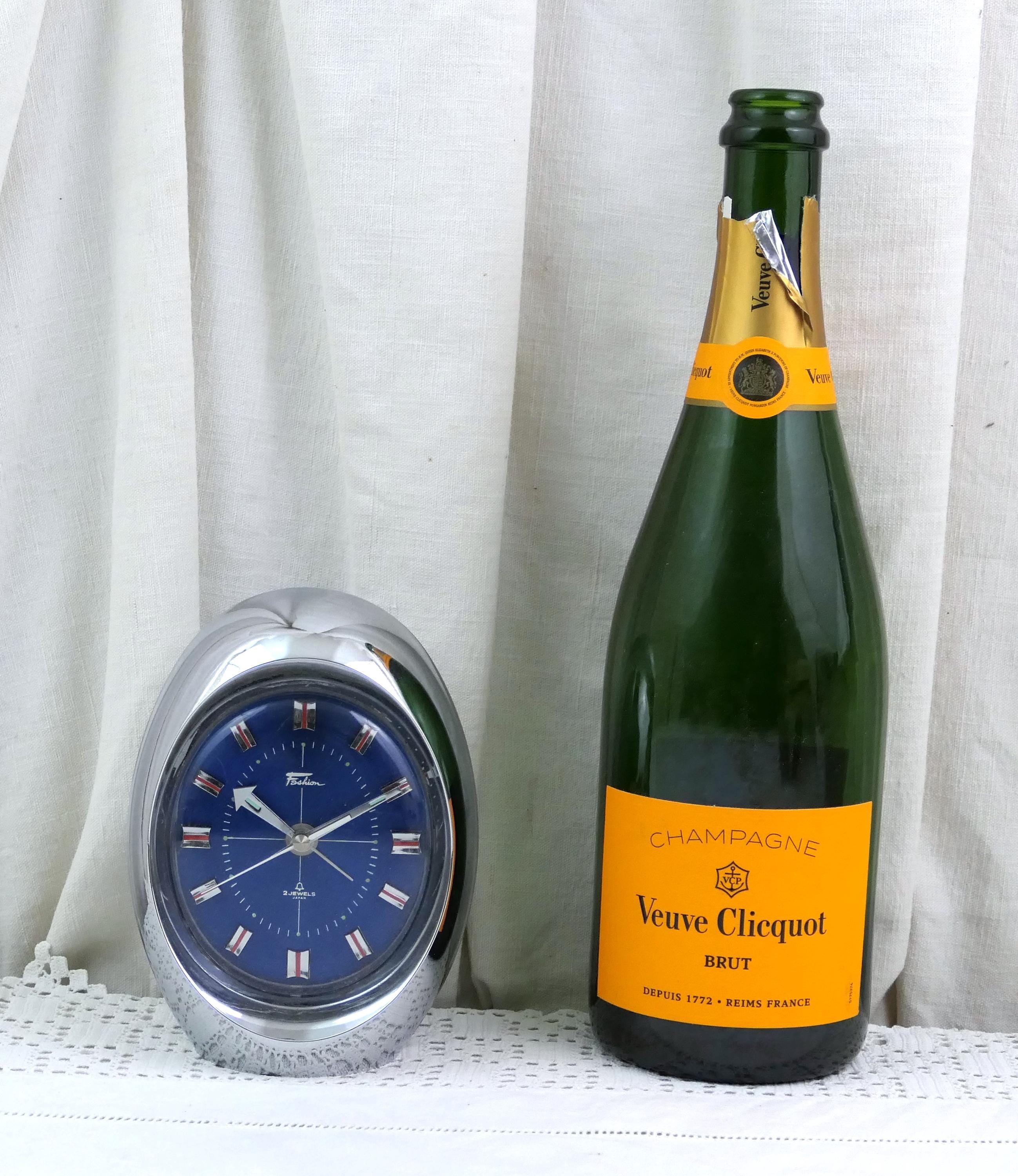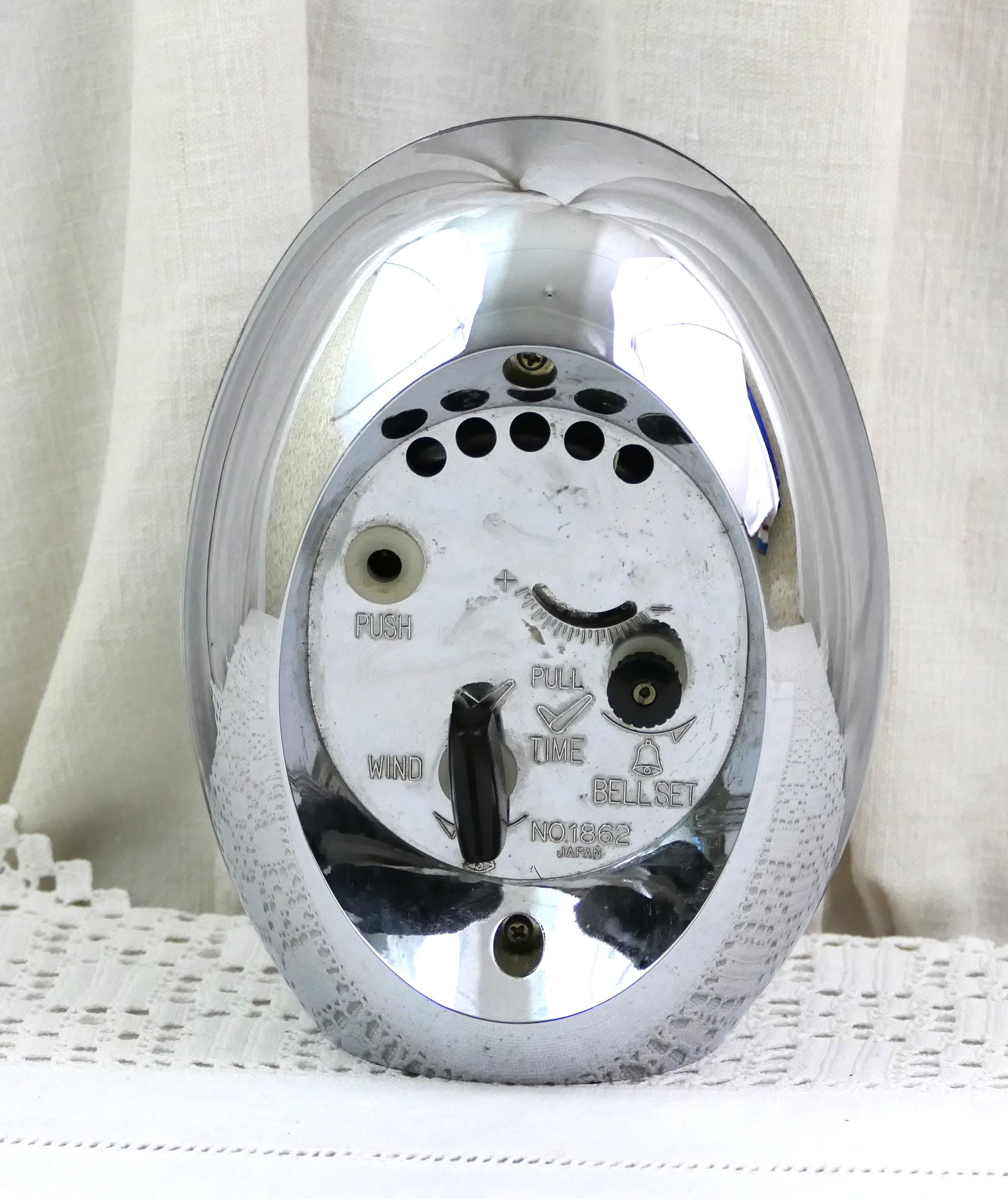 Vintage wind up clock Mechanical alarm clock. In working order. Manufactured by the Japanese brand Fashion, it has a 2 jewel mechanism. Silver body with a vibrant electric blue clock face.
