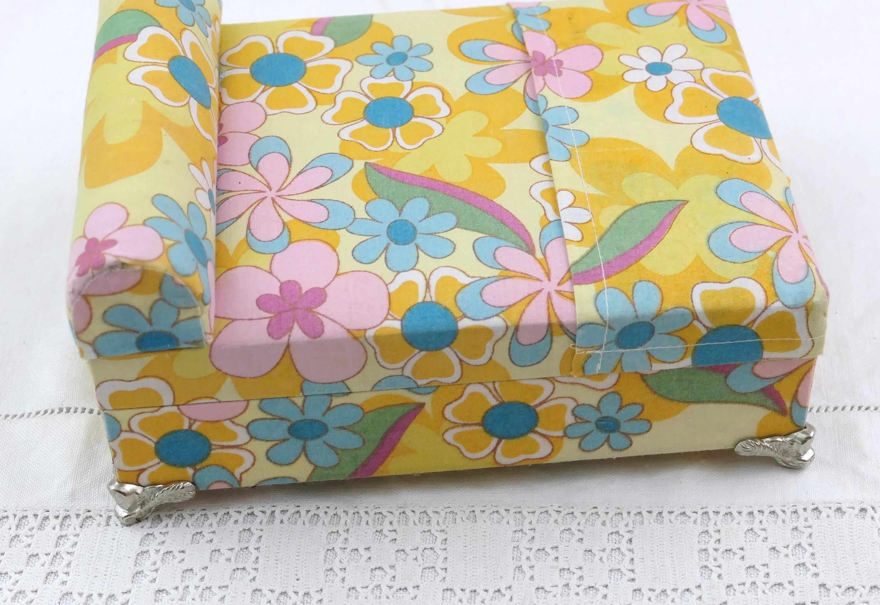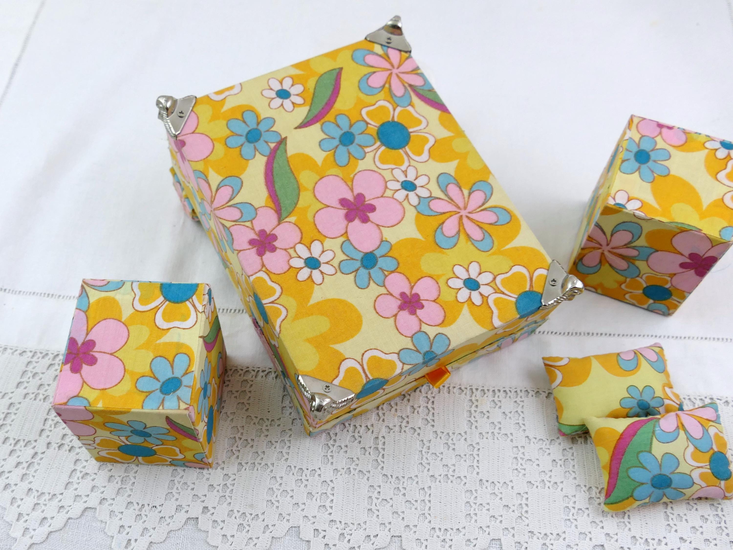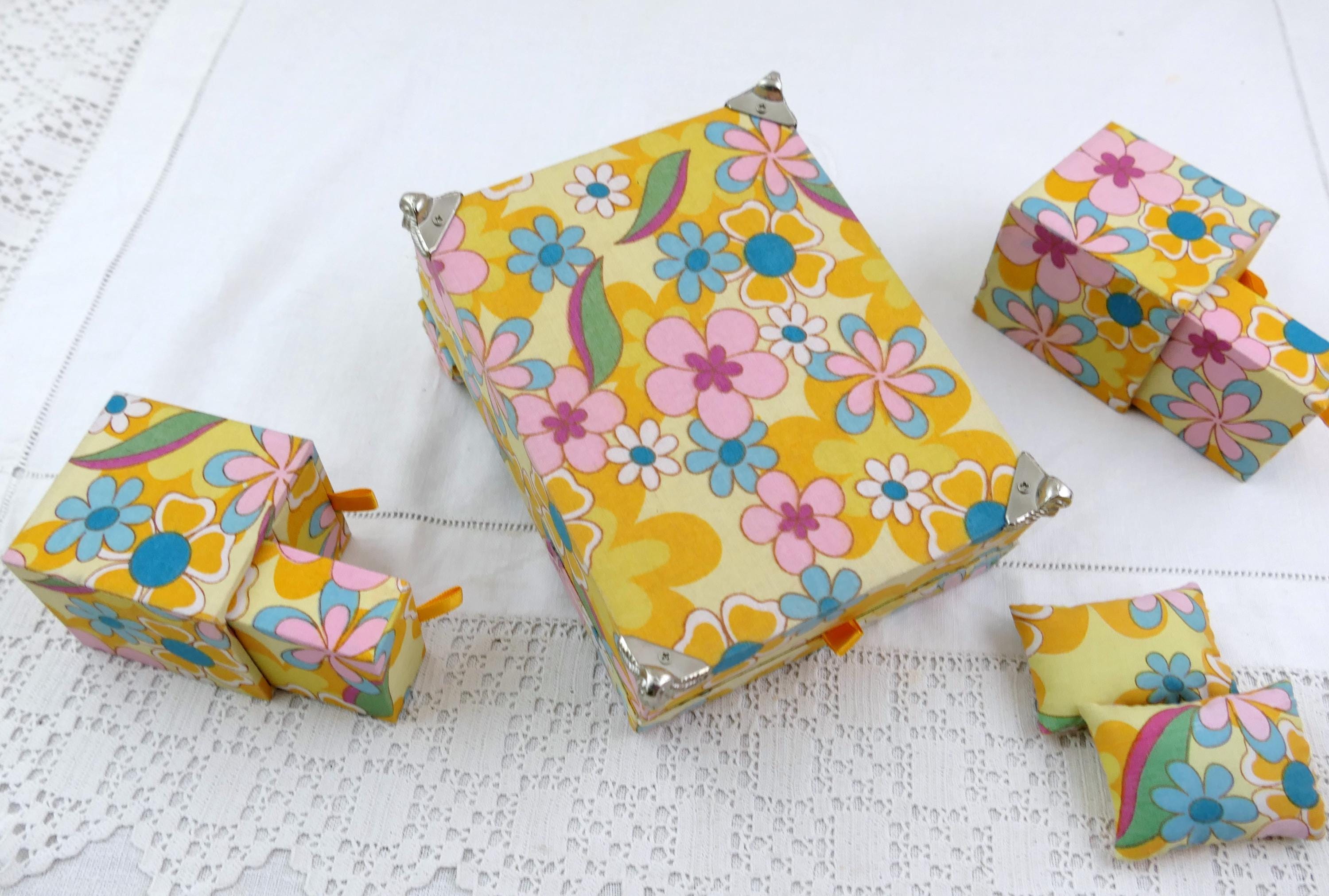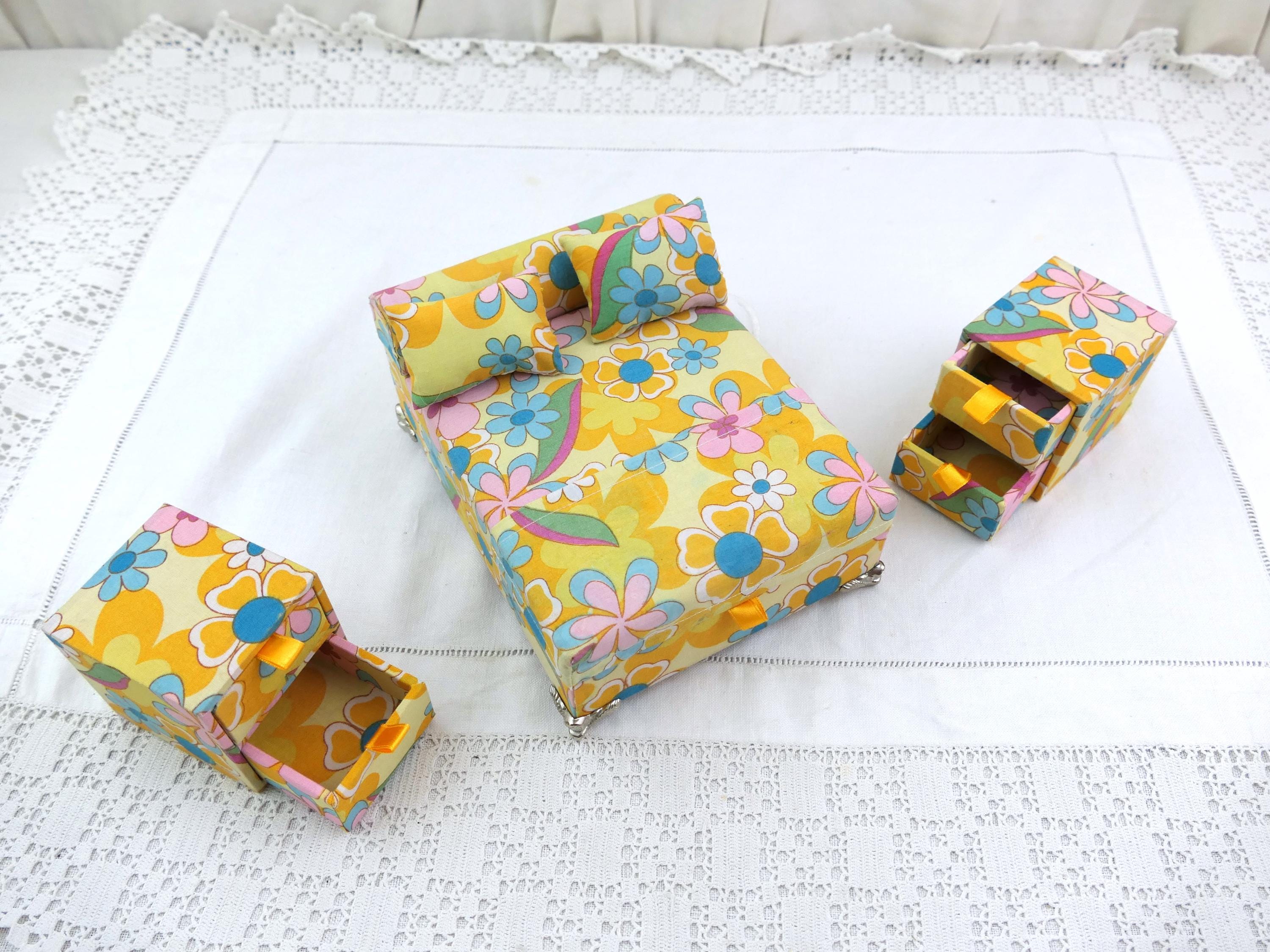 Vintage Mid Century novelty fun jewelry box shaped as a bedroom suite with double bed and side cabinets, that open. Made of fabric covered wood. Ca 1960s.