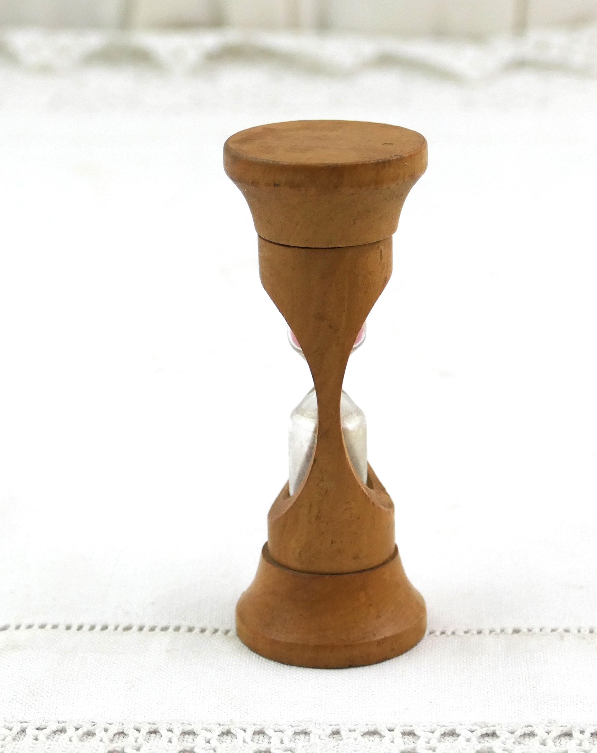 Antique French wooden cased egg timer. Made of turned wood with glass and pink sand. Ca early 1900s.