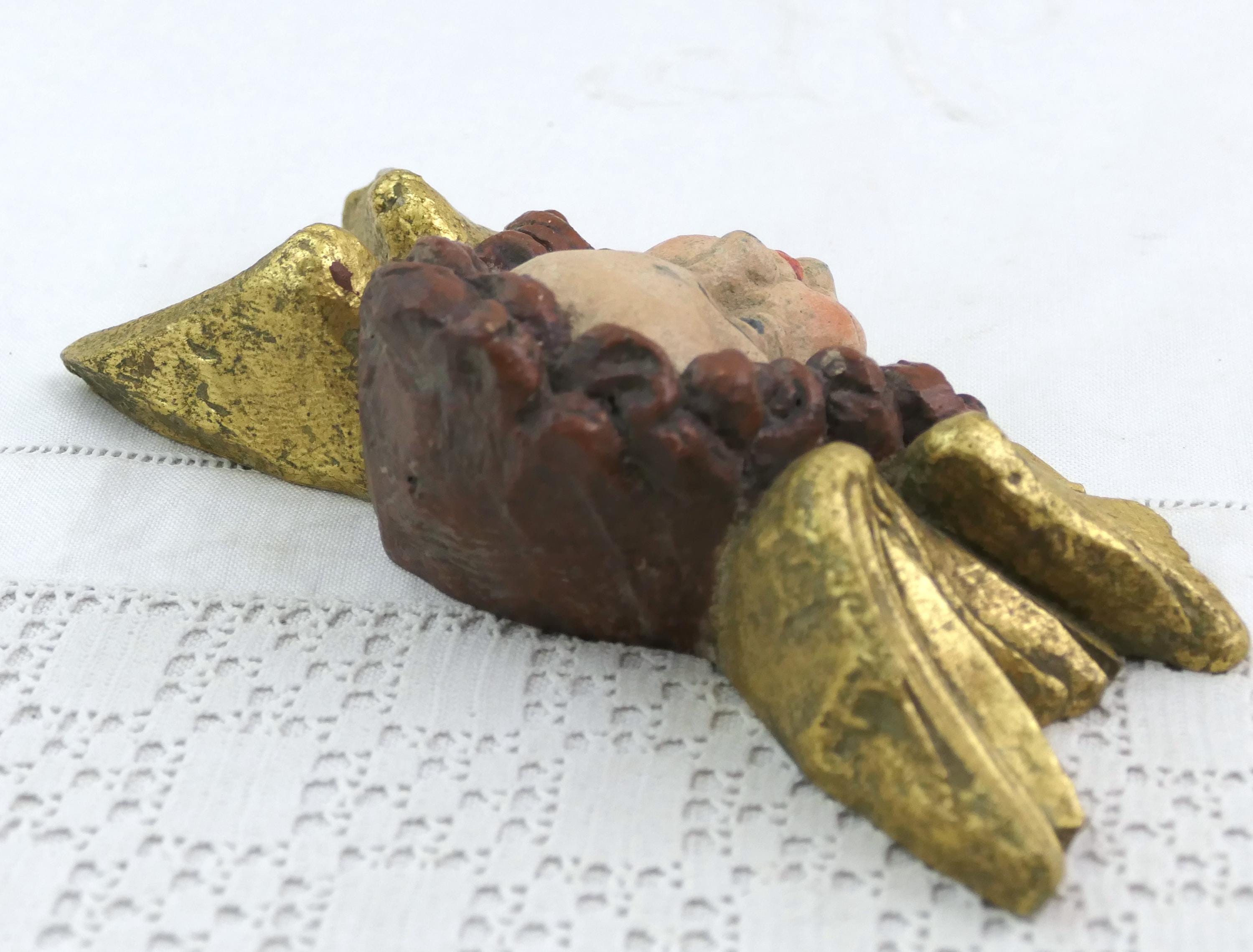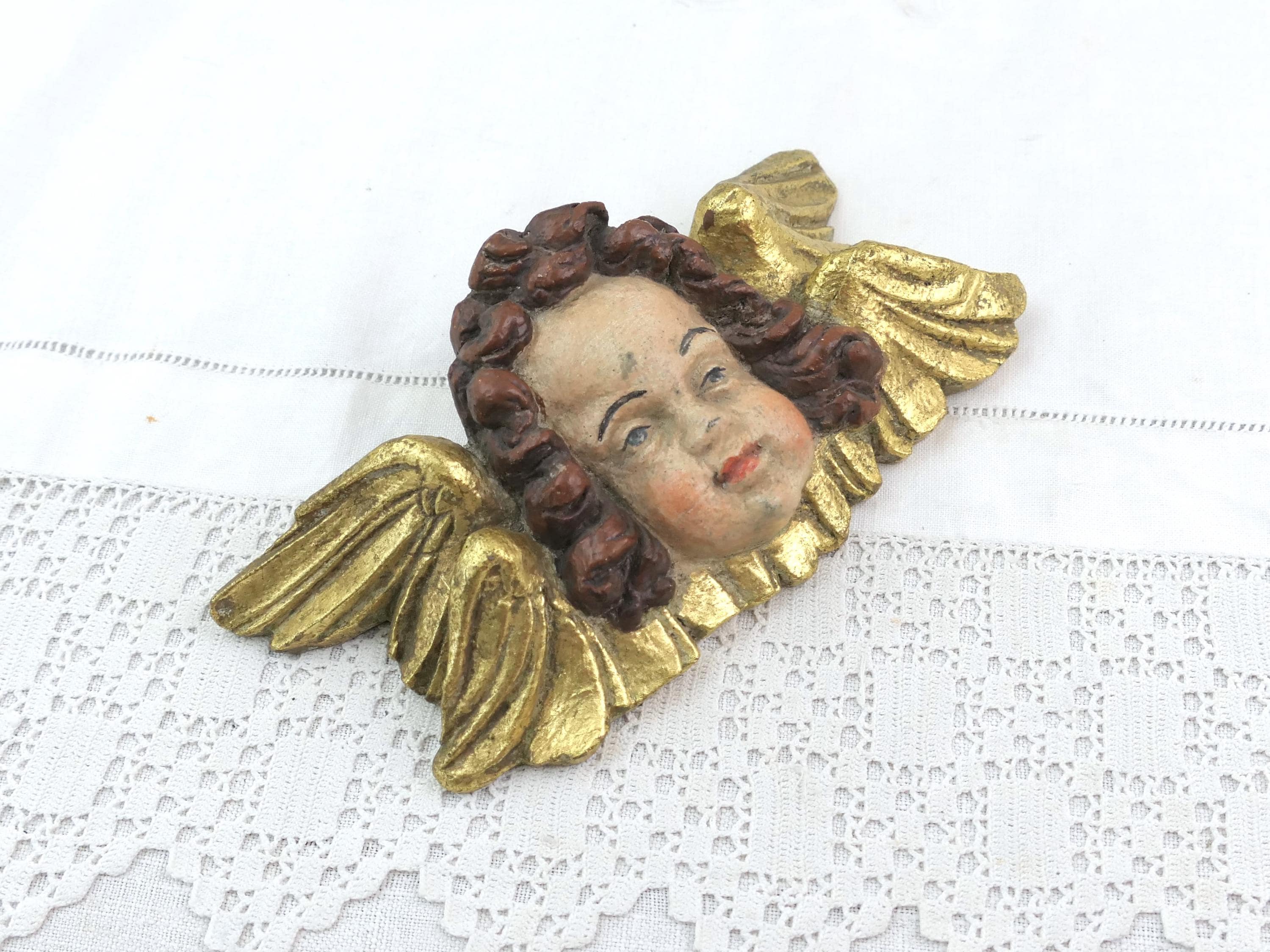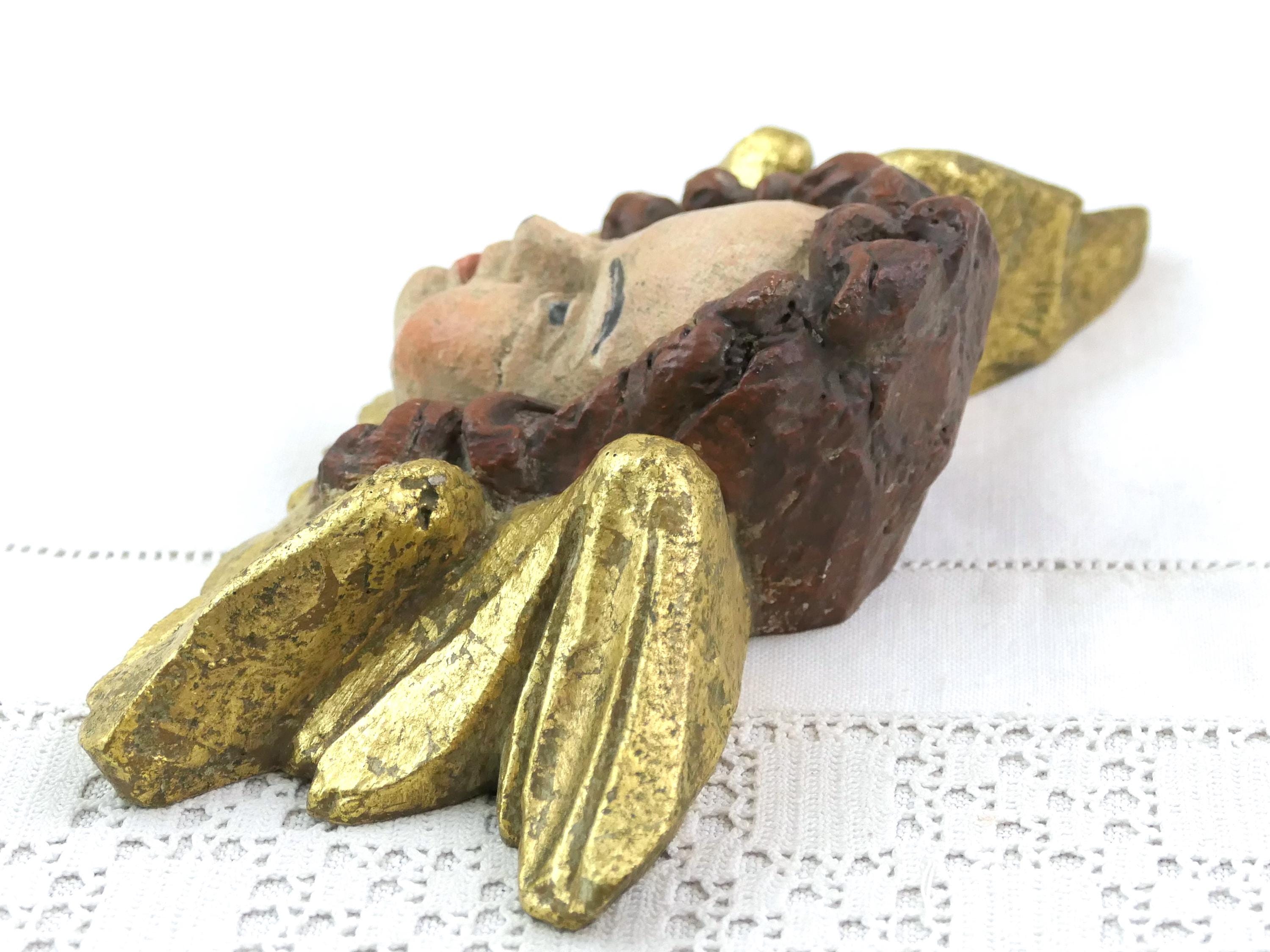 Vintage Putti Cherub with gold gilded wings. Made of handpainted cast plaster resin. Ca mid 1900s.