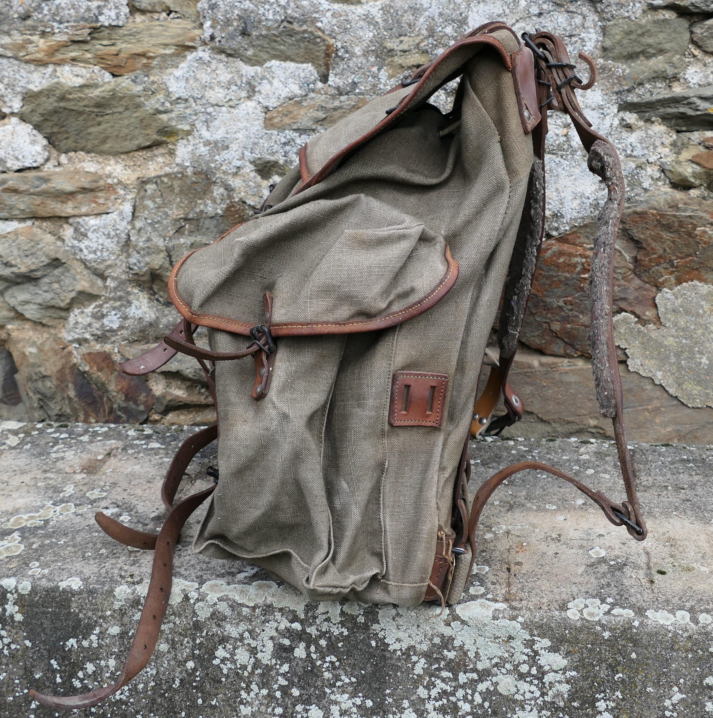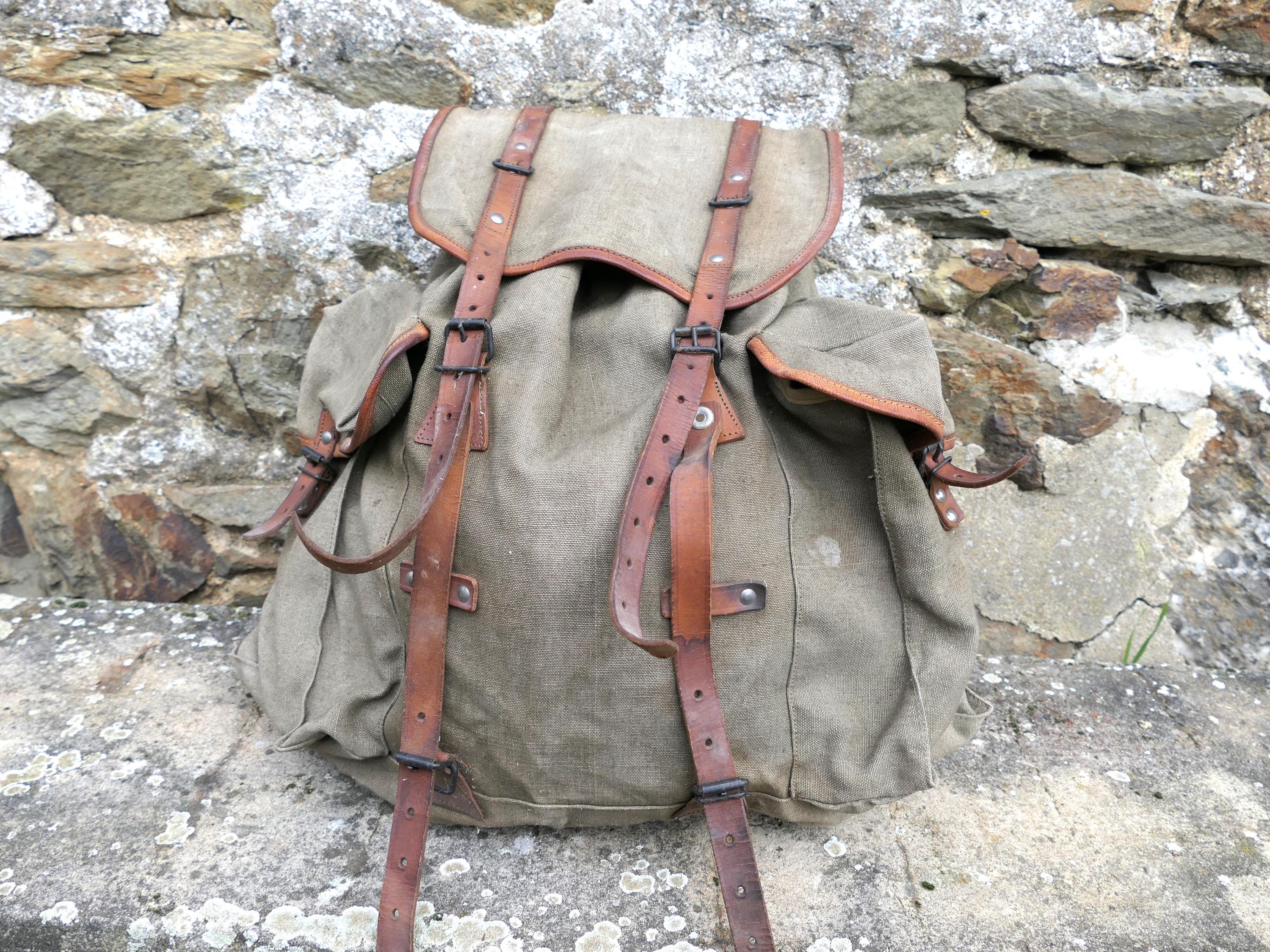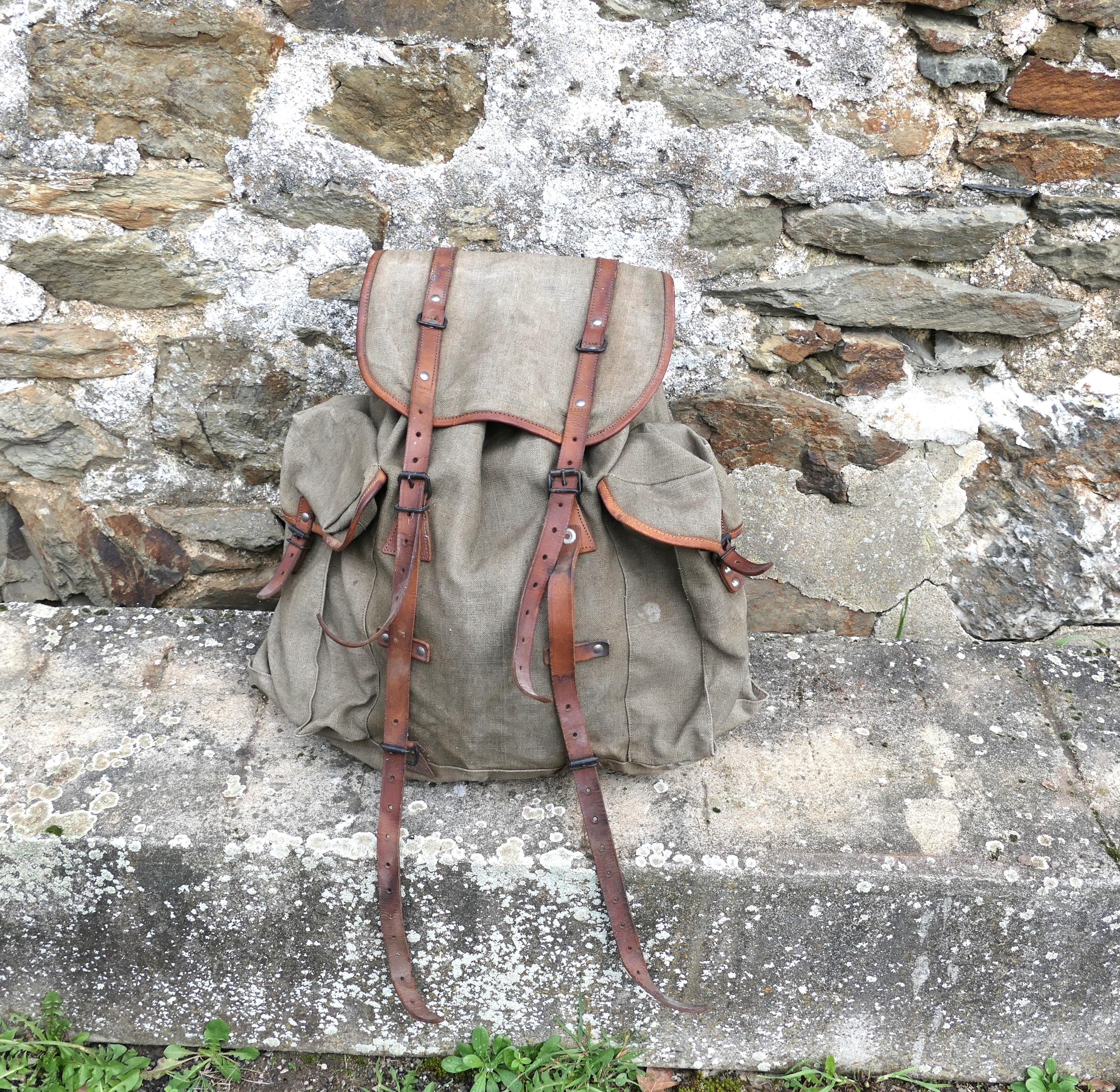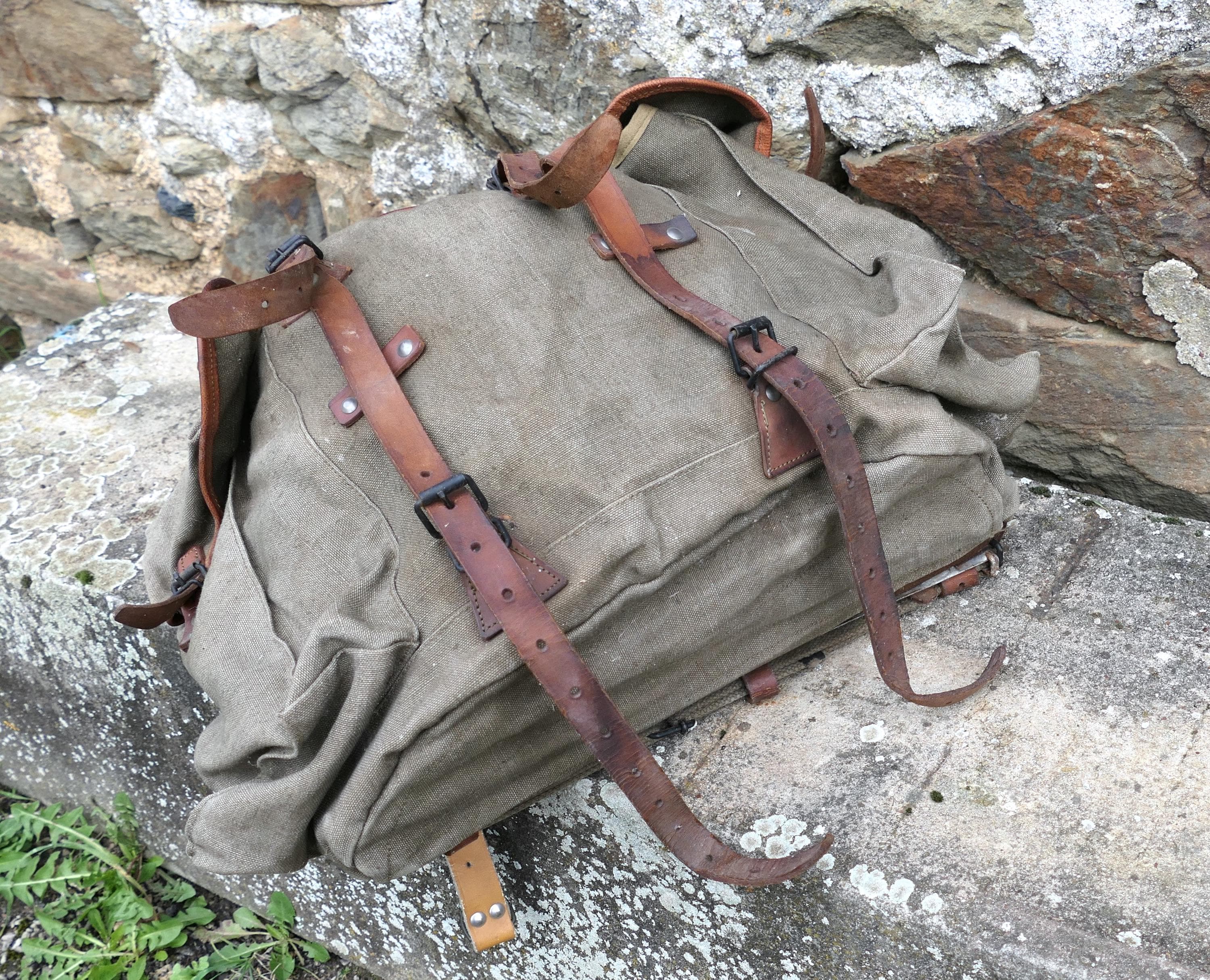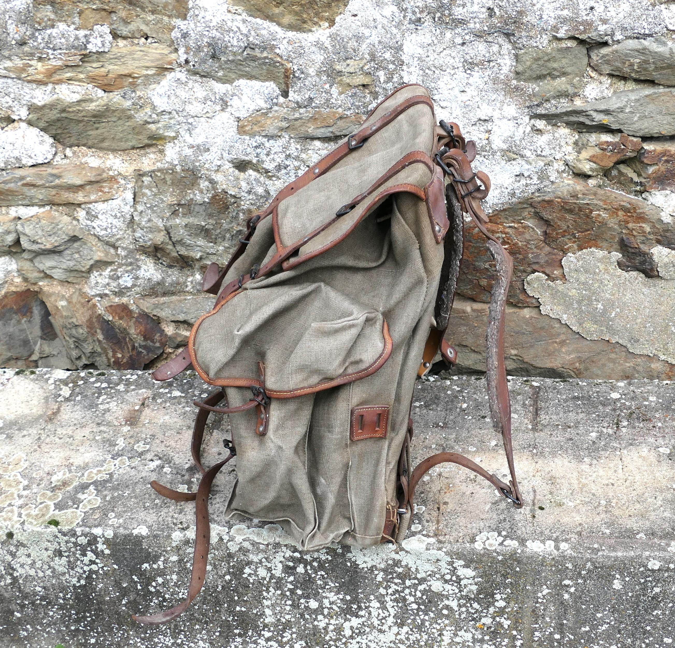 Vintage French khaki army backpack. Made of cotton canvas with metal frame and leather straps . Ca 1950s.