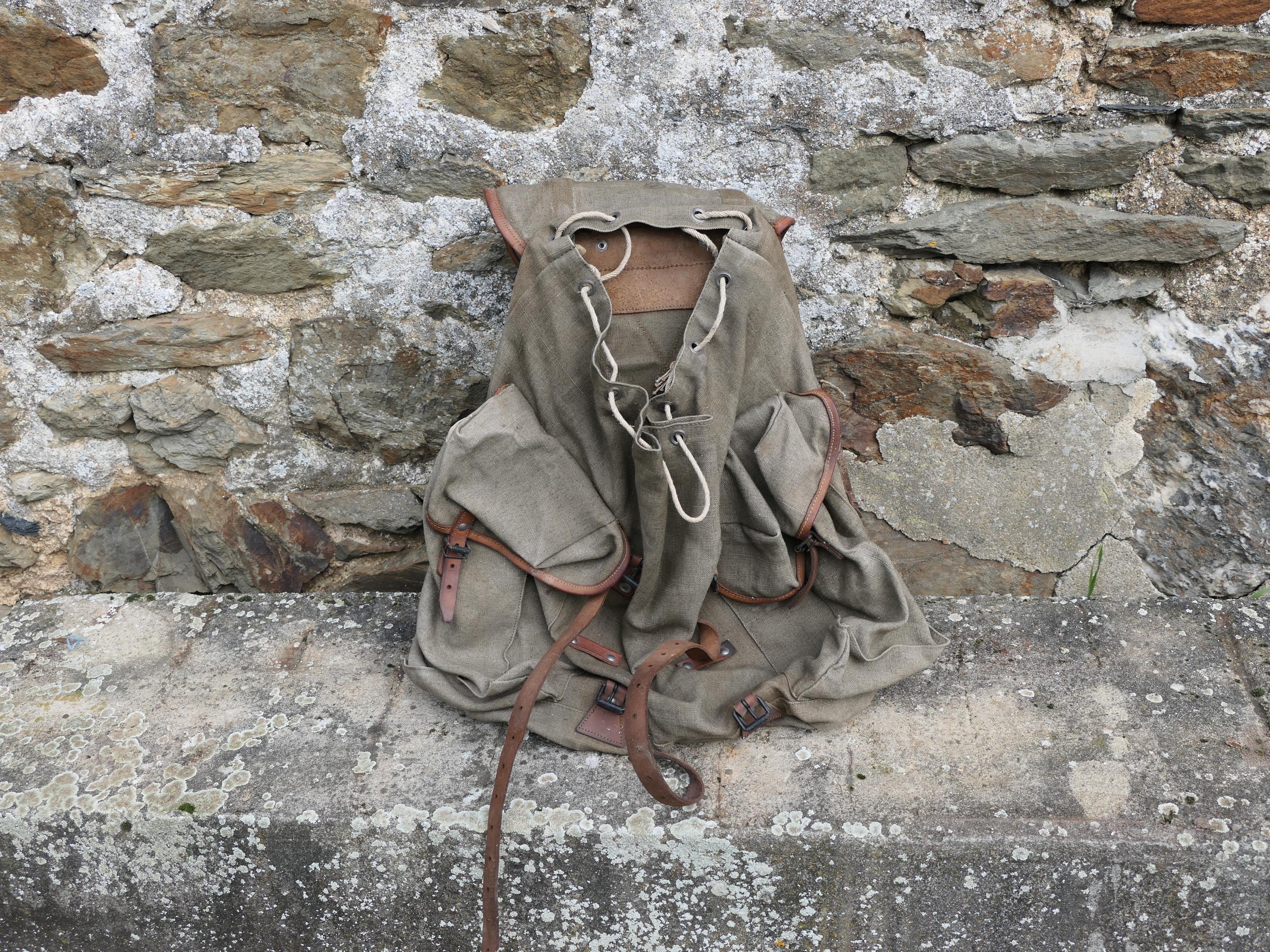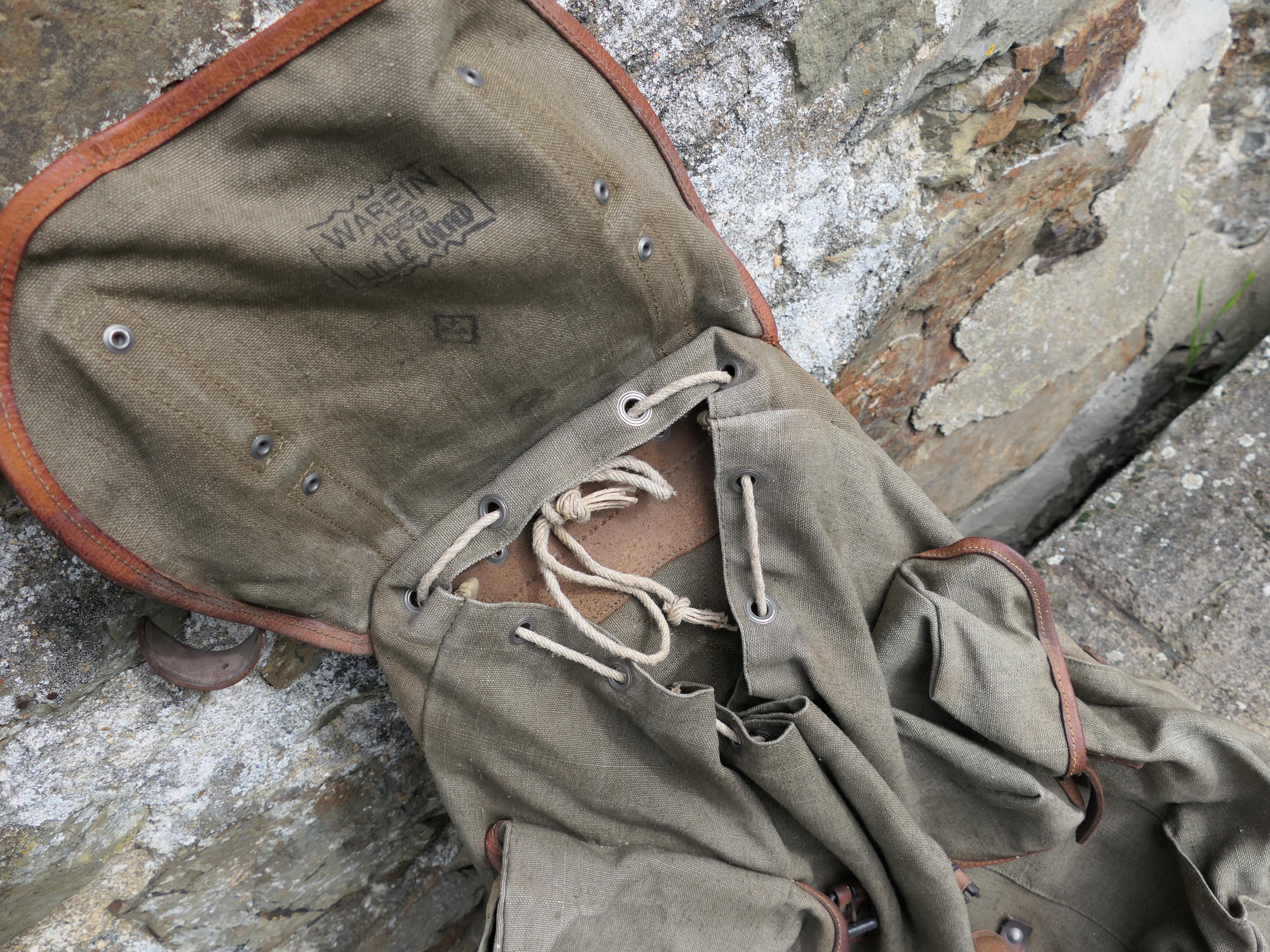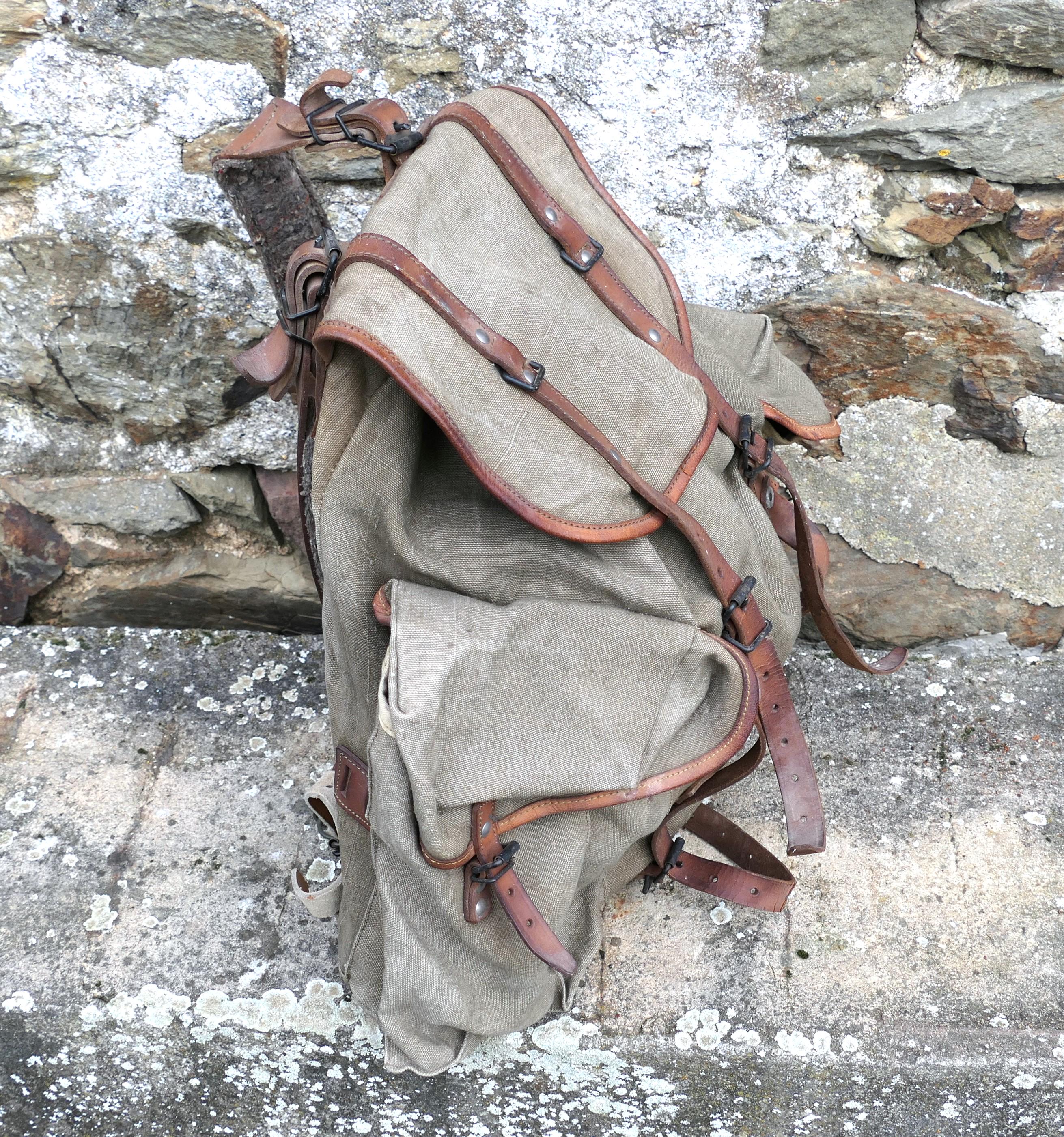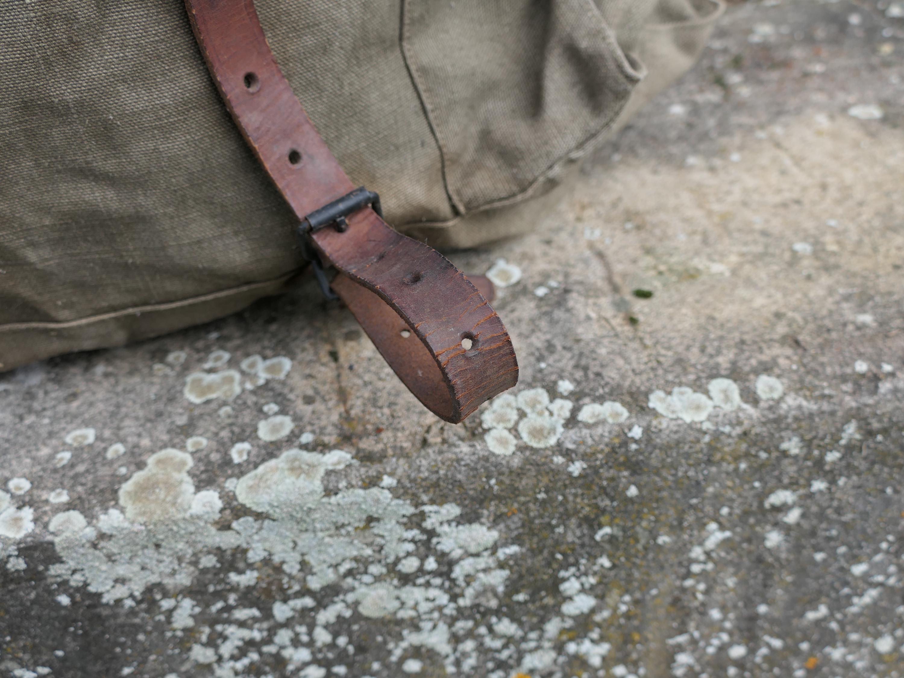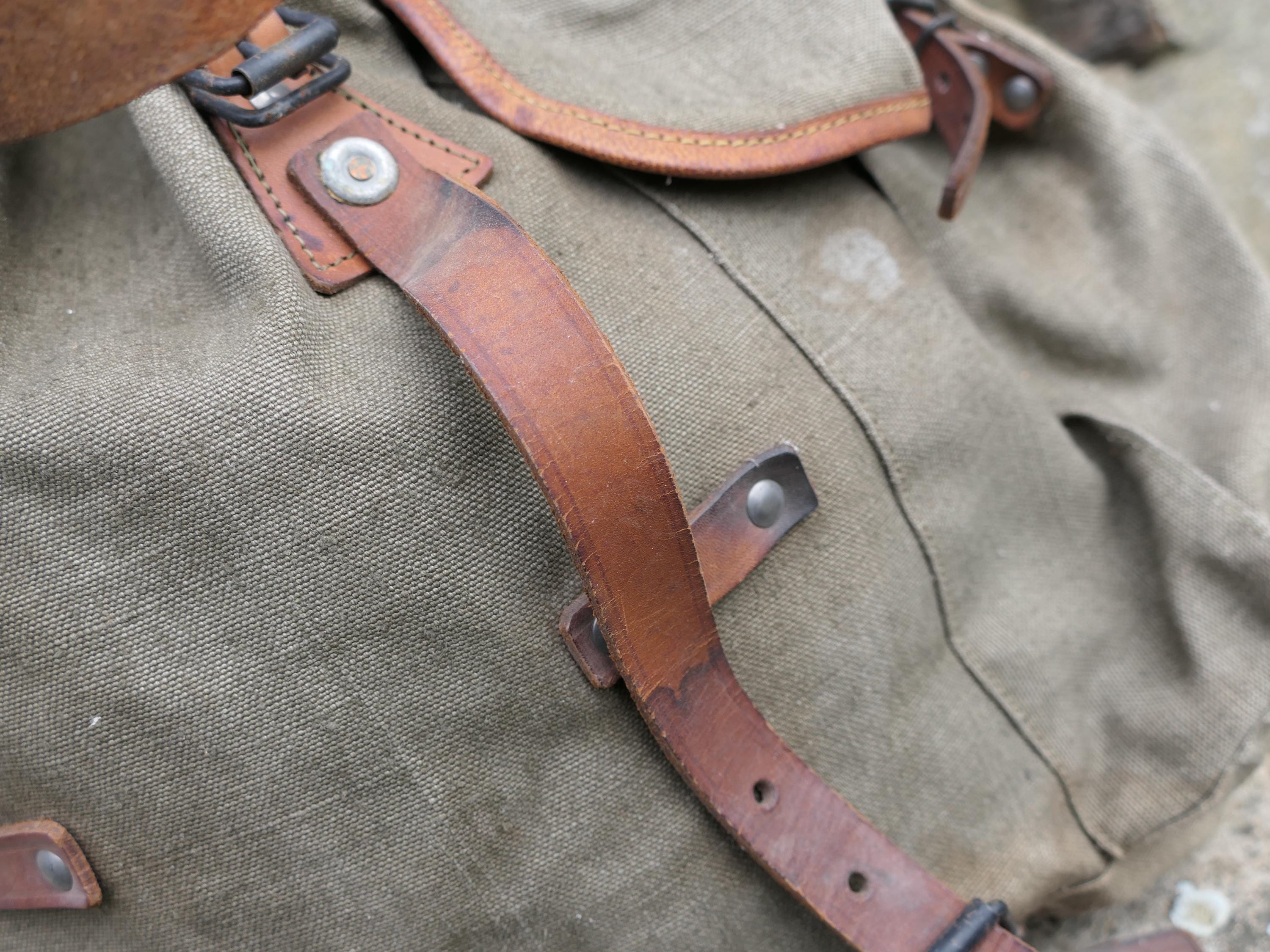 Vintage French khaki army backpack. Made of cotton canvas with metal frame and leather straps . Ca 1950s.
