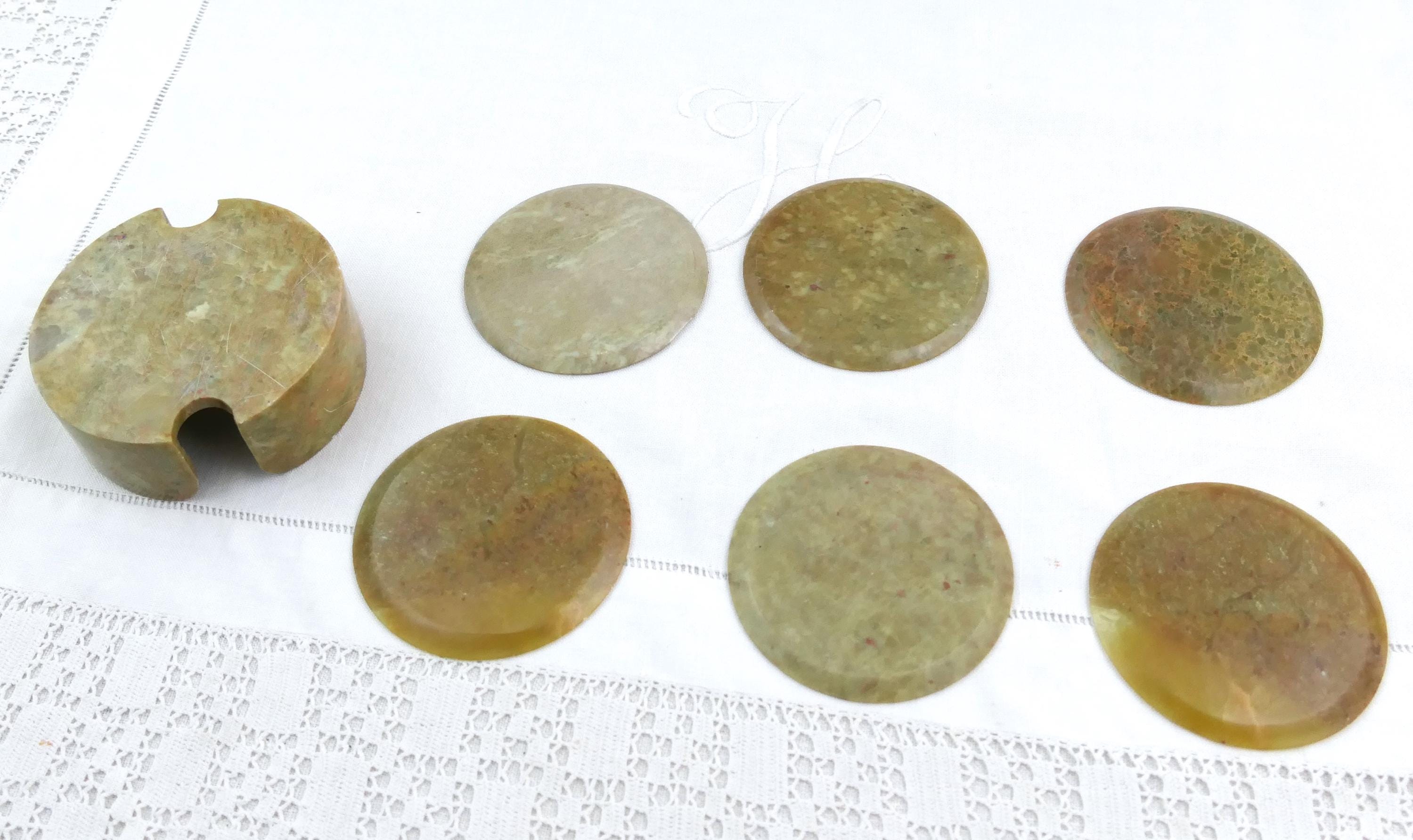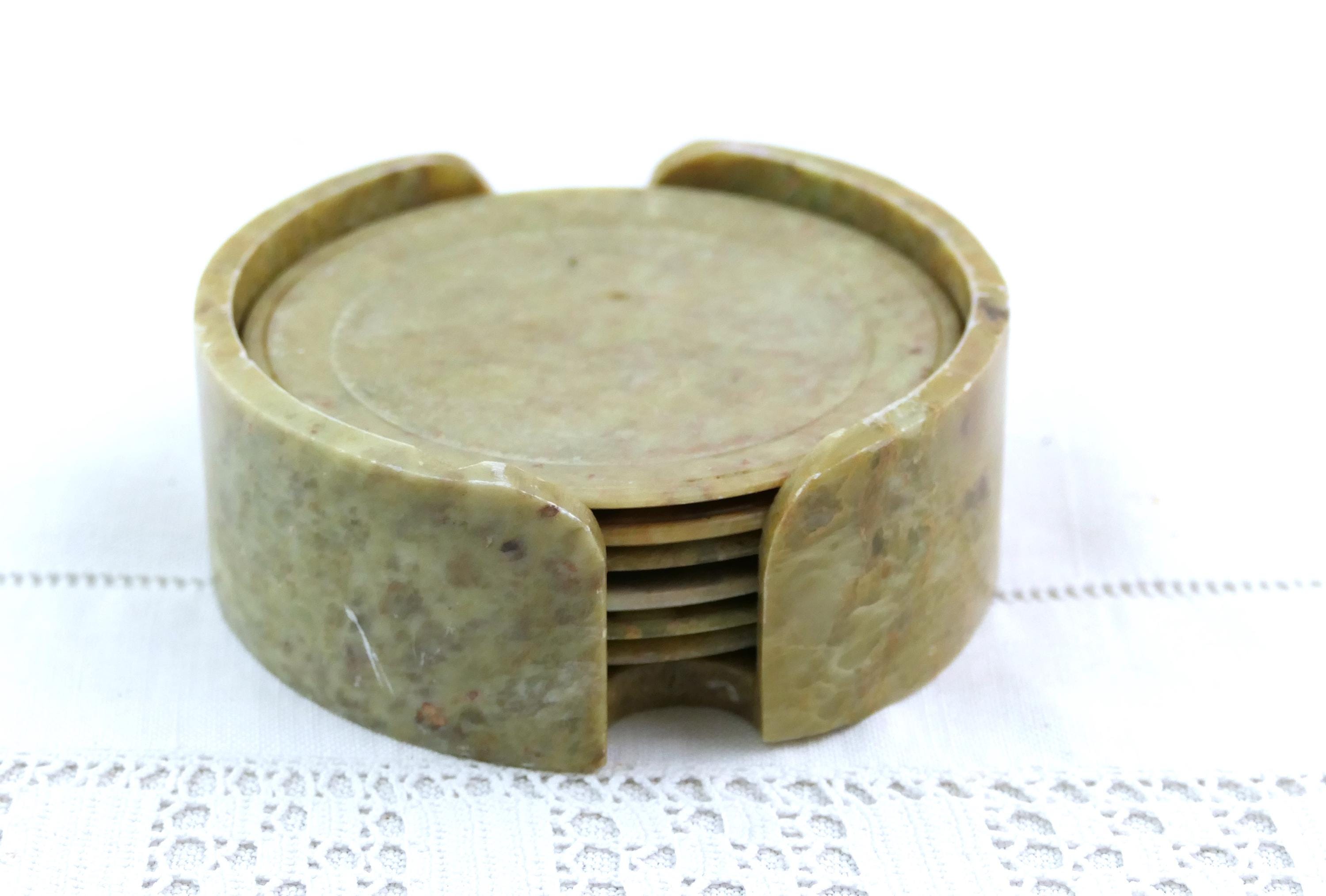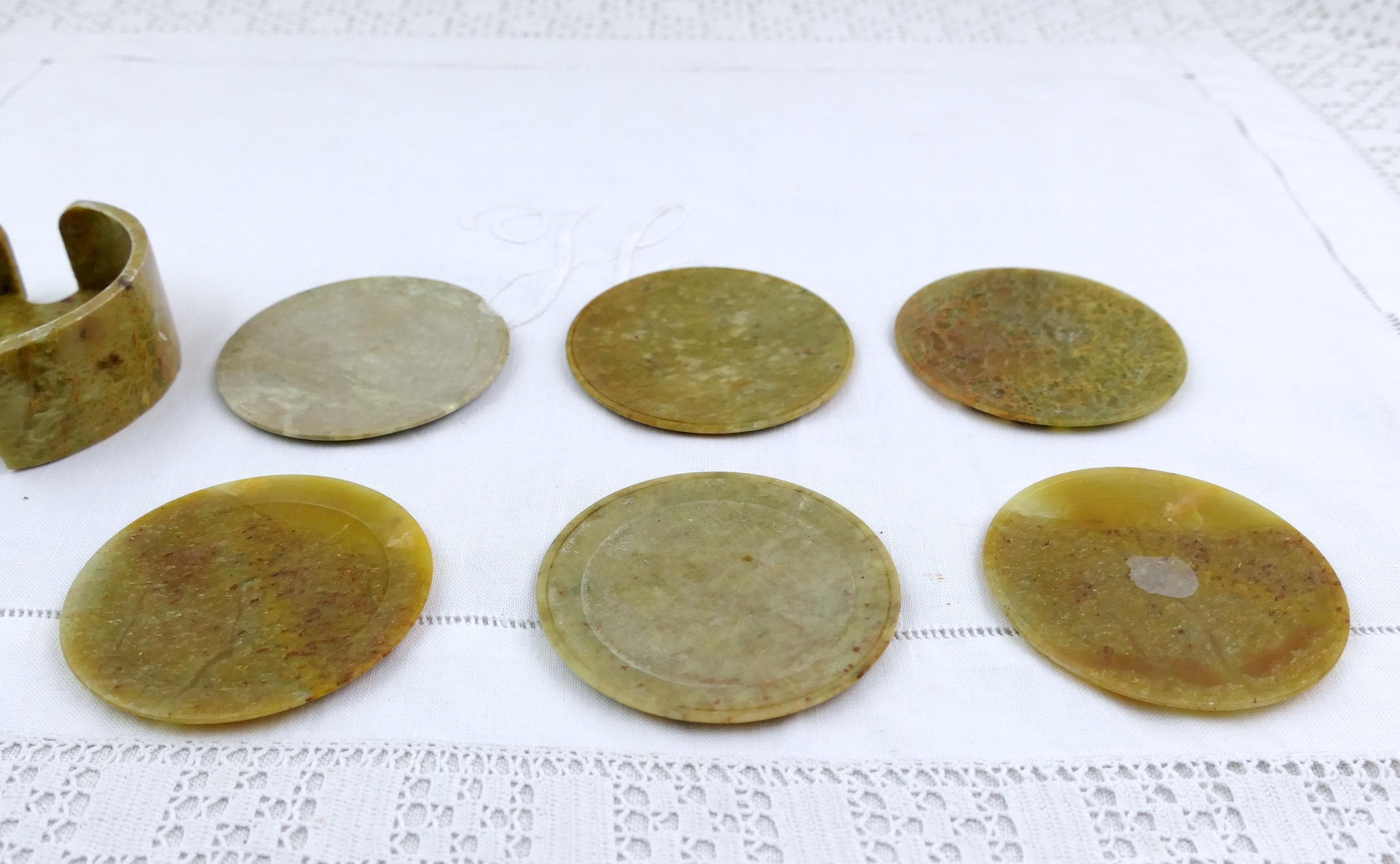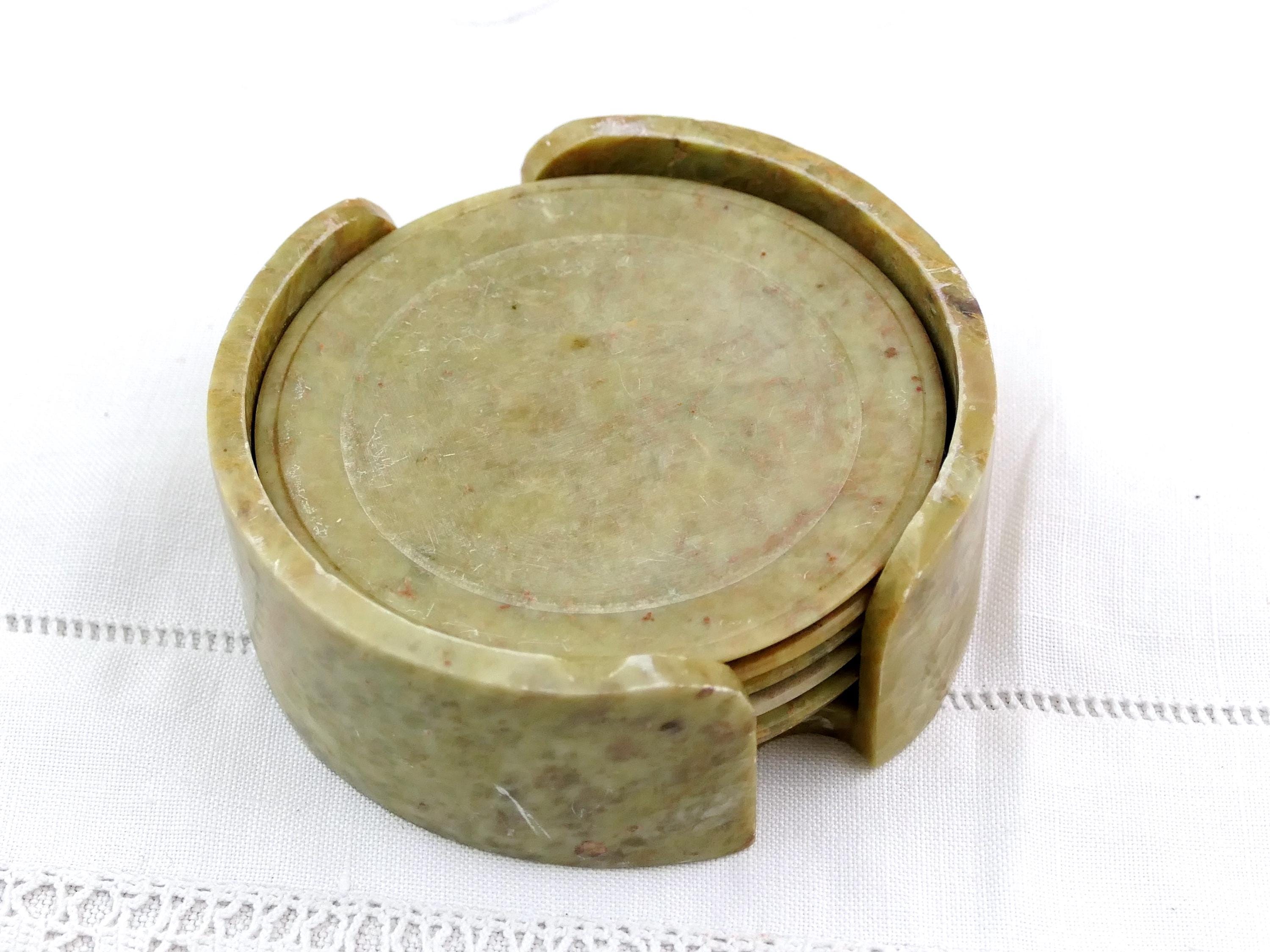 Six vintage round carved stone coasters with matching holder Made of brown / green soapstone. Circa late 1900s.