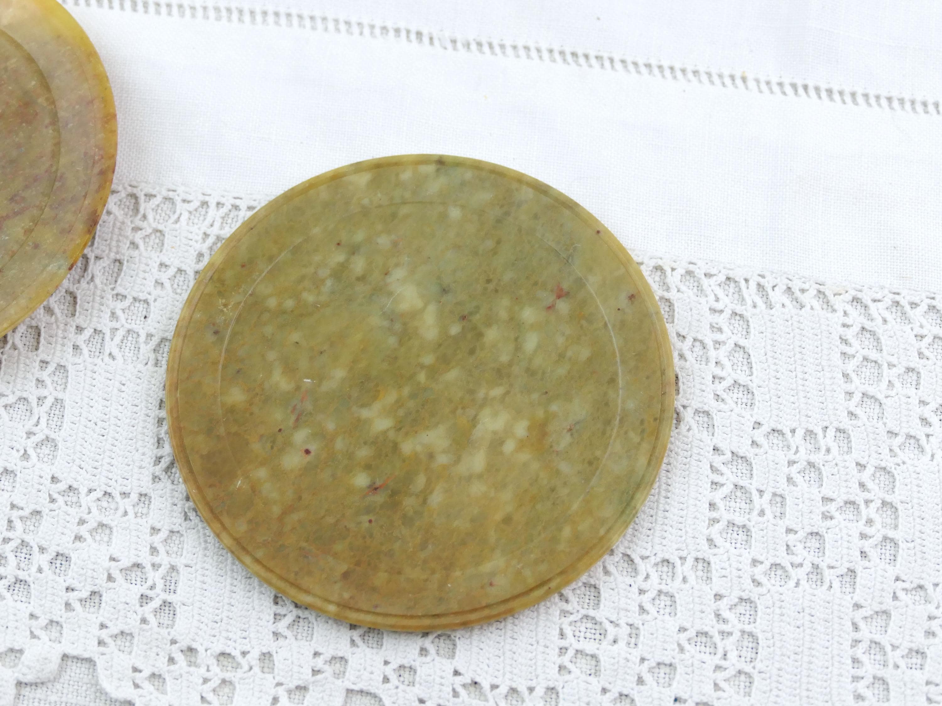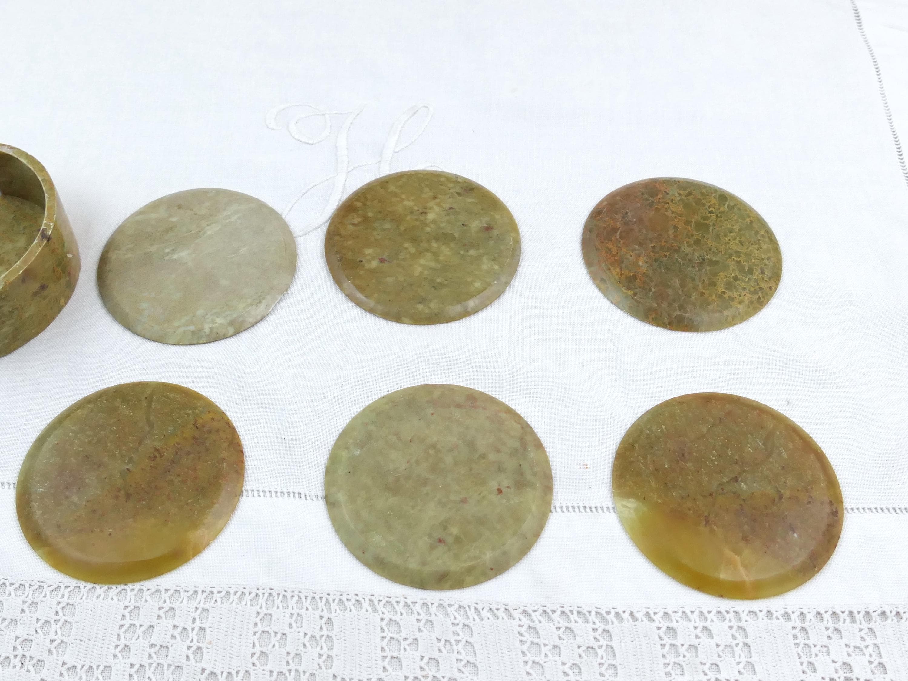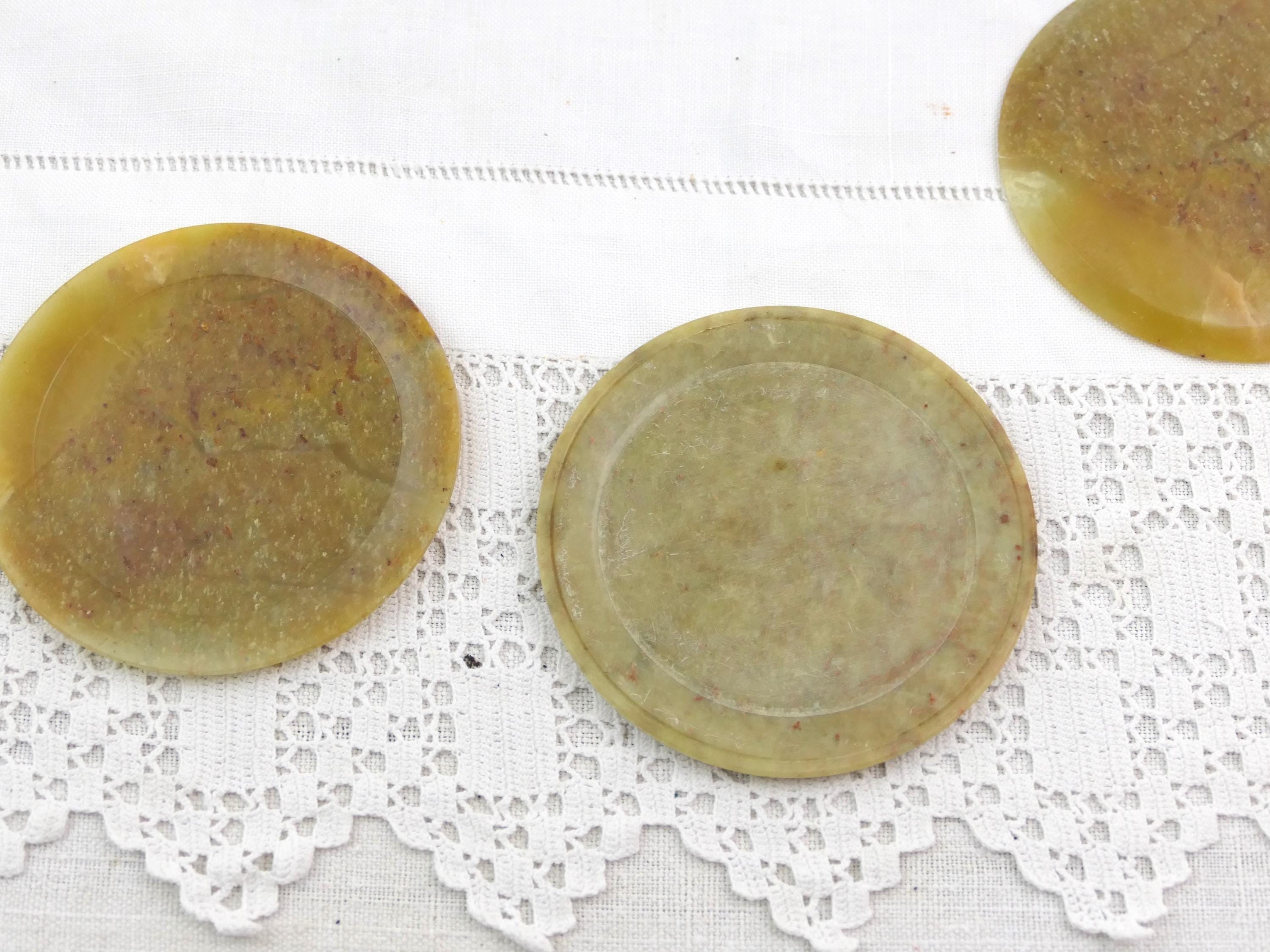 Six vintage round carved stone coasters with matching holder Made of brown / green soapstone. Circa late 1900s.