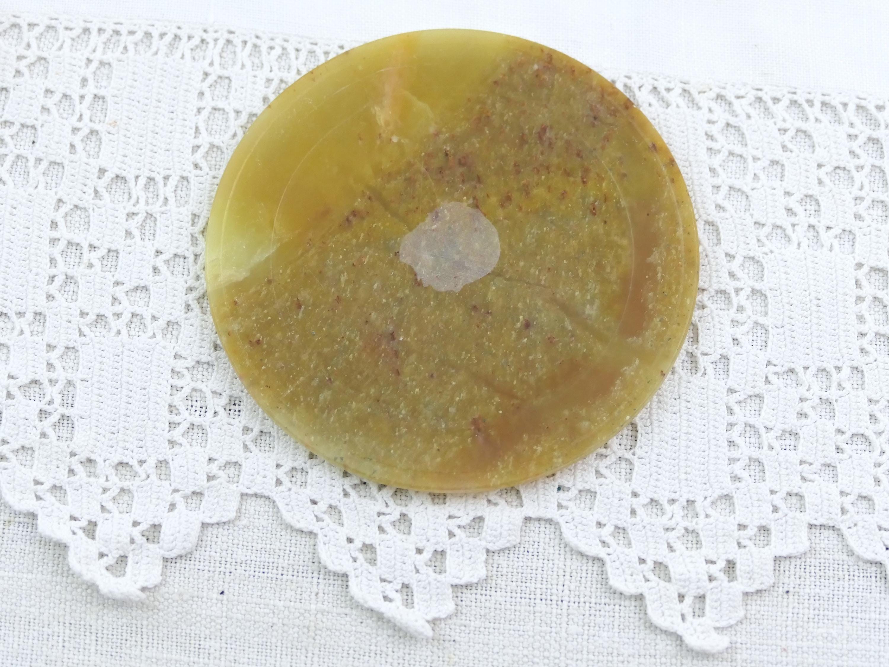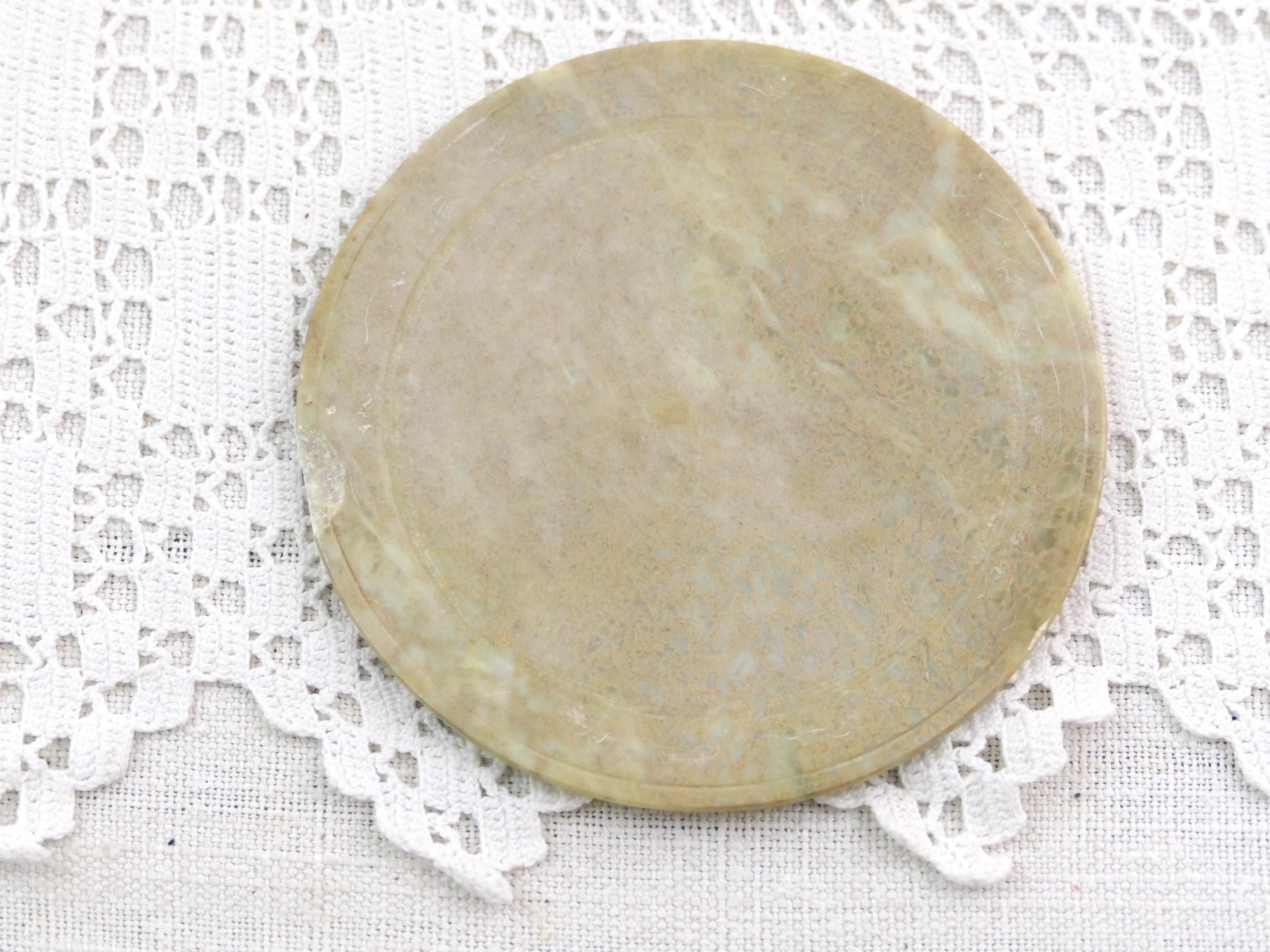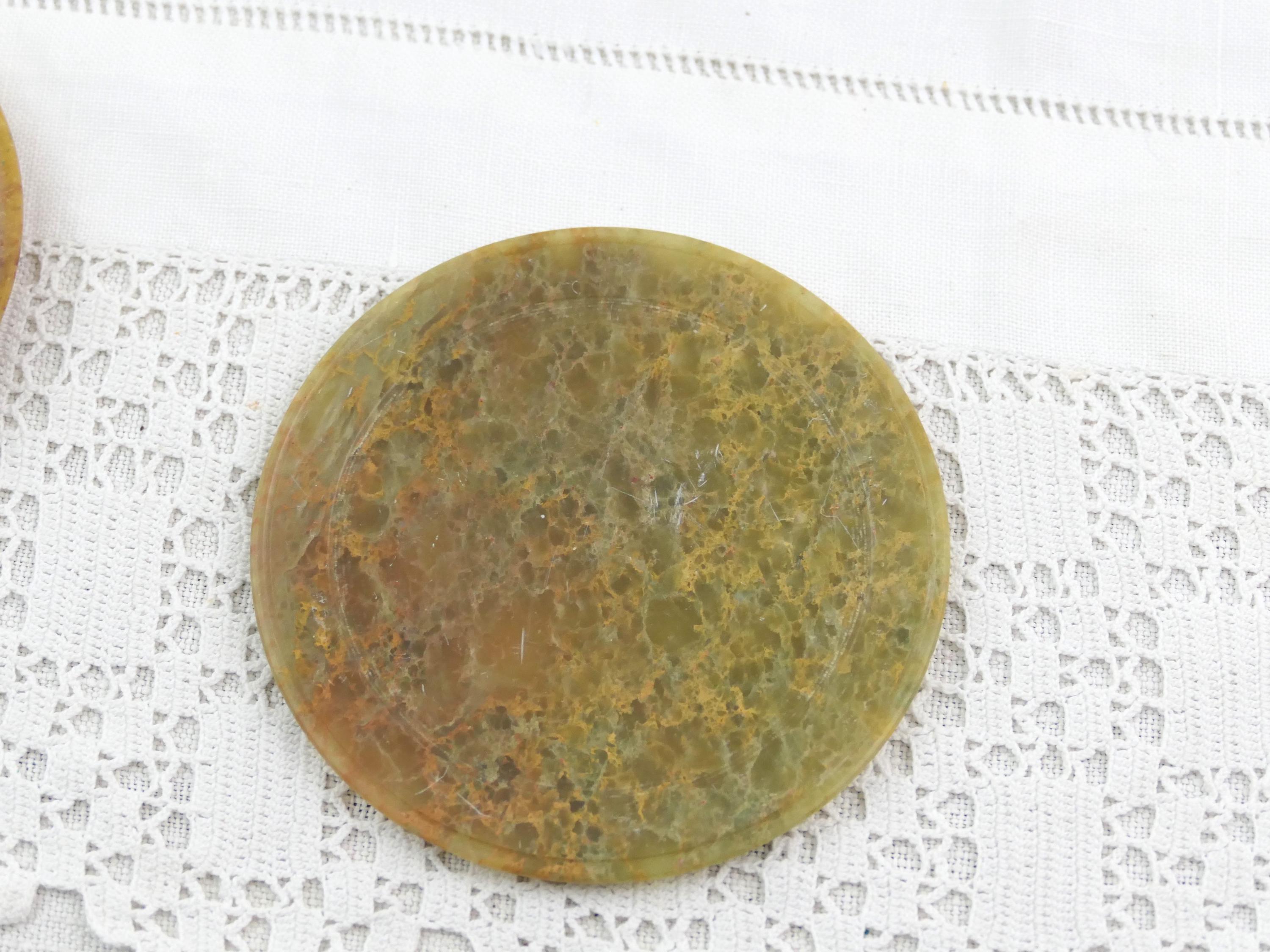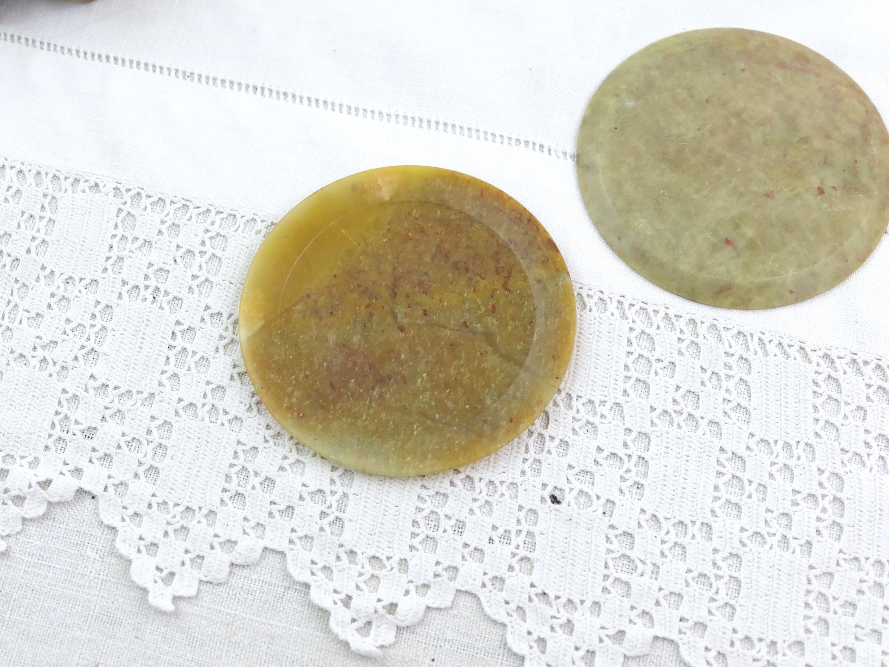 Six vintage round carved stone coasters with matching holder Made of brown / green soapstone. Circa late 1900s.