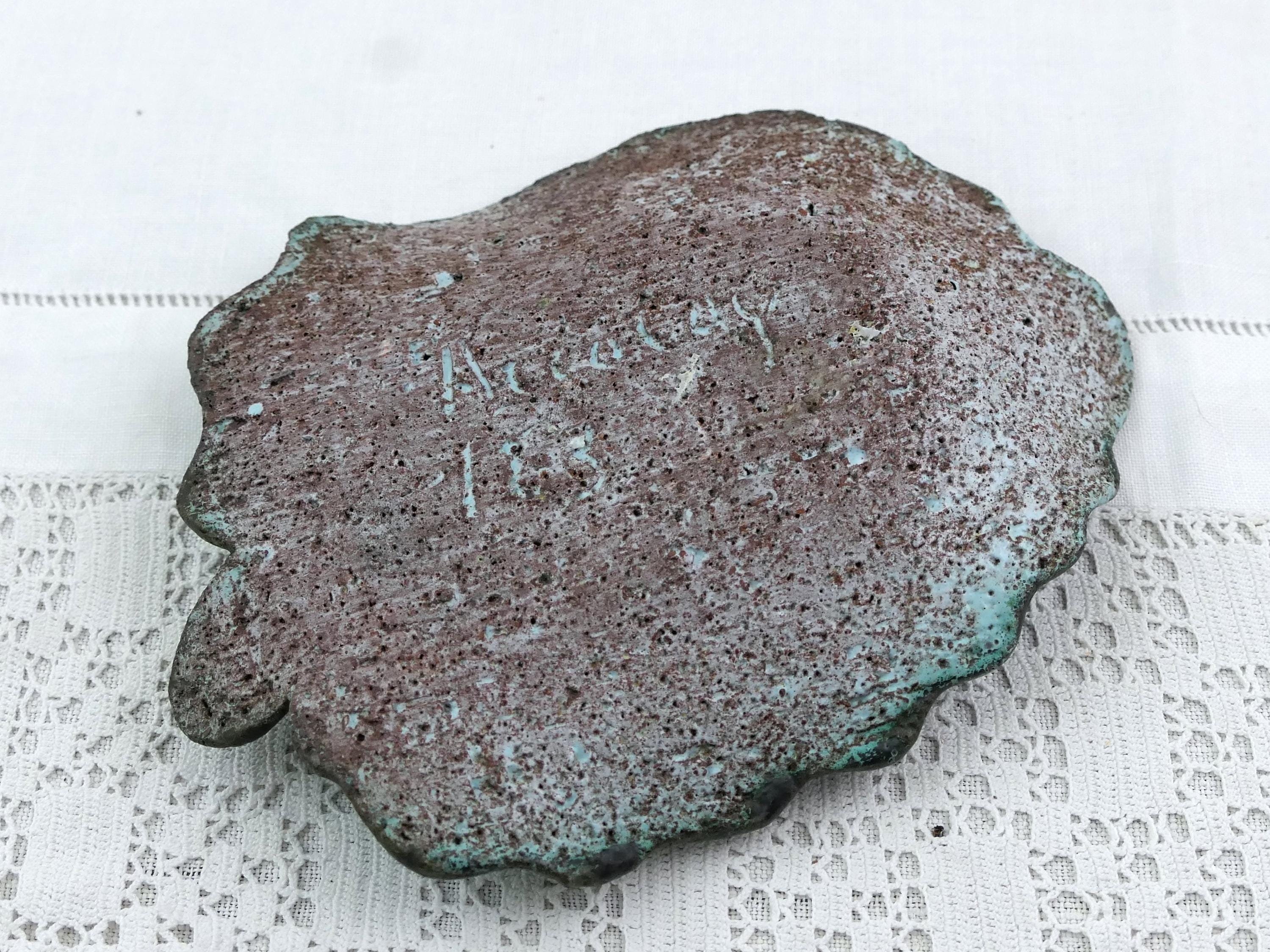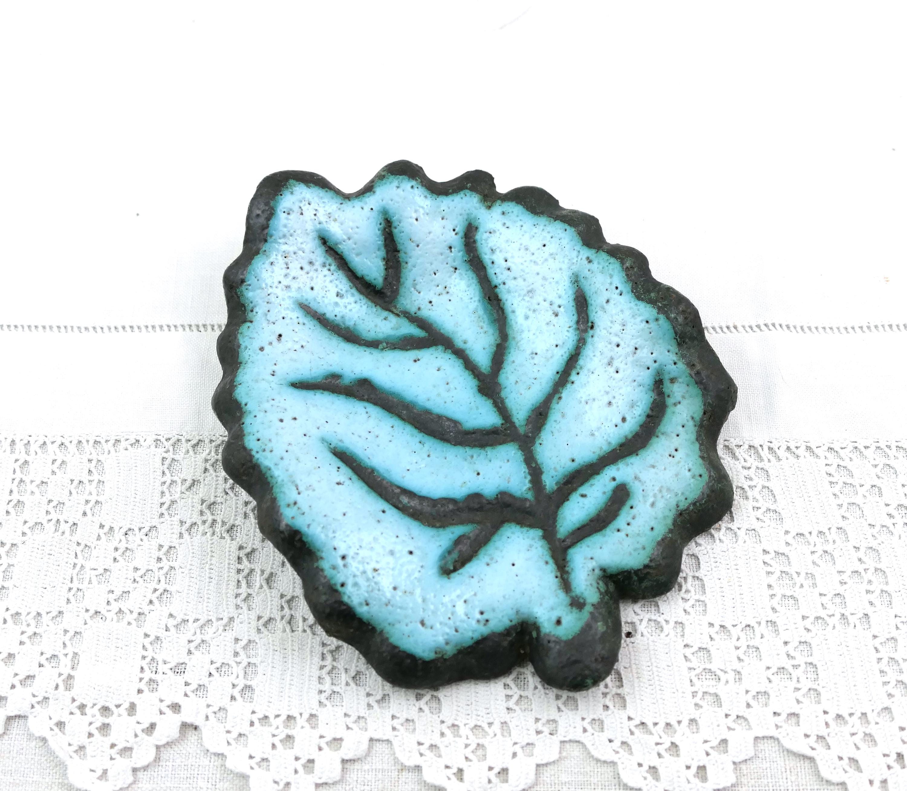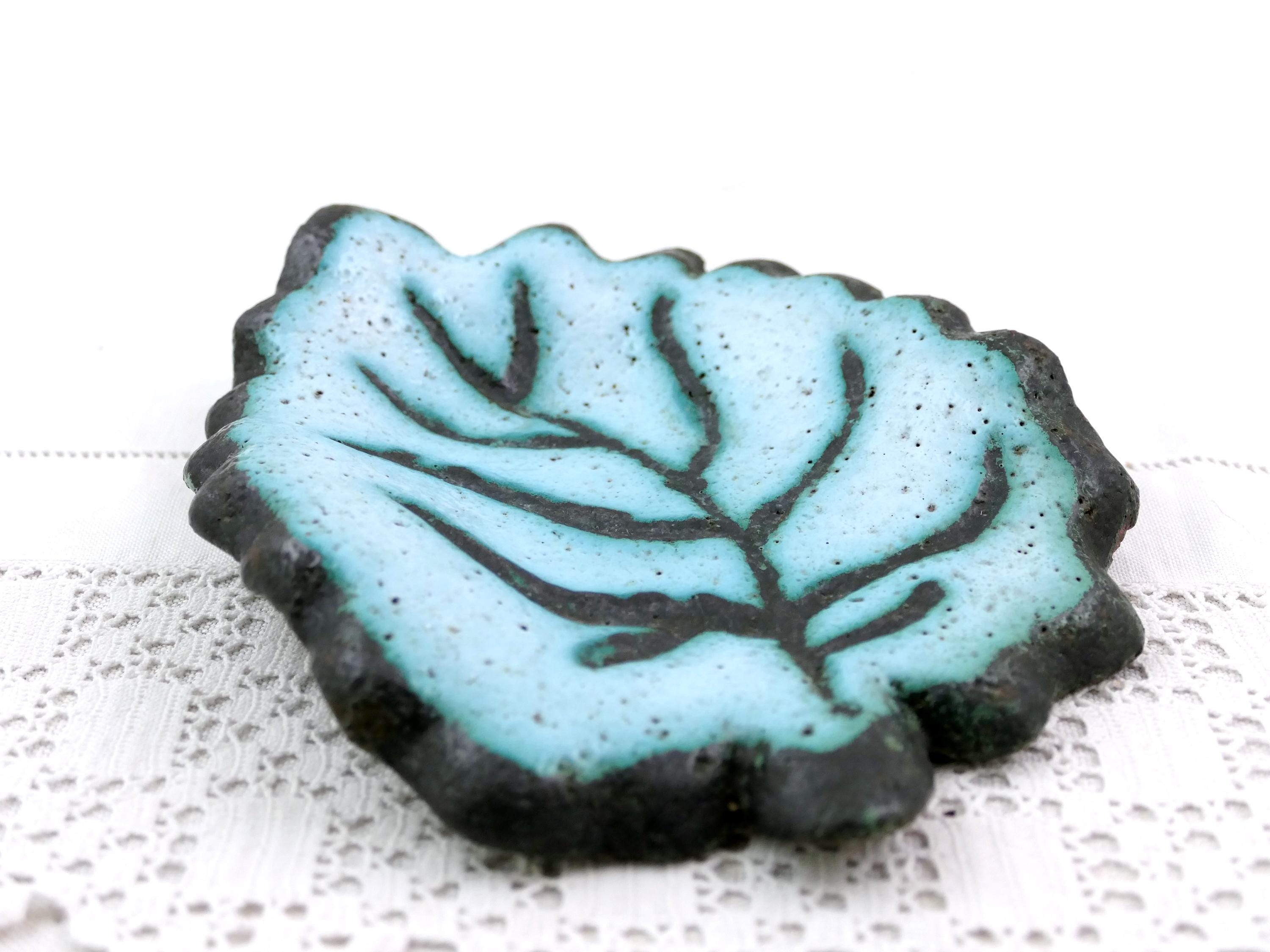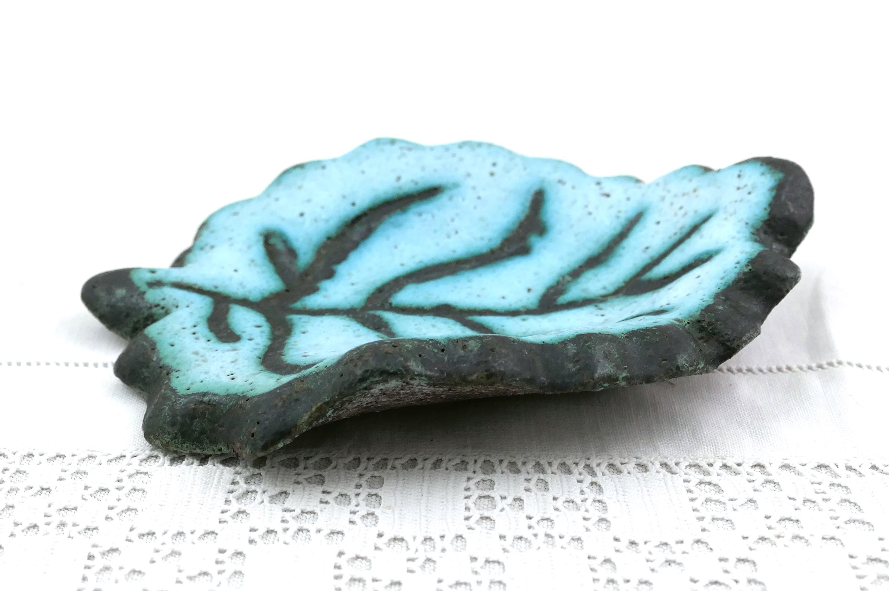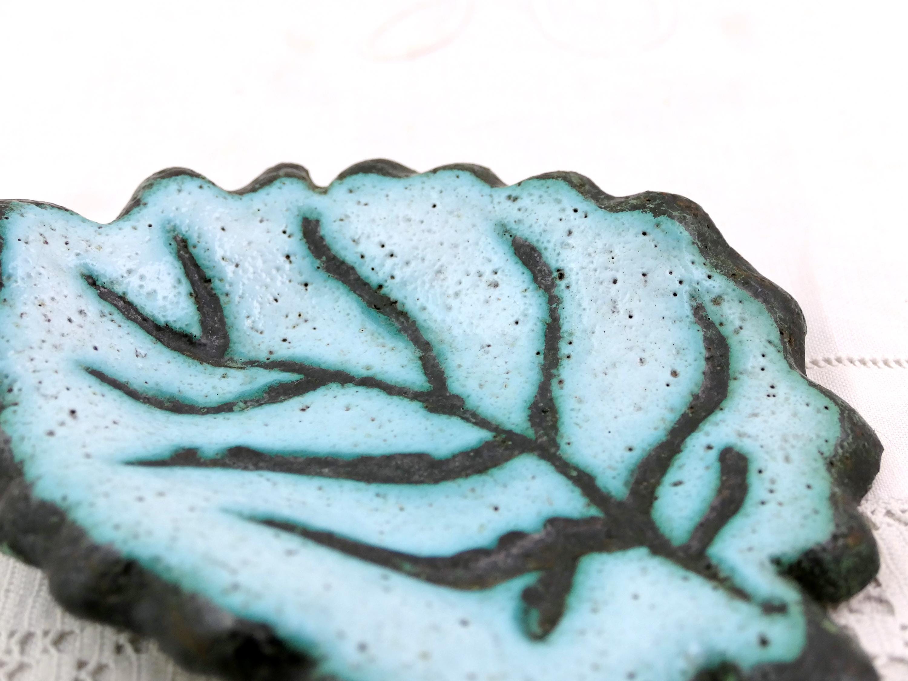 Vintage Mid Century studio Pottery vide poche shaped as a leaf. Made of pale blue glazed pottery. Ca 1960.